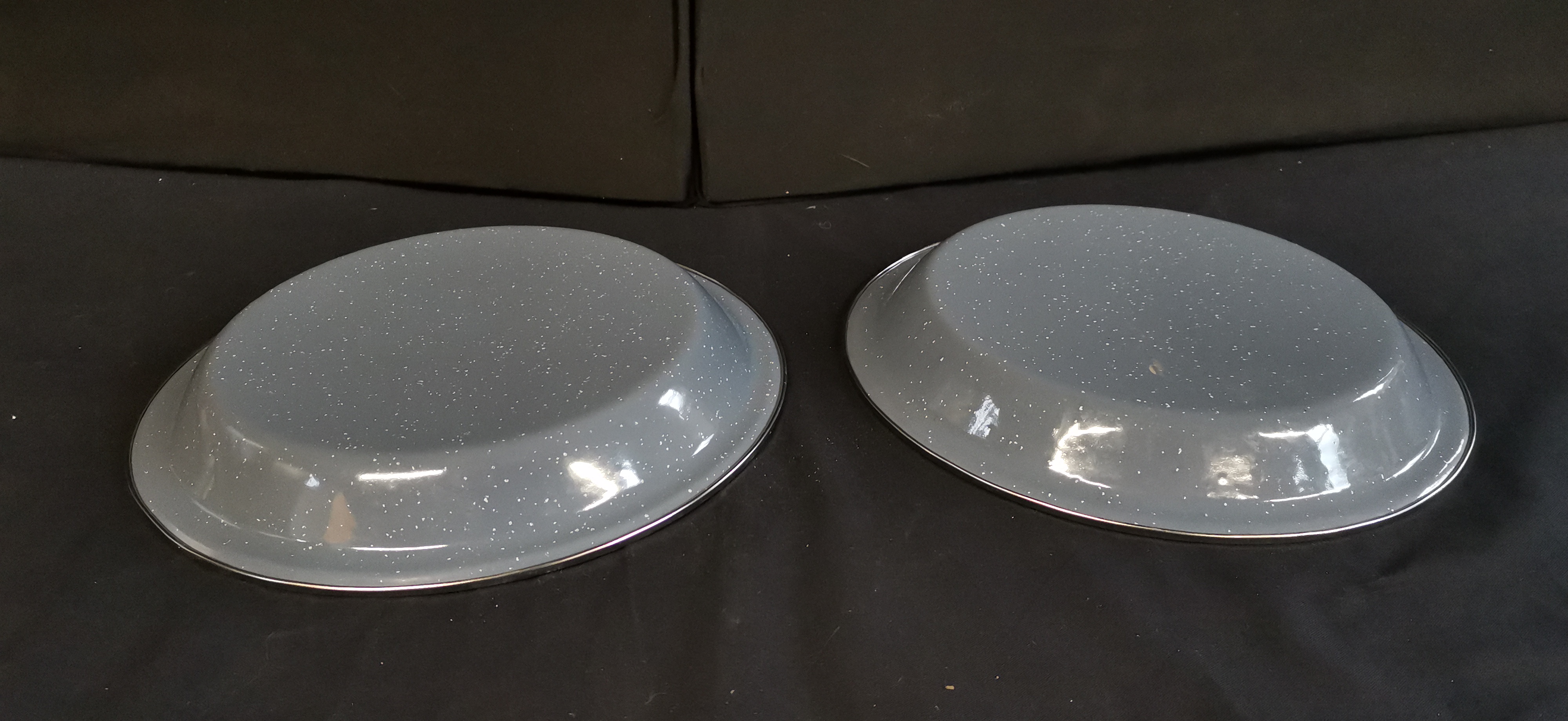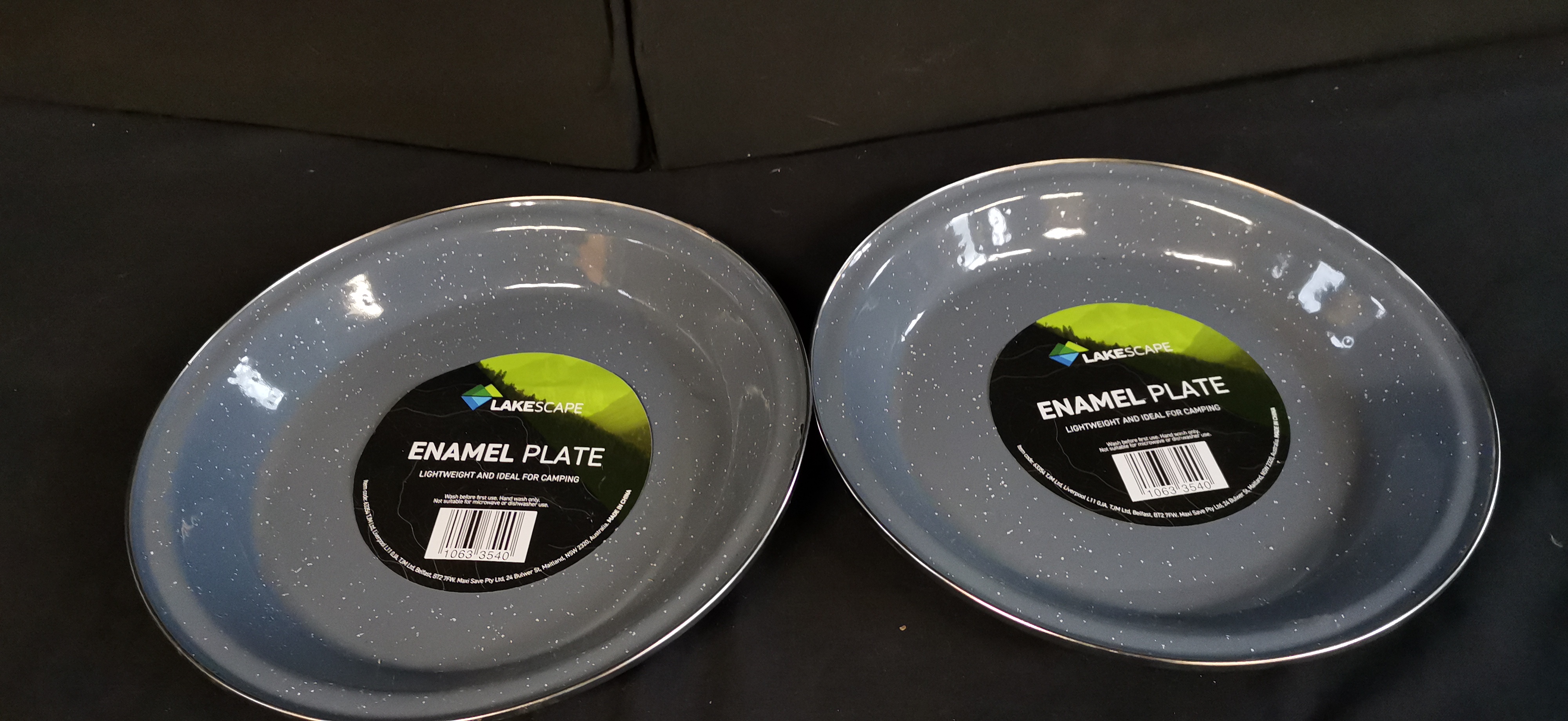 A collection of lightweight blue-grey speckled enamel camping plates by Lakescape featuring metal rims and original retail labels.