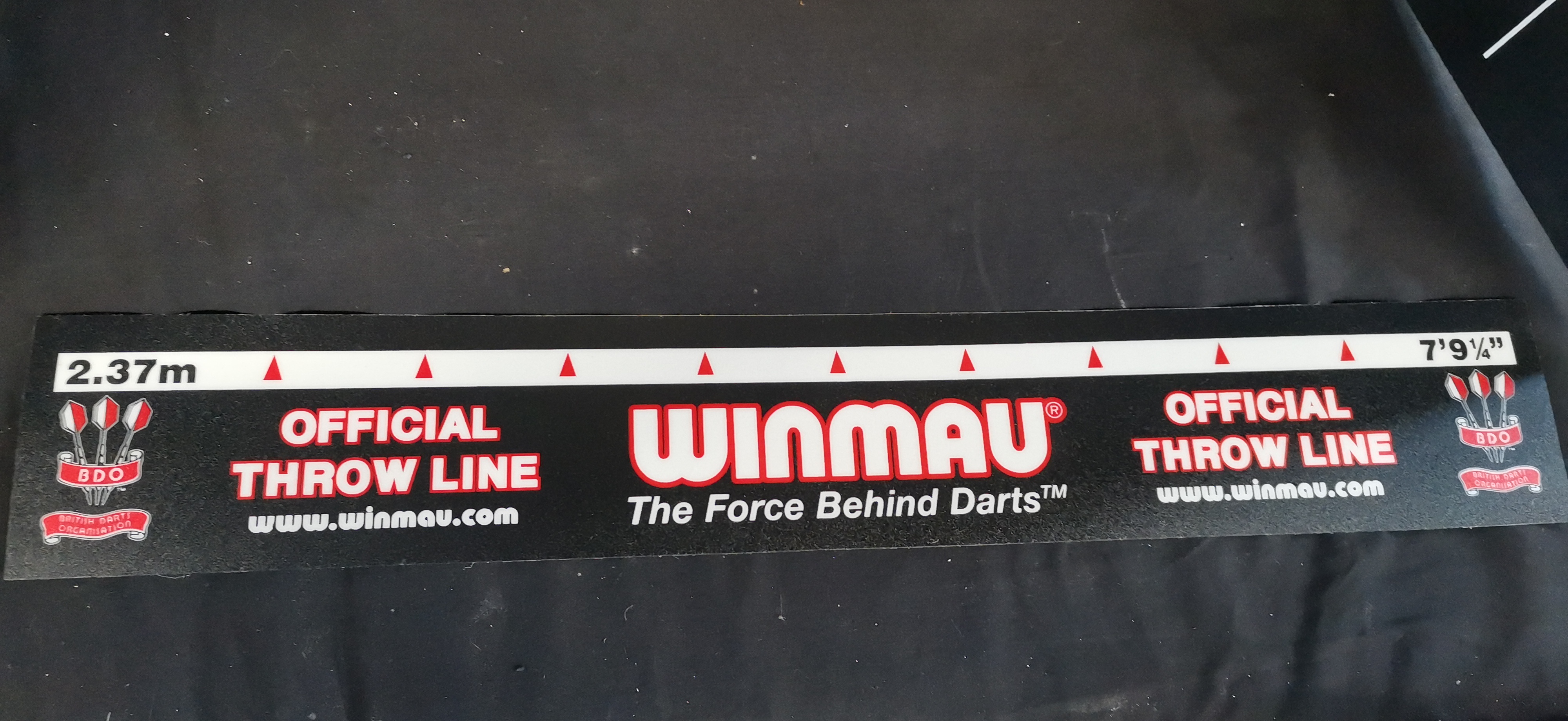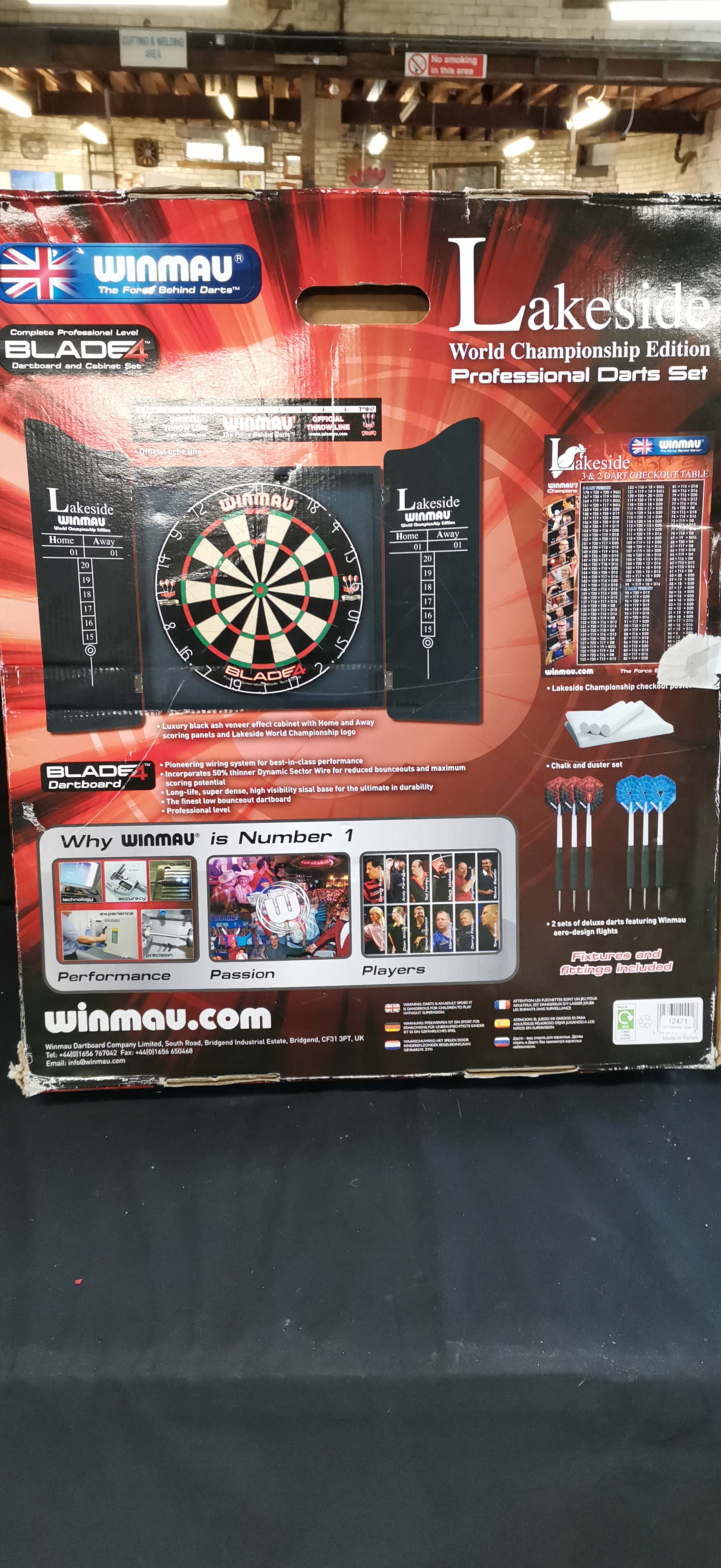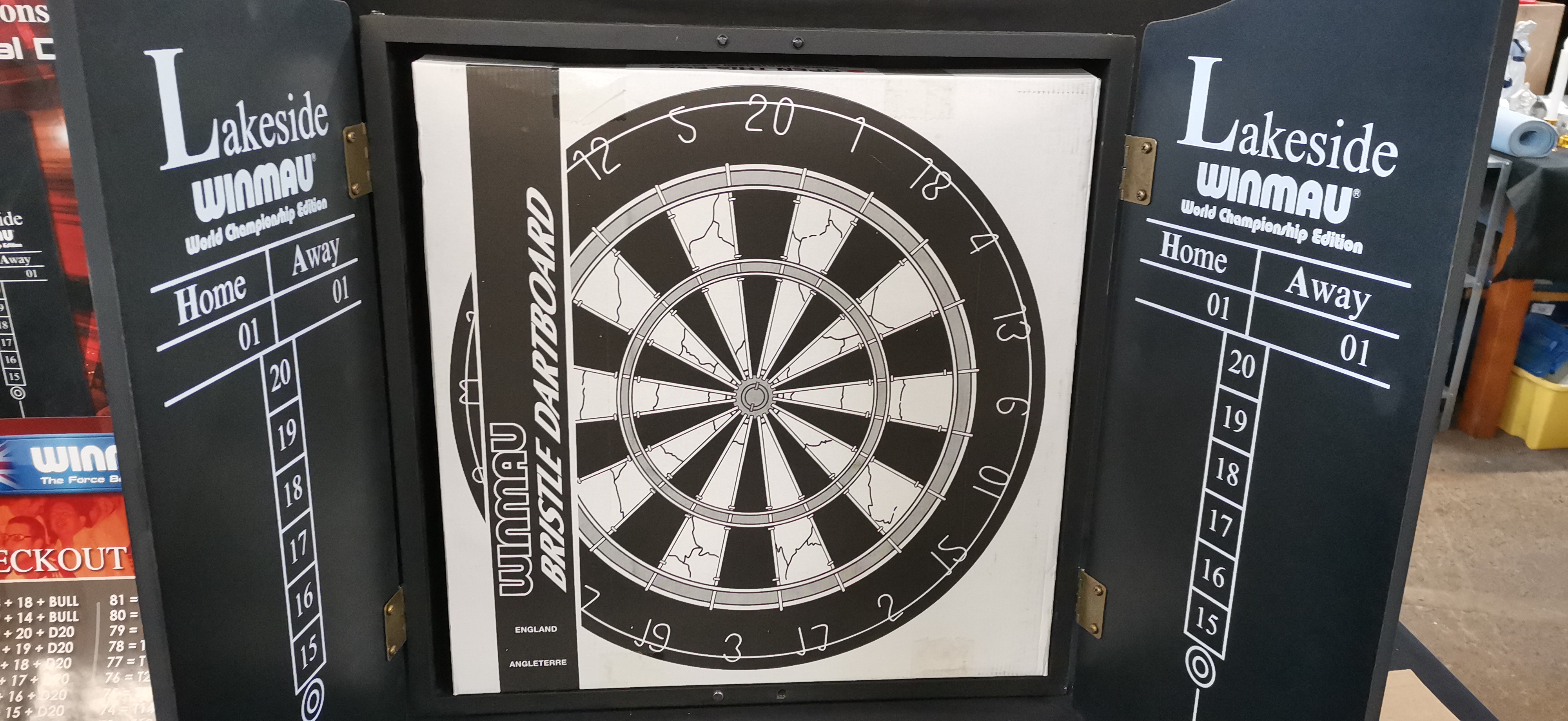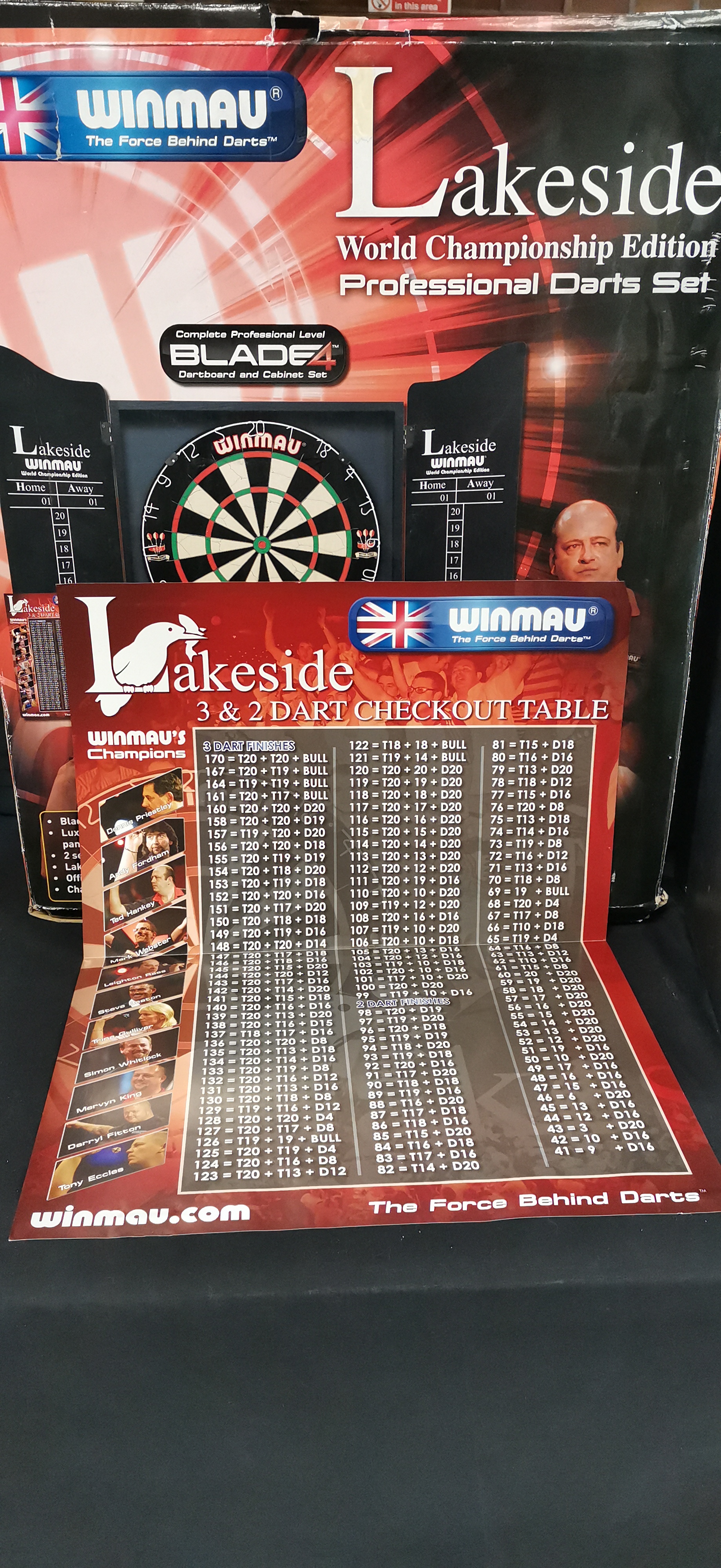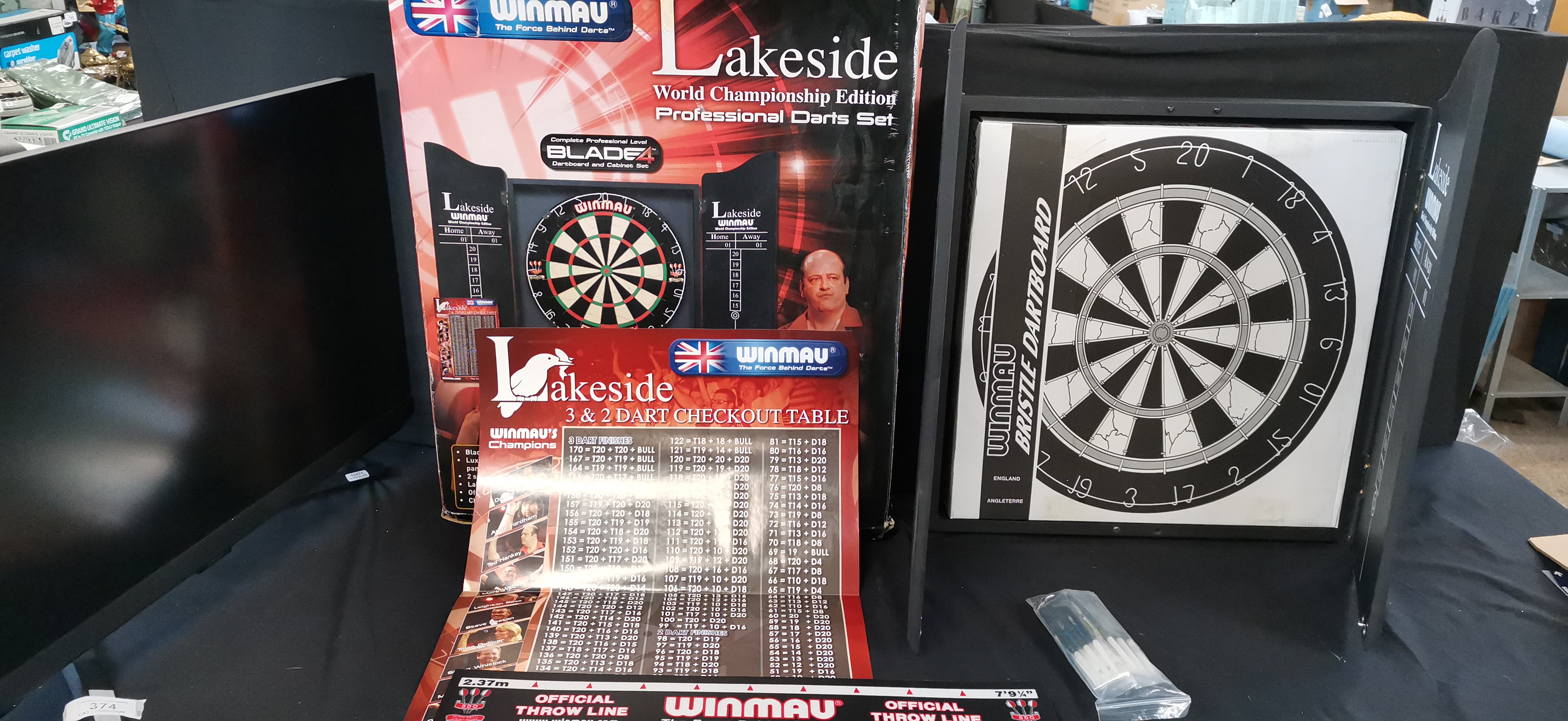 A collection of Winmau Lakeside professional darts equipment including a Blade 4 dartboard in a cabinet, an official throw line, a checkout poster, and several darts.