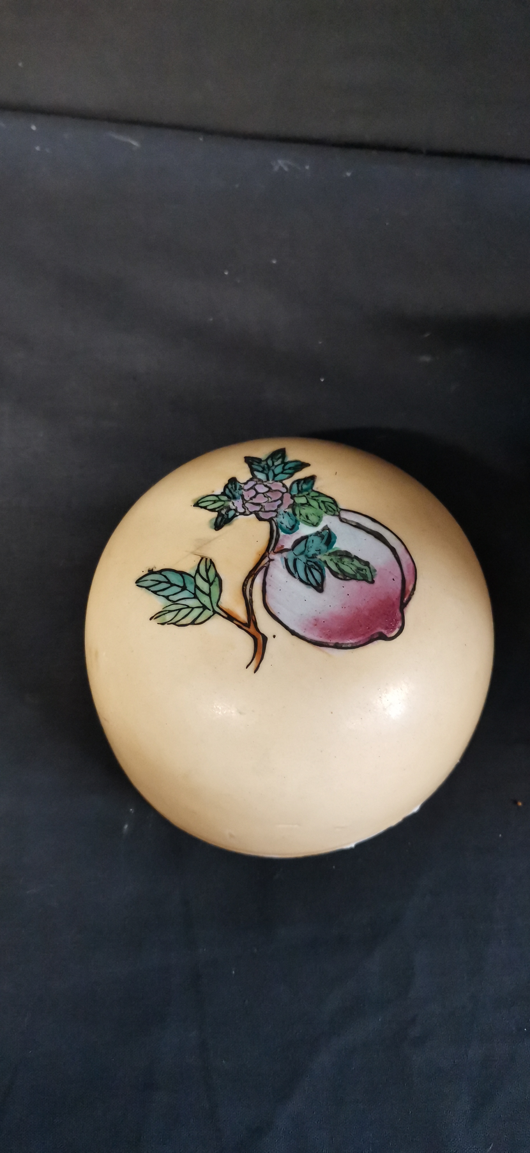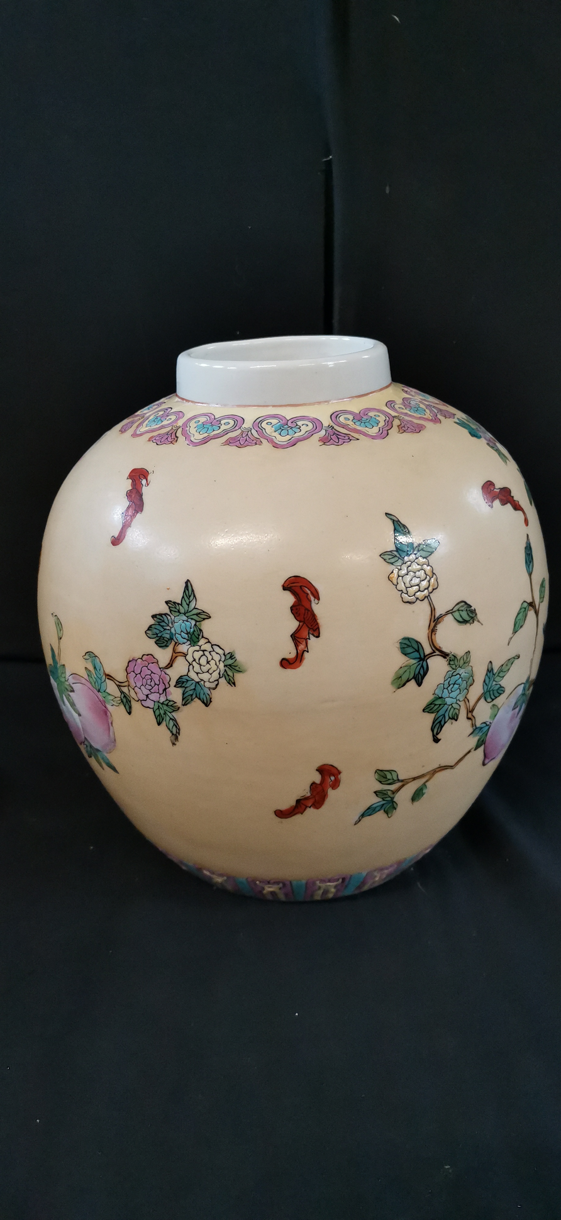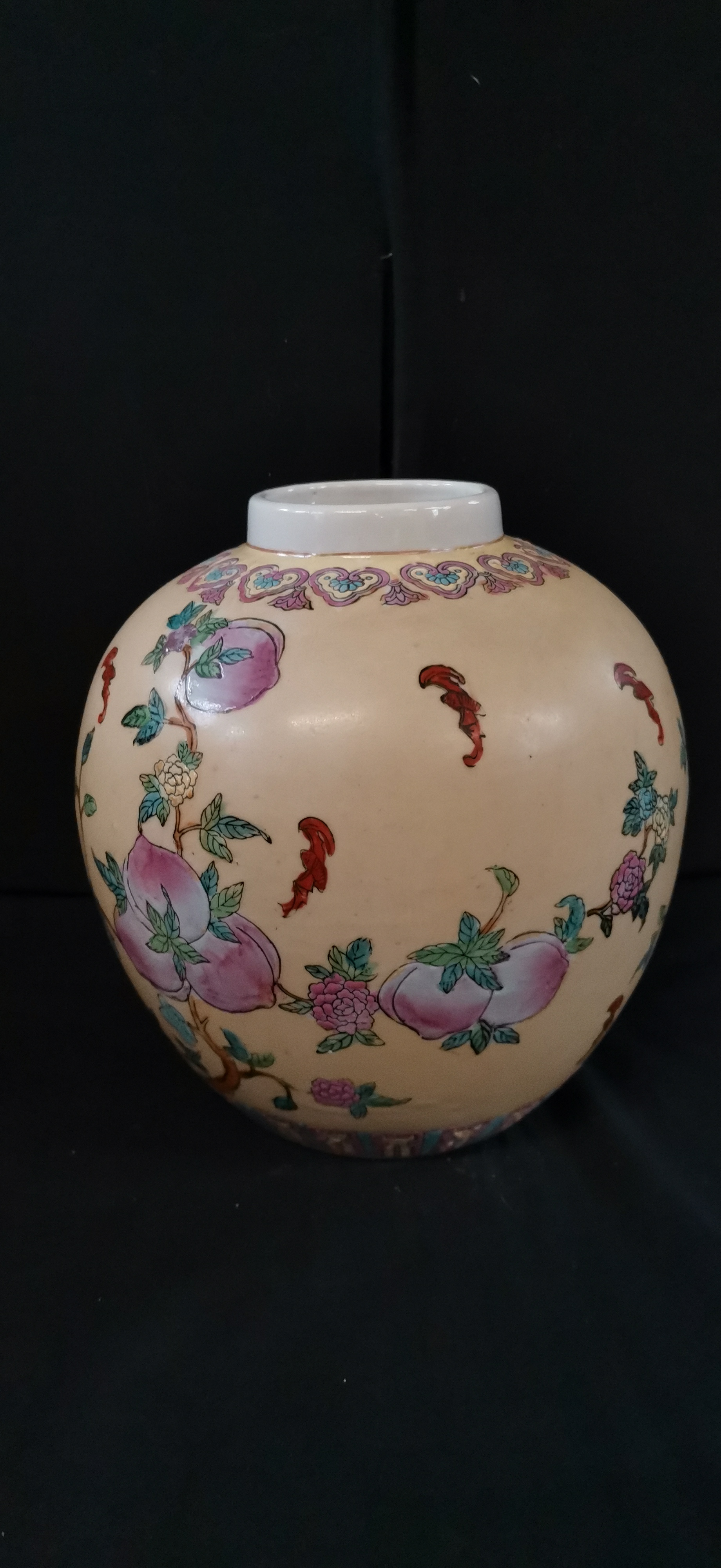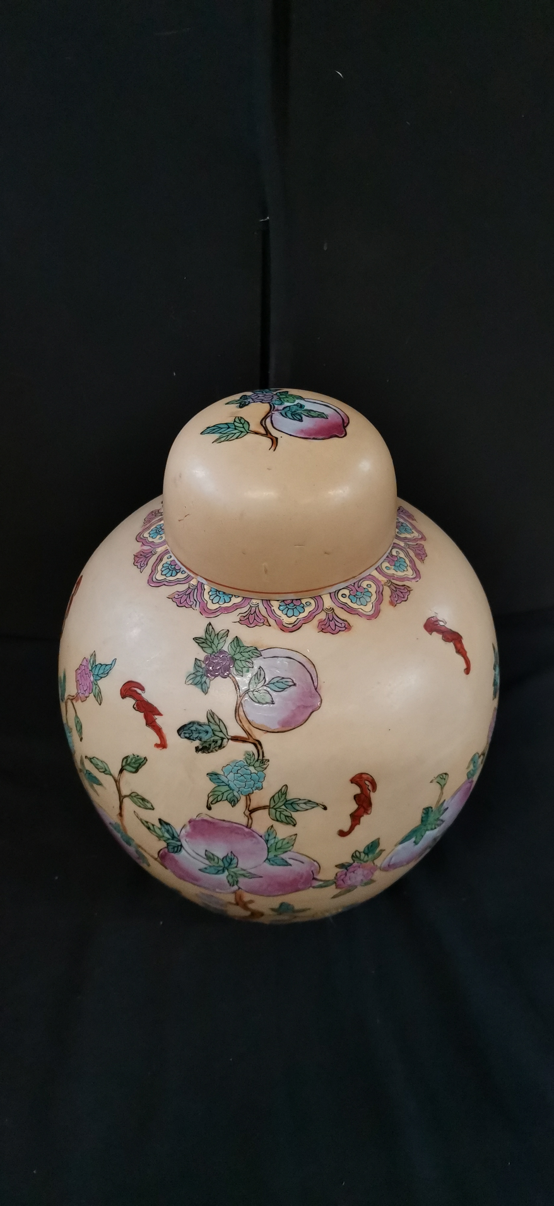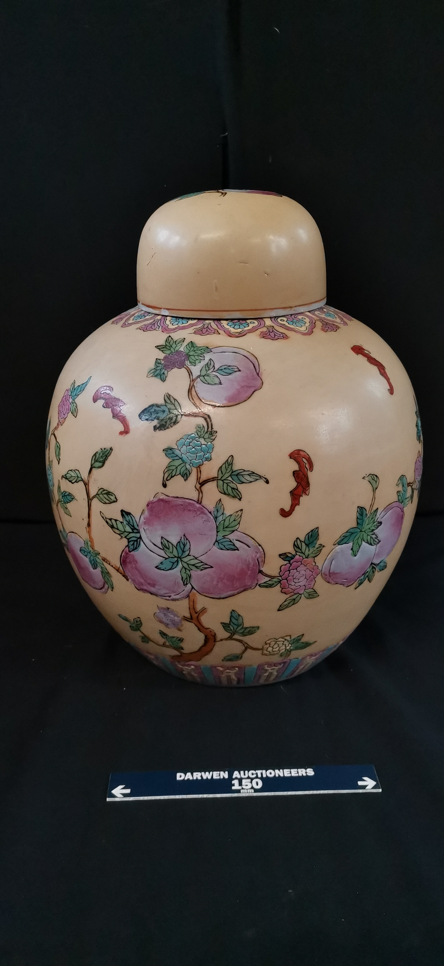 A cream-coloured ceramic ginger jar with matching lid, decorated with colourful peaches, floral motifs, and red bats, featuring a square iron-red seal mark on the base and measuring approximately 220mm in height.