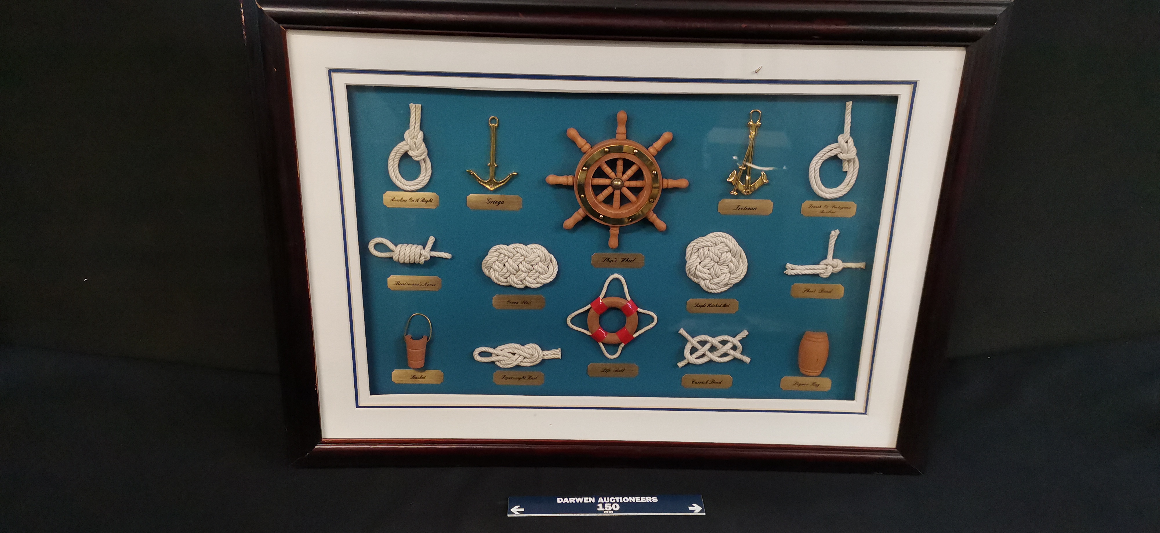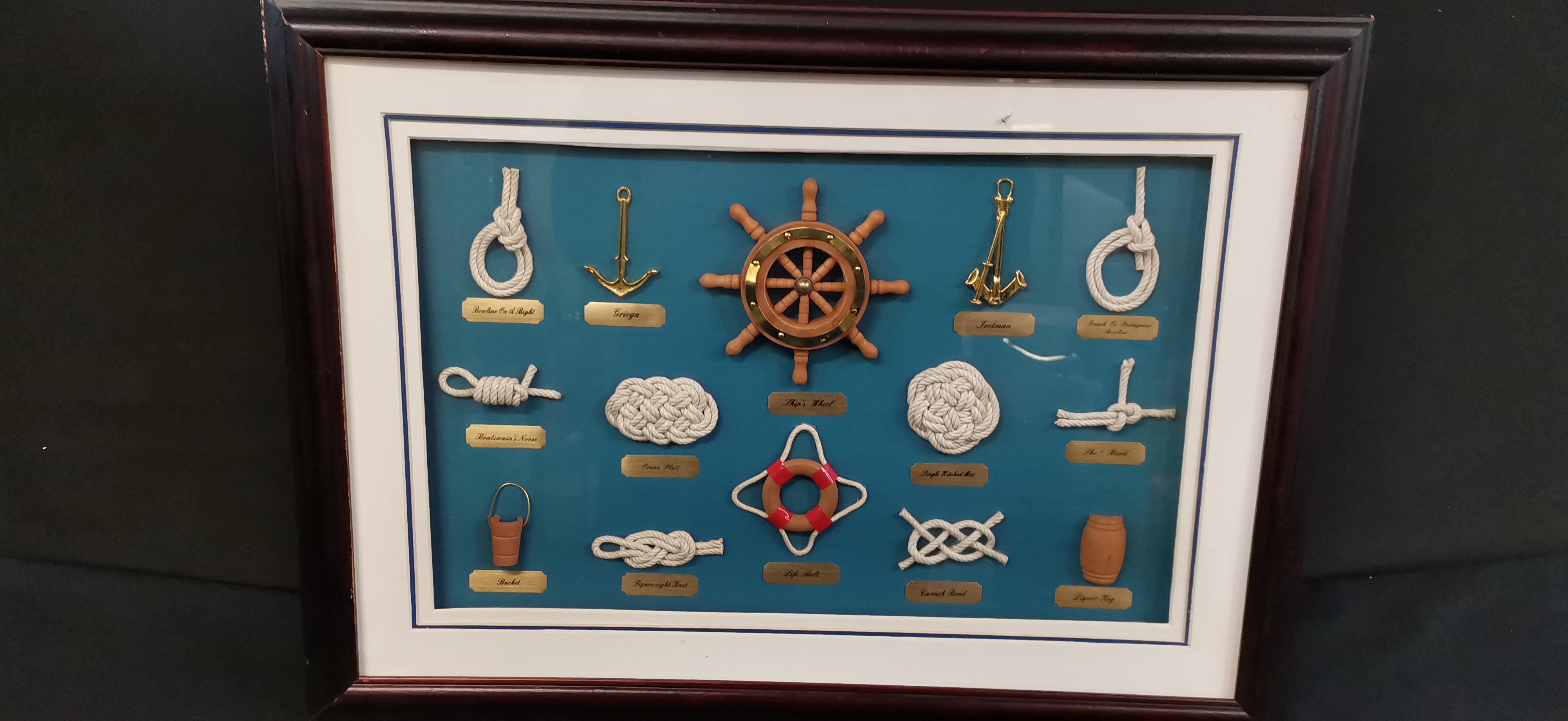 A framed shadow box containing a collection of miniature rope knots and maritime objects on a teal background, measuring approximately 450mm in width.