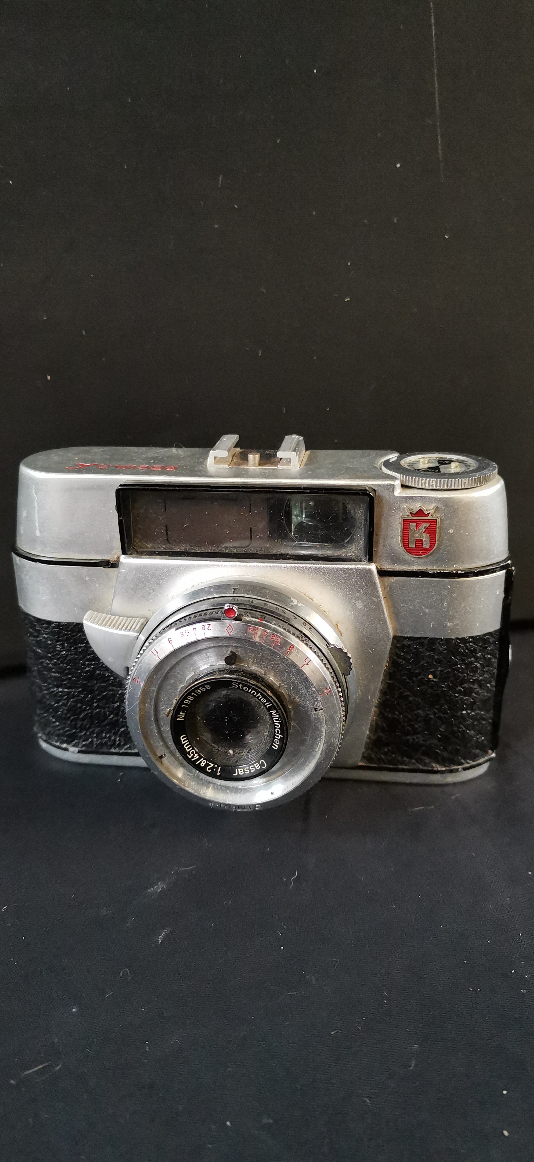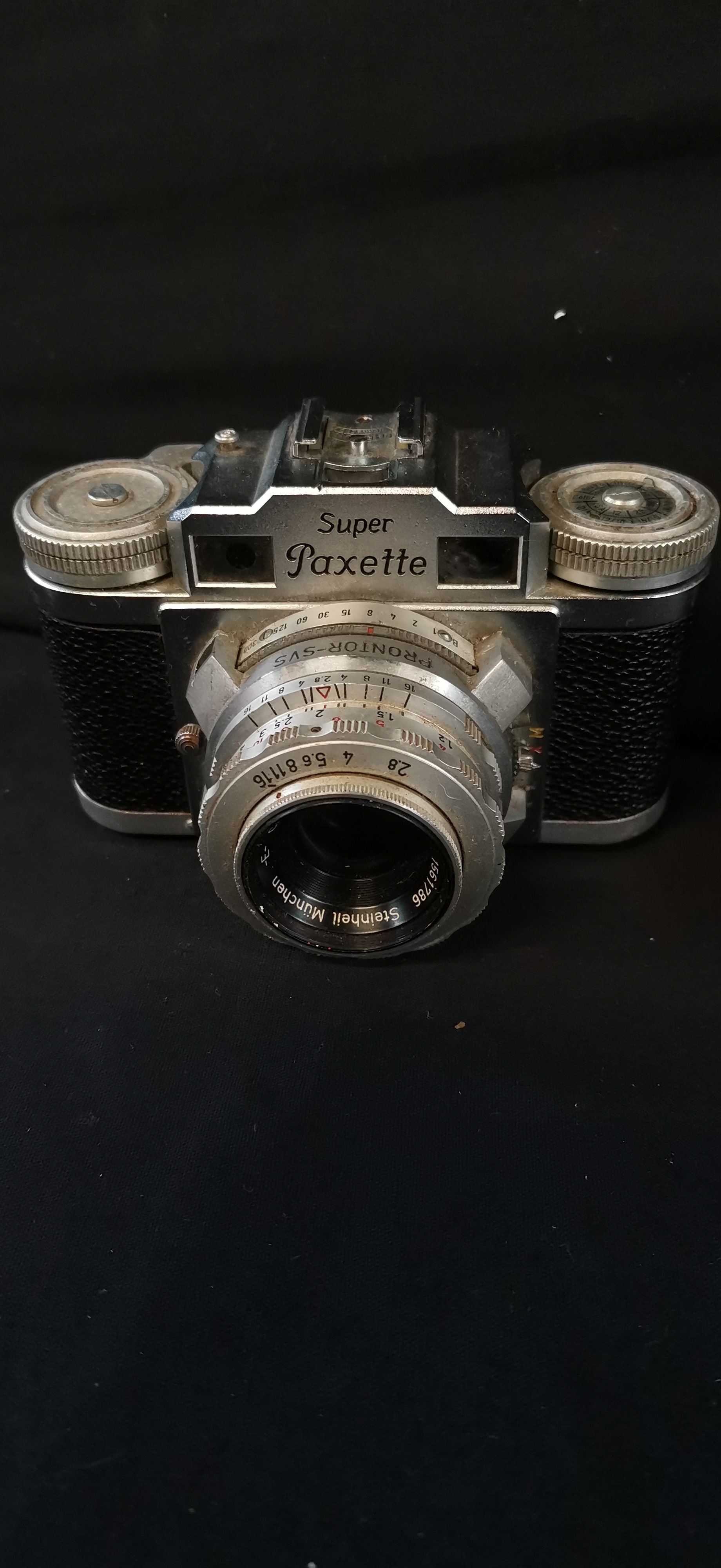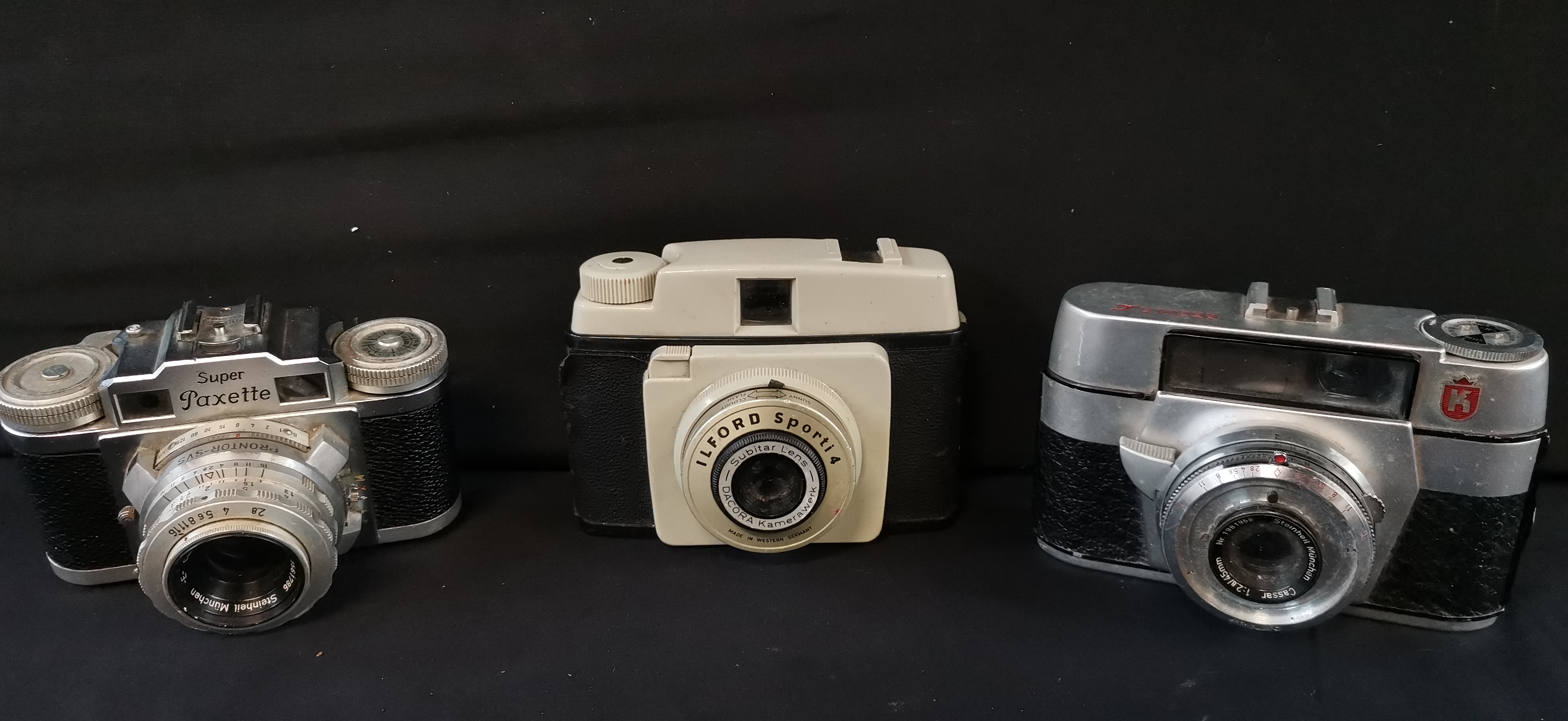 A collection of vintage cameras featuring a Braun Super Paxette, an Ilford Sporti 4, and a King camera with Steinheil München lenses.