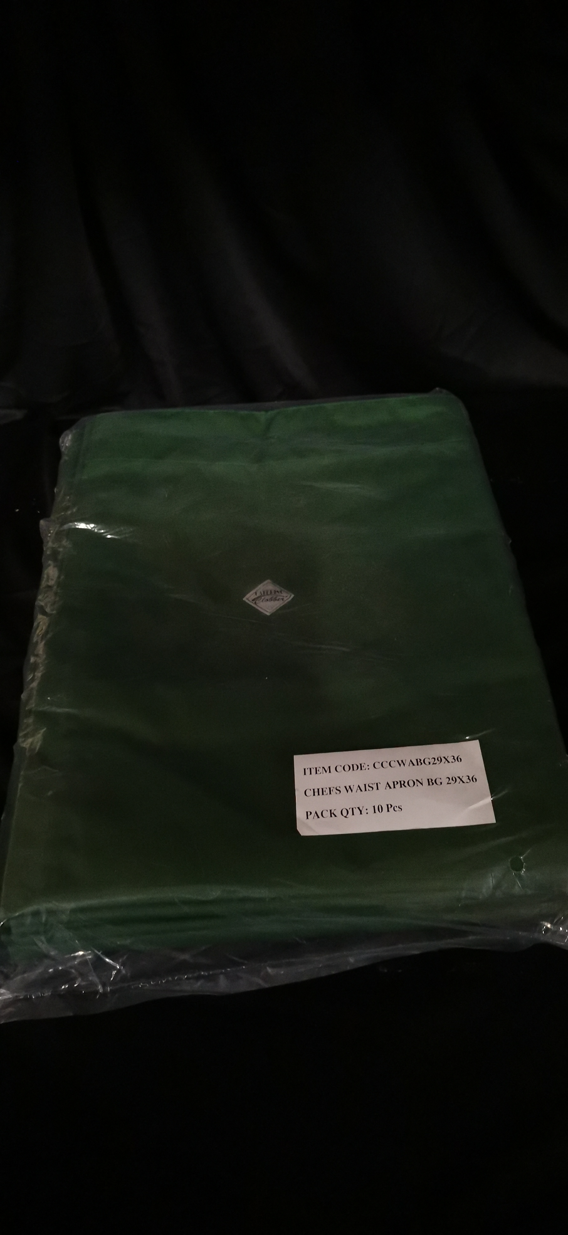 A pack of 10 green chef’s waist aprons by Catering Clobber, item code CCCWABG29X36, measuring 29 by 36 inches.