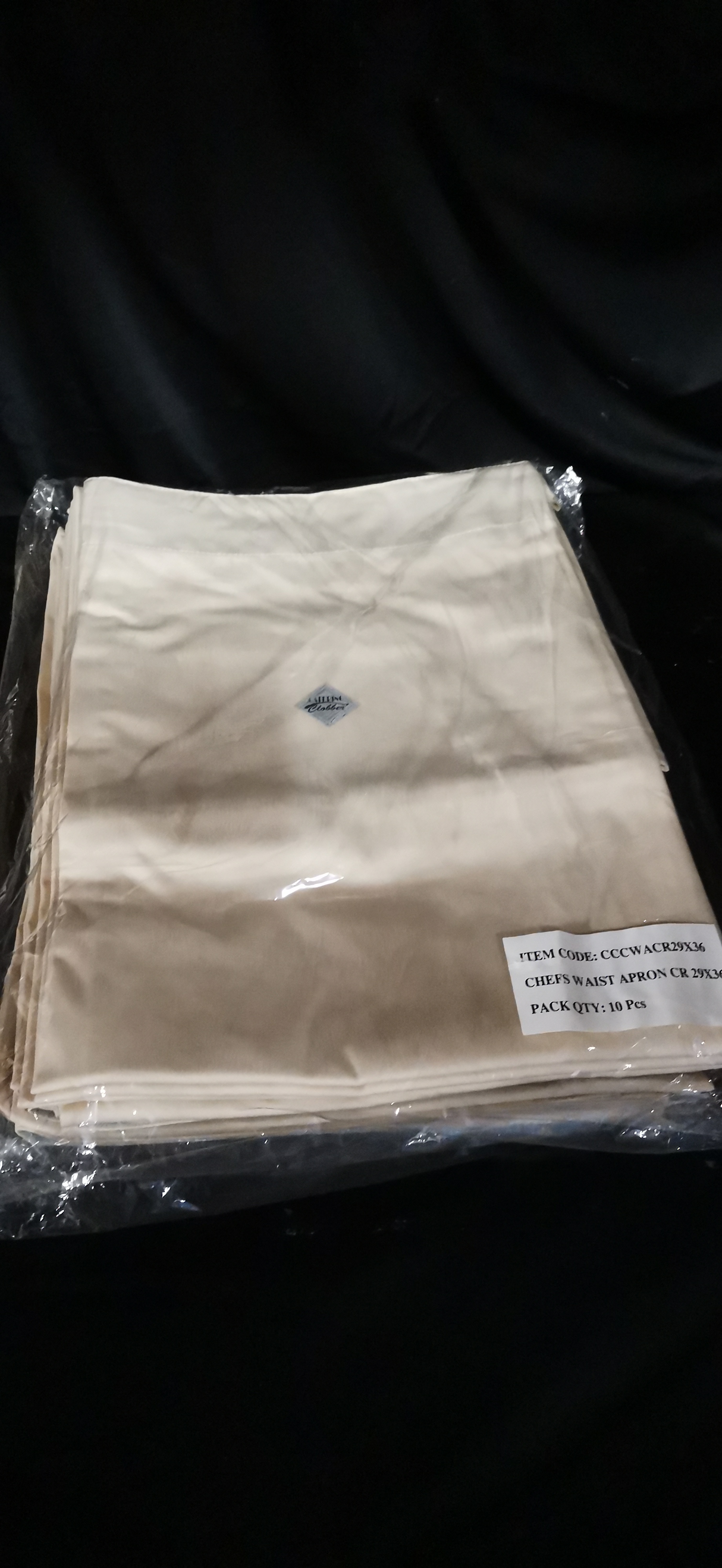 Ten cream-coloured chef waist aprons by Catering Clobber, each measuring approximately 29 by 36 inches and presented in original packaging.