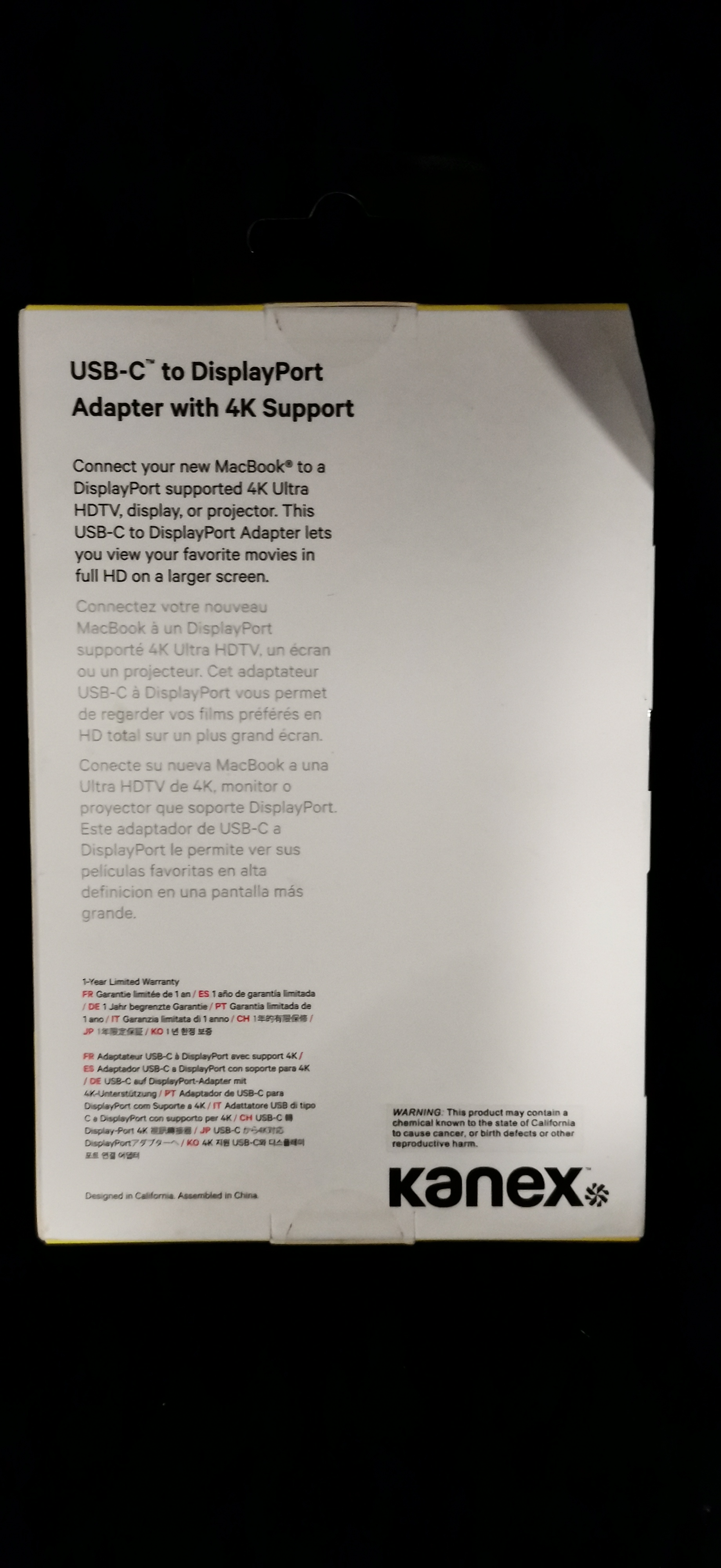 A boxed Kanex USB-C to DisplayPort adapter featuring 4K support and Thunderbolt 3 compatibility, measuring 21 cm in length.