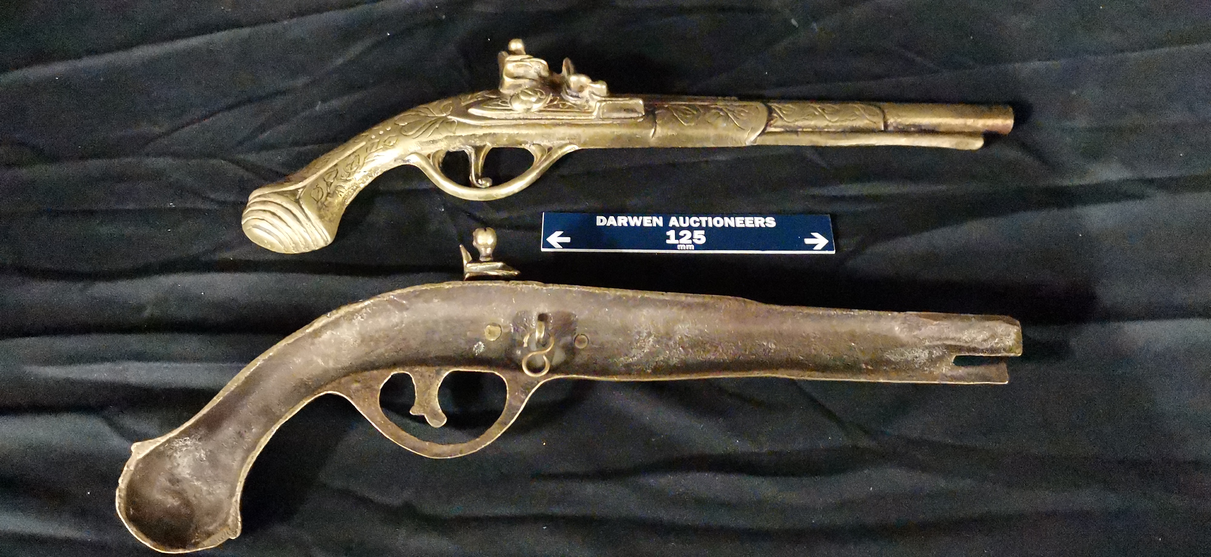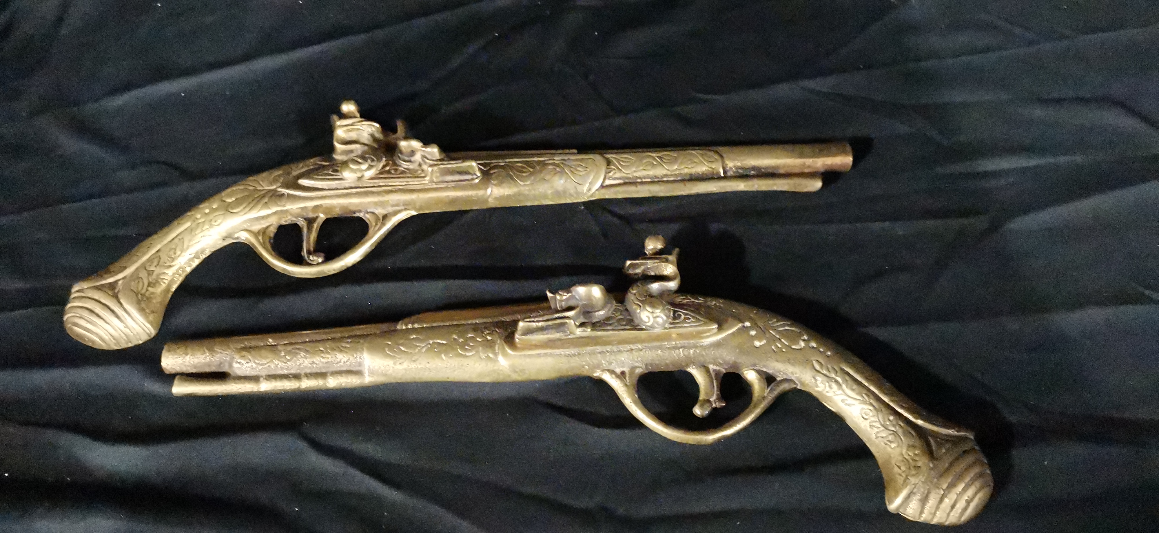 A pair of gold-toned brass decorative flintlock pistol replicas with ornate scrollwork, each measuring approximately 380mm in length.