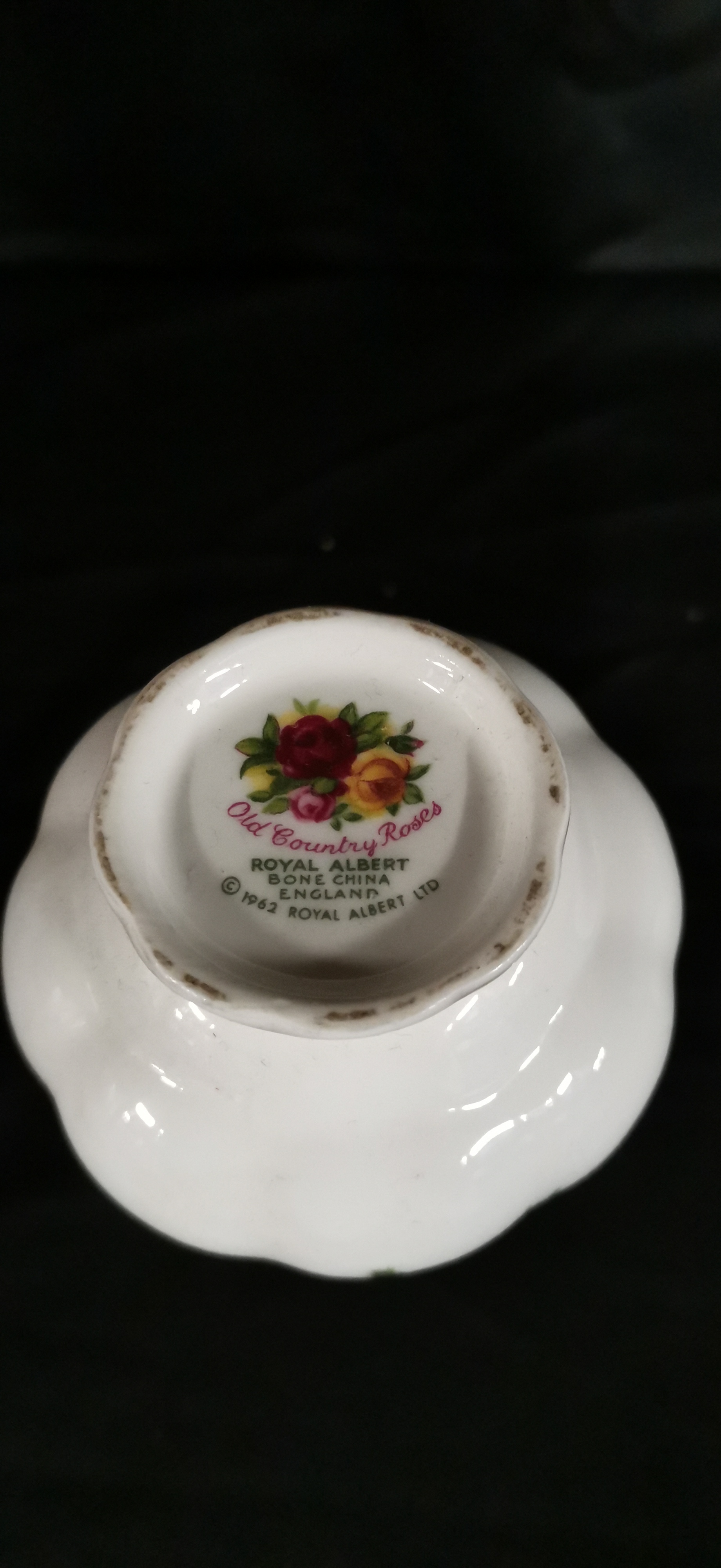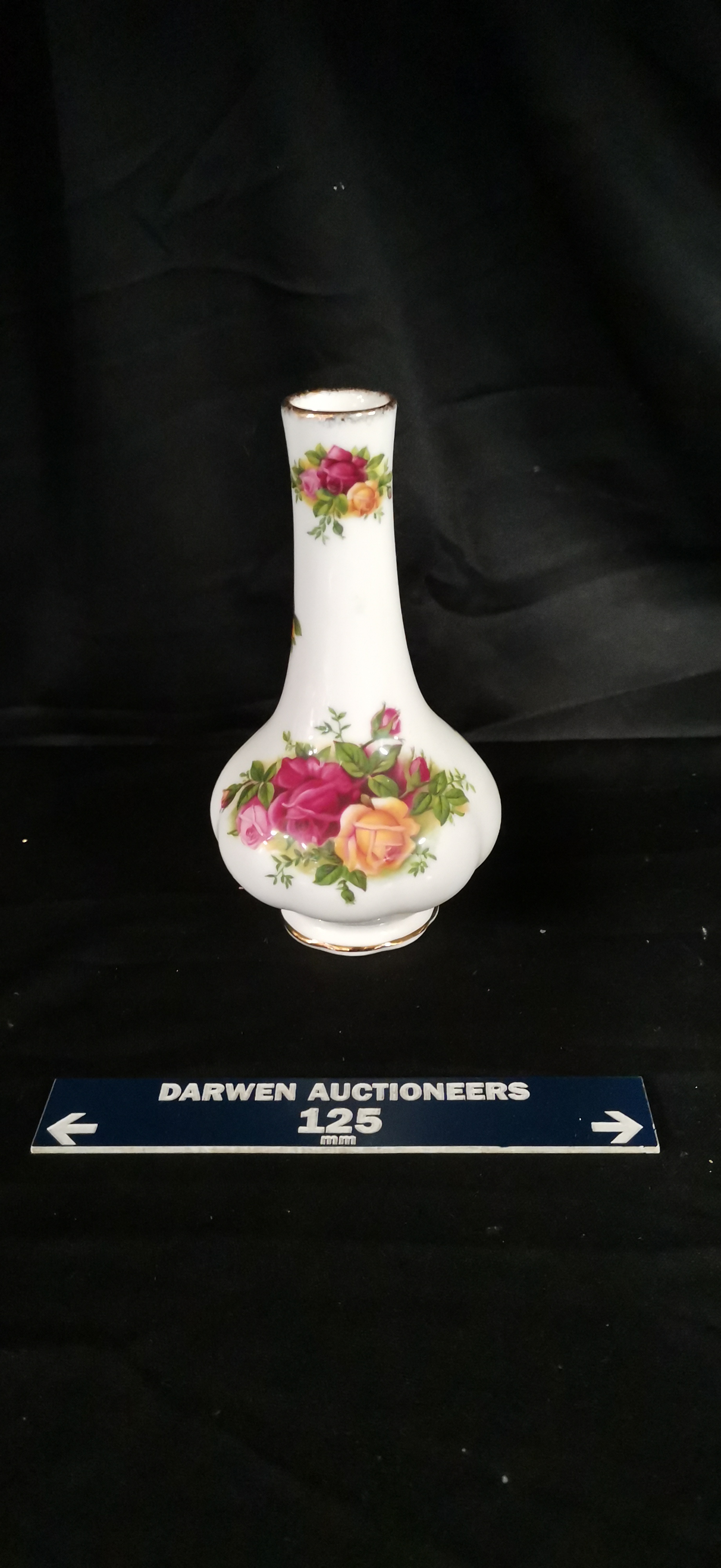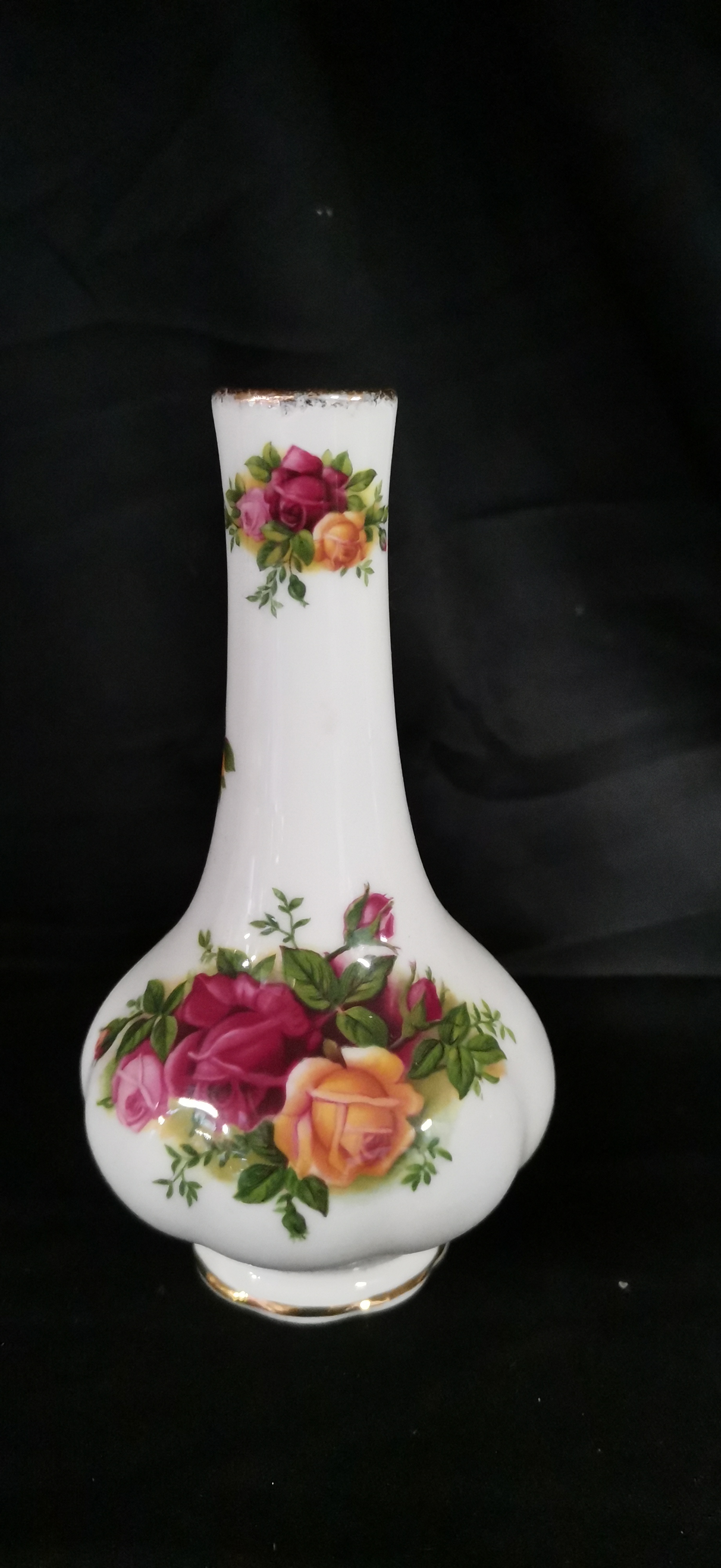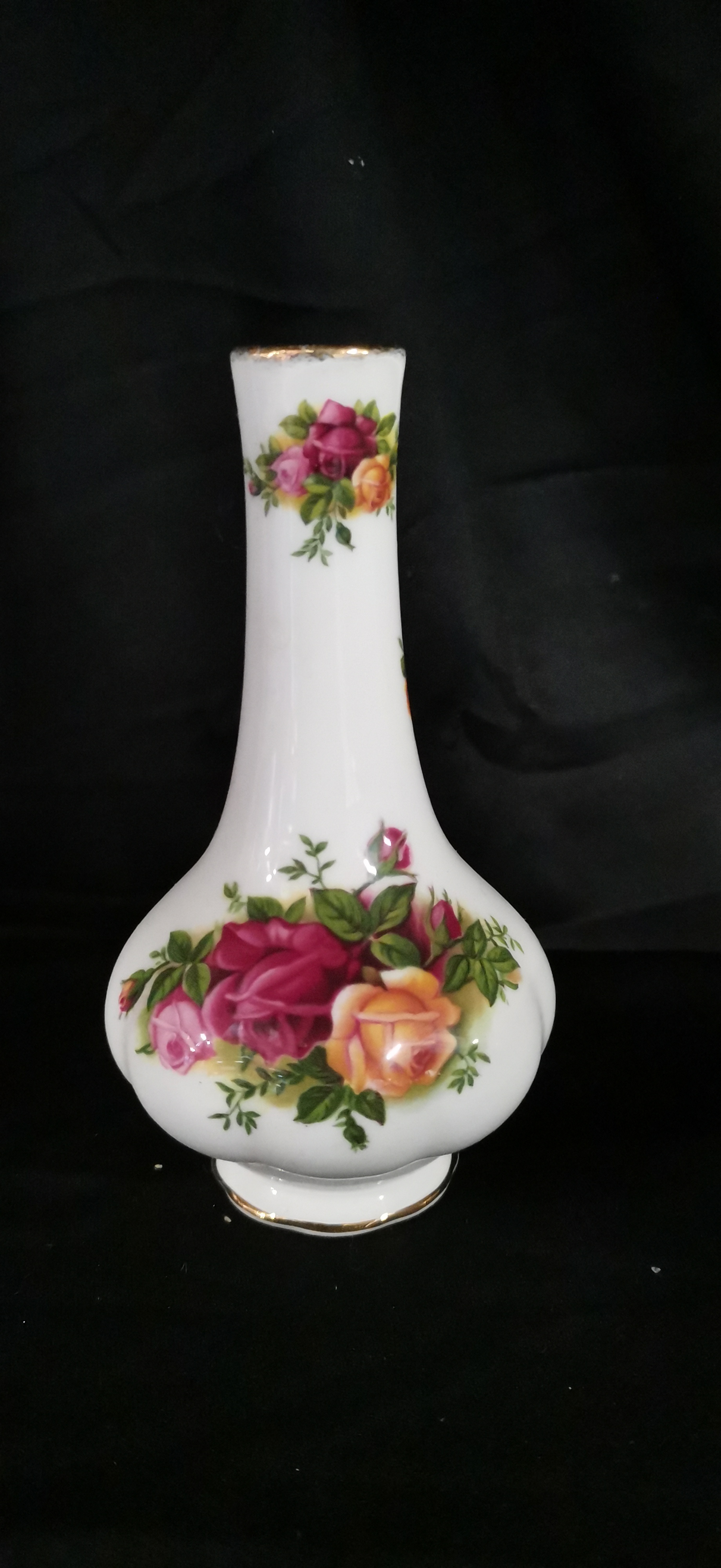 A Royal Albert bone china bud vase in the Old Country Roses pattern featuring multi-coloured floral designs and gold-toned trim, measuring approximately 125 mm in height.