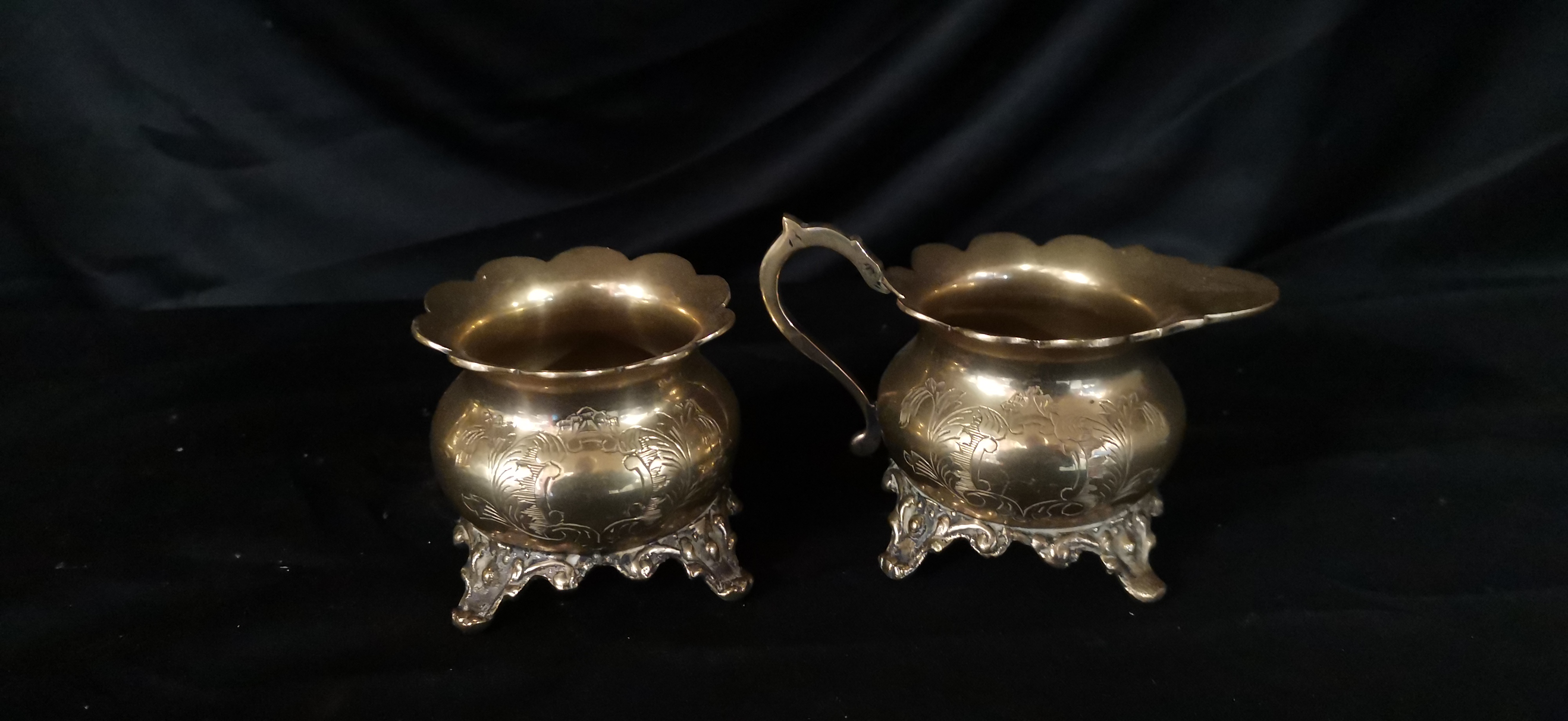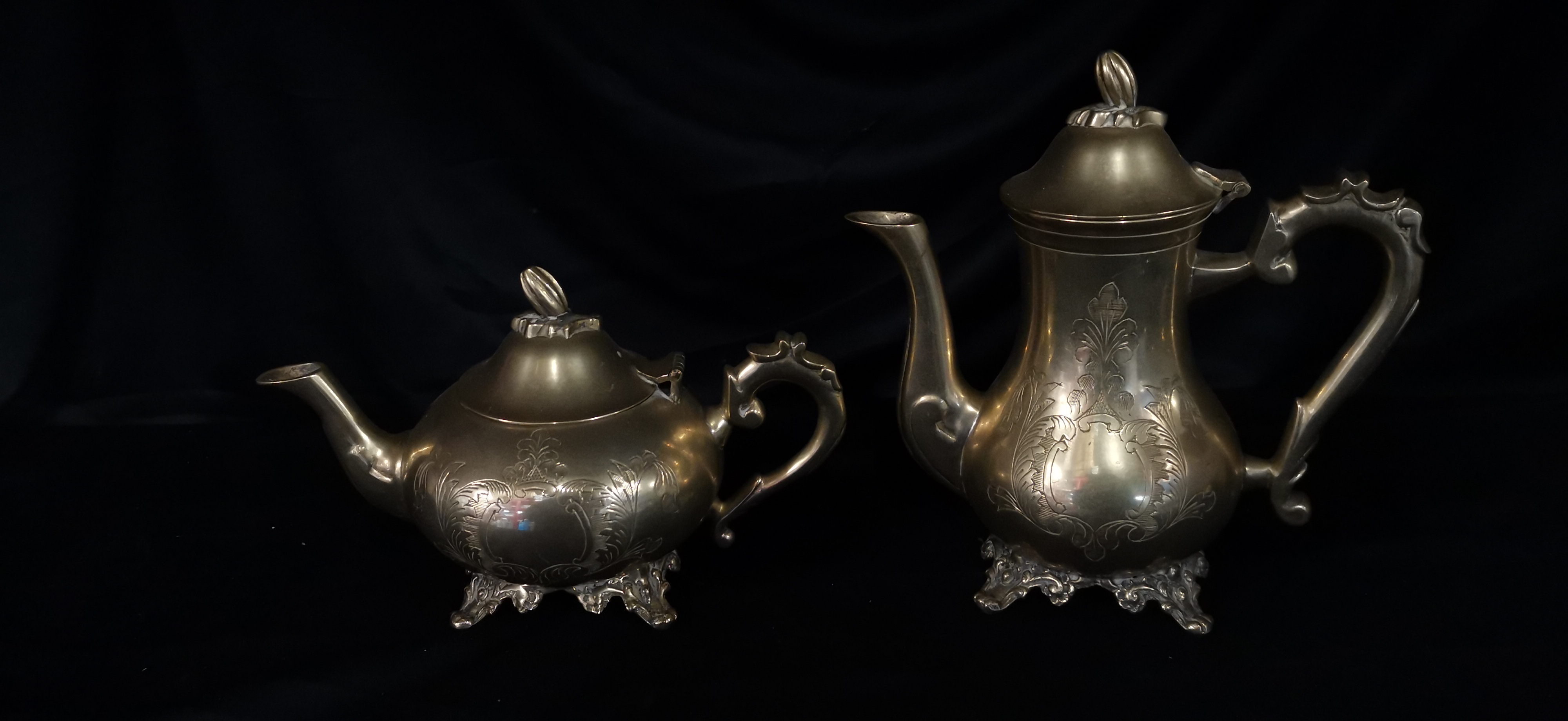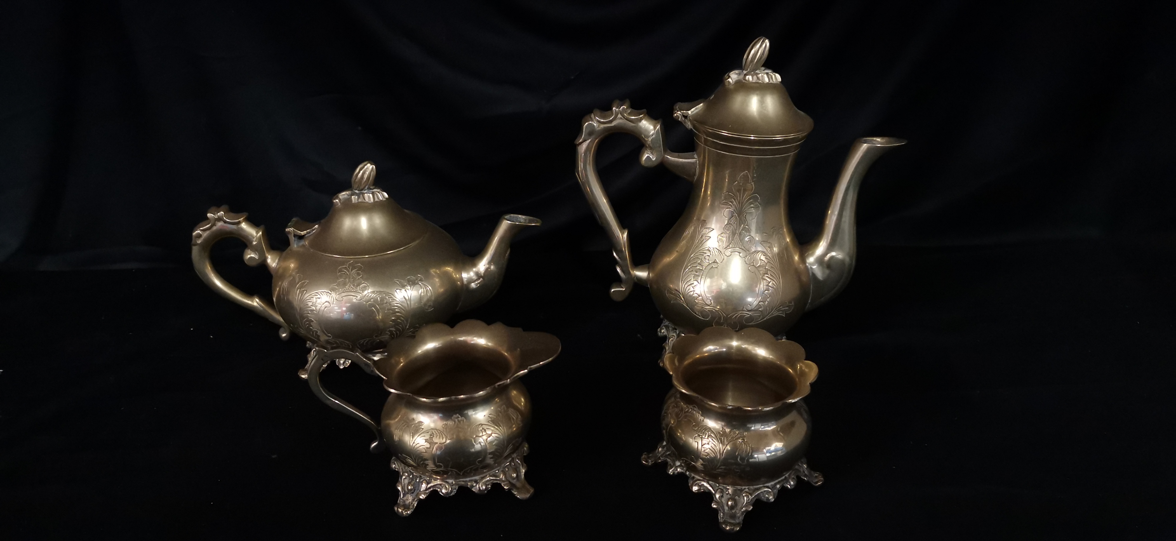 A collection of gold-toned electro-plated nickel silver tea and coffee service items featuring ornate floral engravings and E.P.N.S star markings.