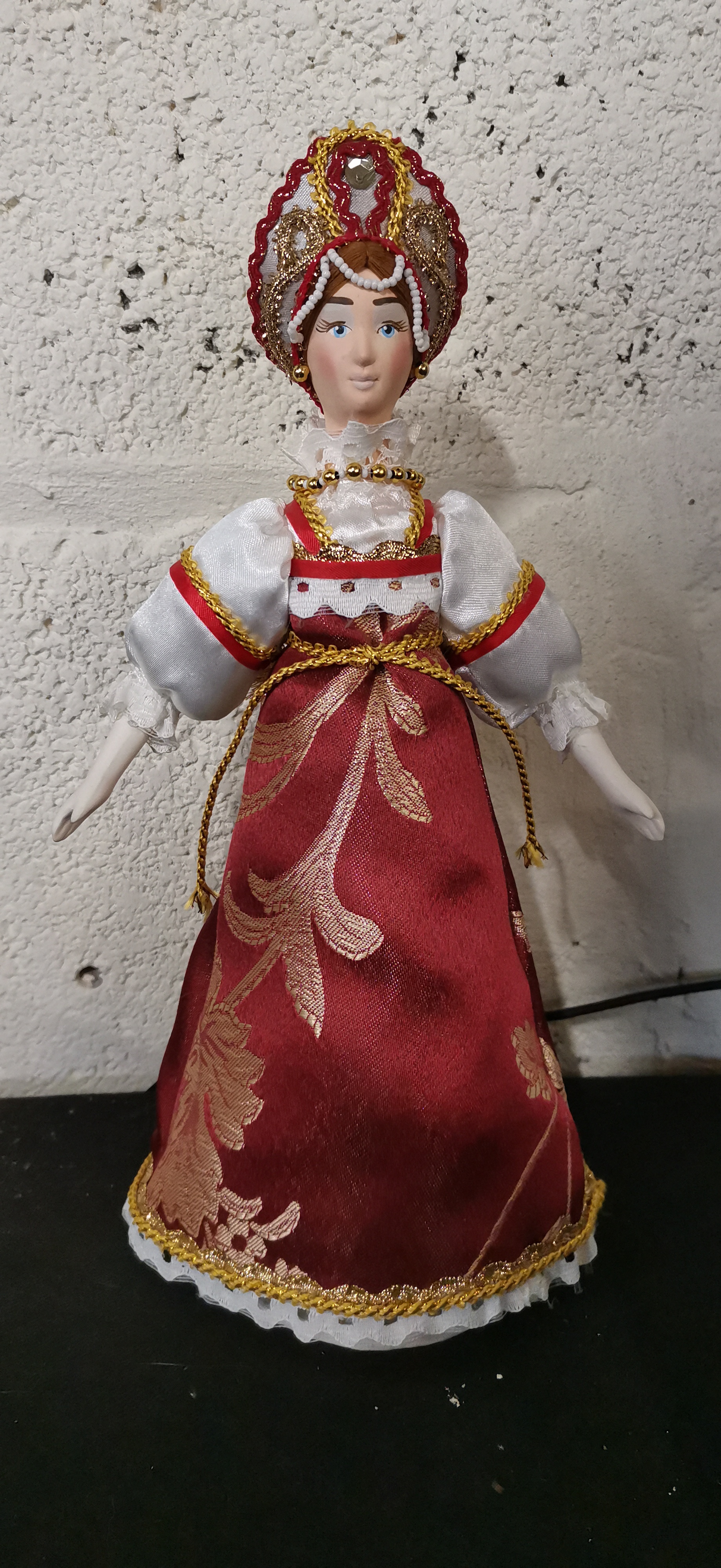 A Russian doll wearing a traditional red, white and gold dress with a decorative kokoshnik headdress.