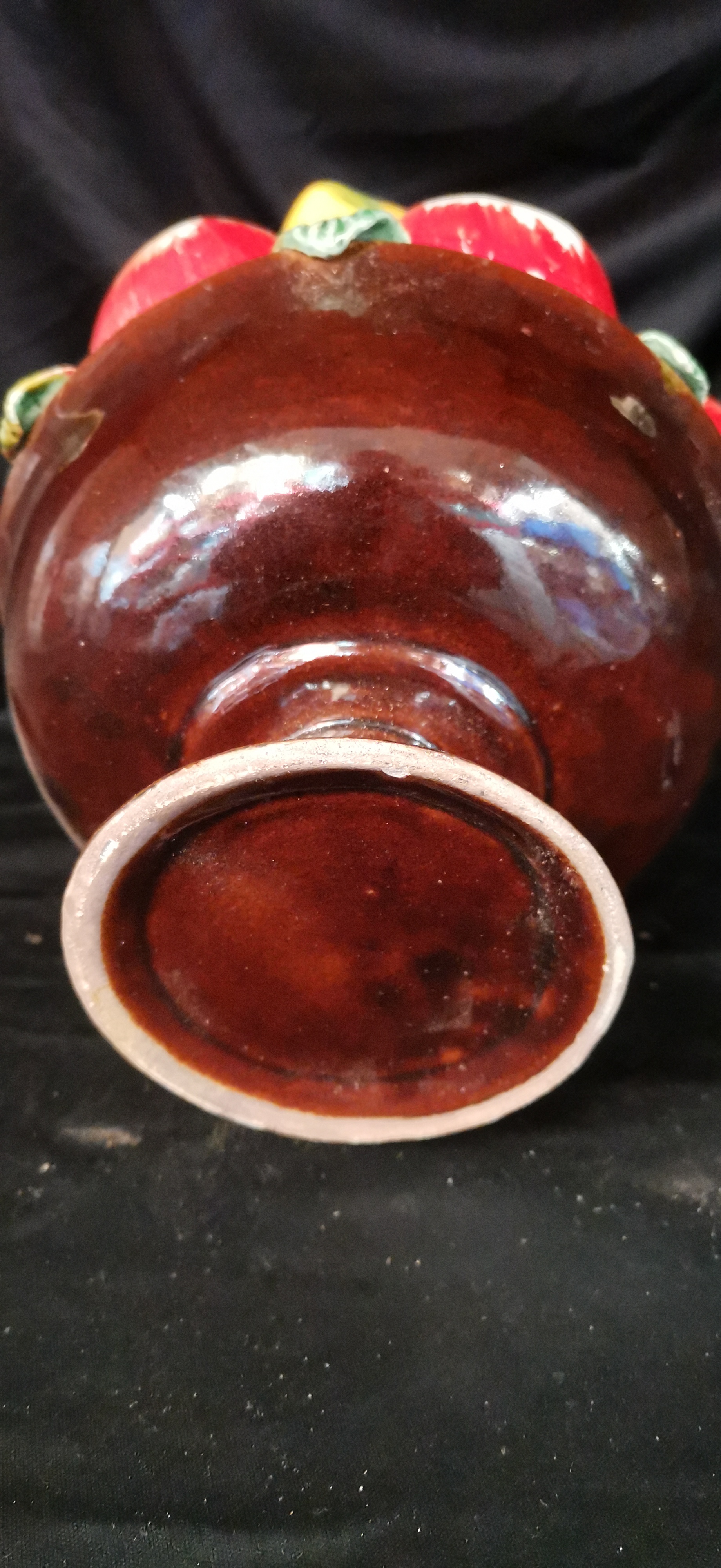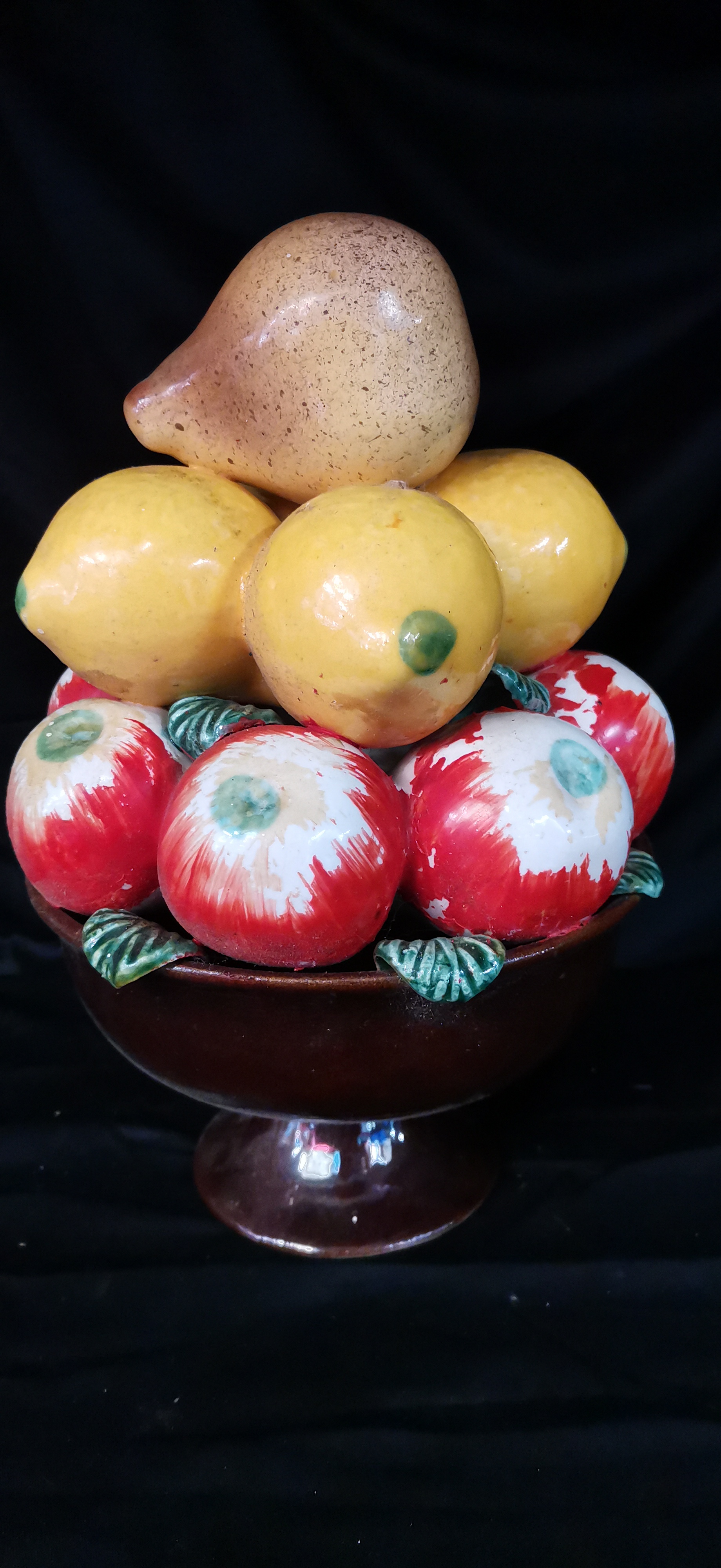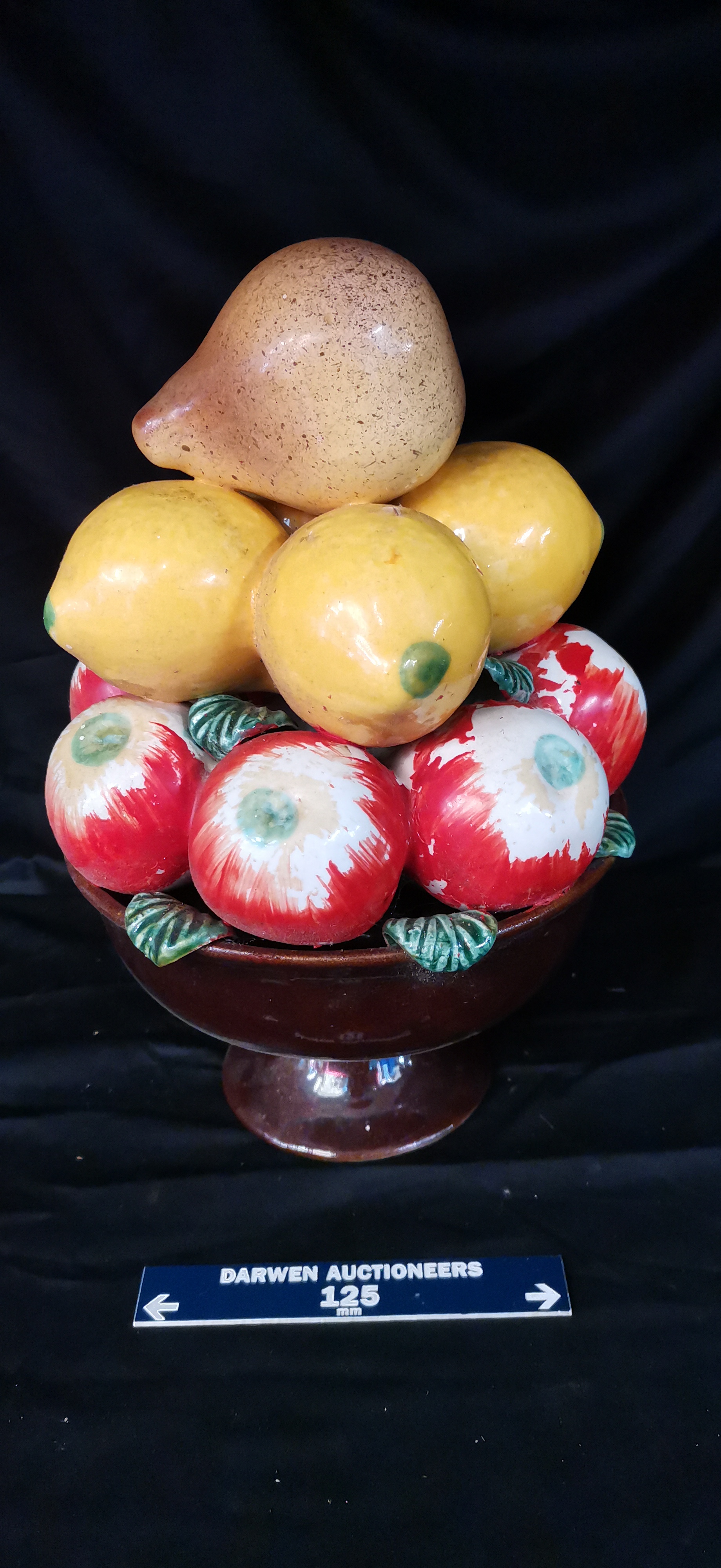 A ceramic decorative centrepiece featuring a collection of tan, yellow, and red painted fruit with green leaves arranged in a dark brown pedestal bowl, measuring approximately 125mm in width.