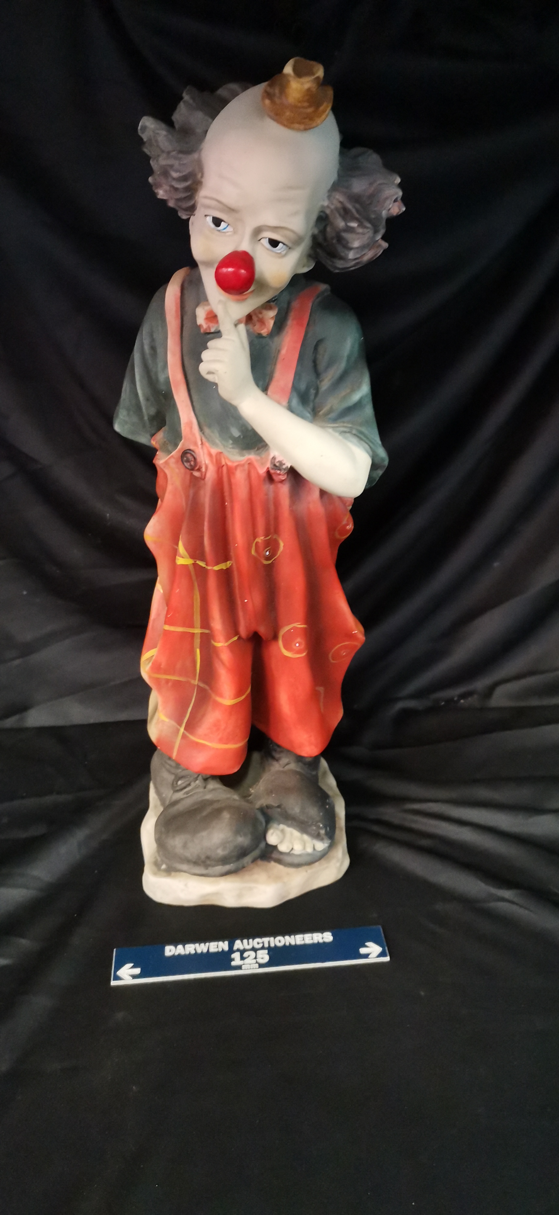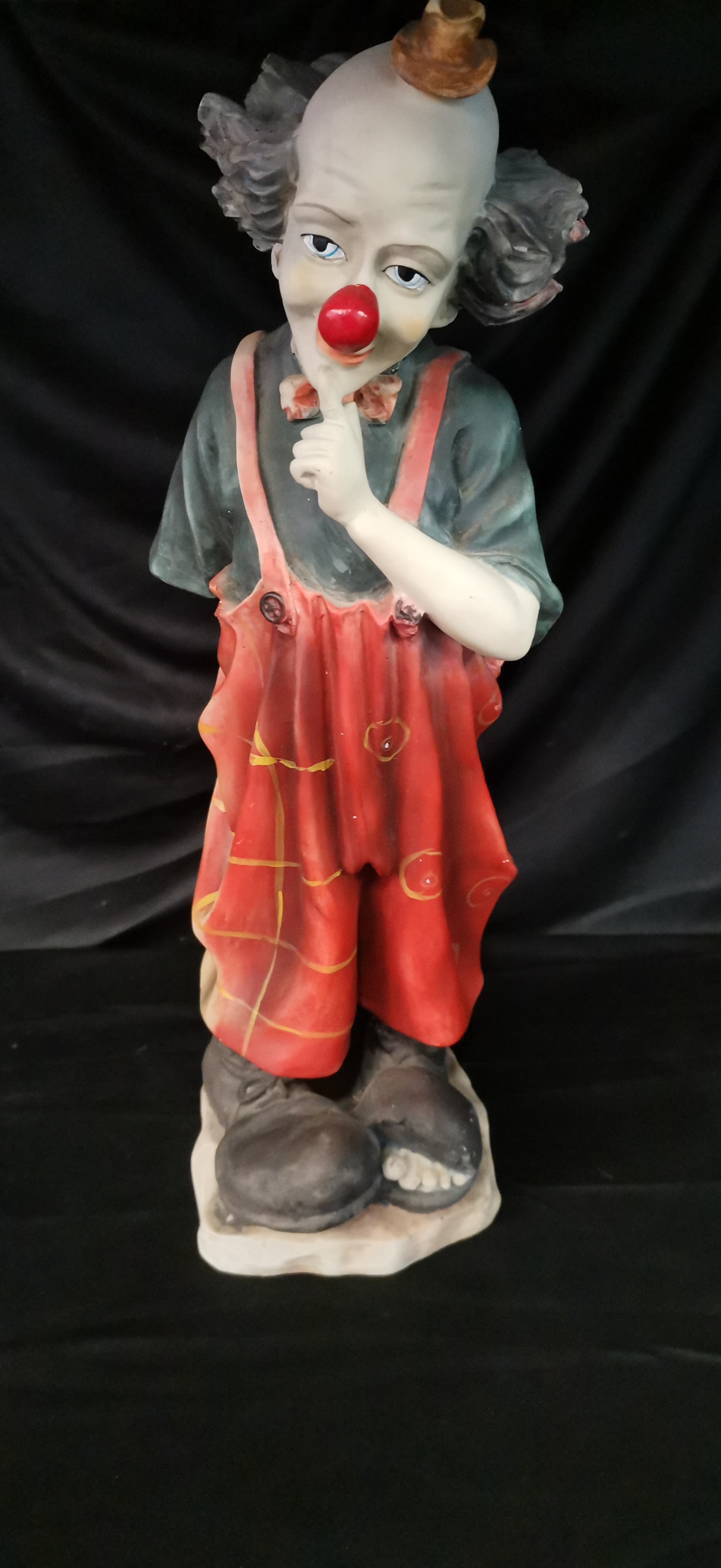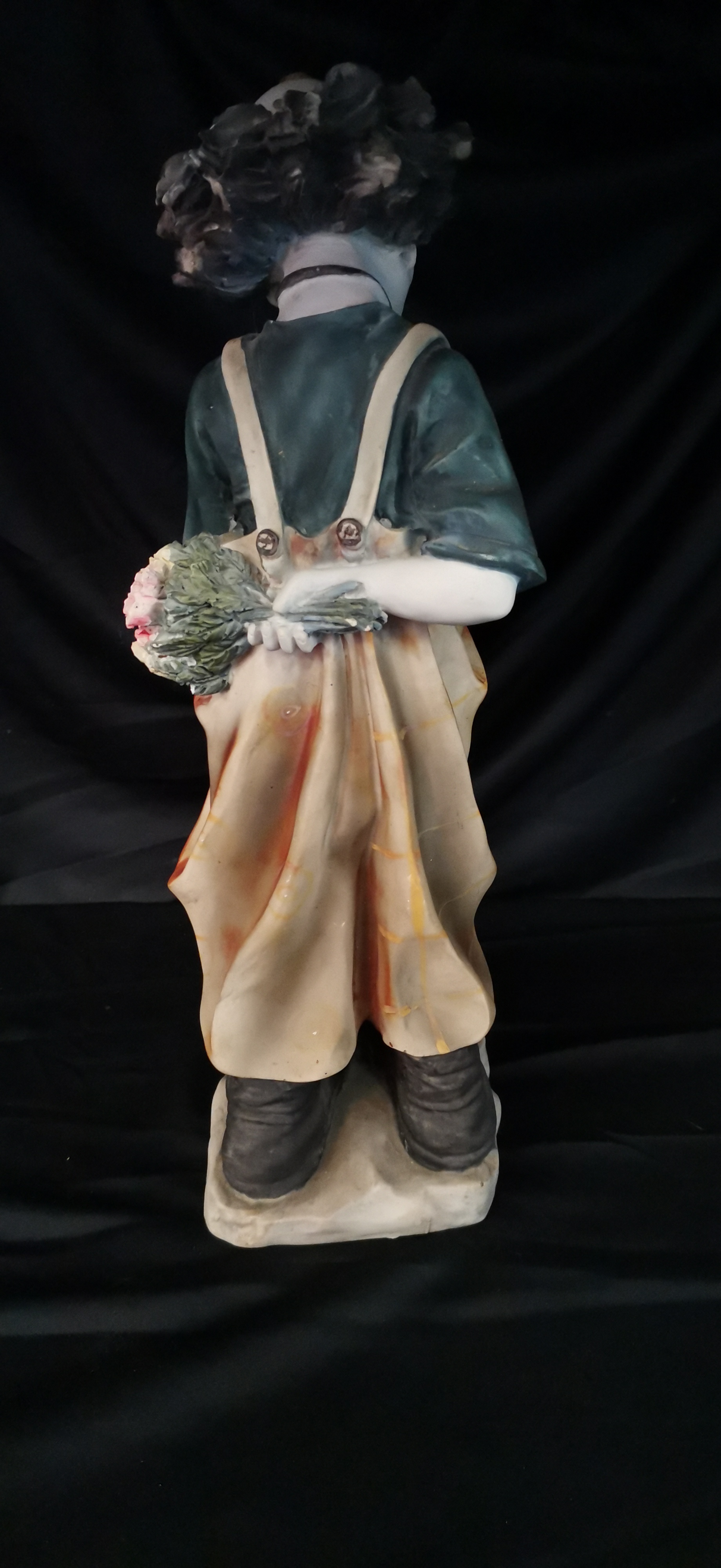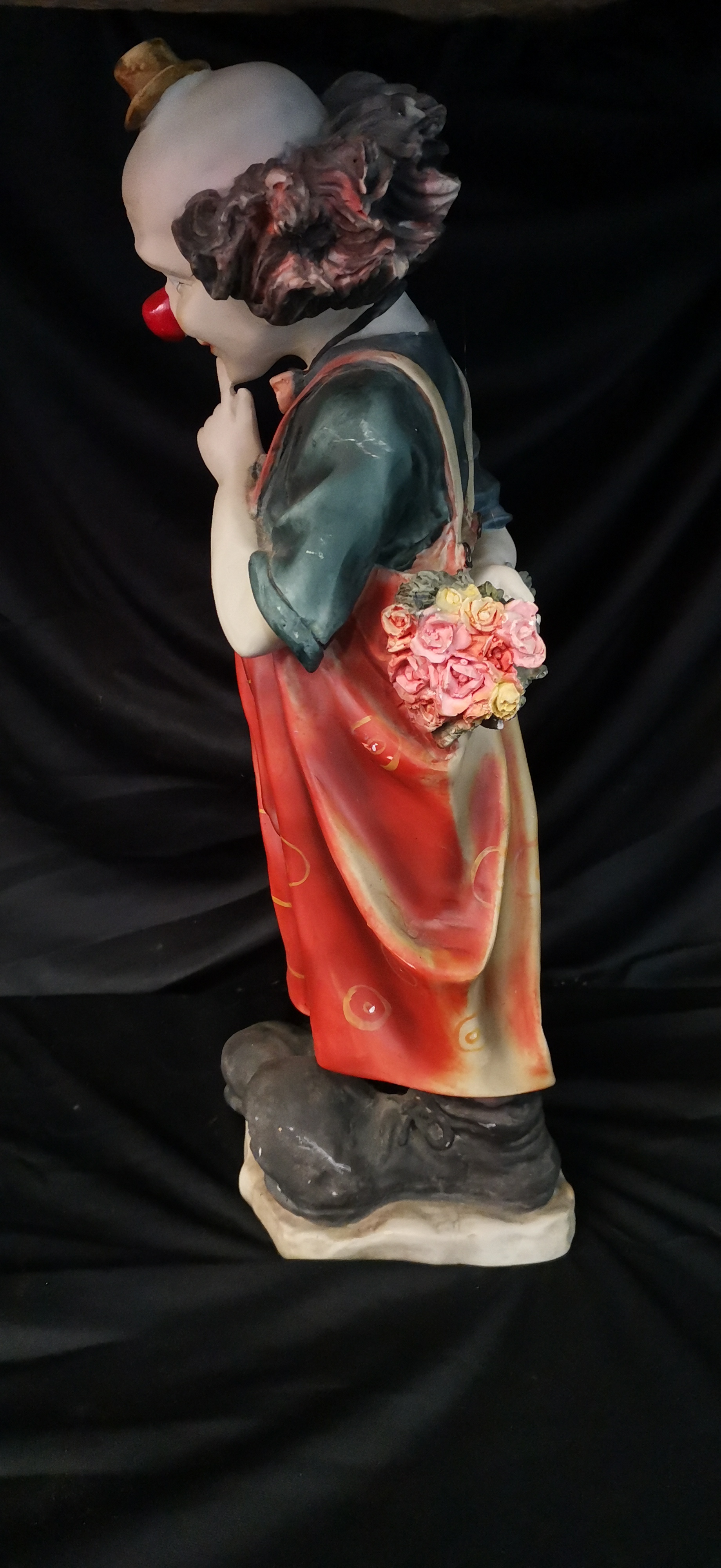 A resin circus clown figurine in a shushing pose holding a bouquet of pink and yellow flowers behind its back, measuring approximately 15 inches in height.