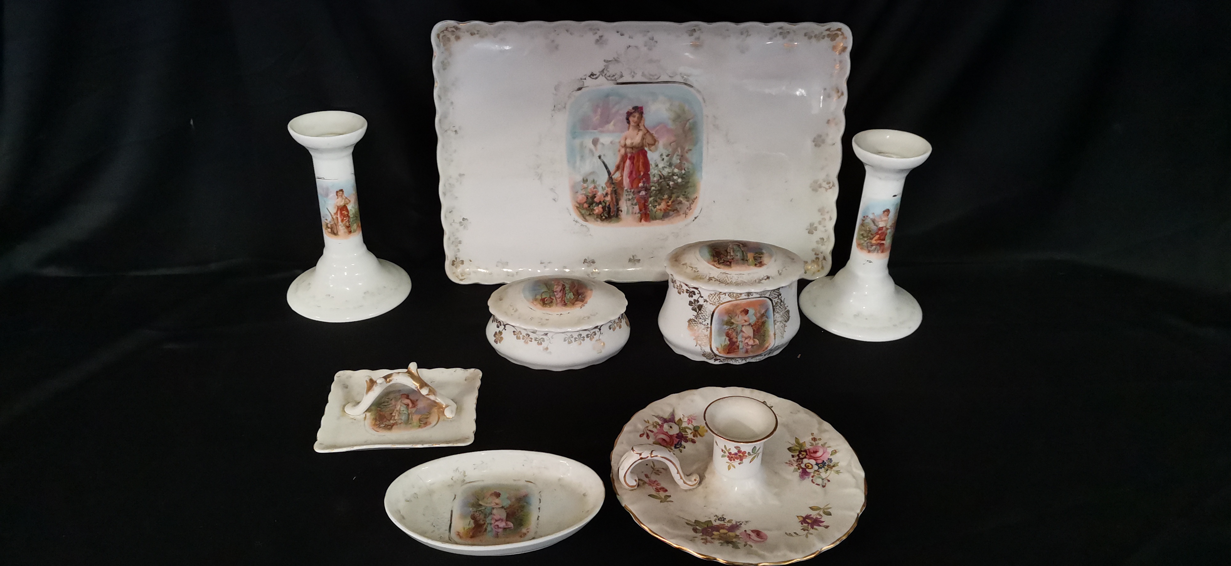 A collection of white porcelain vanity items featuring gilded accents and colourful classical vignettes, including trays, candlesticks, and lidded containers.