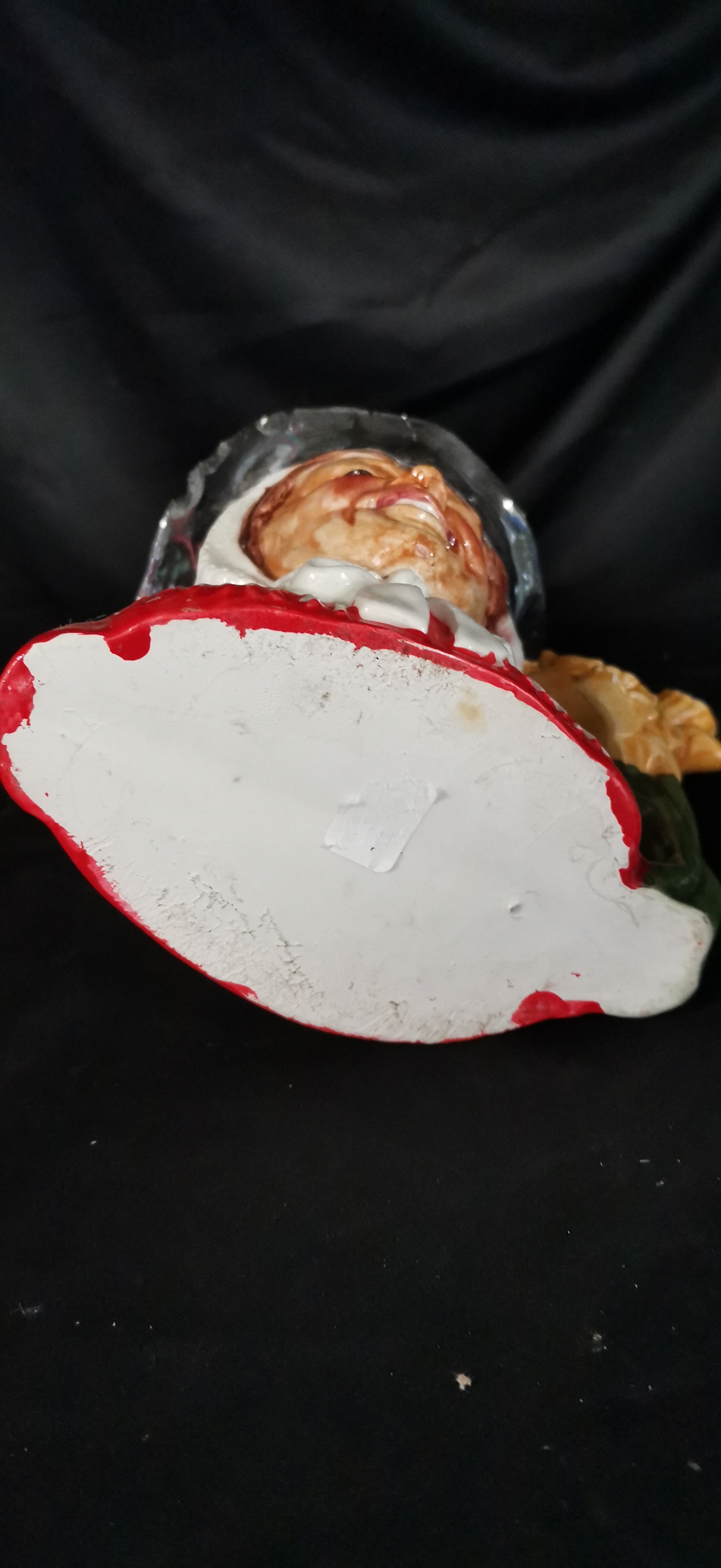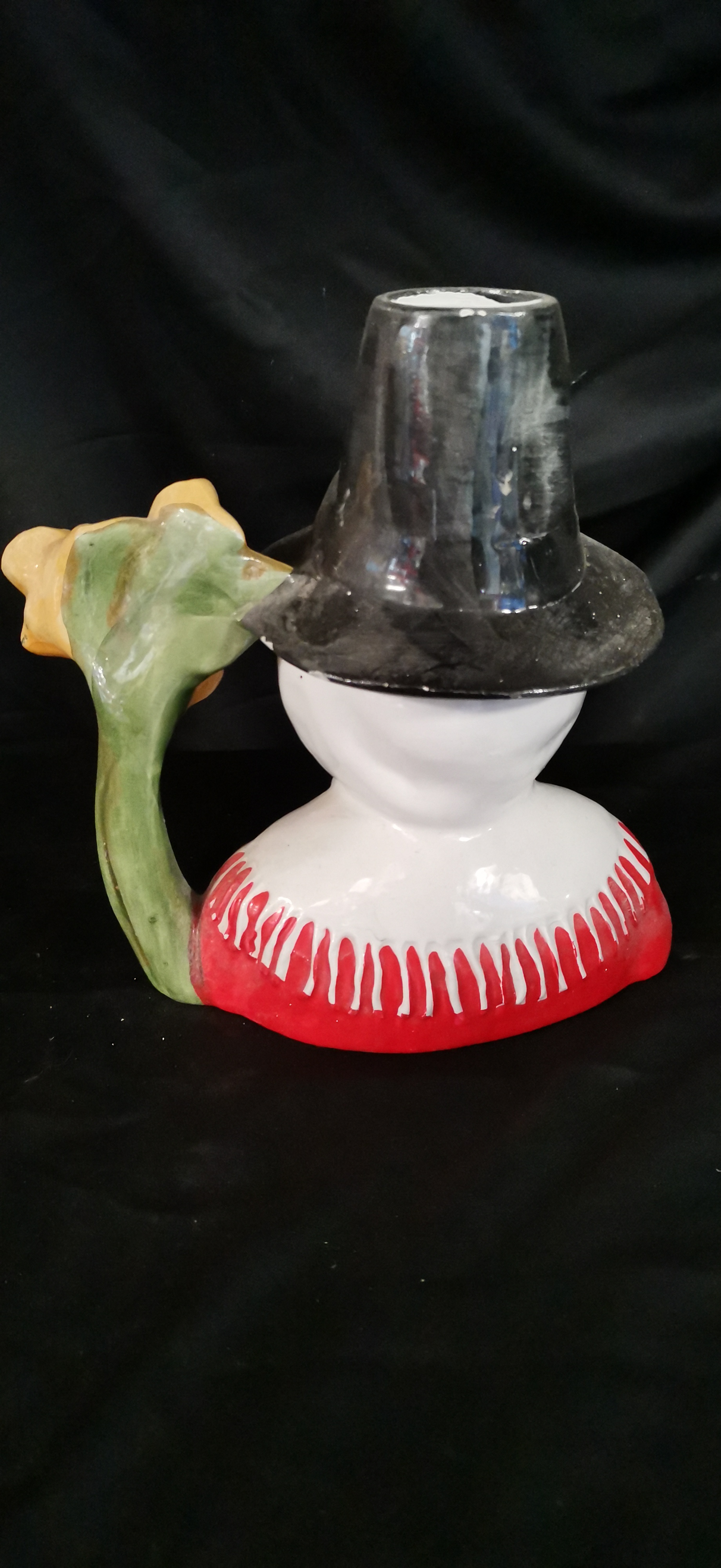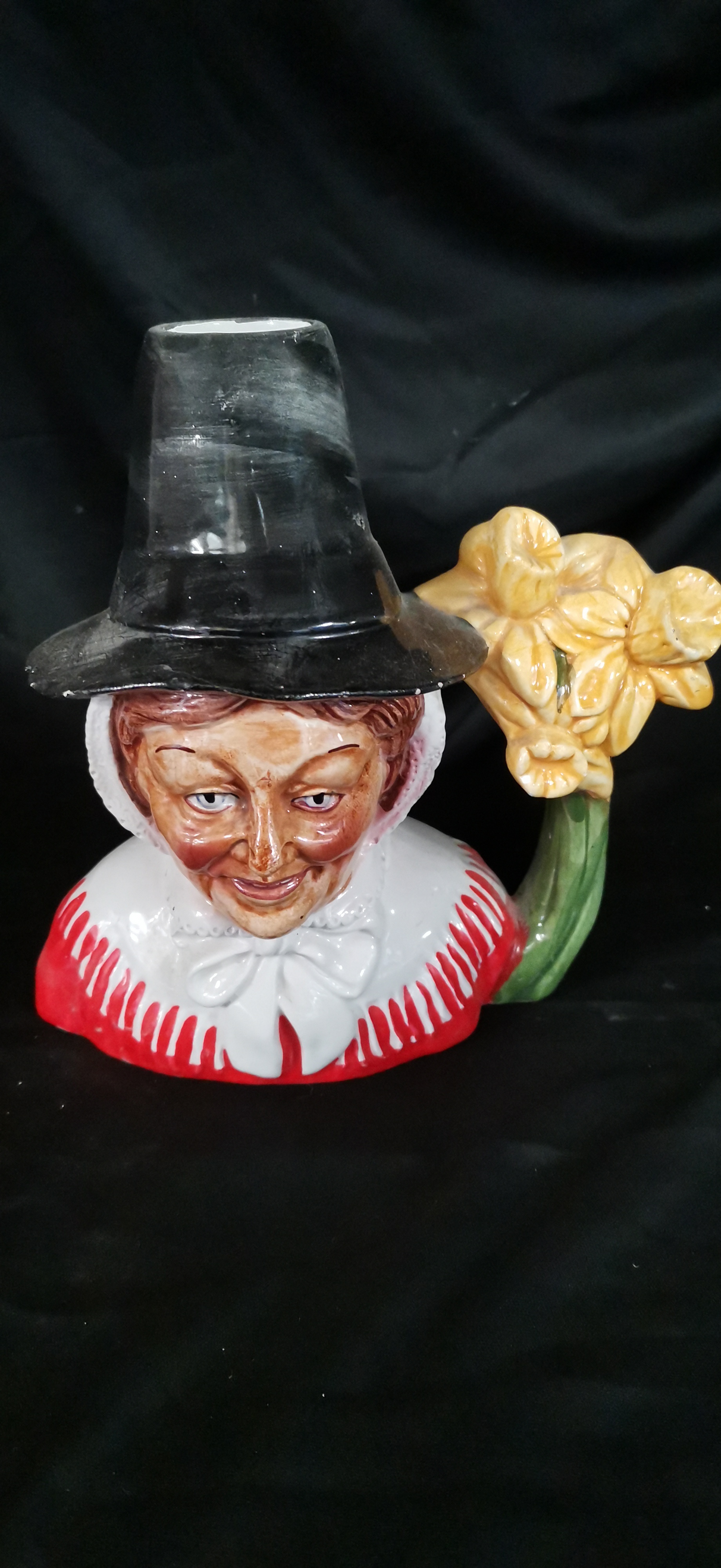 A multi-coloured ceramic character jug depicting Sairey Gamp wearing a black hat and red shawl with a daffodil-shaped handle.