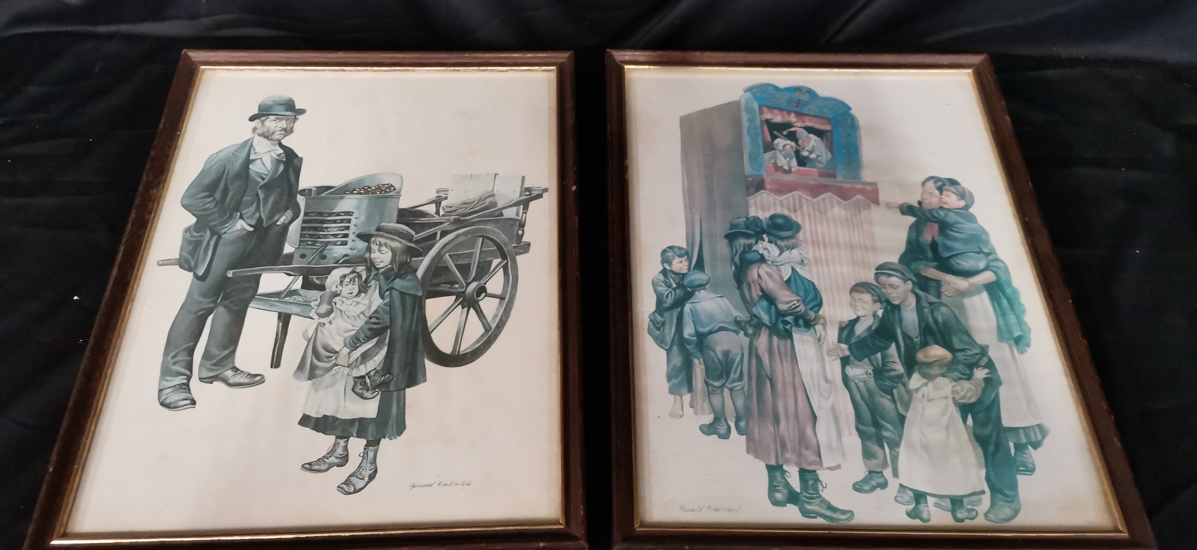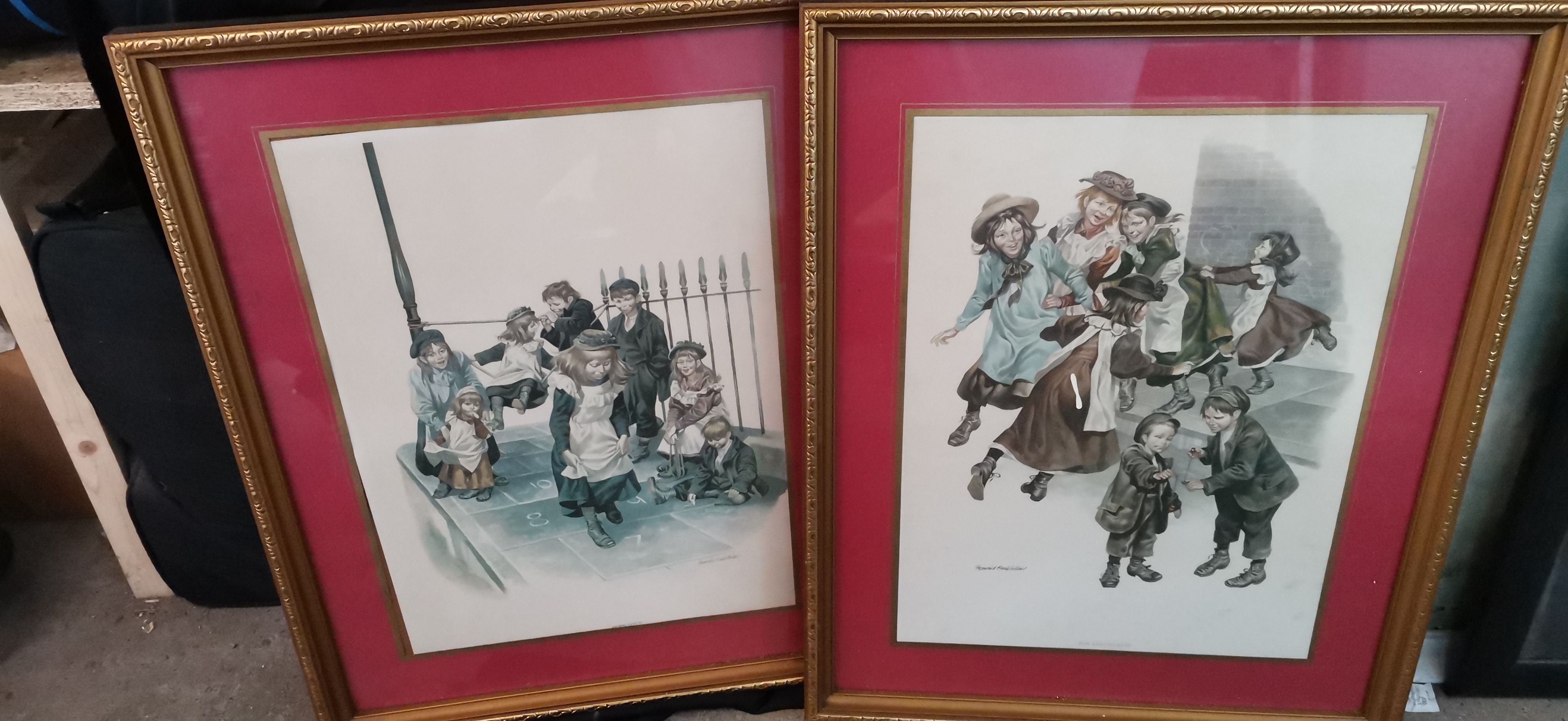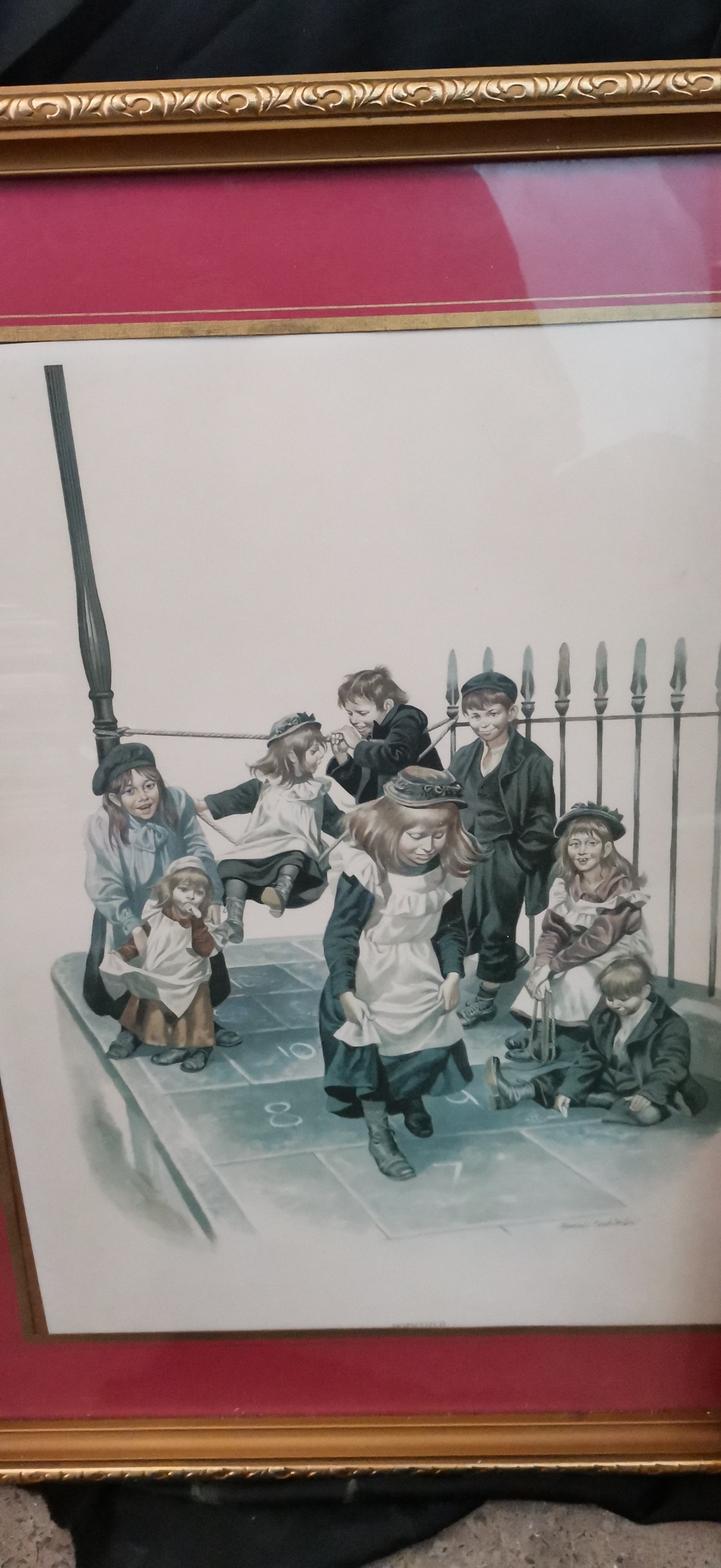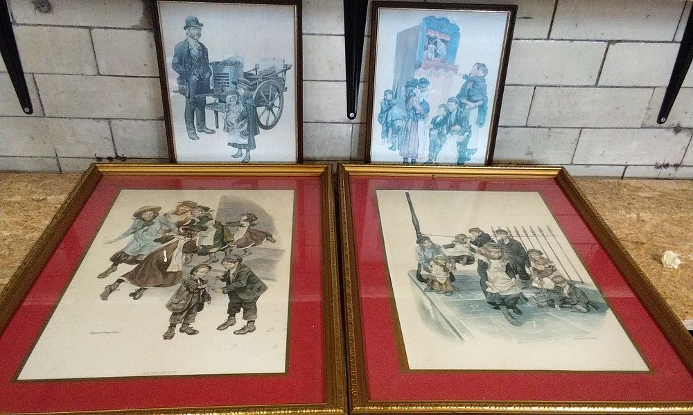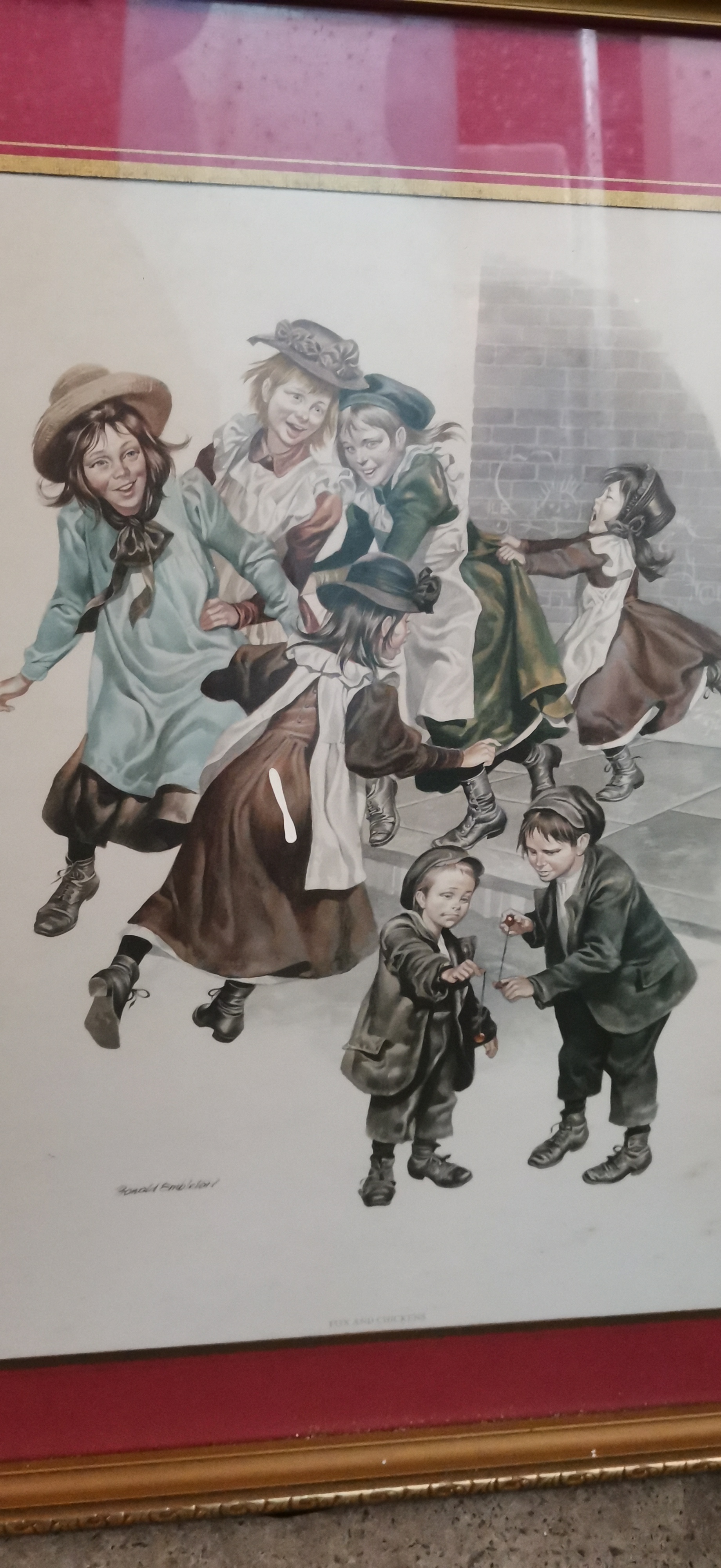 A collection of four framed art prints by Ronald Embleton depicting historical scenes of children and street life, including two larger prints with red matting and gold-coloured frames, one titled Fox and Chickens.