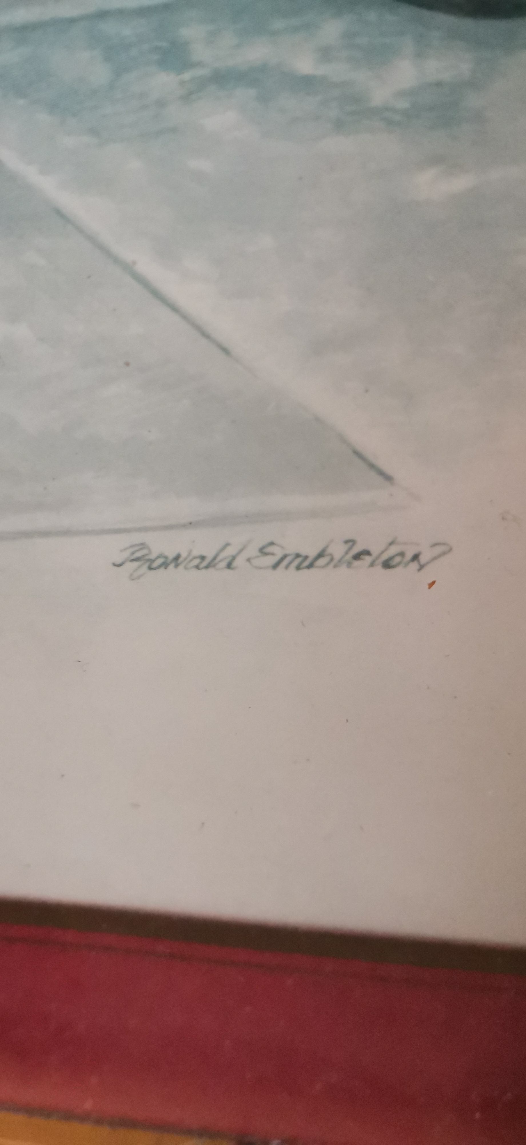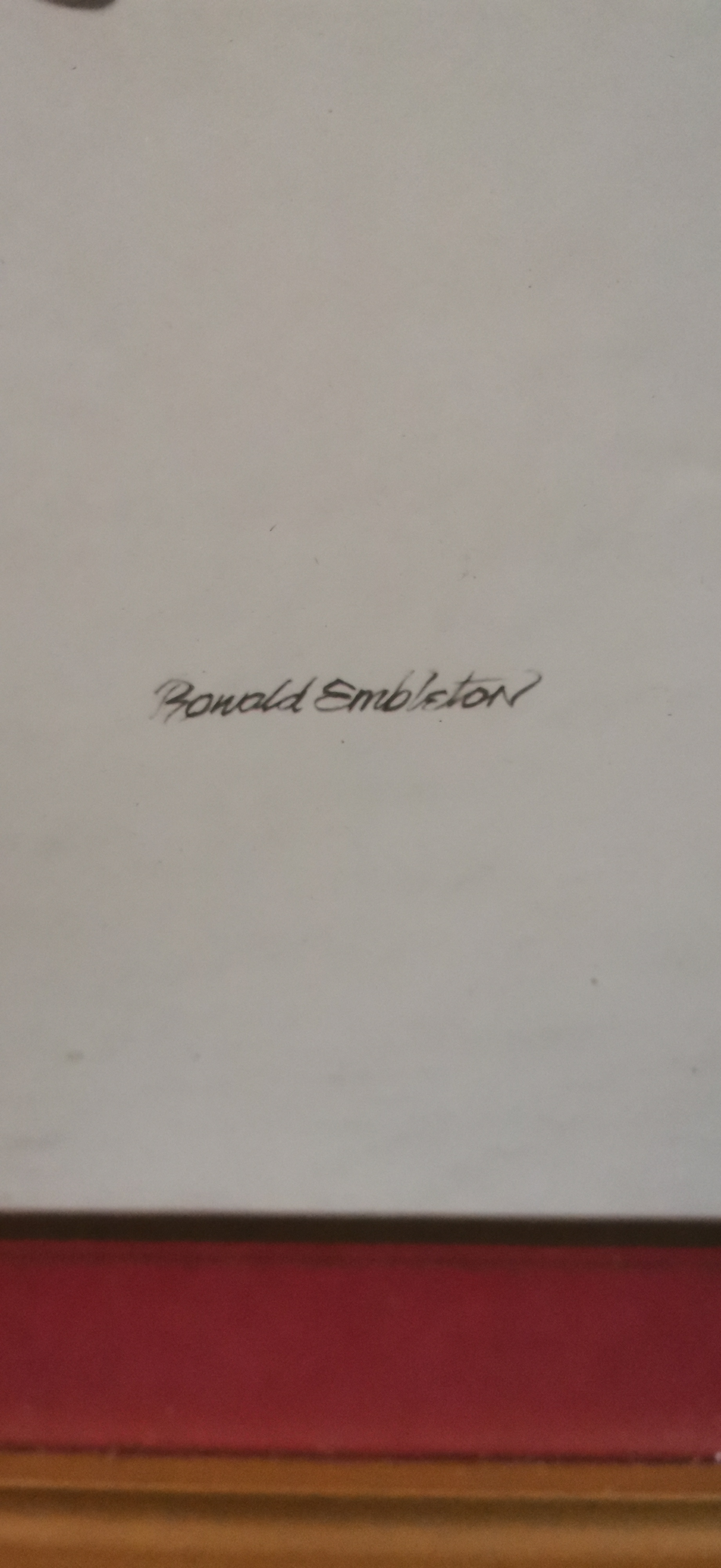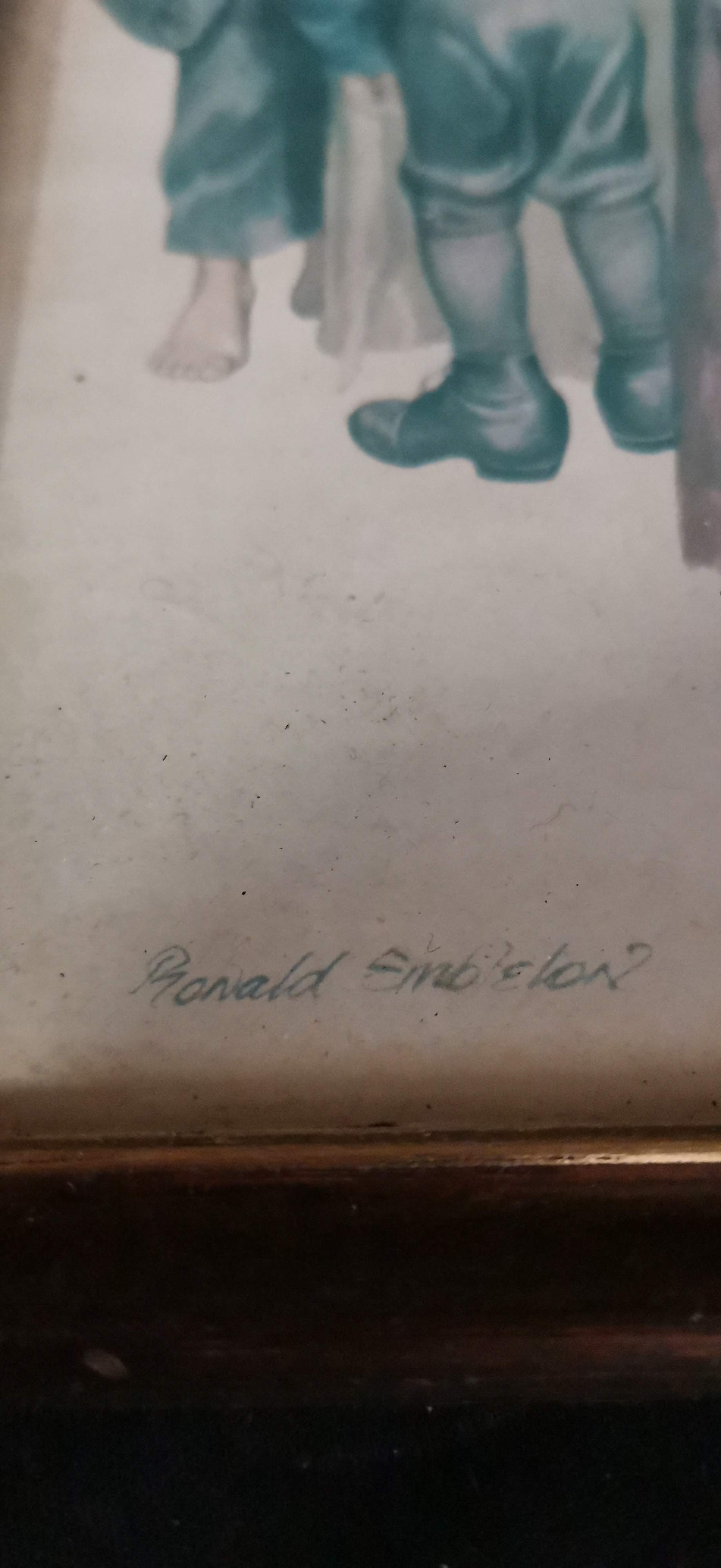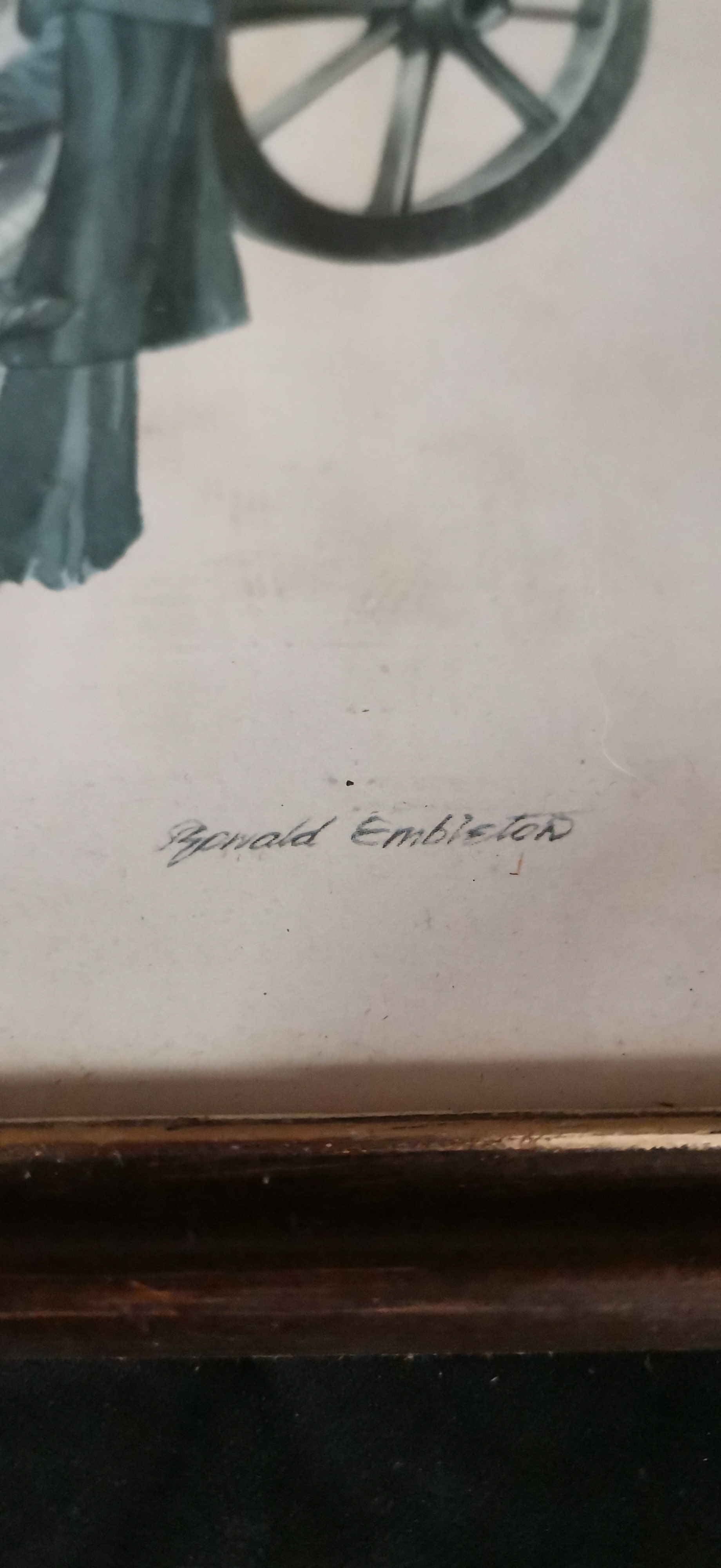 A collection of four framed art prints by Ronald Embleton depicting historical scenes of children and street life, including two larger prints with red matting and gold-coloured frames, one titled Fox and Chickens.