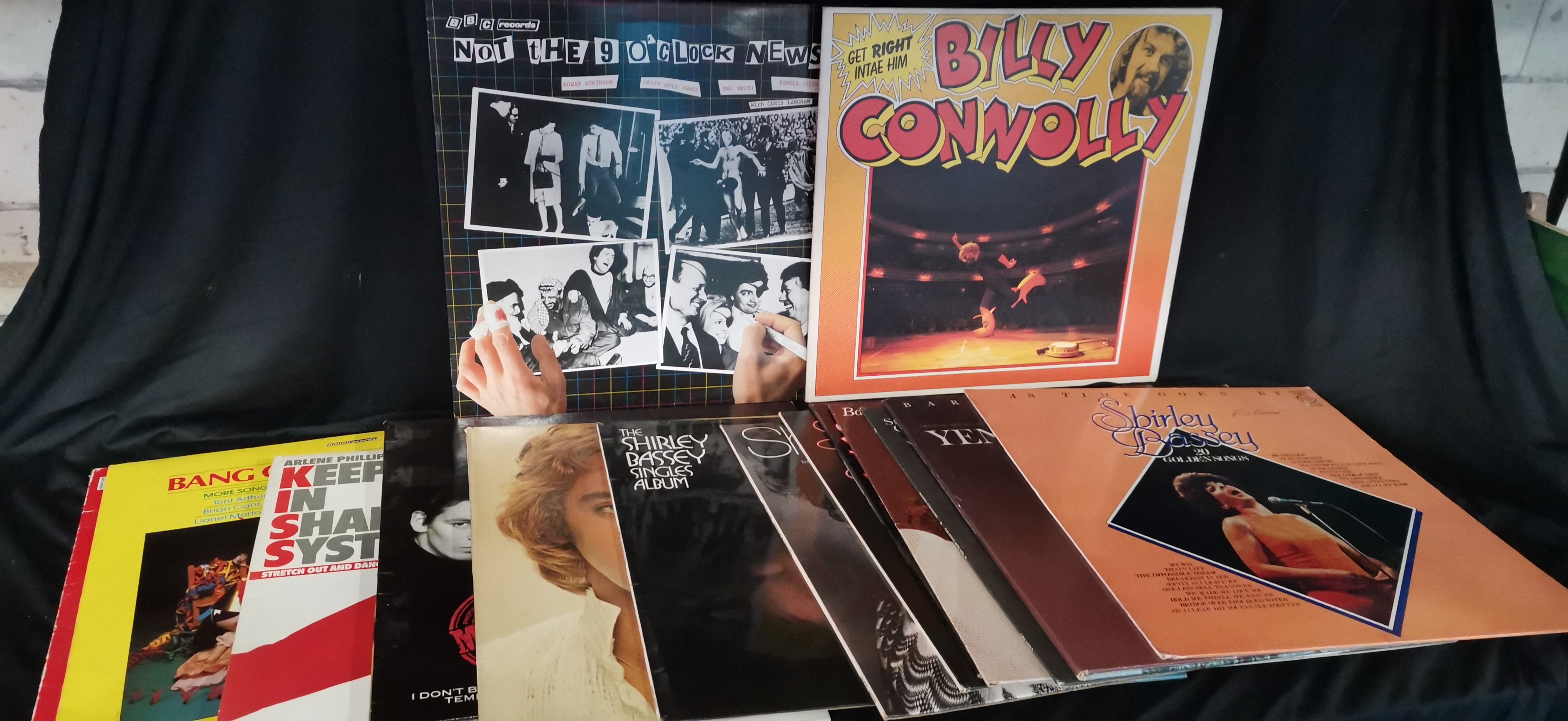 A collection of several vinyl records featuring various artists including Billy Connolly, Shirley Bassey, and the cast of Not The Nine O’Clock News.