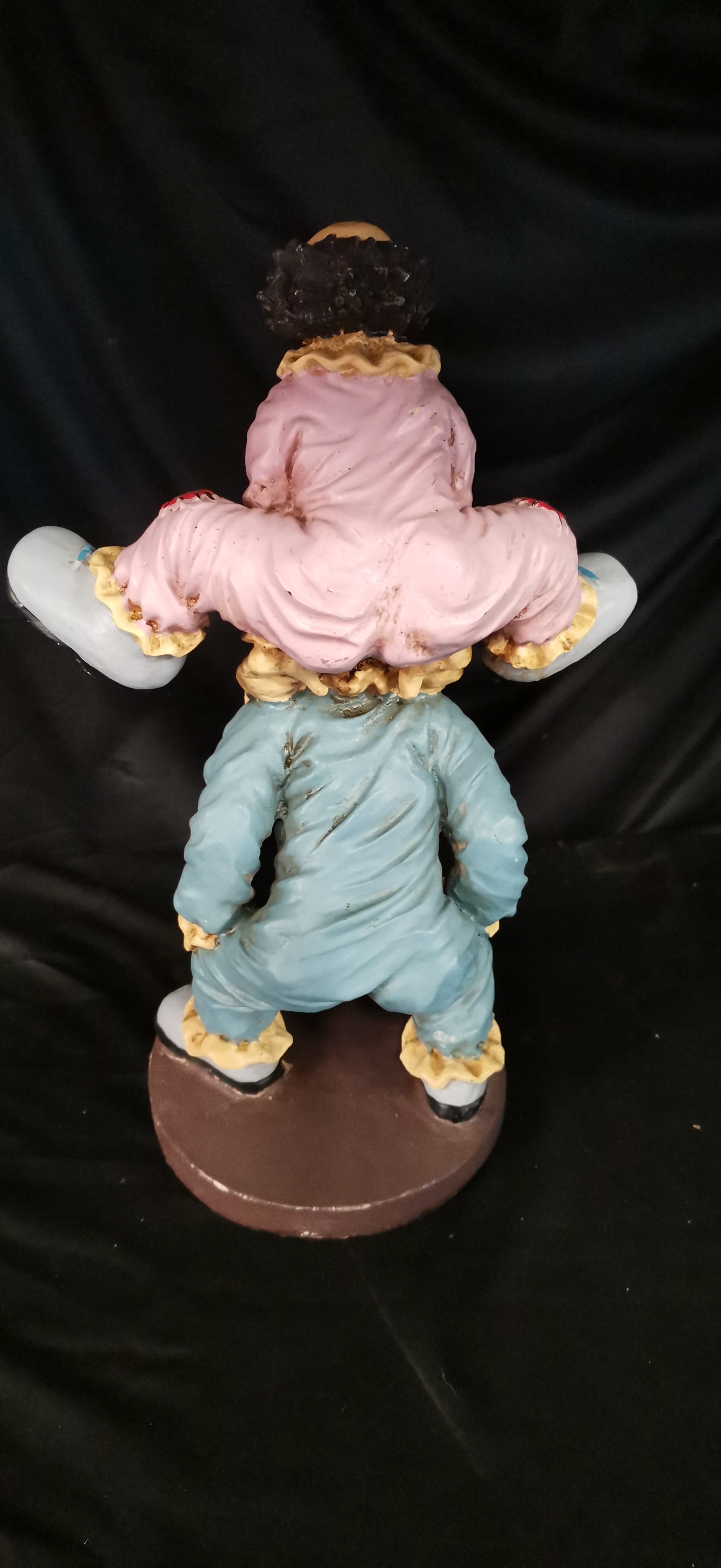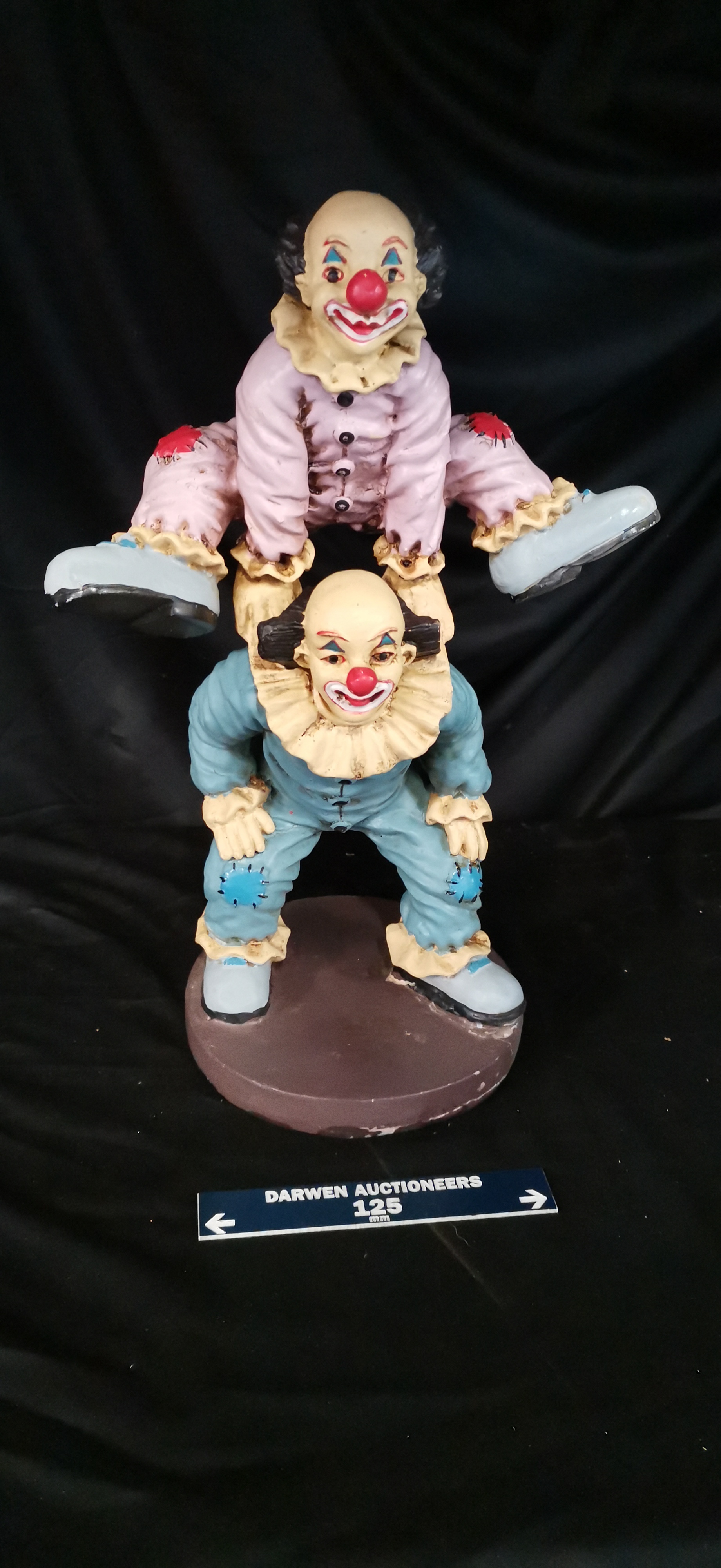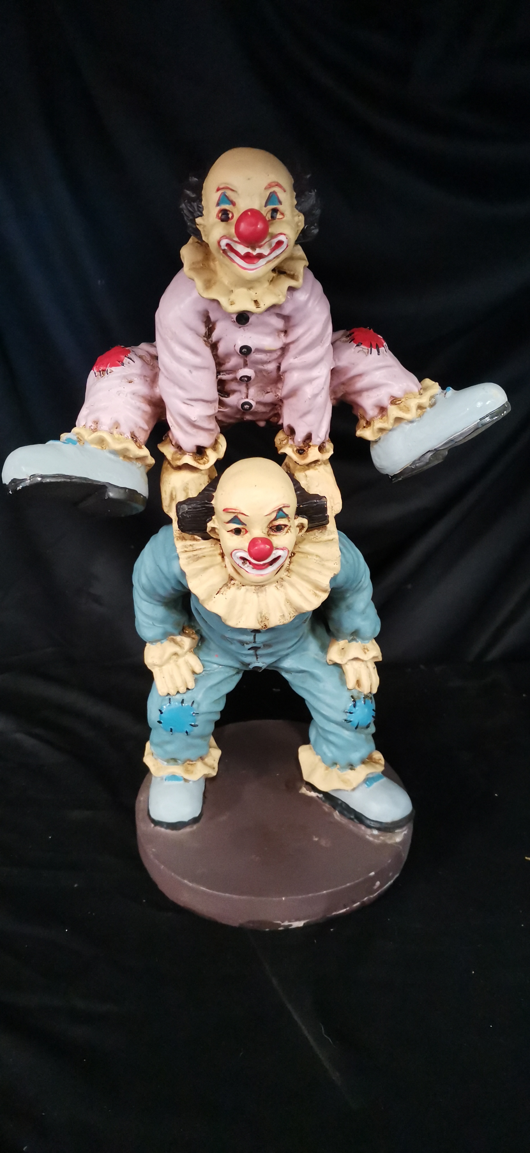 A hand painted figurine depicting two clowns in a leapfrog pose, one in a pink outfit and one in blue, mounted on a circular brown base with a width of approximately 125mm.