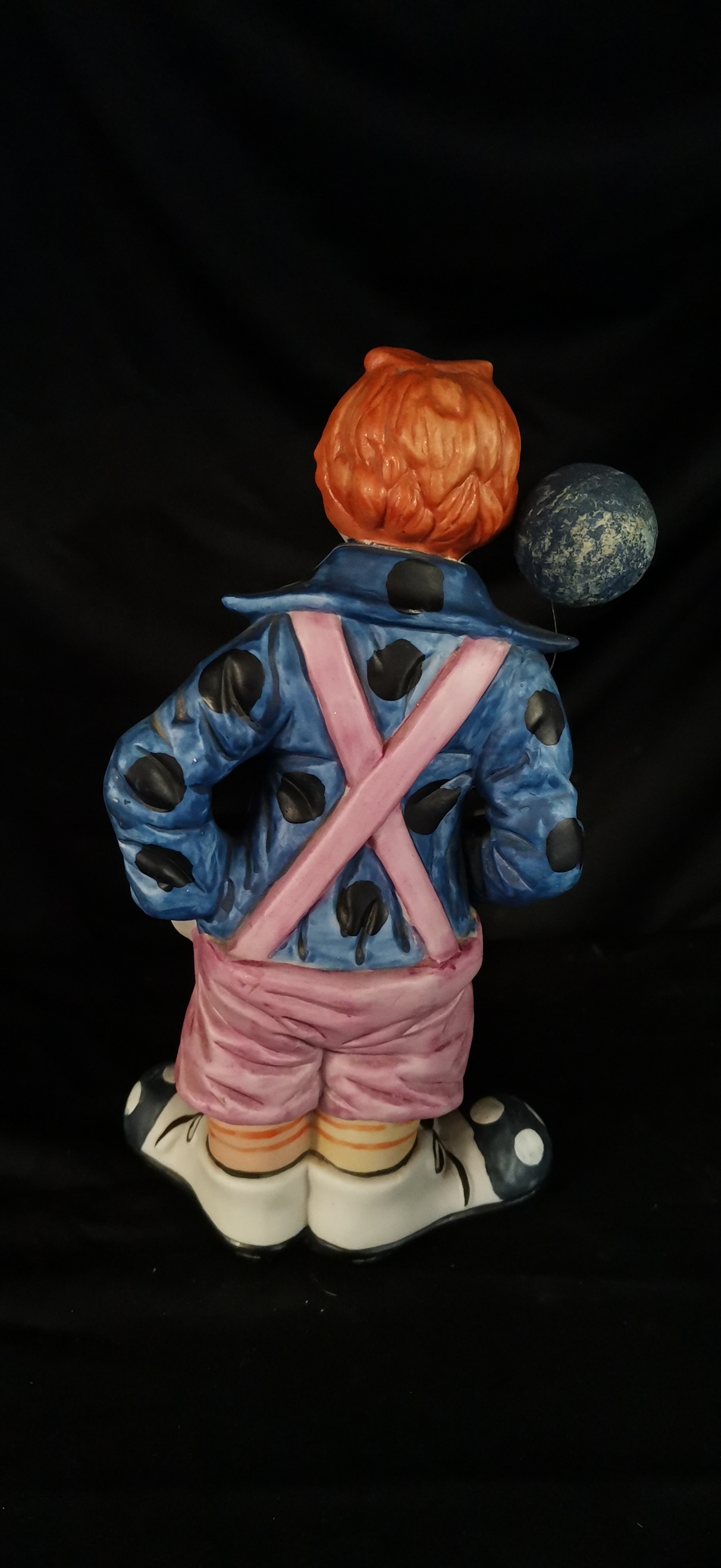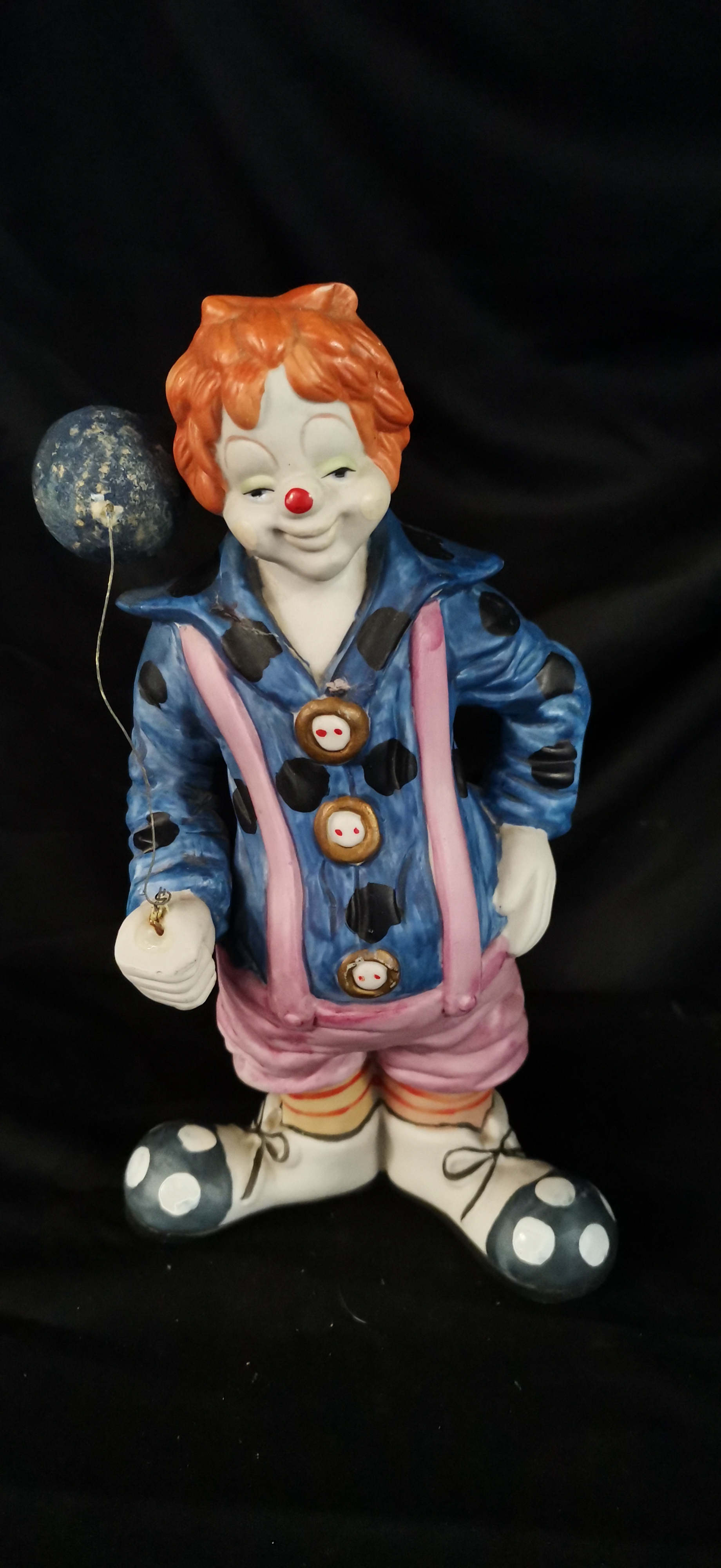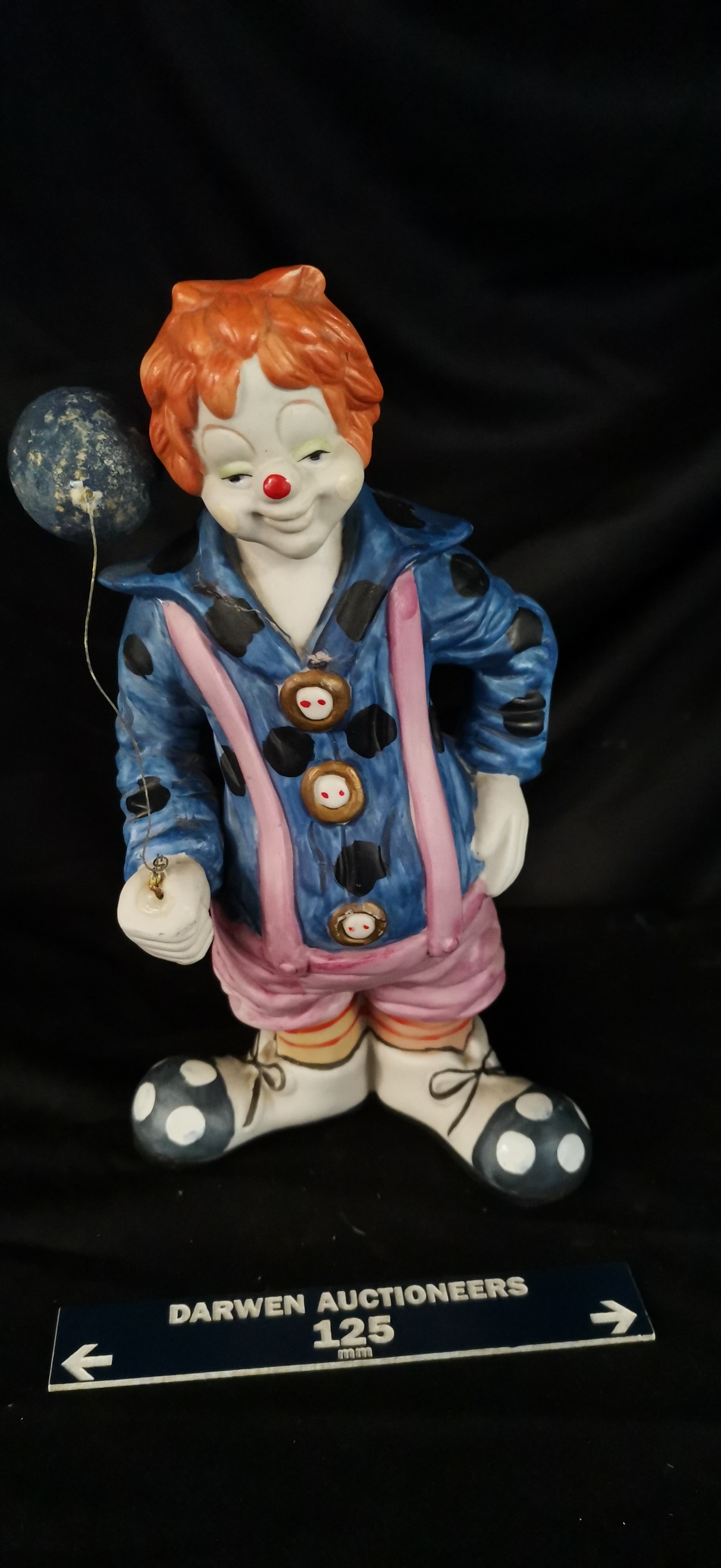 A ceramic clown figurine featuring a blue polka-dotted jacket, pink trousers, and orange hair, holding a single blue balloon, measuring approximately 125 mm in height.