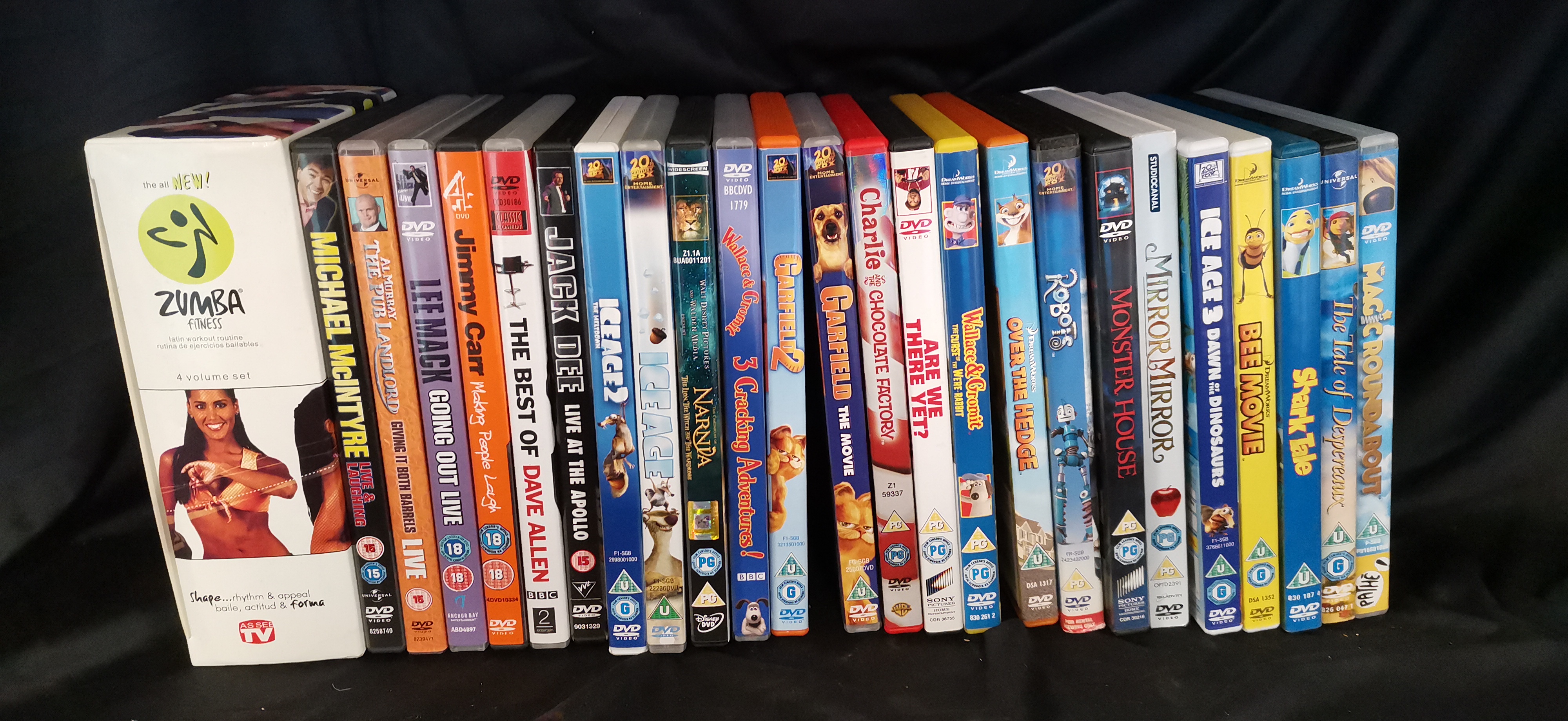 A collection of 25 DVDs featuring various comedy, family, and animation titles alongside a Zumba Fitness four-volume boxed set.