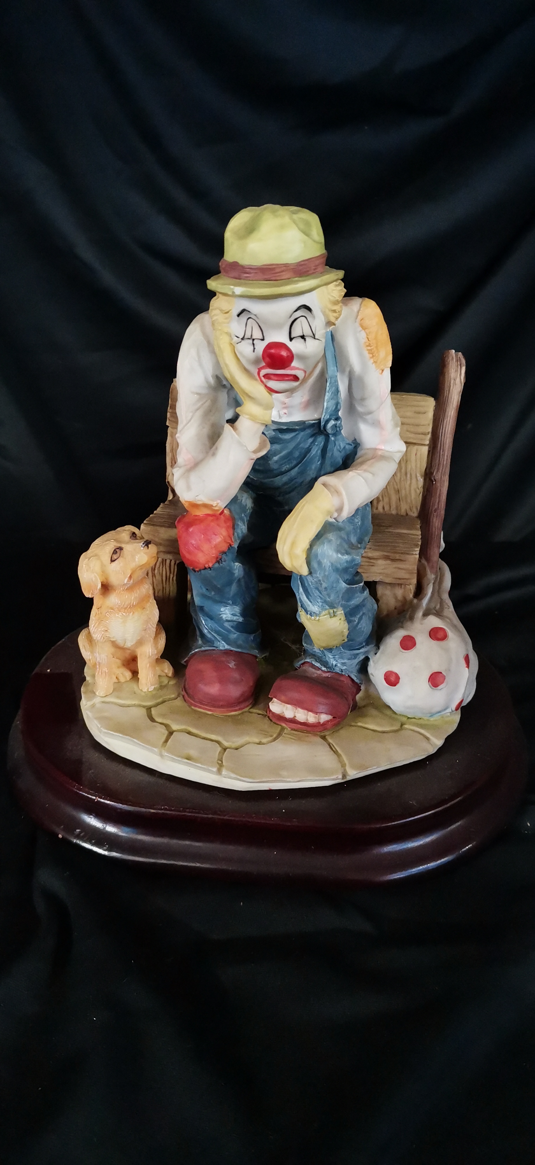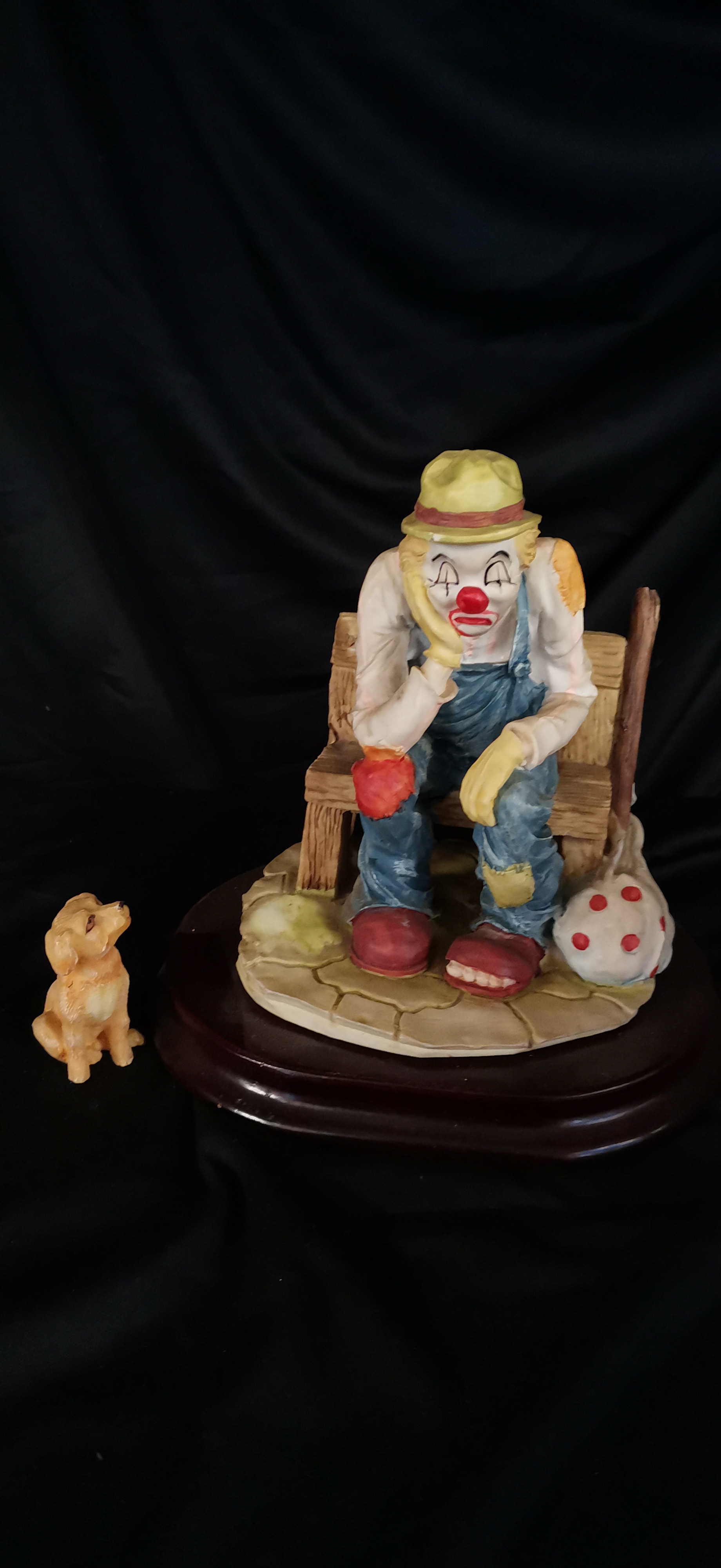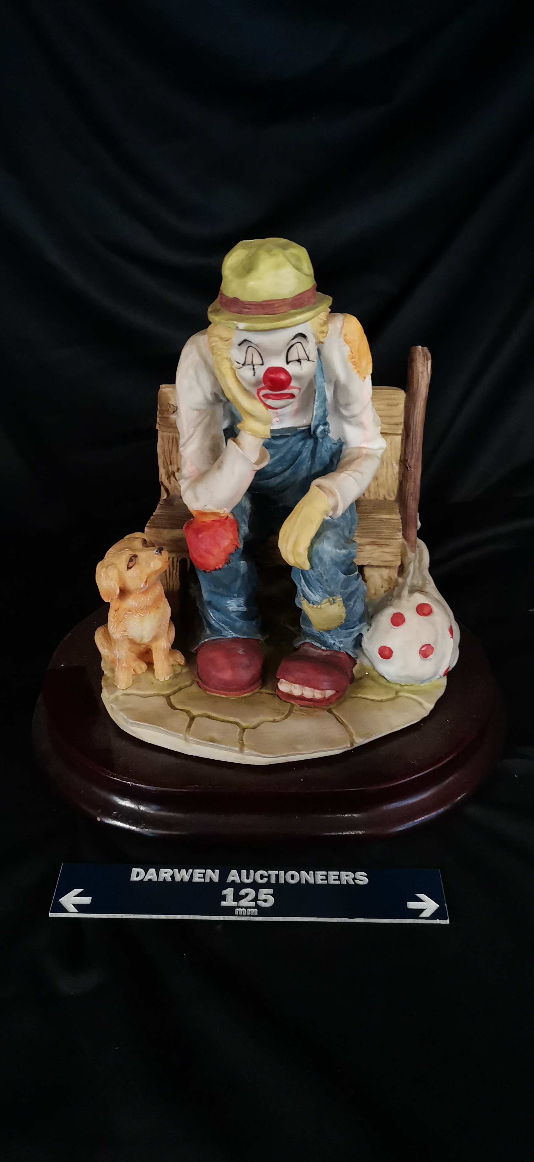 A multi-coloured porcelain figurine depicting a sad clown seated on a wooden bench with a small tan dog, measuring approximately 125mm in width.