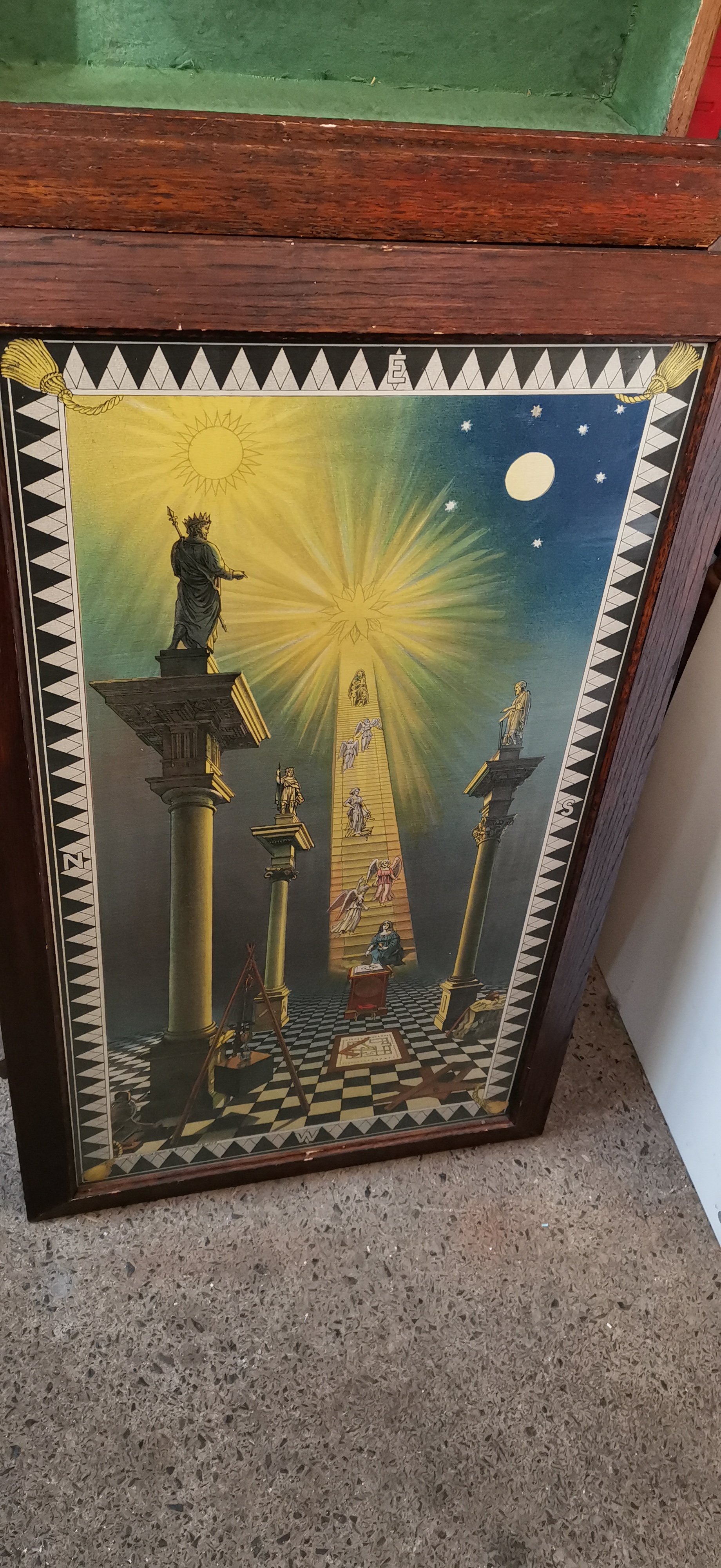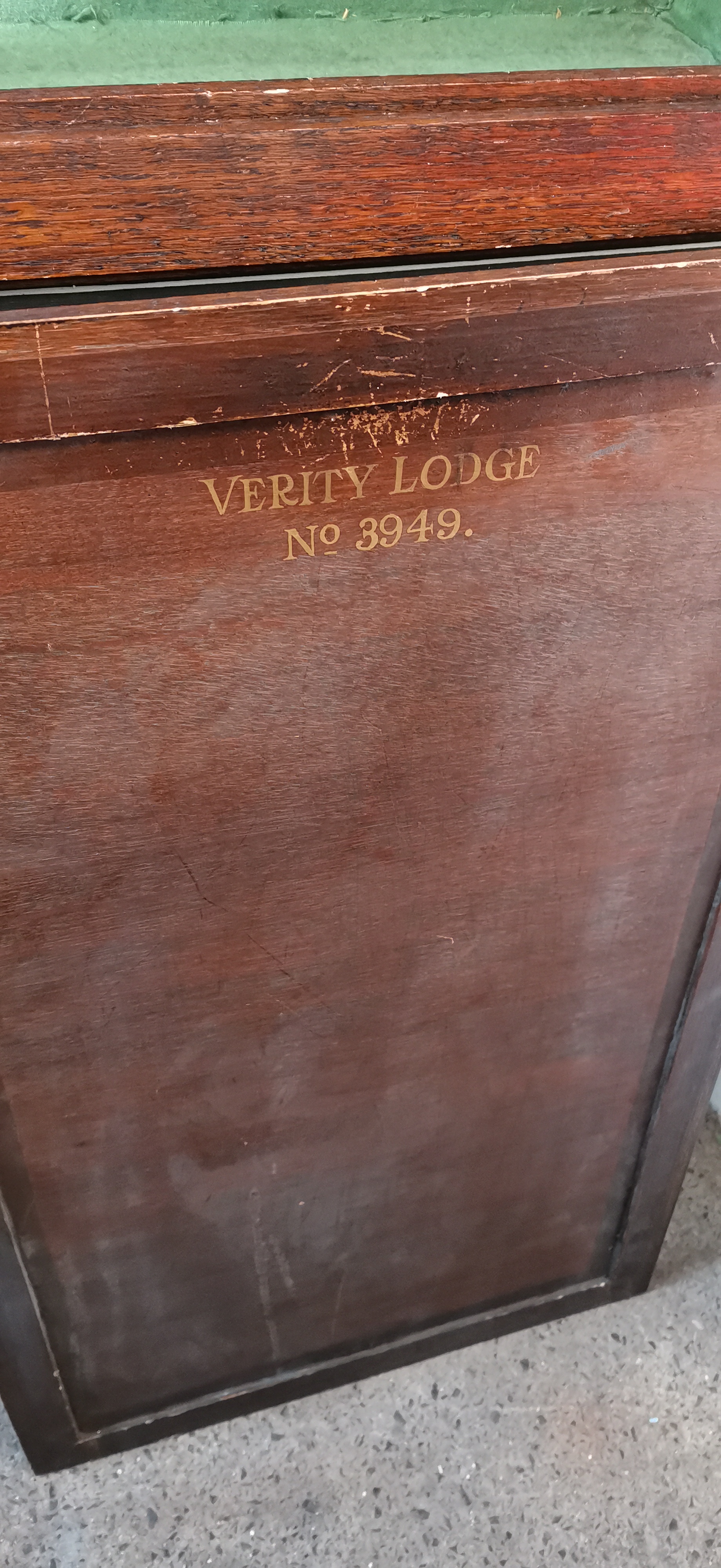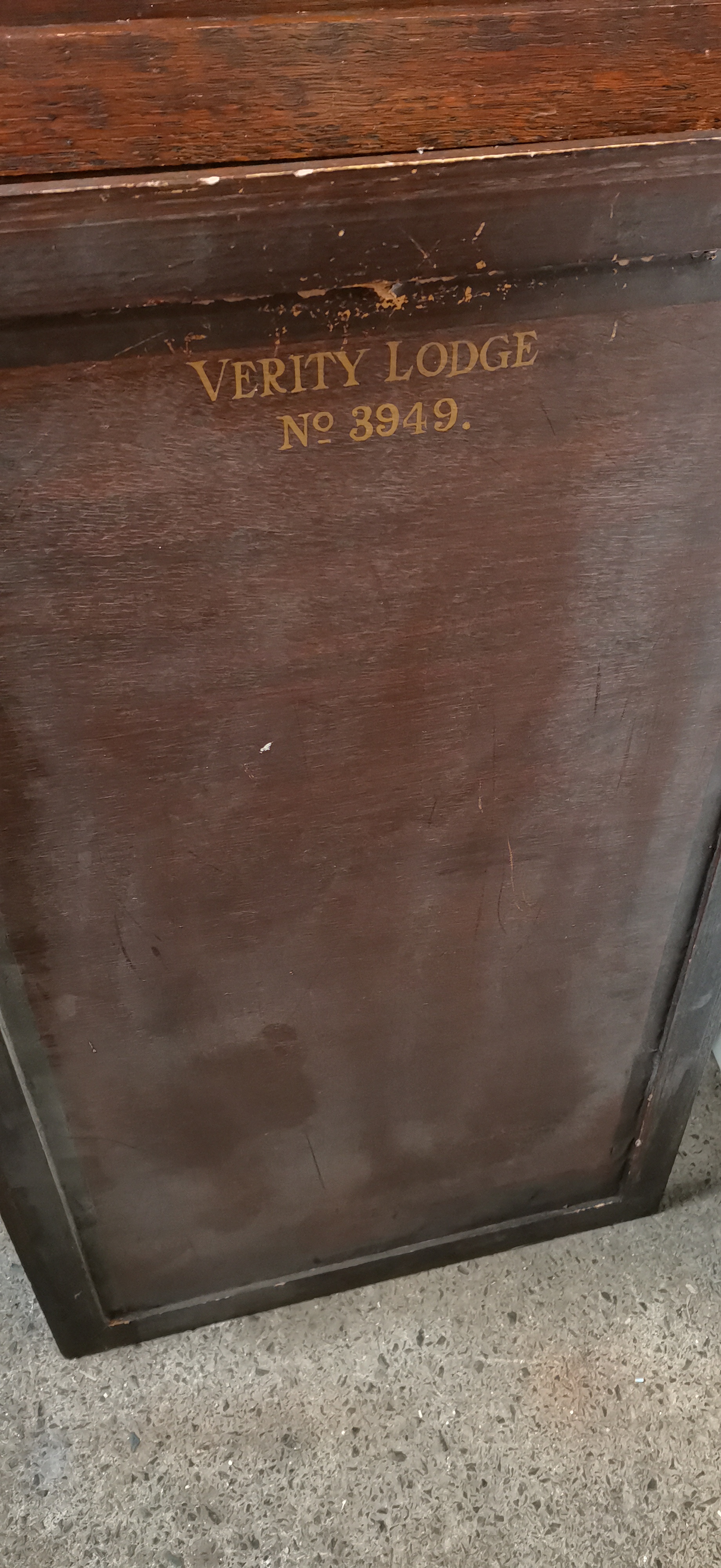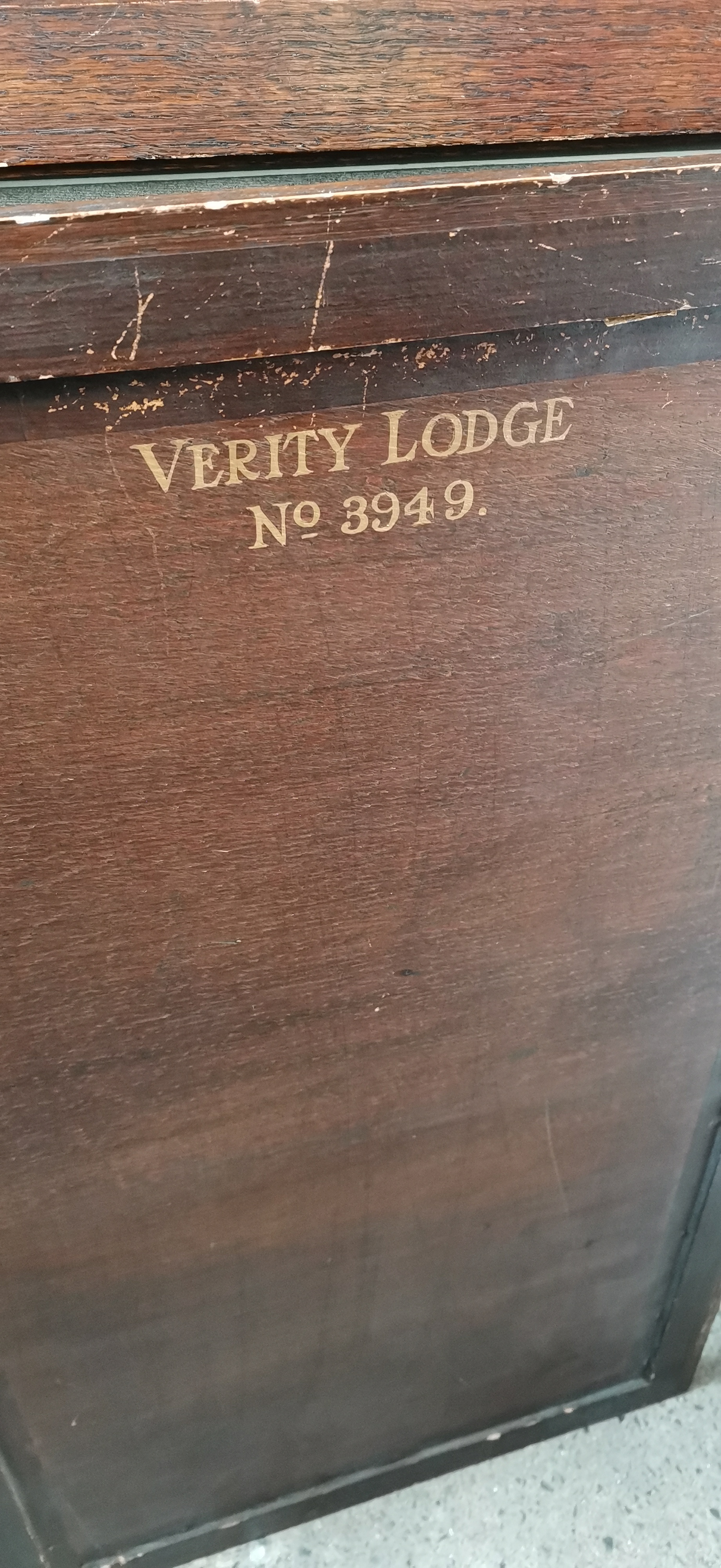 A tall oak presentation chest with a 1942 brass plaque containing several framed Masonic prints featuring symbolic illustrations for Verity Lodge No 3949.