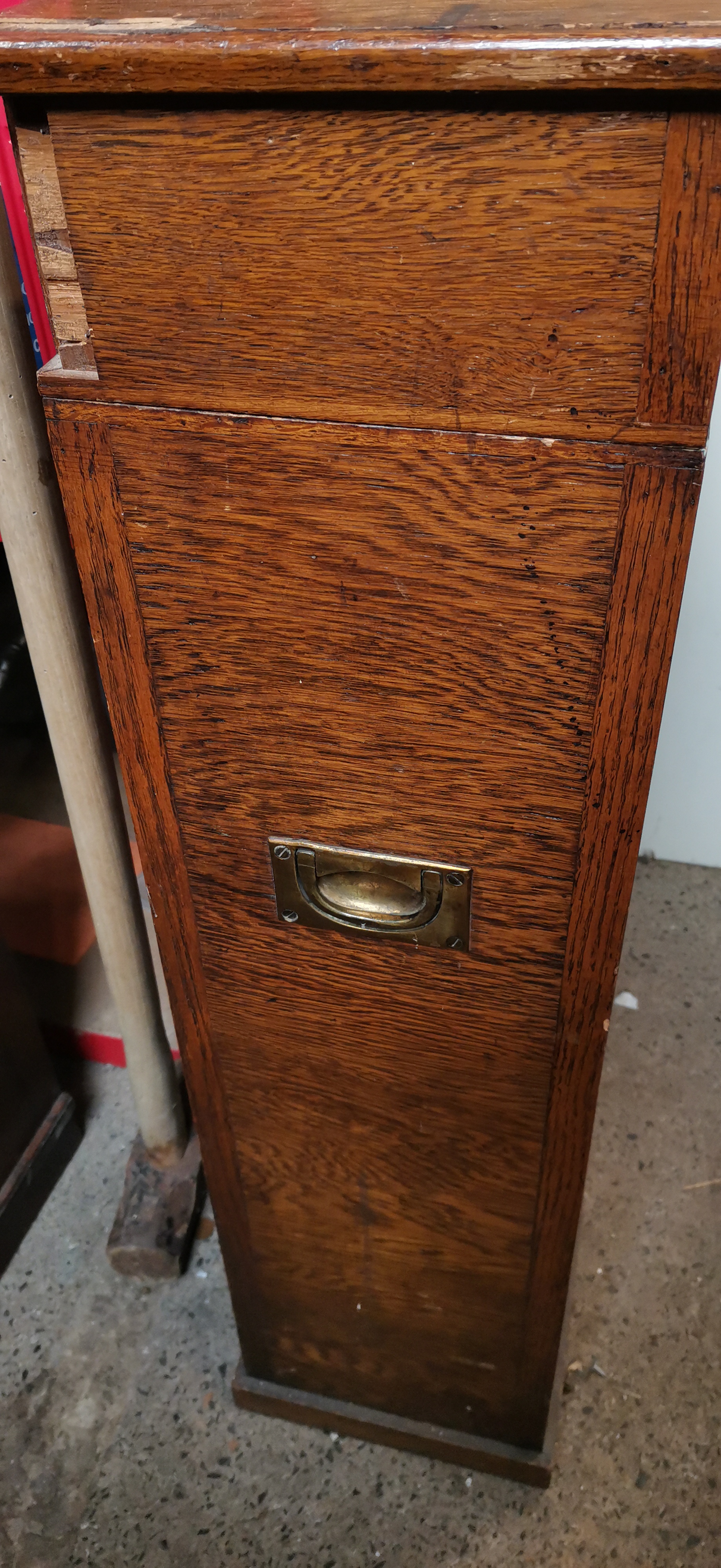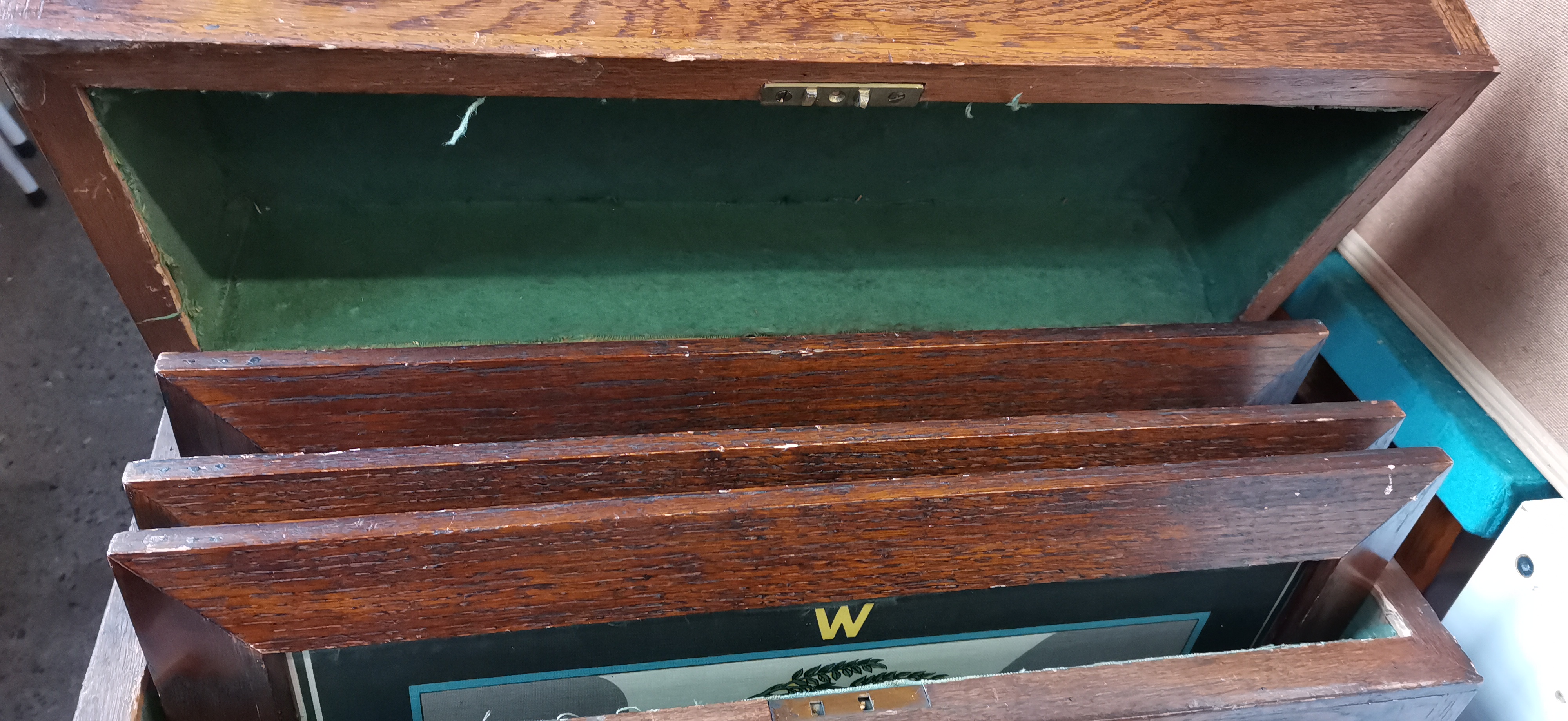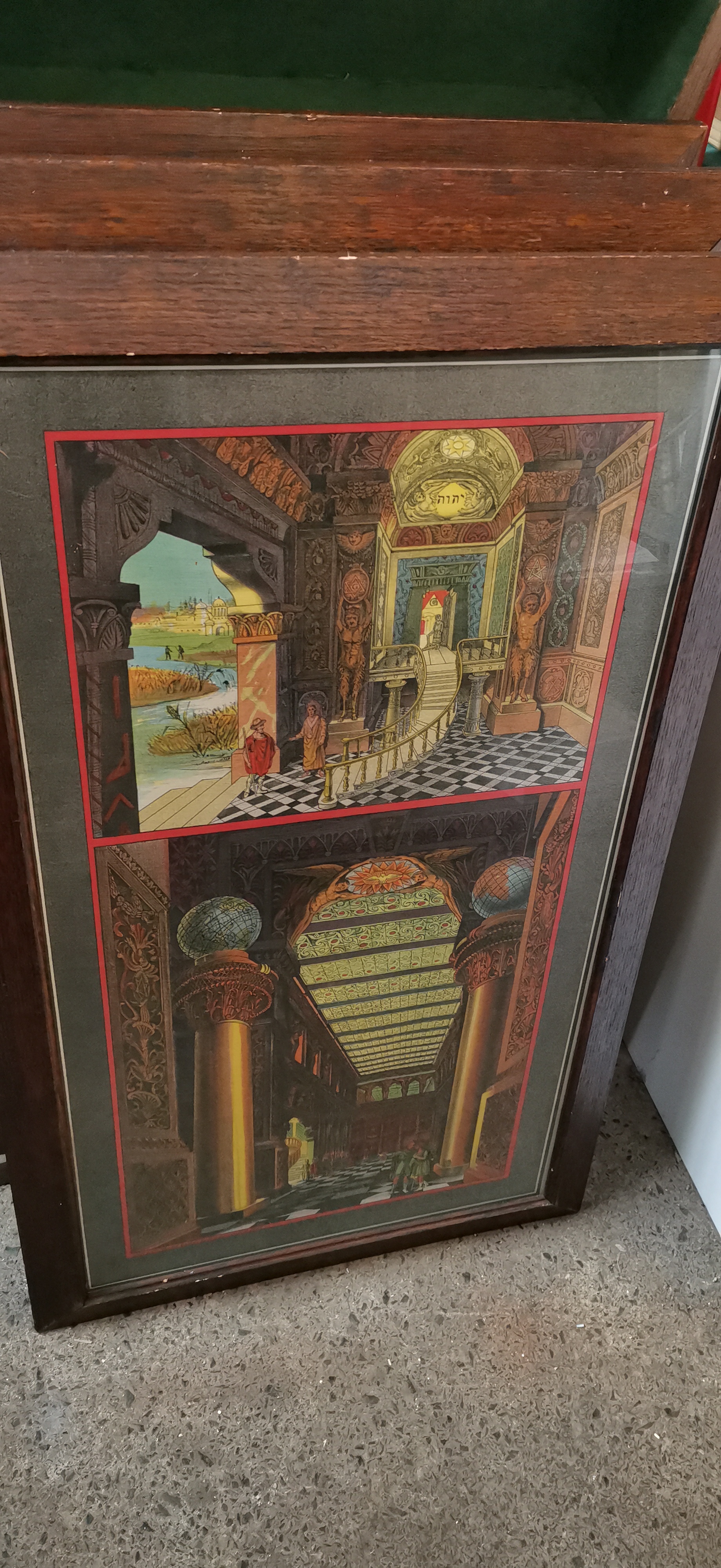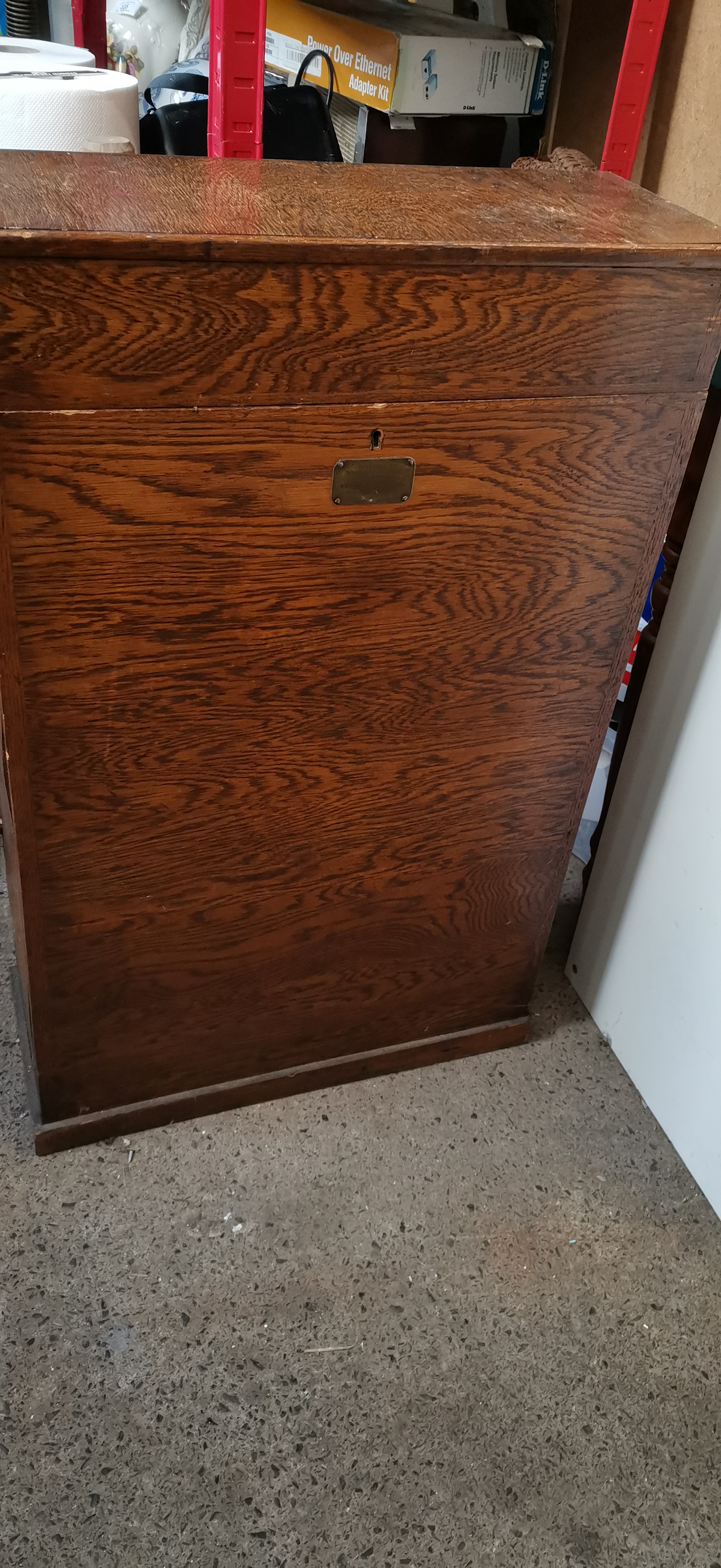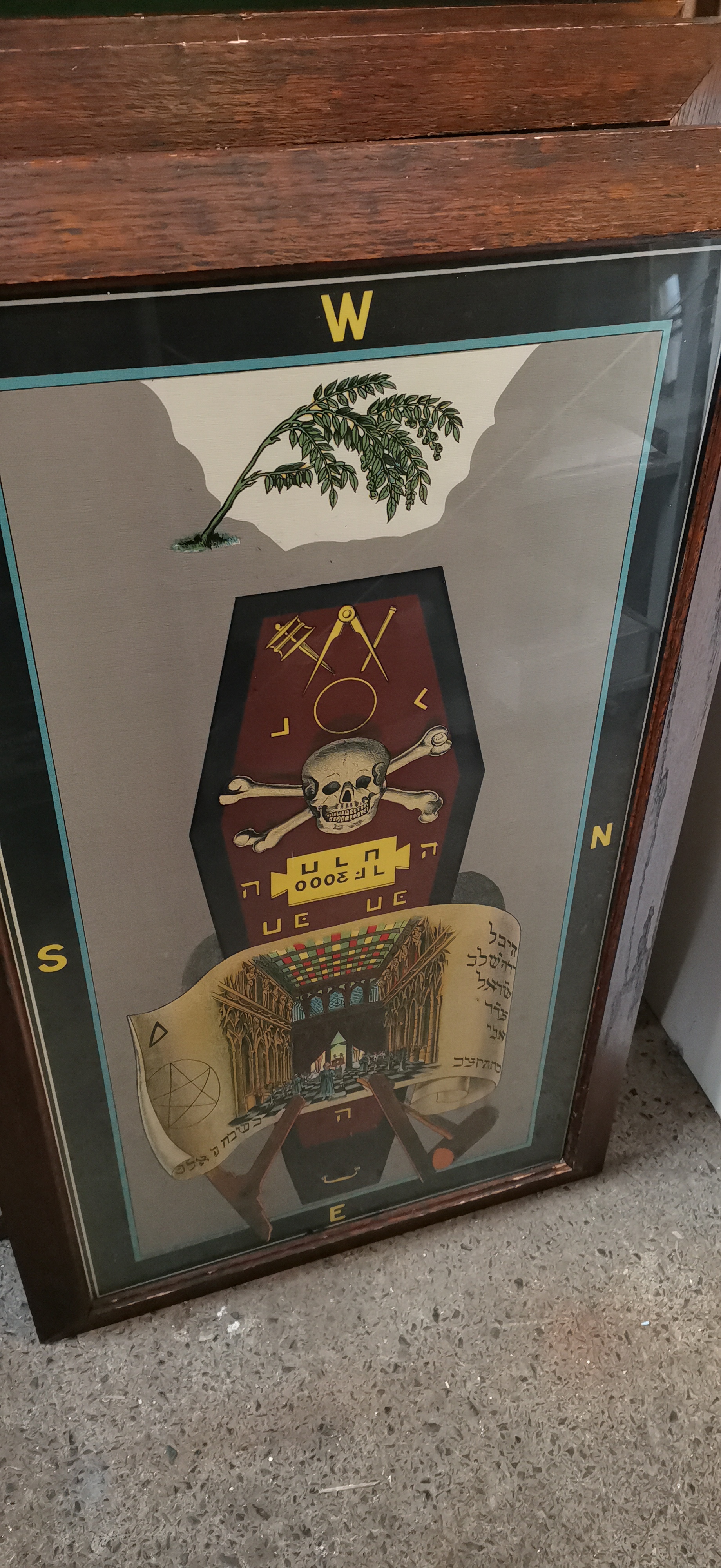 A tall oak presentation chest with a 1942 brass plaque containing several framed Masonic prints featuring symbolic illustrations for Verity Lodge No 3949.