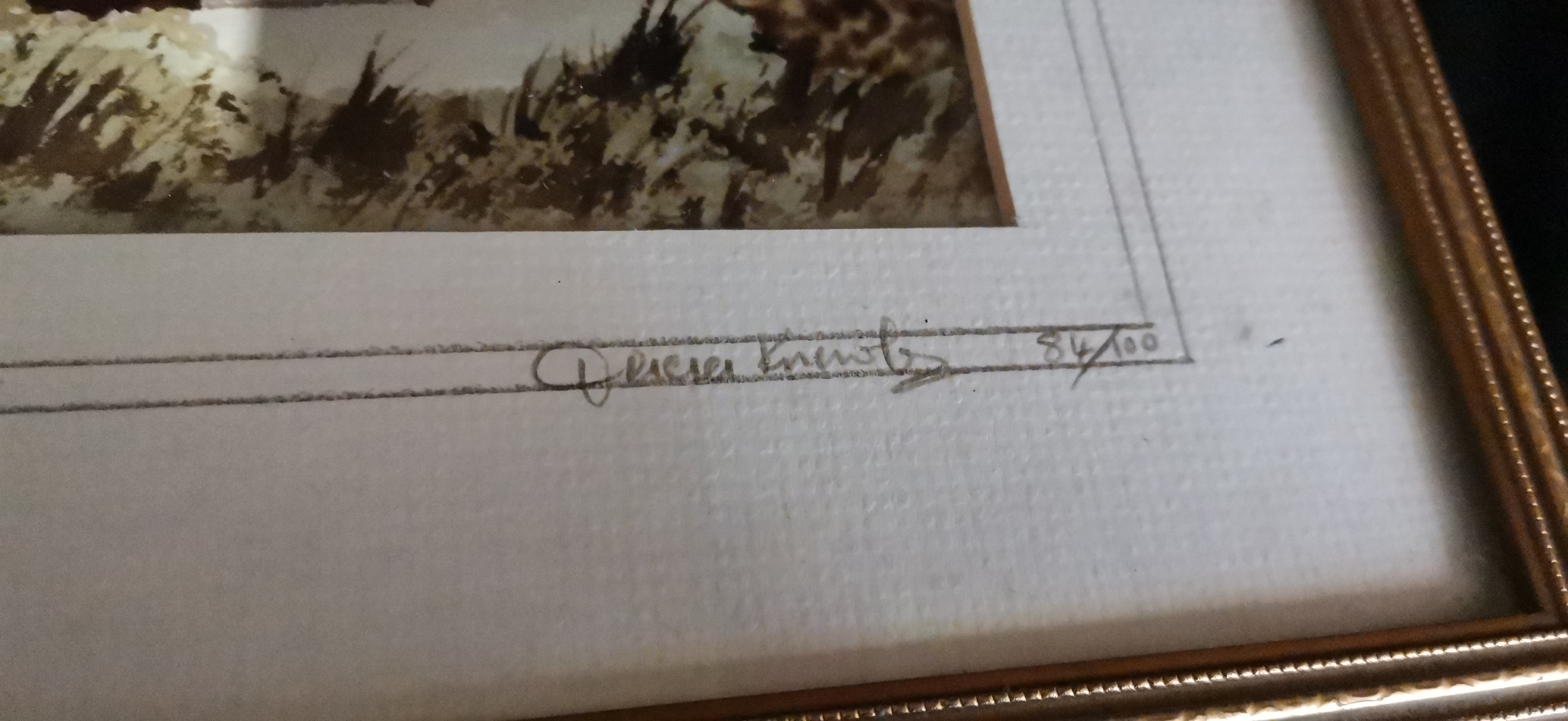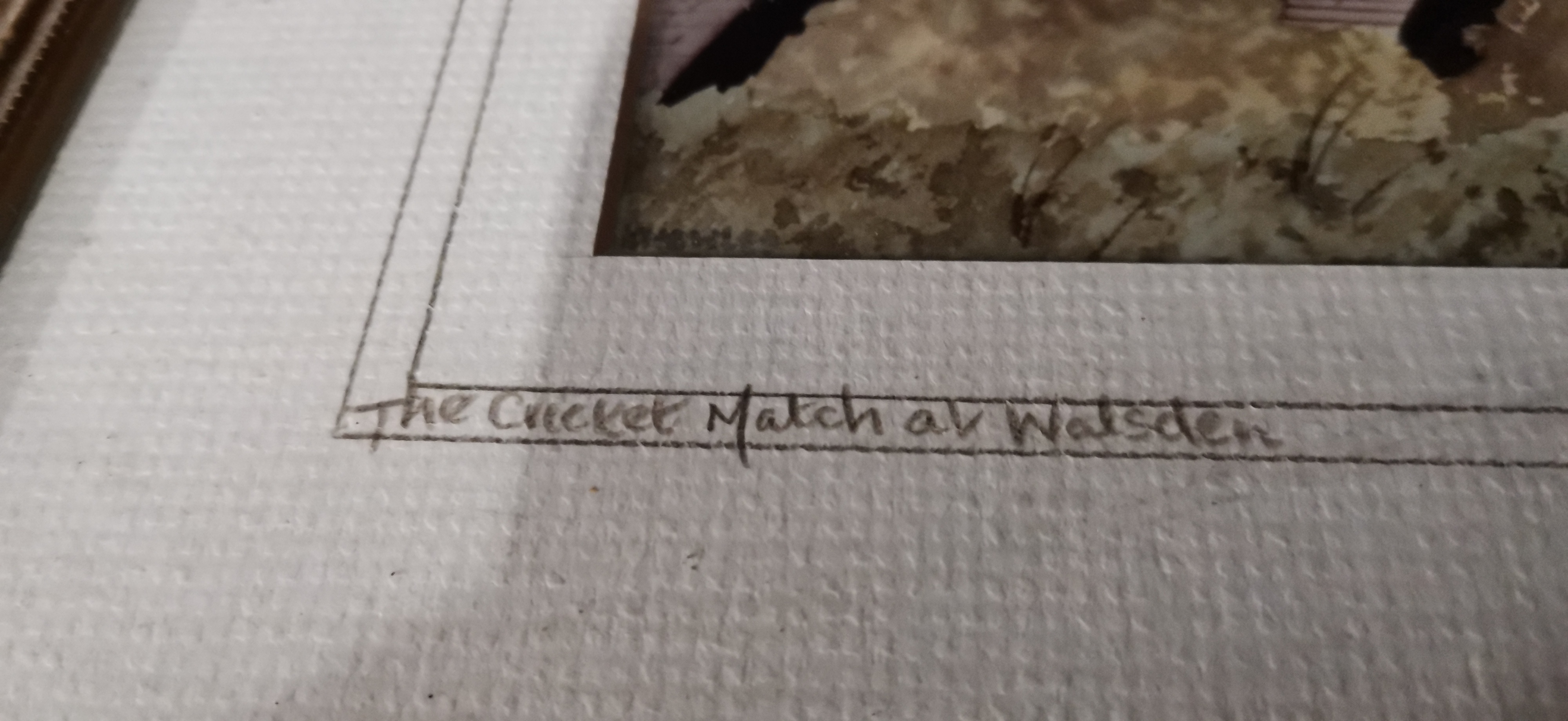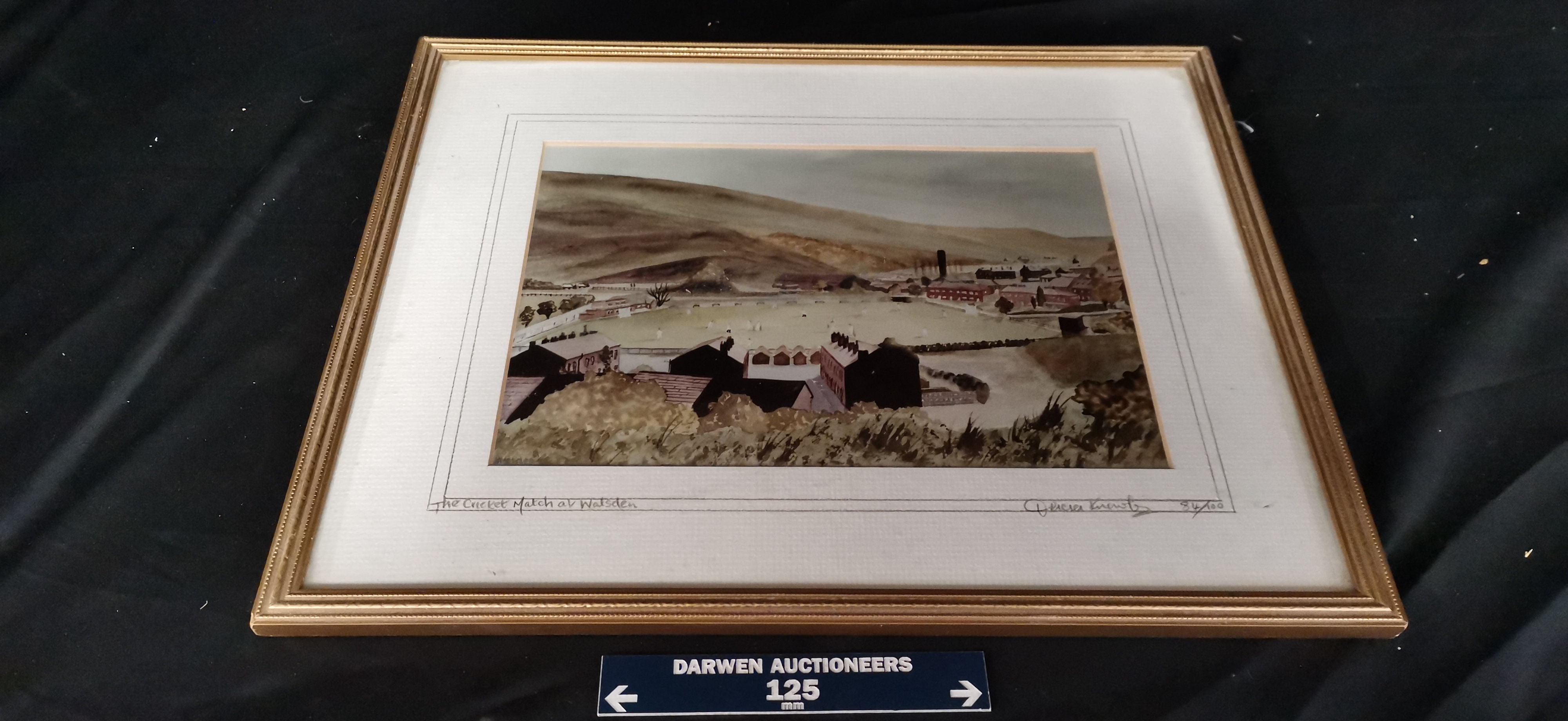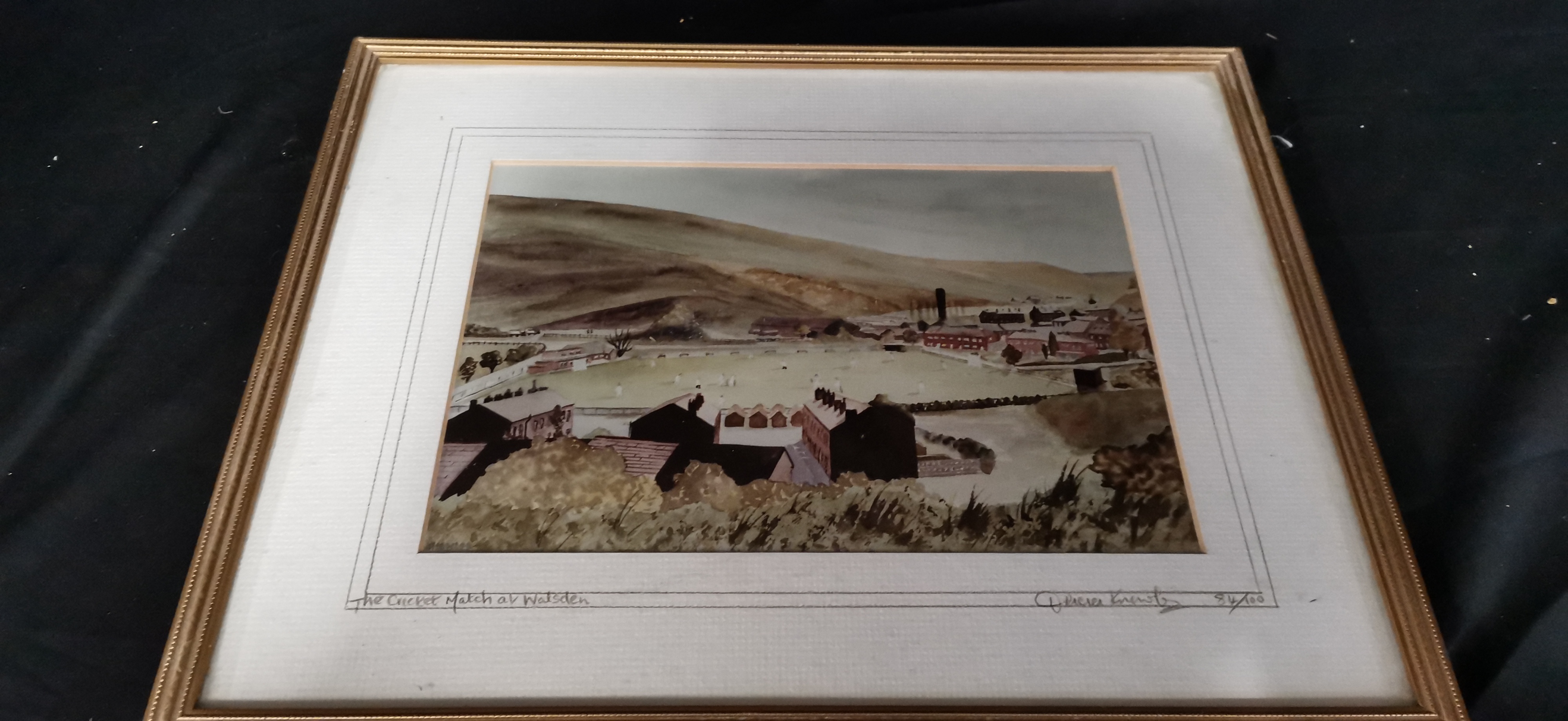 A framed and glazed print in earthy tones depicting a cricket match at Walsden, signed by the artist and numbered 84/100.