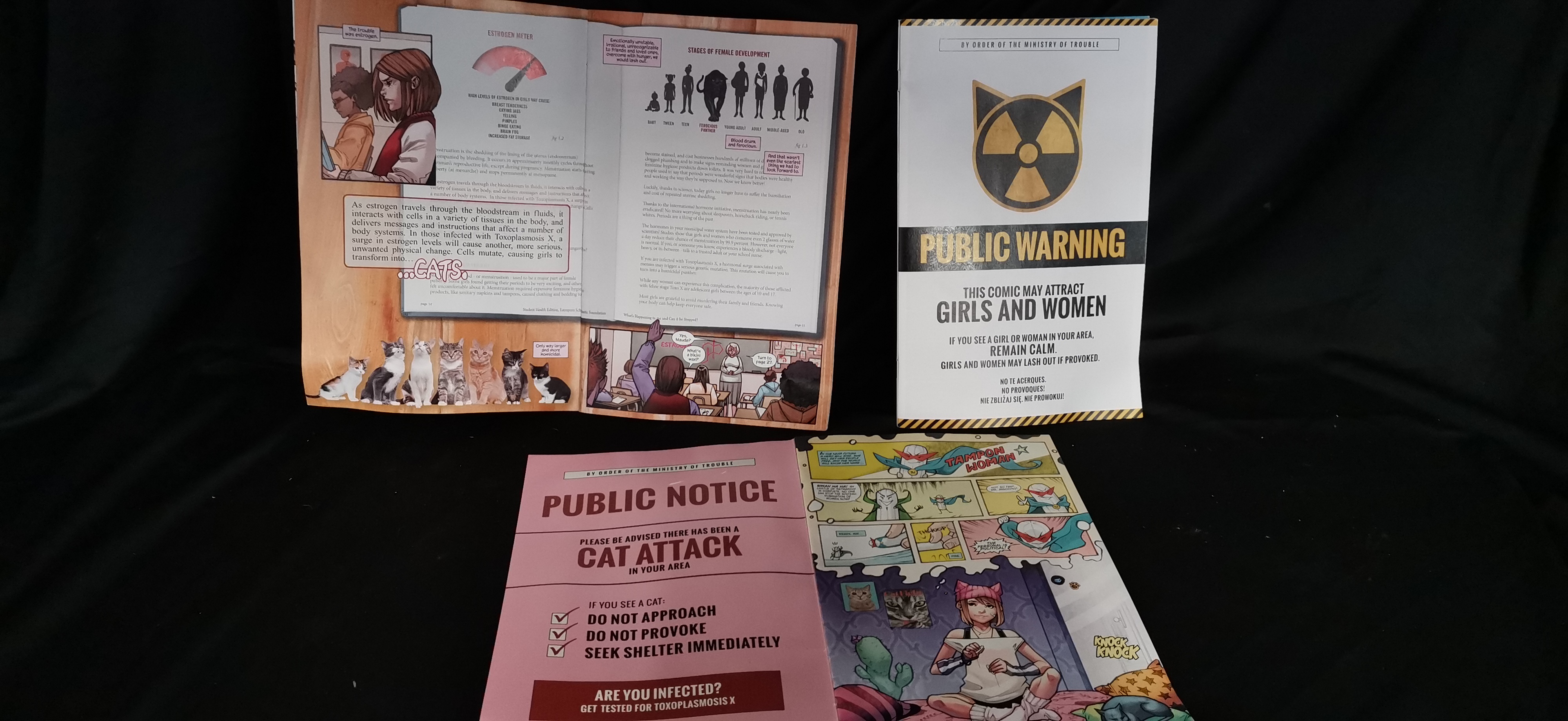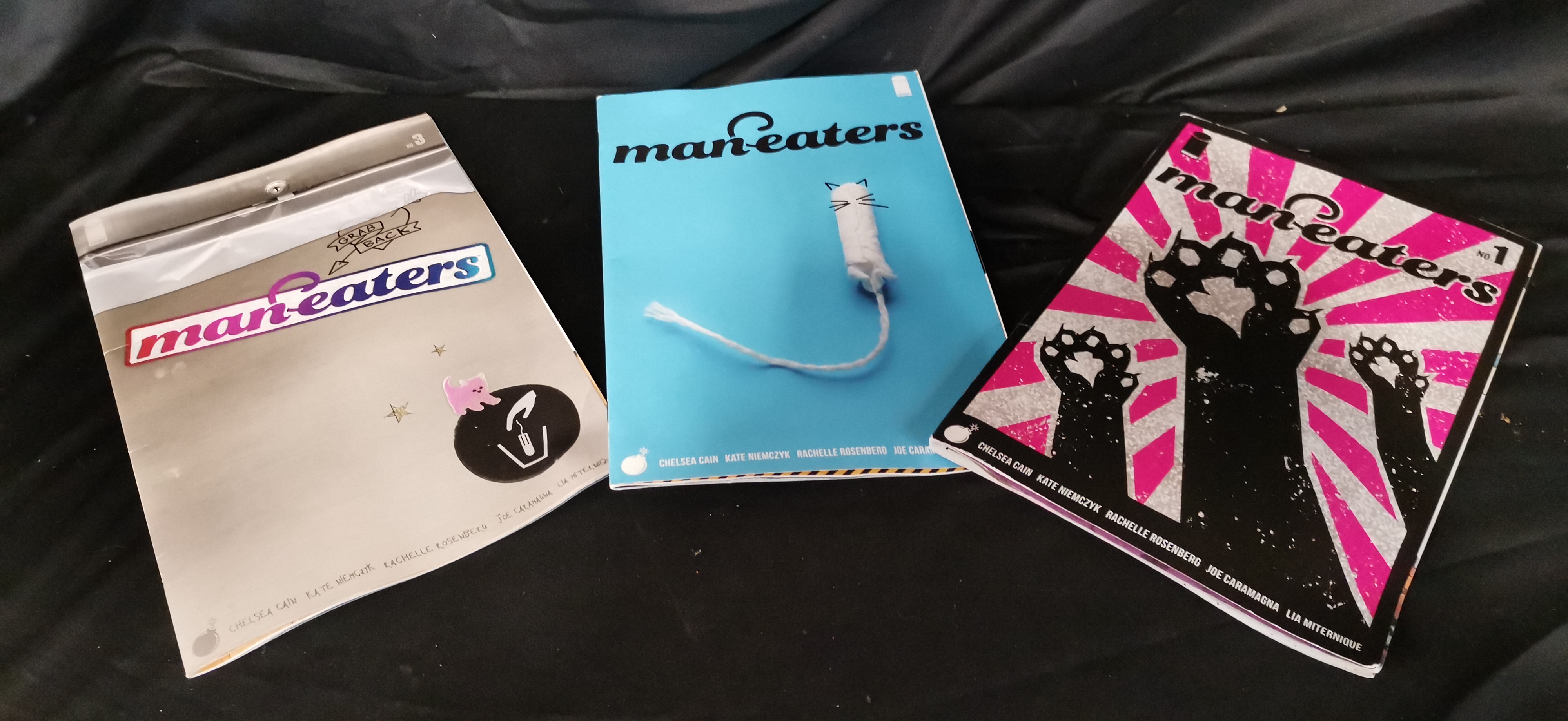 Three Man-Eaters comic books including issues one and three accompanied by Ministry of Trouble public notice flyers.