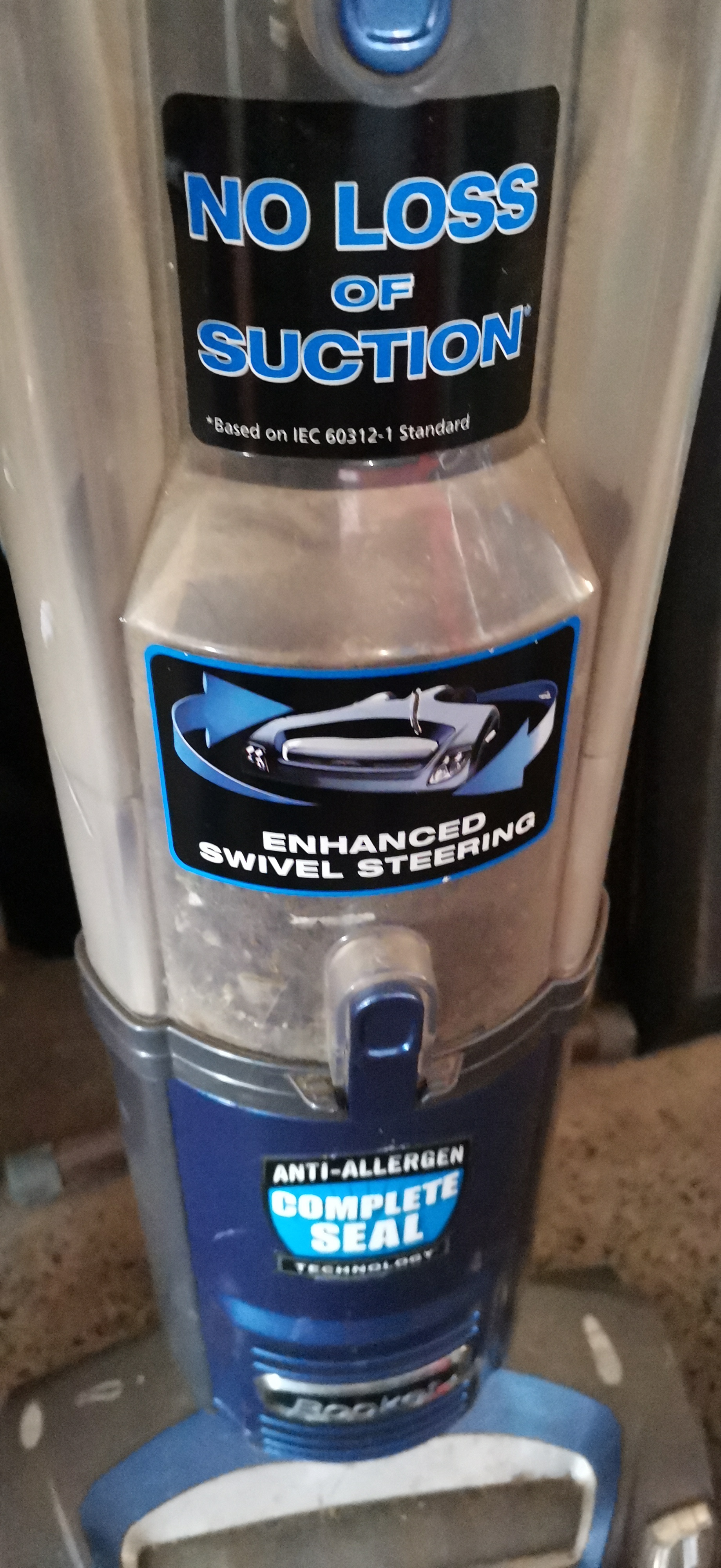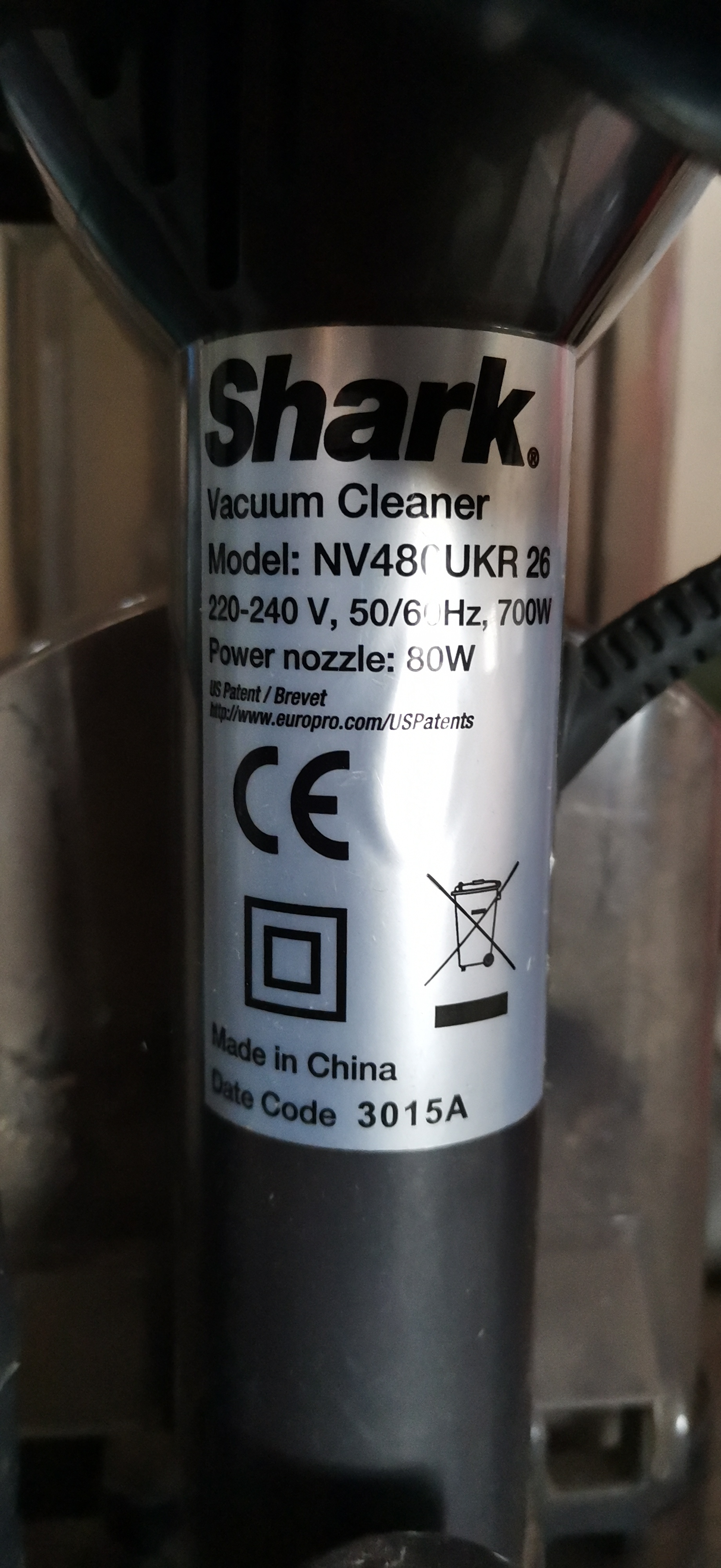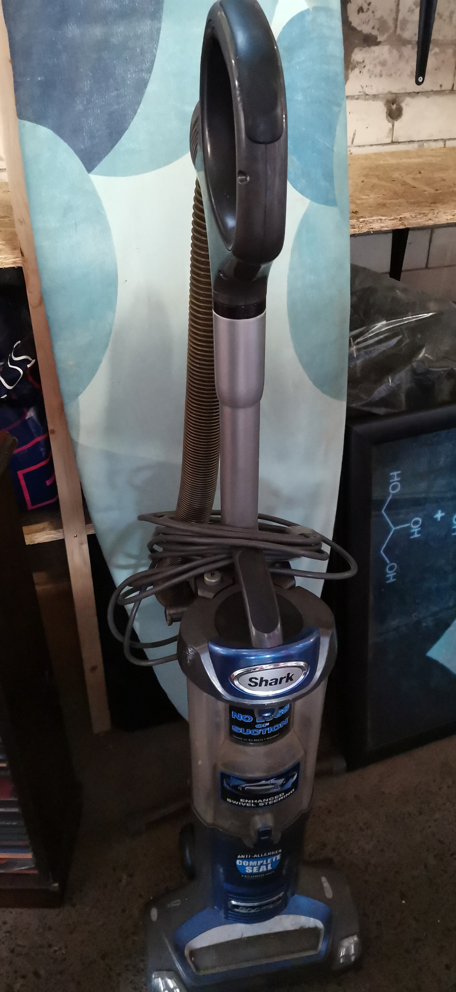A blue and grey Shark upright vacuum cleaner model NV480UKR 26 featuring enhanced swivel steering and anti-allergen complete seal technology with a 700W motor.