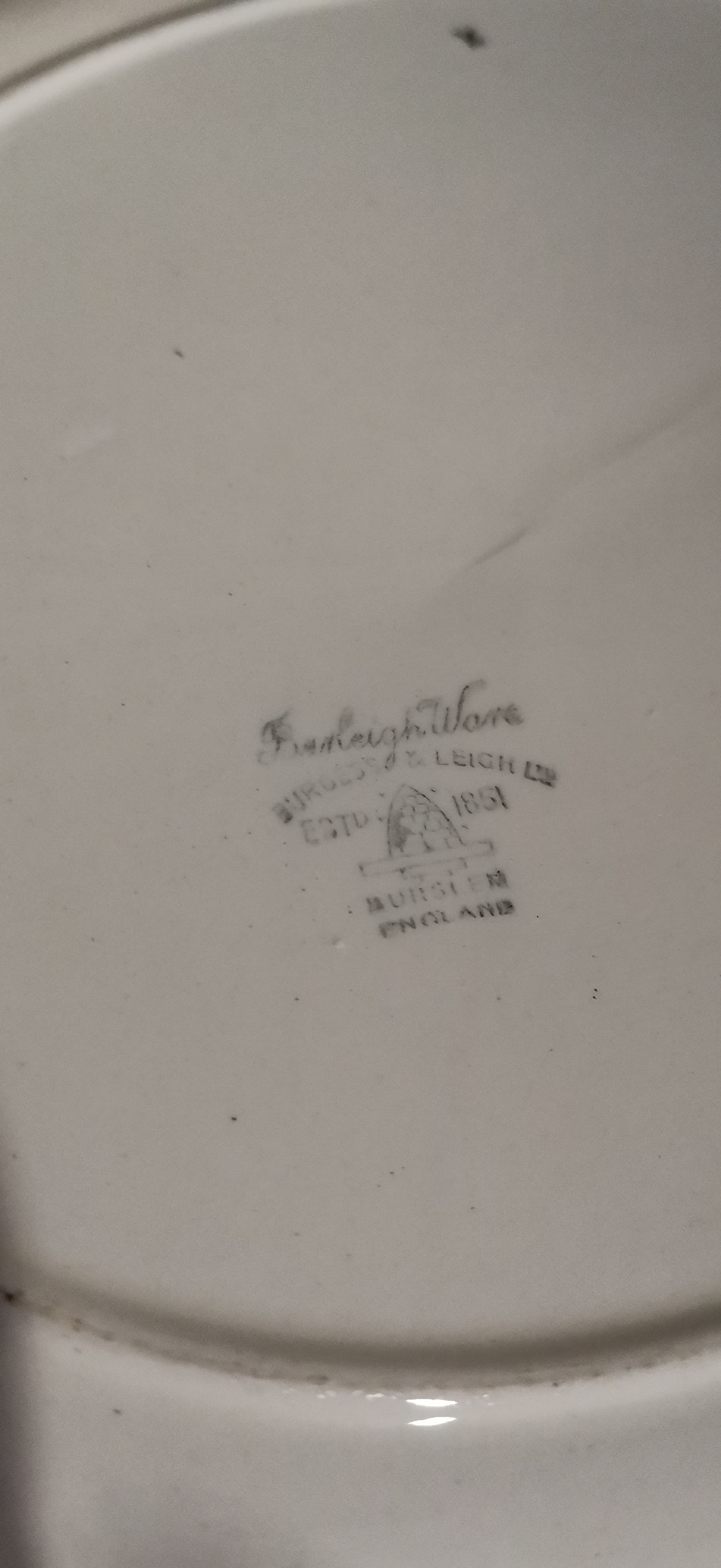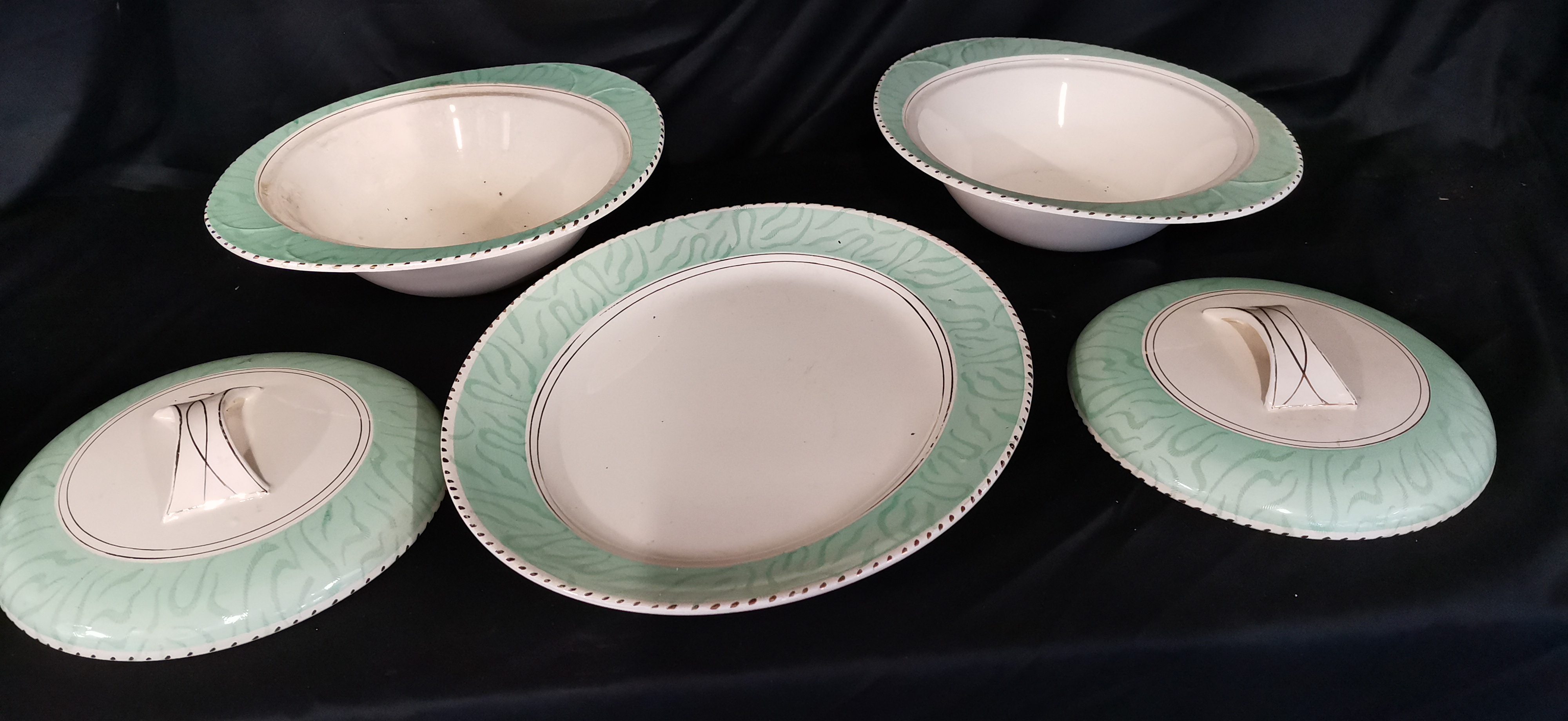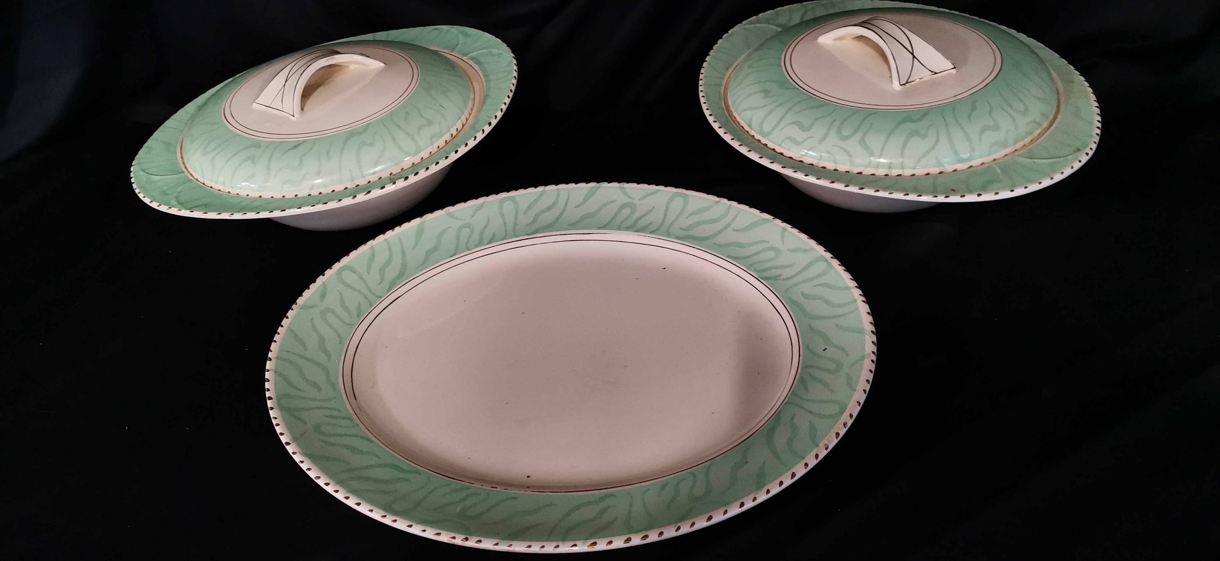 A collection of Burleigh Ware Balmoral green and white ceramic serving pieces comprising two lidded tureens and an oval platter featuring an Art Deco pattern.