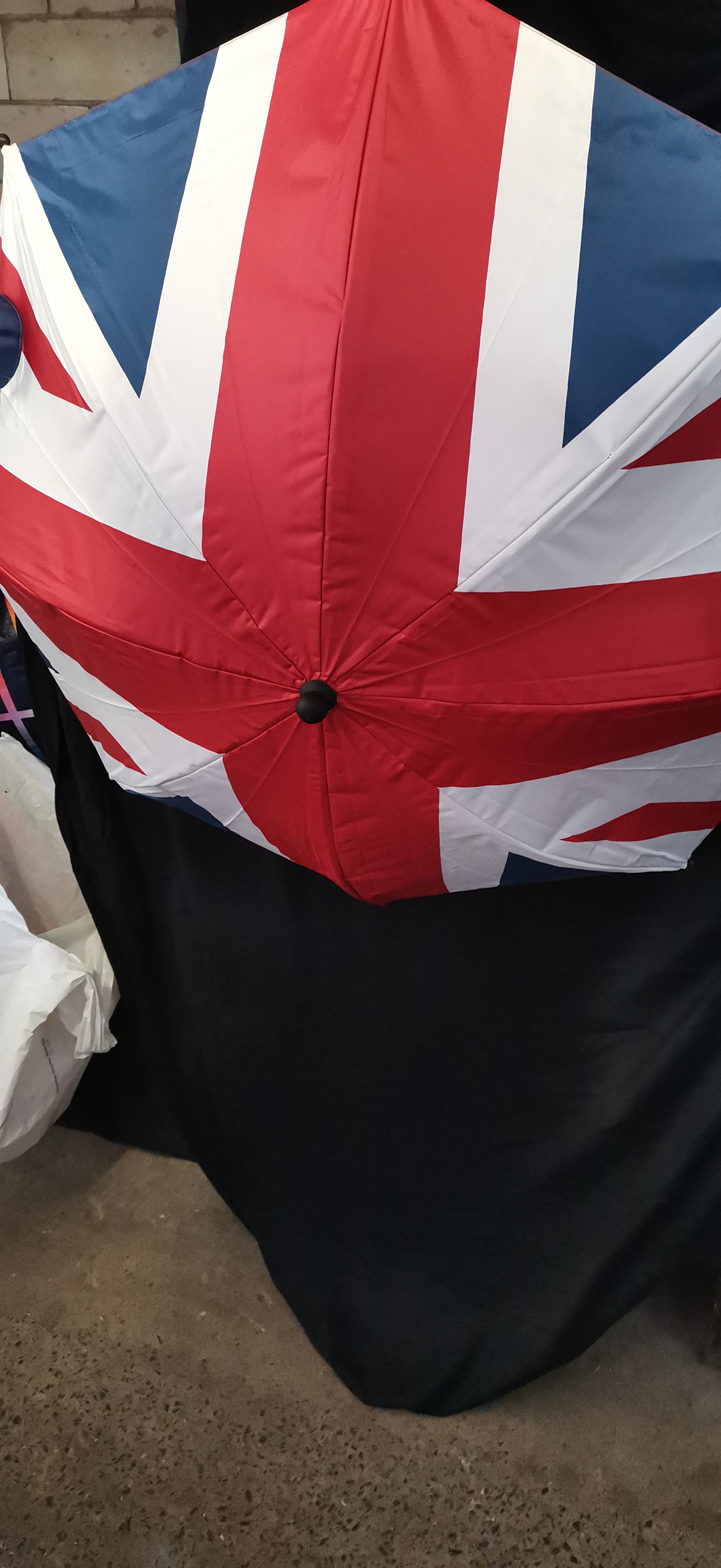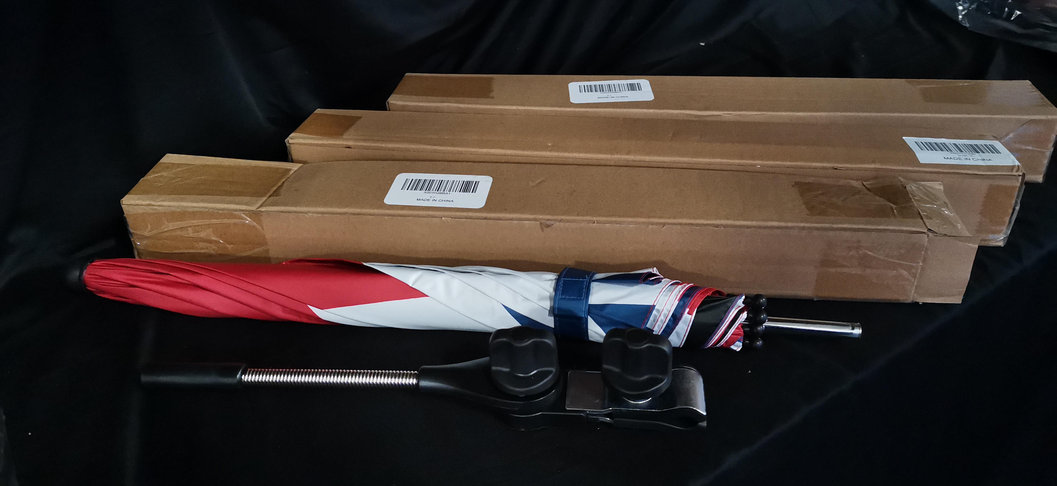 A collection of red, white, and blue Union Jack patterned umbrellas including mounting hardware and original packaging marked Made in China.