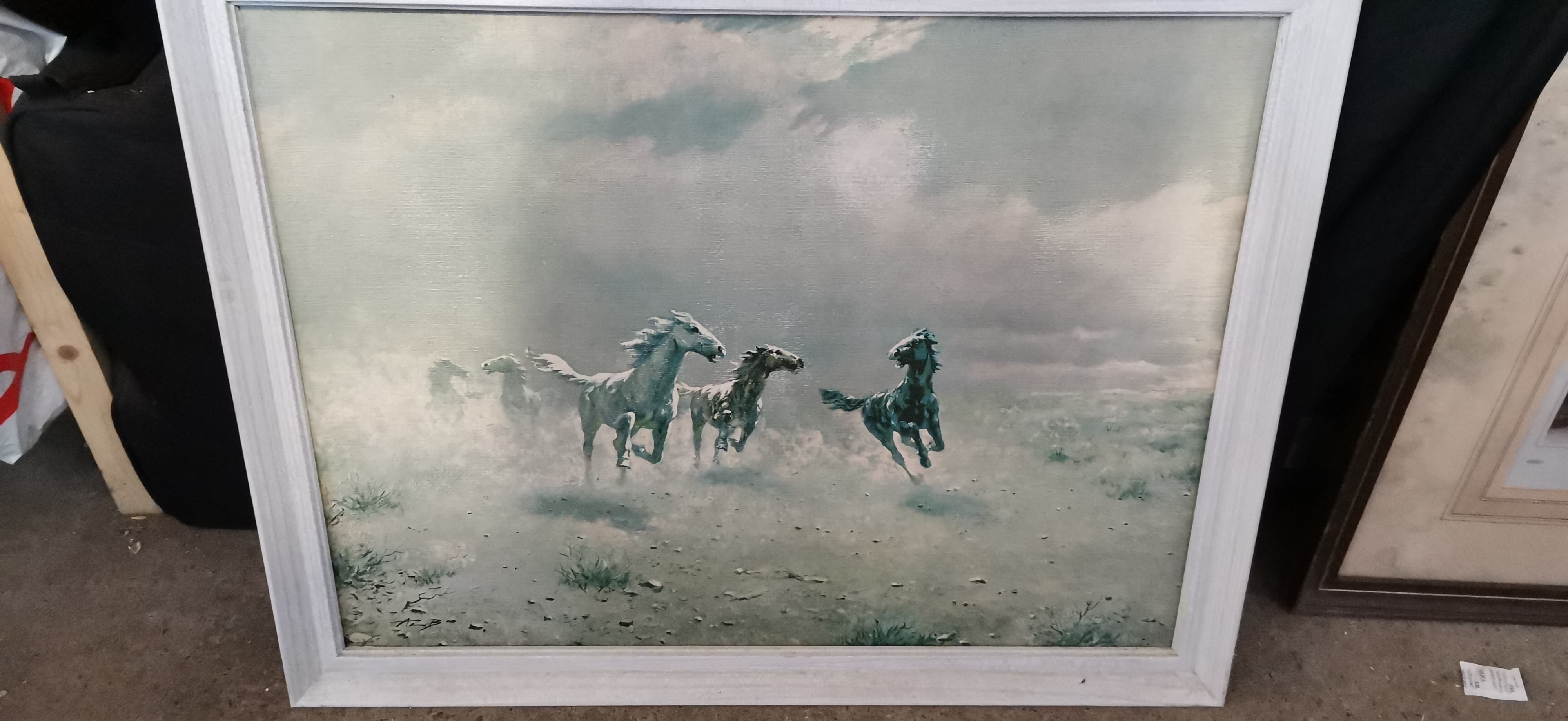 A framed oil painting on canvas depicting several running horses in muted tones, signed by the artist in the lower-left corner.