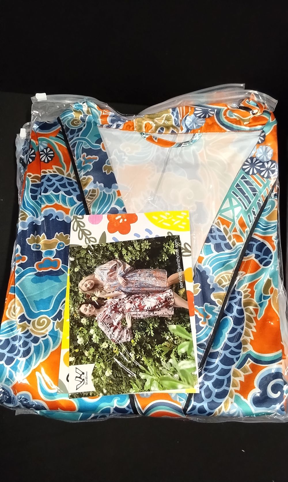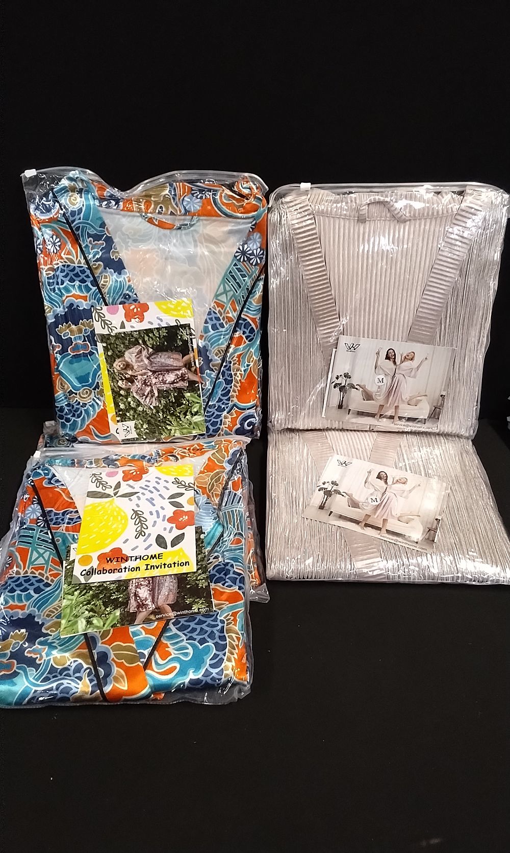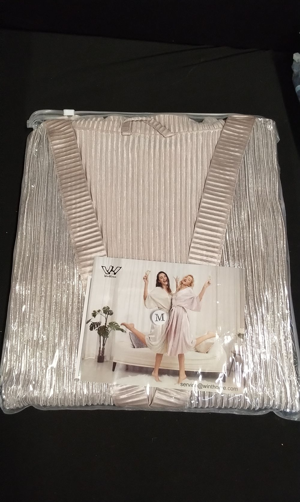 A group of five Winthome robes in original packaging, featuring multi-coloured patterned and solid beige pleated designs, including size M.