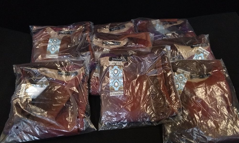 Eight individually packaged boohoo brand garments in various shades of rust, burgundy, and beige.