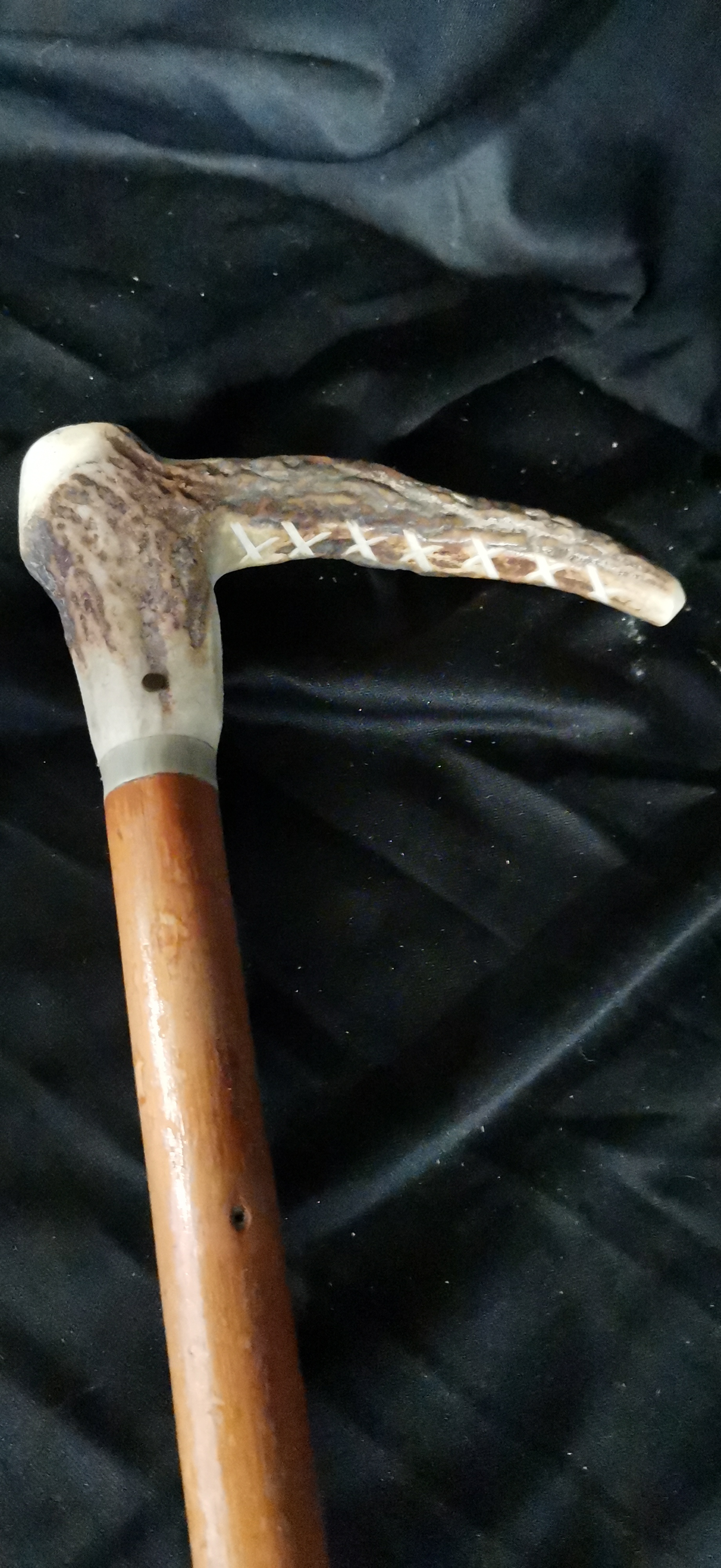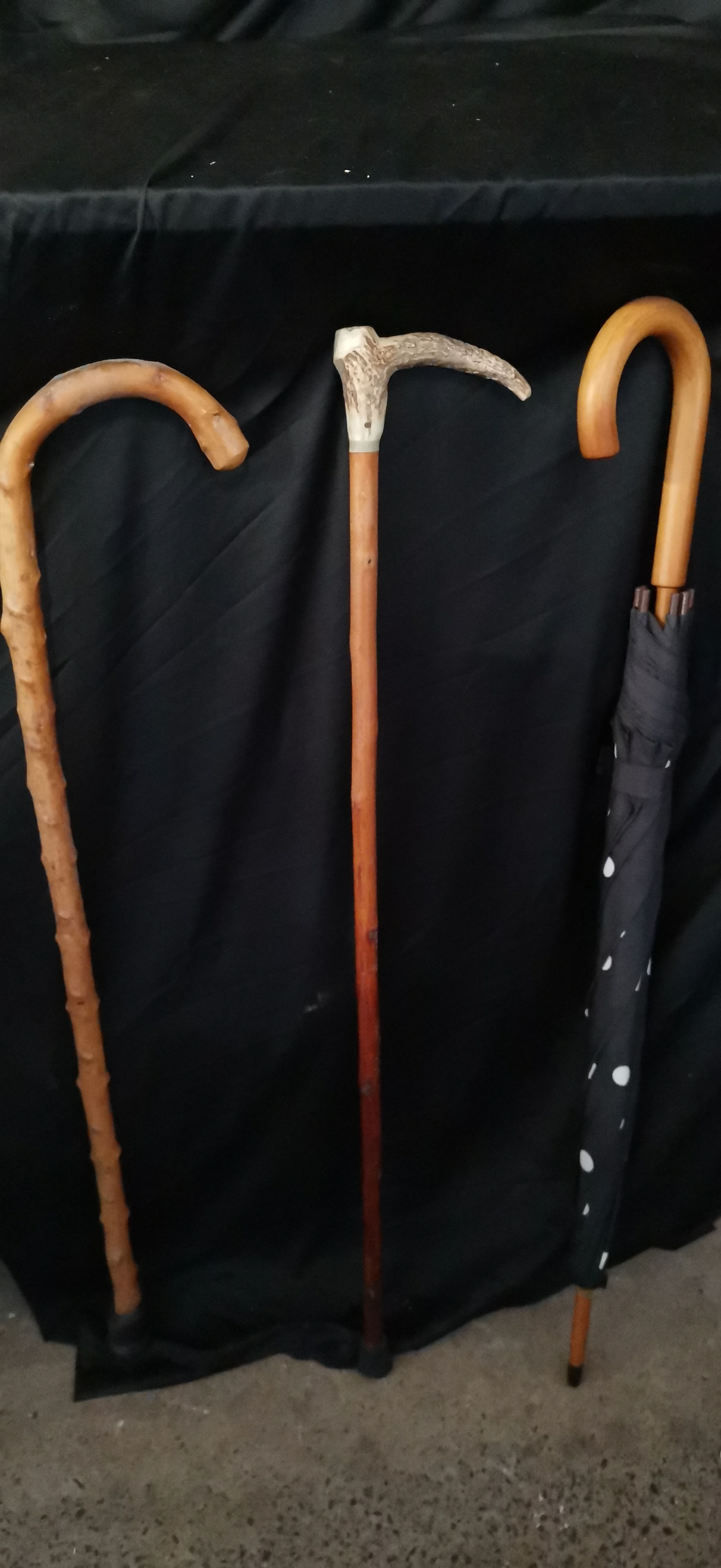 A collection comprising a knobby light brown wooden cane, a walking stick with an antler handle featuring white X carvings, and a polka dot umbrella with a curved wooden handle.