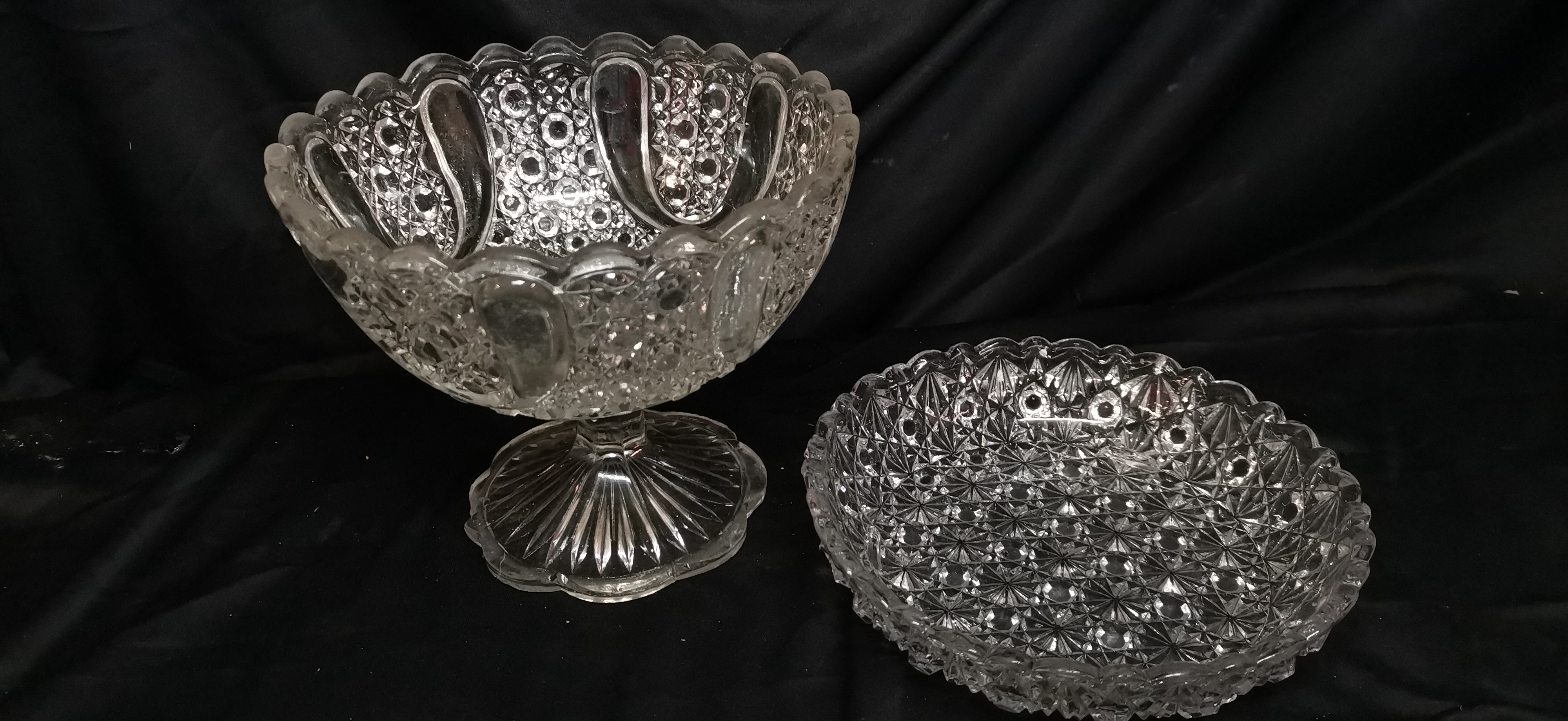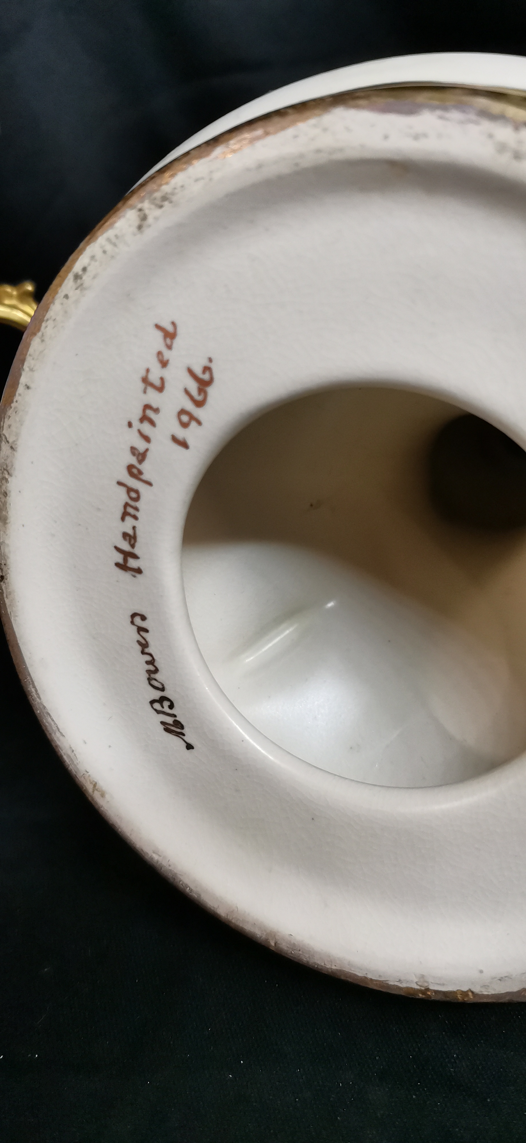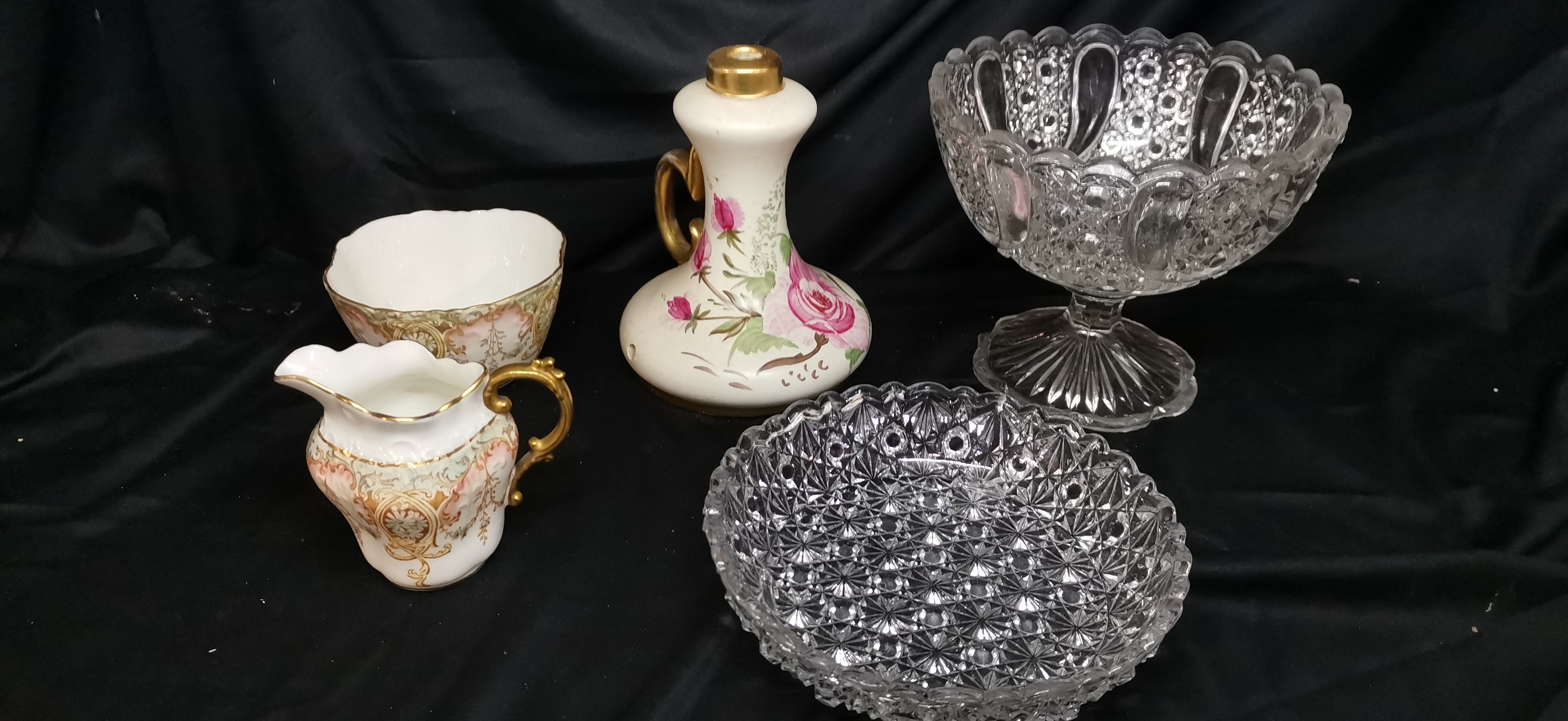A collection of decorative items including a clear pressed glass footed compote and bowl, an Aynsley England creamer and sugar bowl set with gold-toned accents, and a floral ceramic lamp base hand-painted by M. Bowen in 1966.