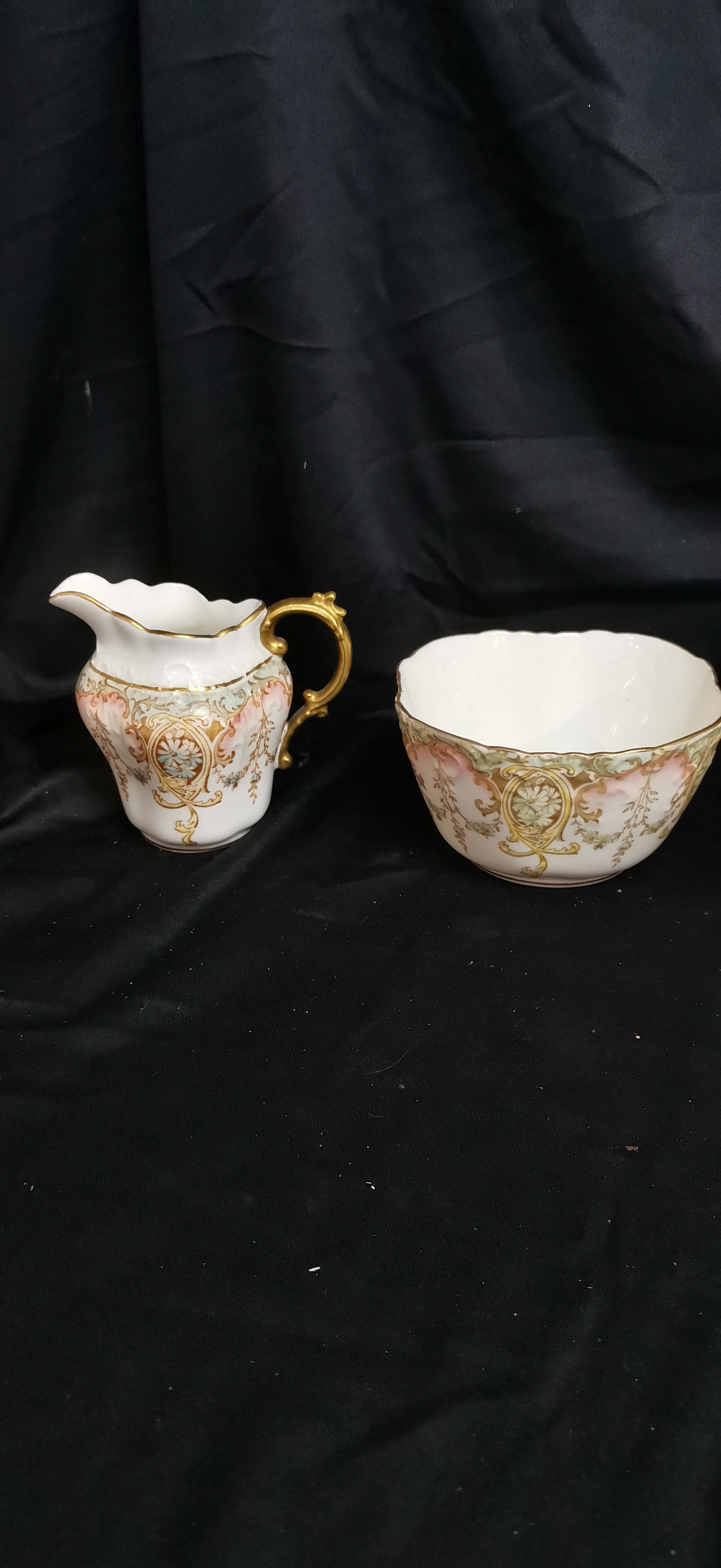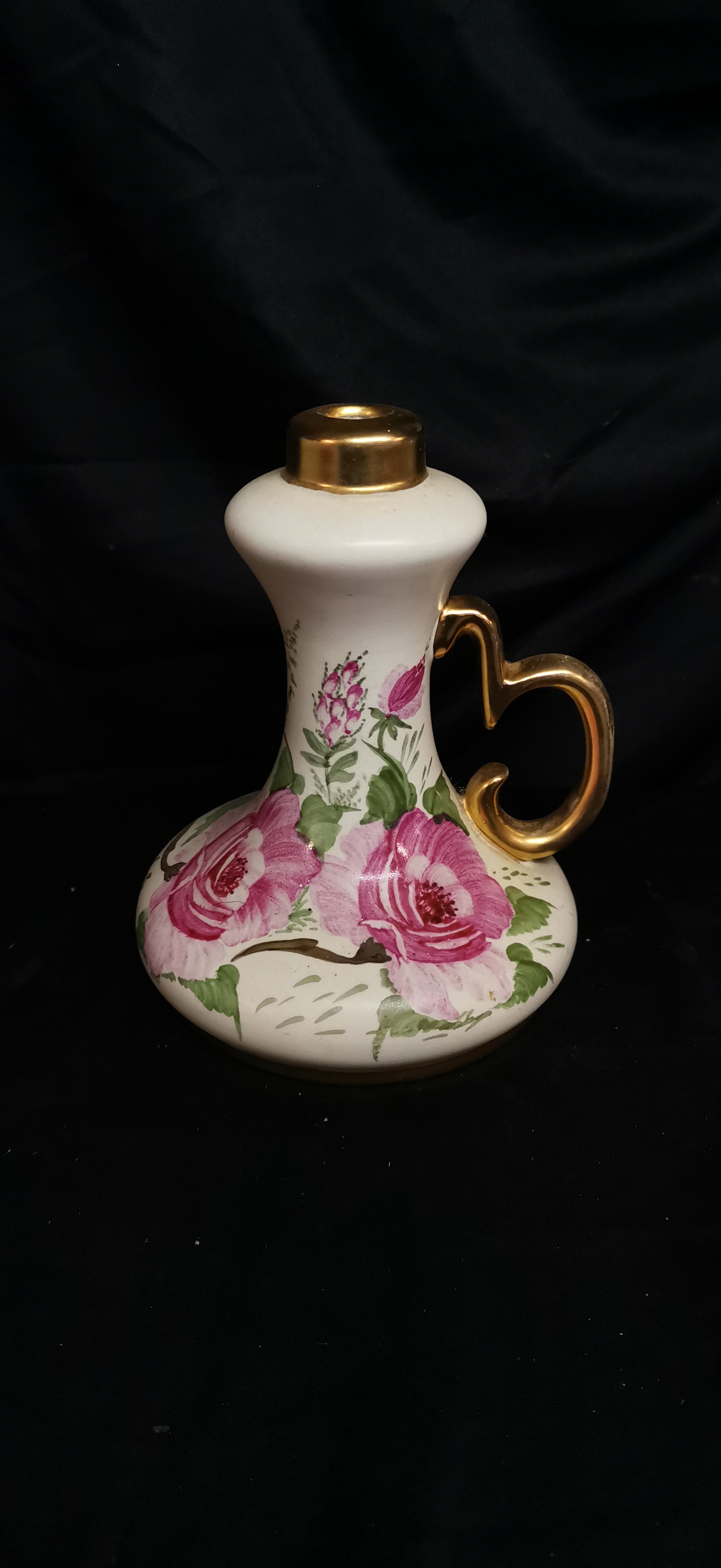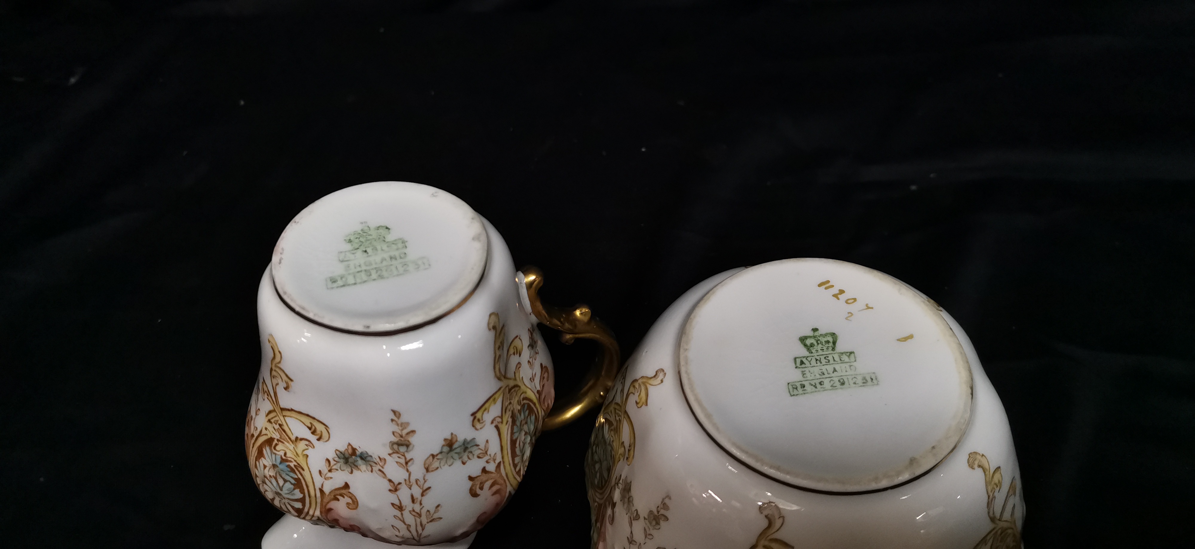 A collection of decorative items including a clear pressed glass footed compote and bowl, an Aynsley England creamer and sugar bowl set with gold-toned accents, and a floral ceramic lamp base hand-painted by M. Bowen in 1966.