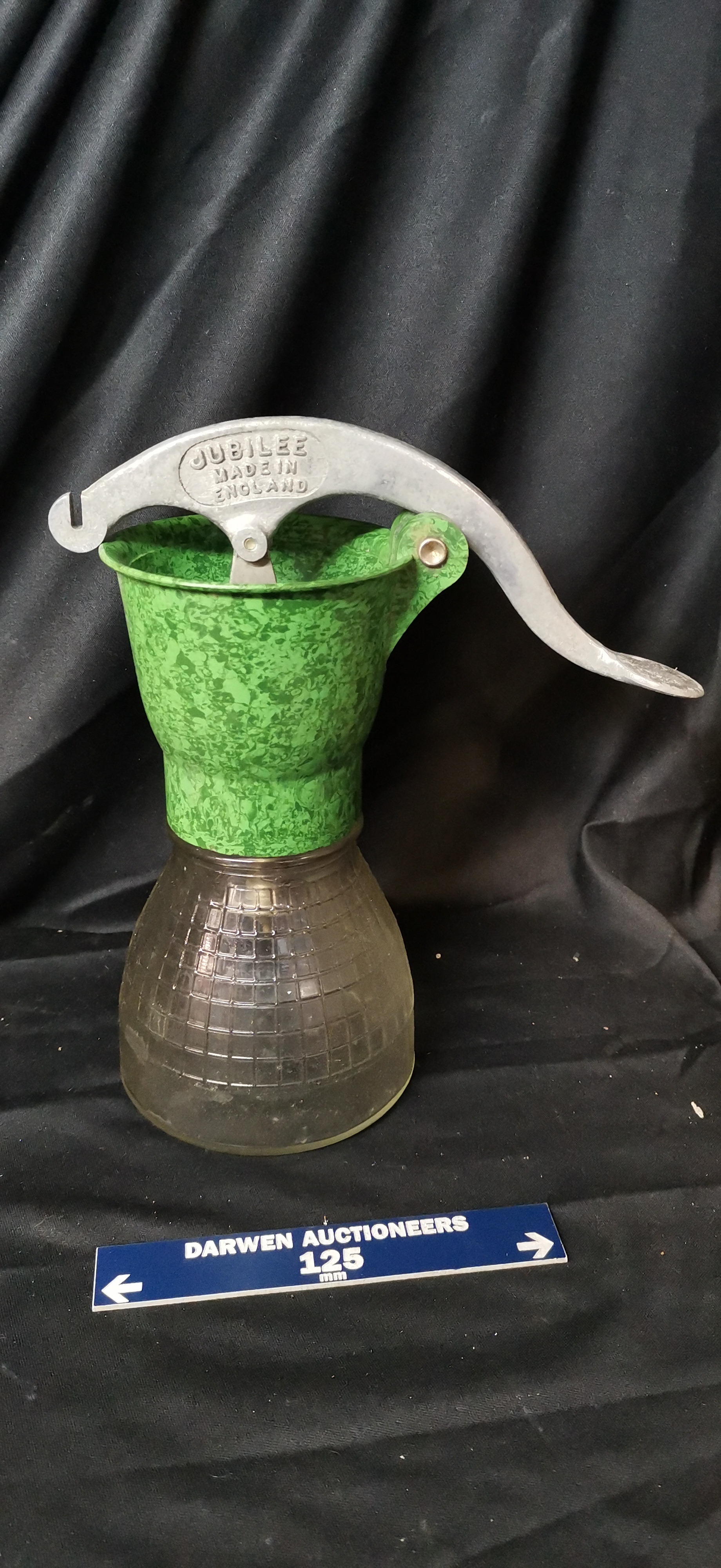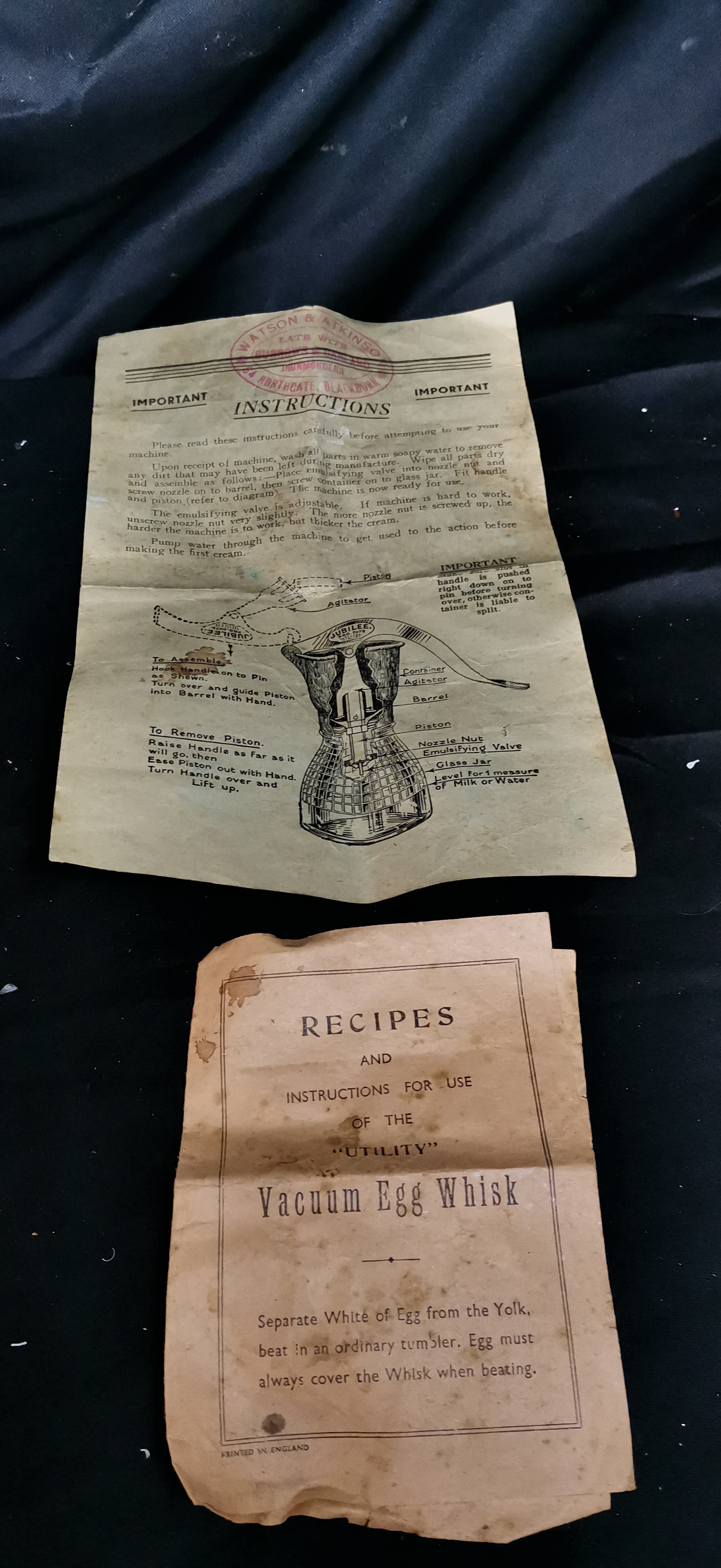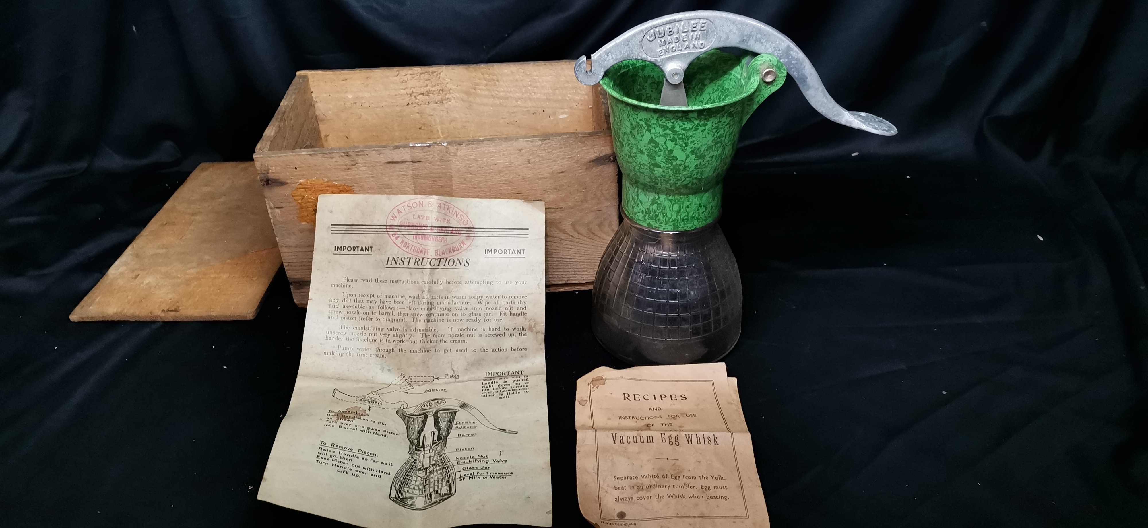 A collection of items including a Jubilee cream maker with a green marbled top and glass base measuring approximately 210mm in height, accompanied by a wooden box and instruction booklets.