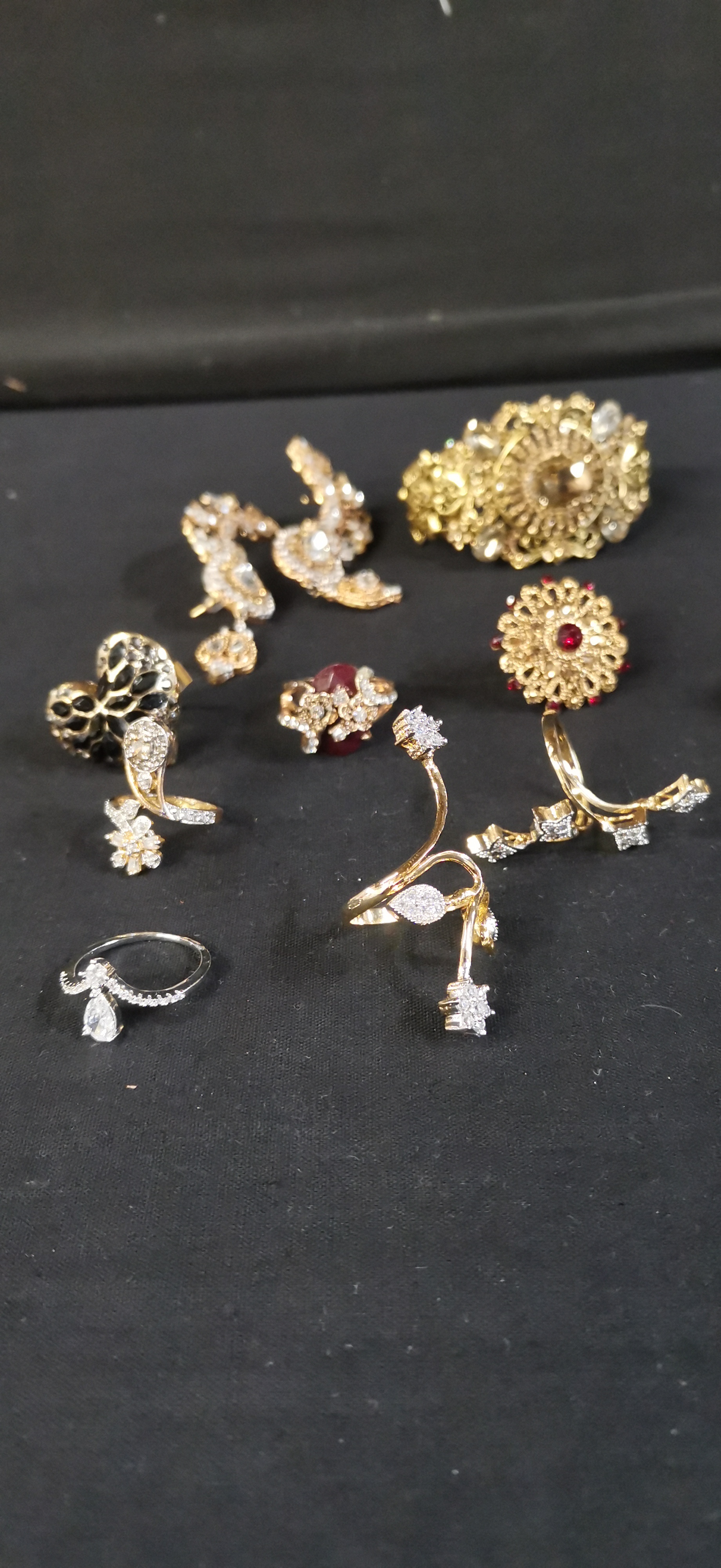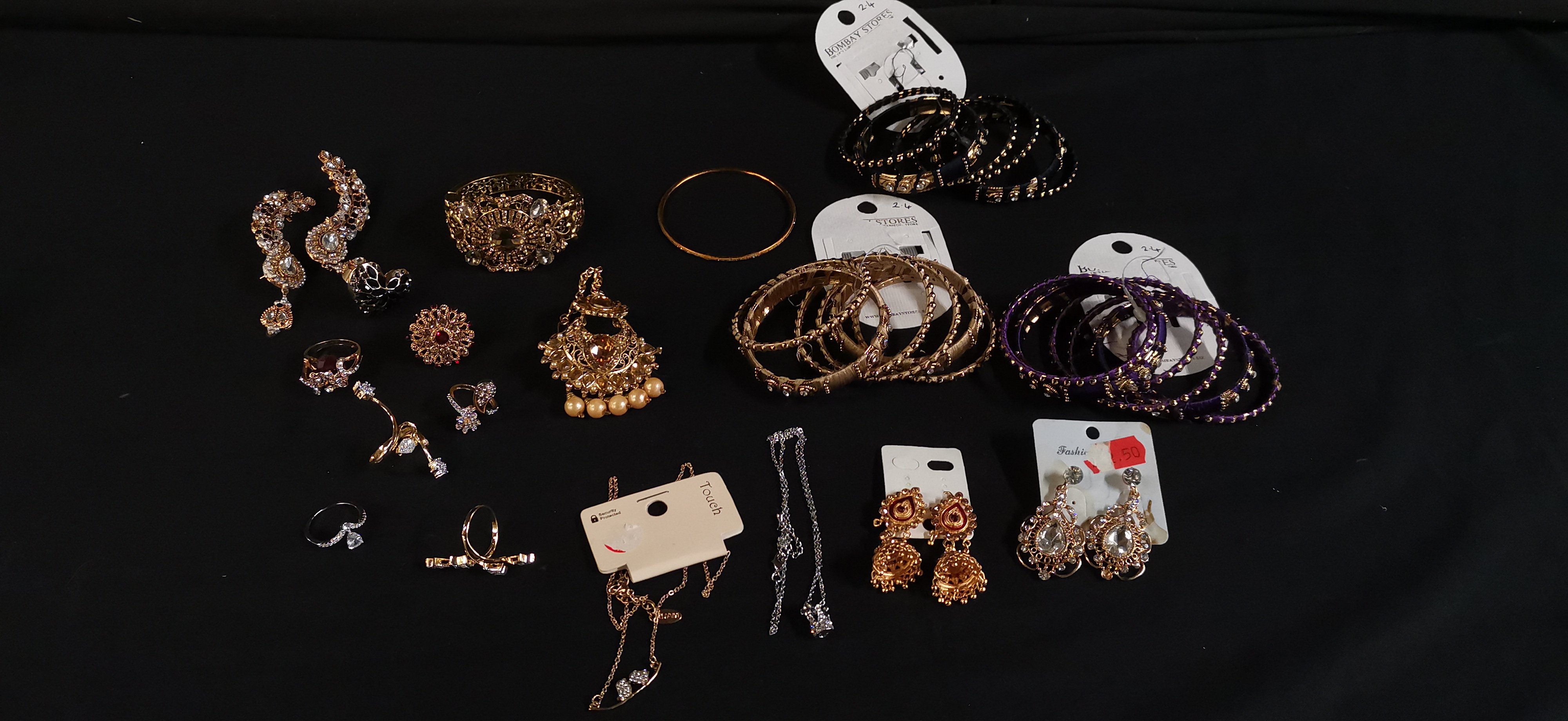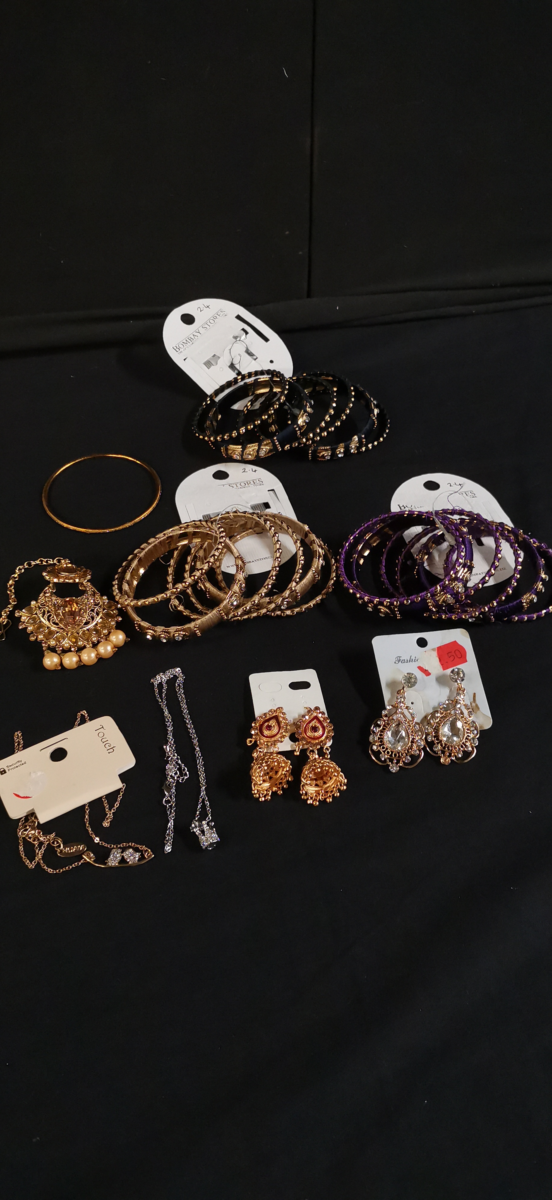 A collection of costume jewellery including bangles, rings, earrings, and necklaces in gold, silver, purple, and black tones, featuring labels for Bombay Stores and Touch.