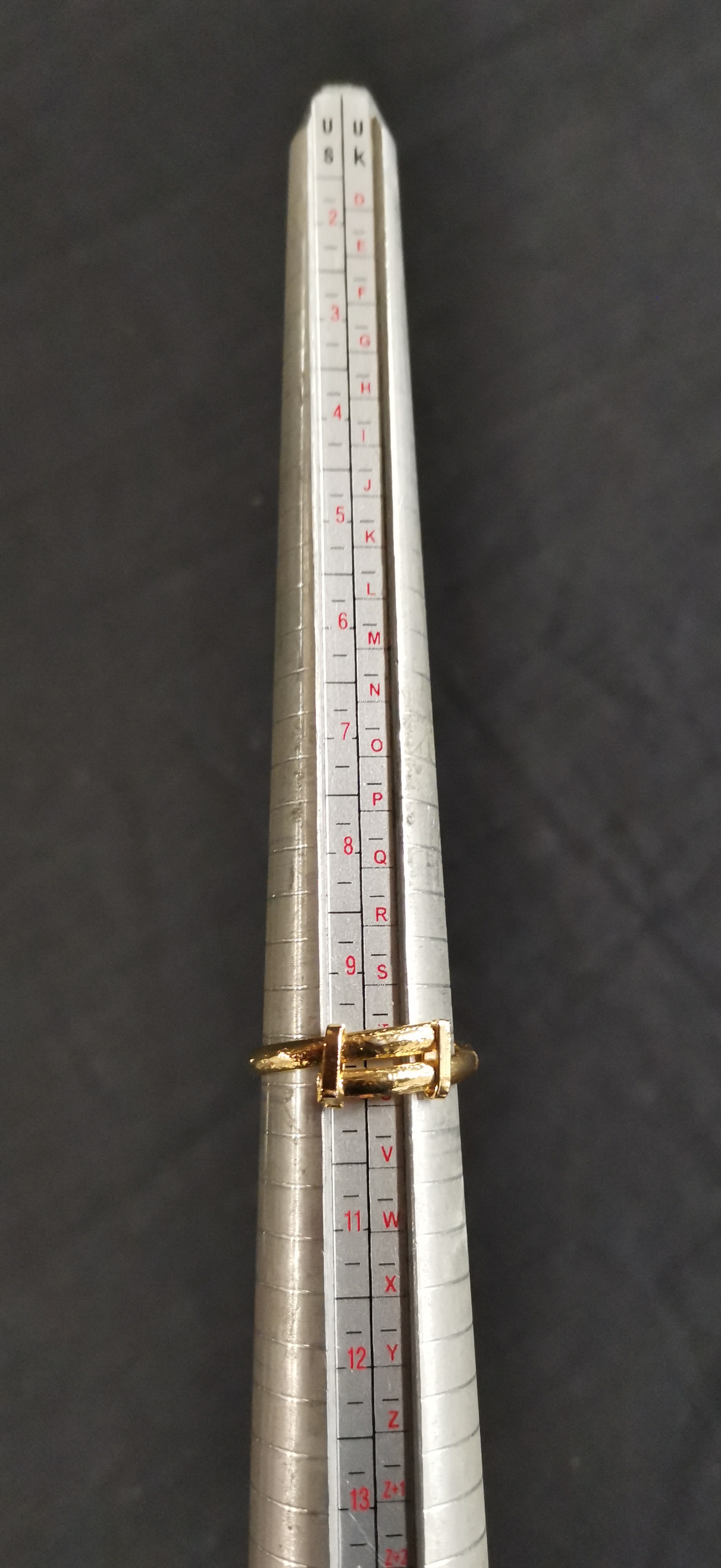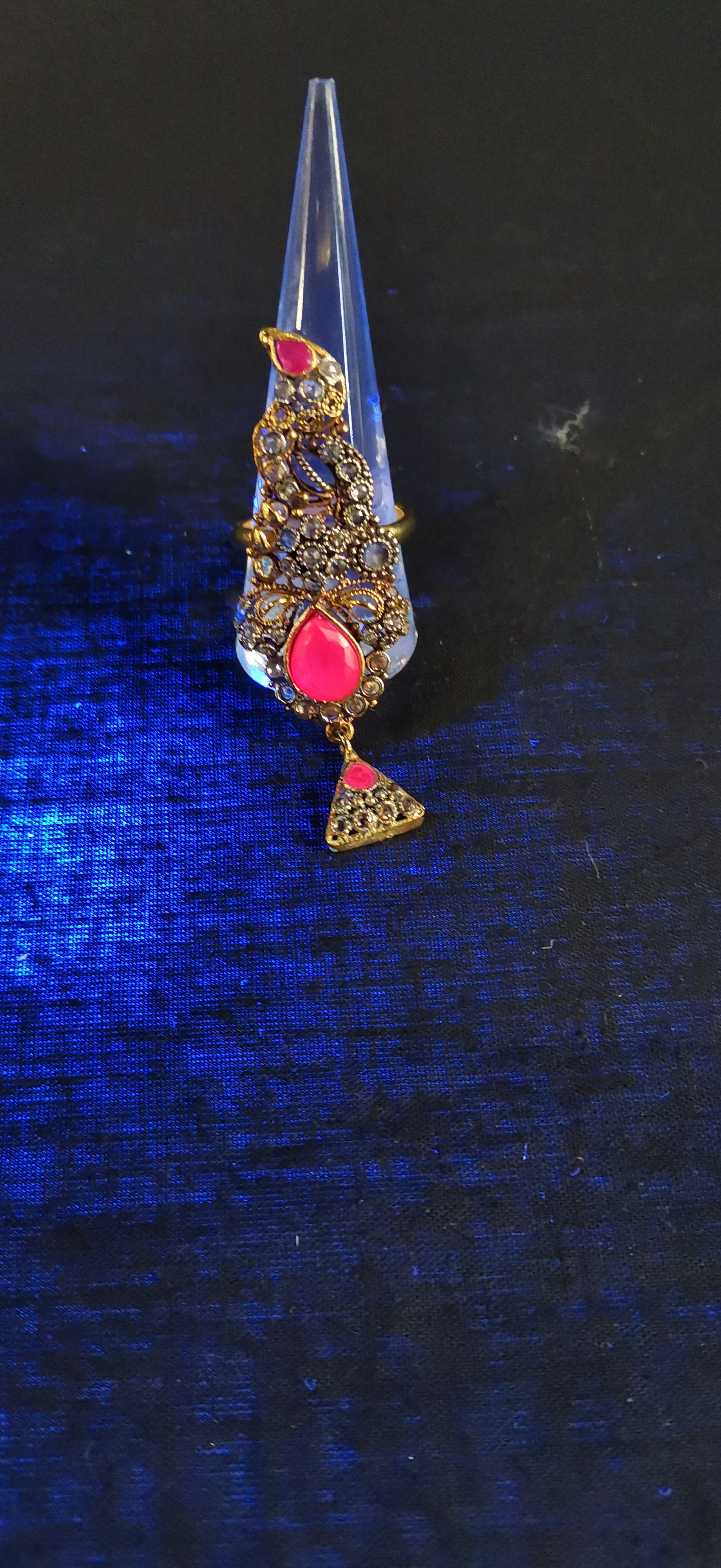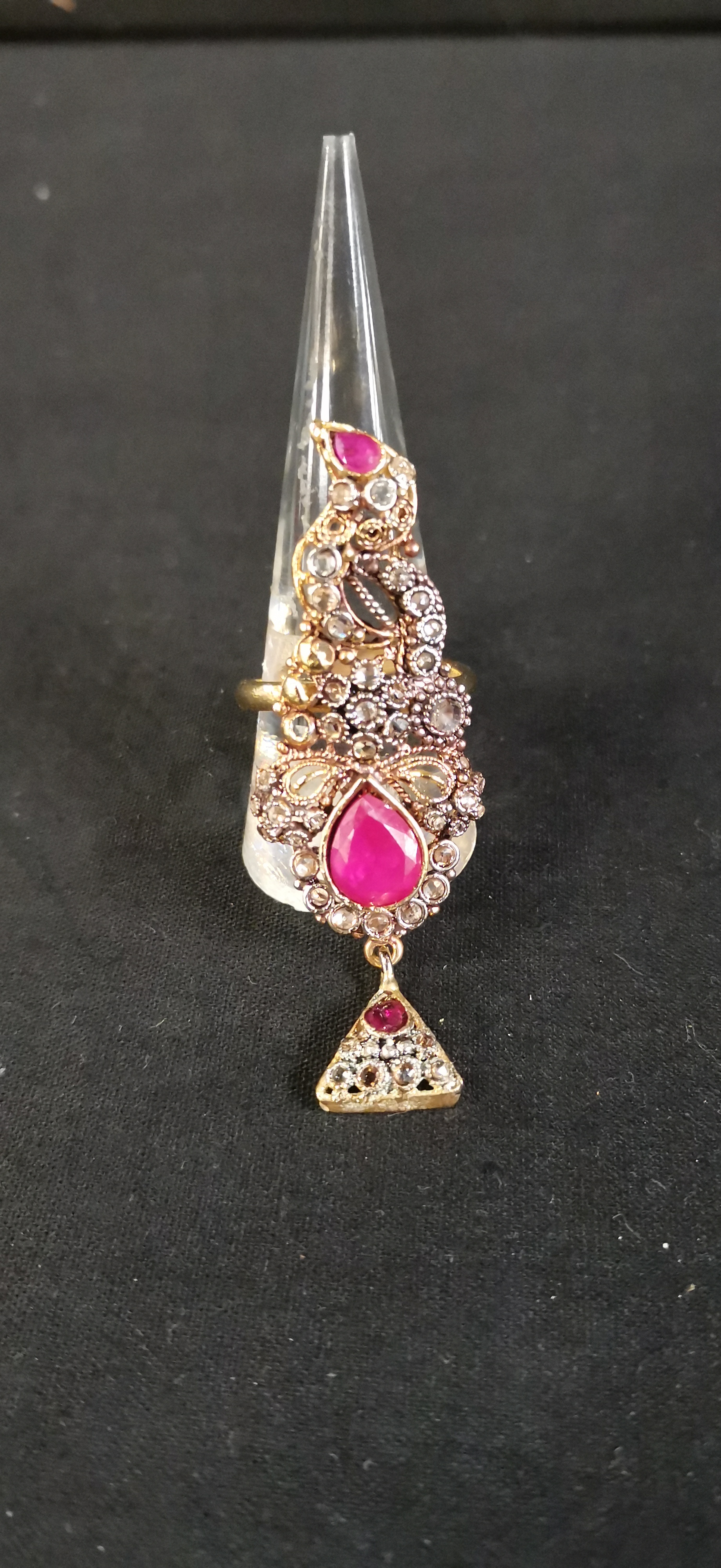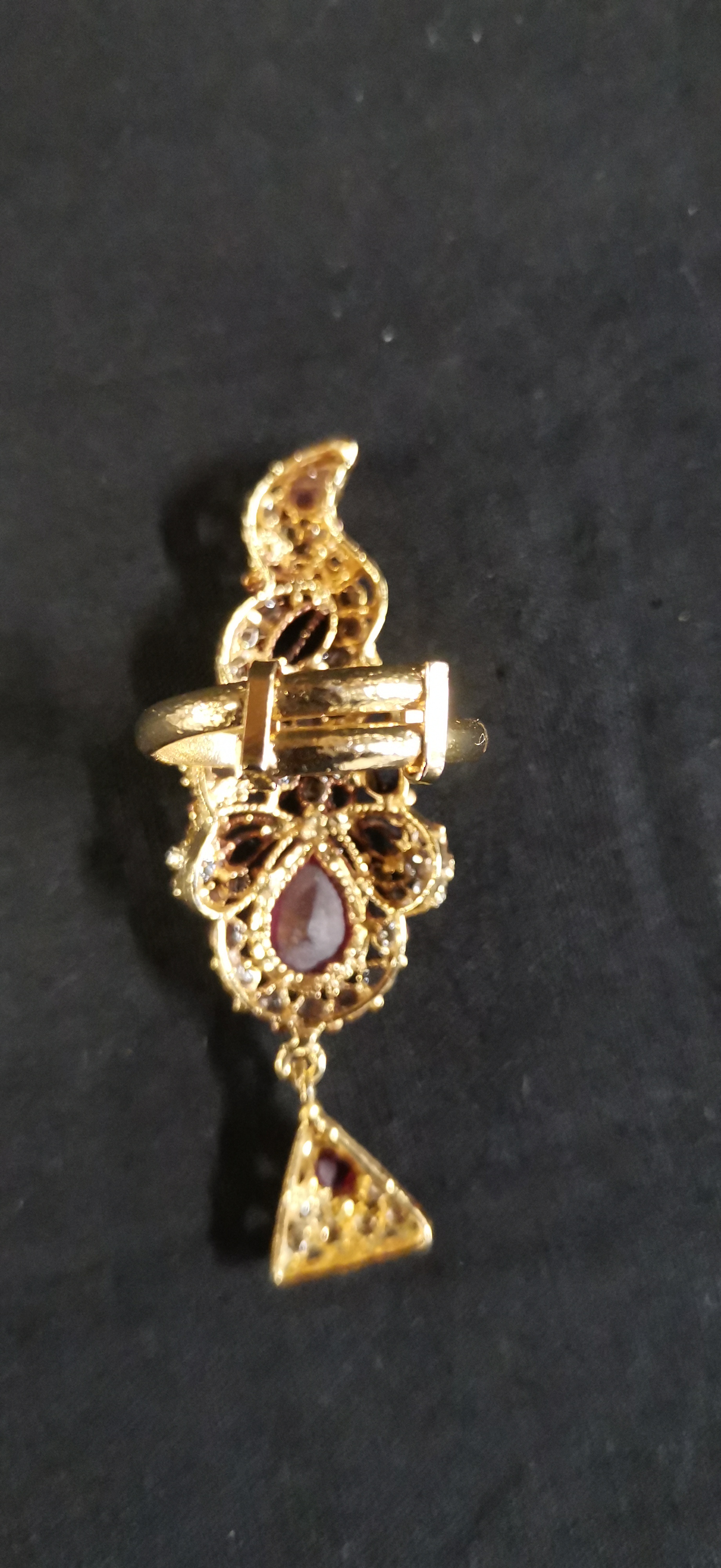 An ornate gold-tone statement ring set with pink and clear stones featuring a dangling triangular charm and an adjustable band shown at approximately UK size T.