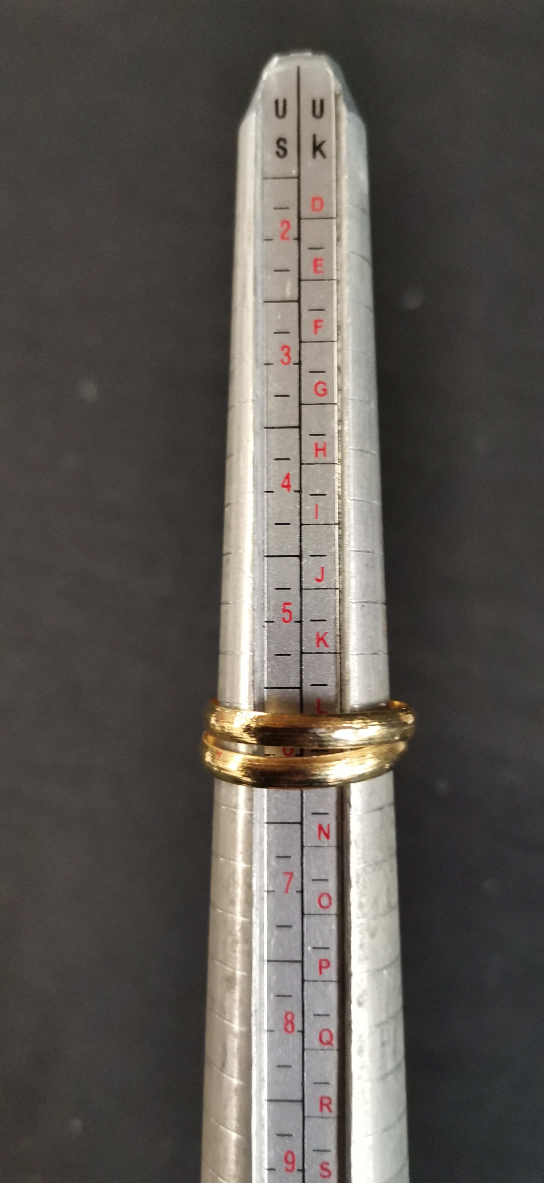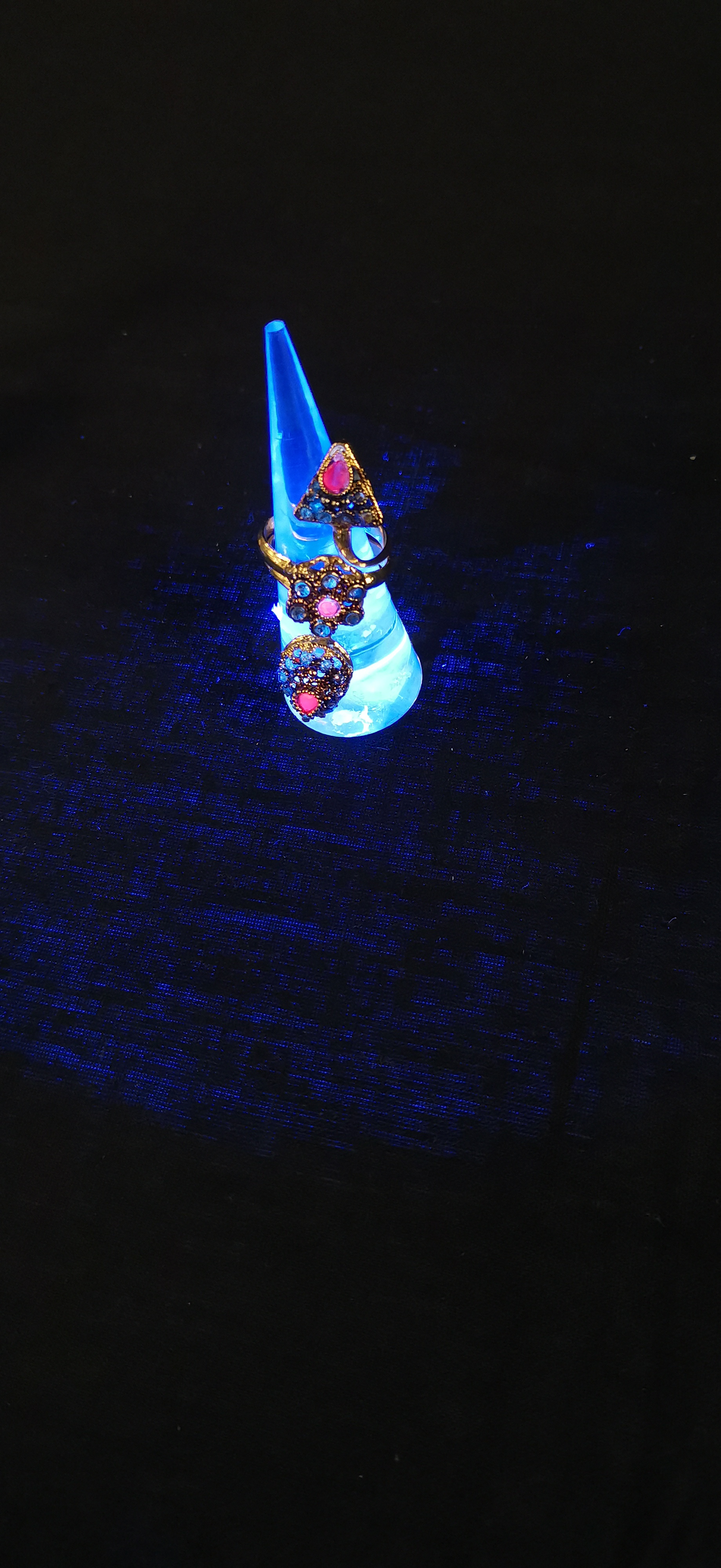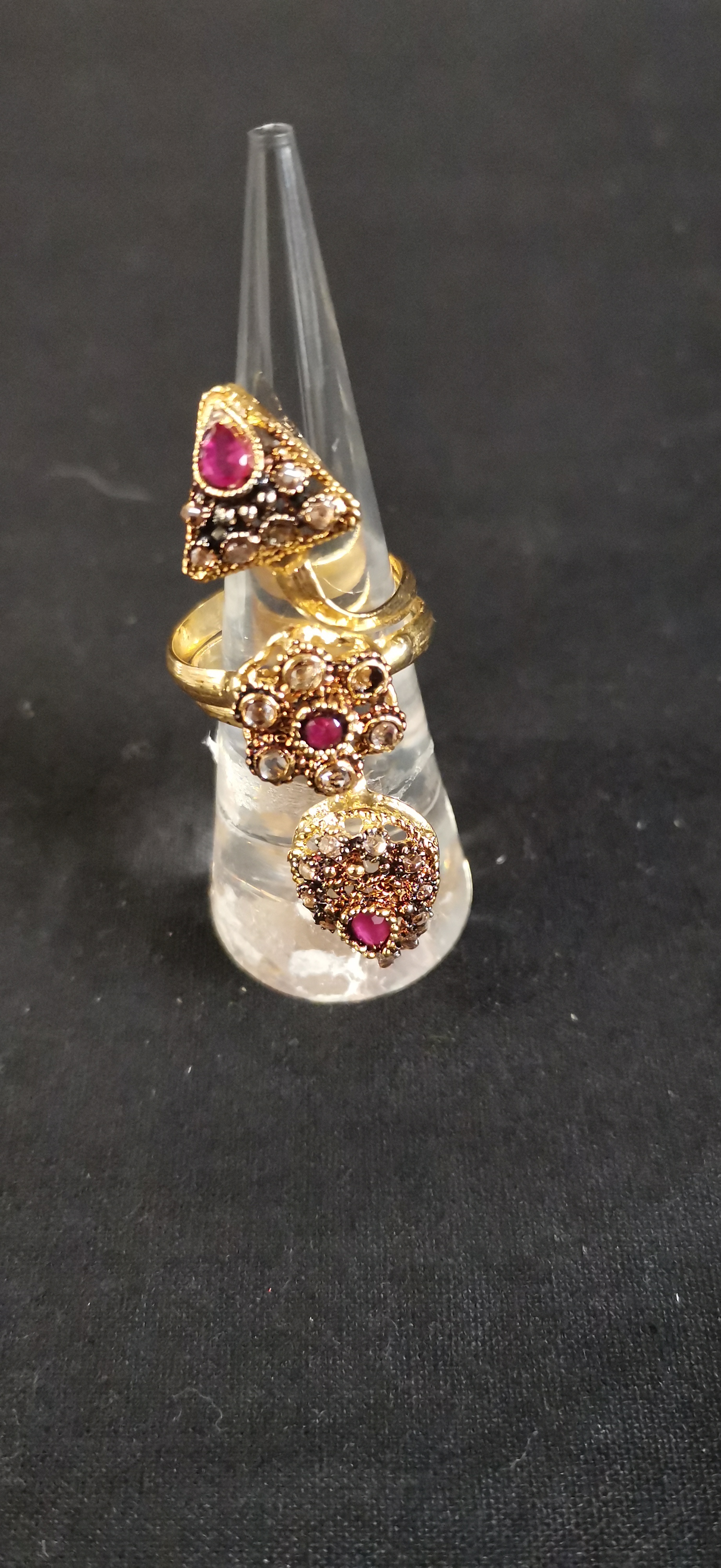 Three gold-toned rings featuring pink stones and clear accents in floral, heart, and triangular cluster designs, measuring approximately UK size L.