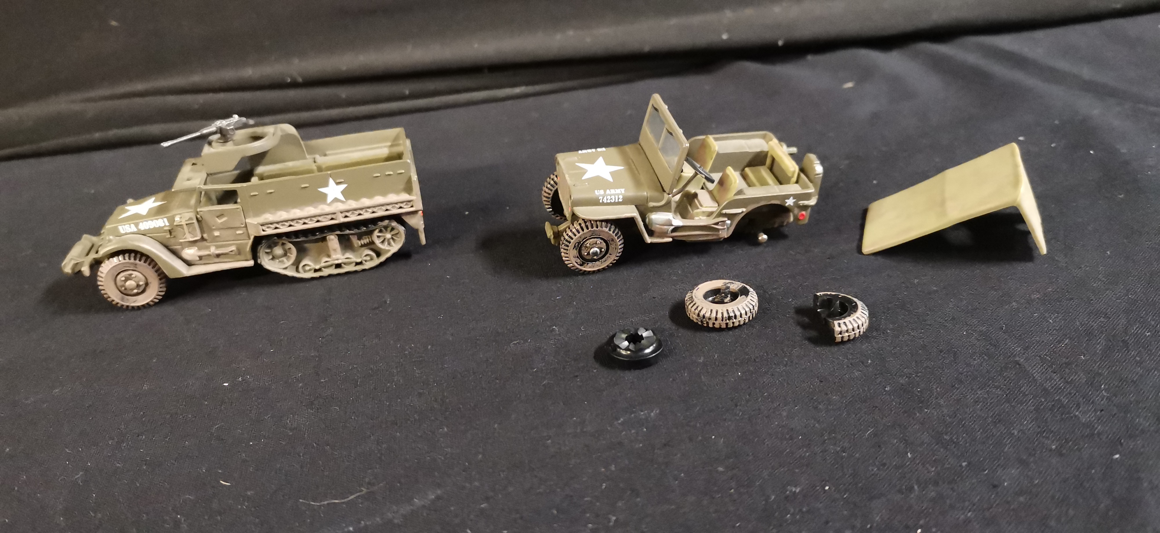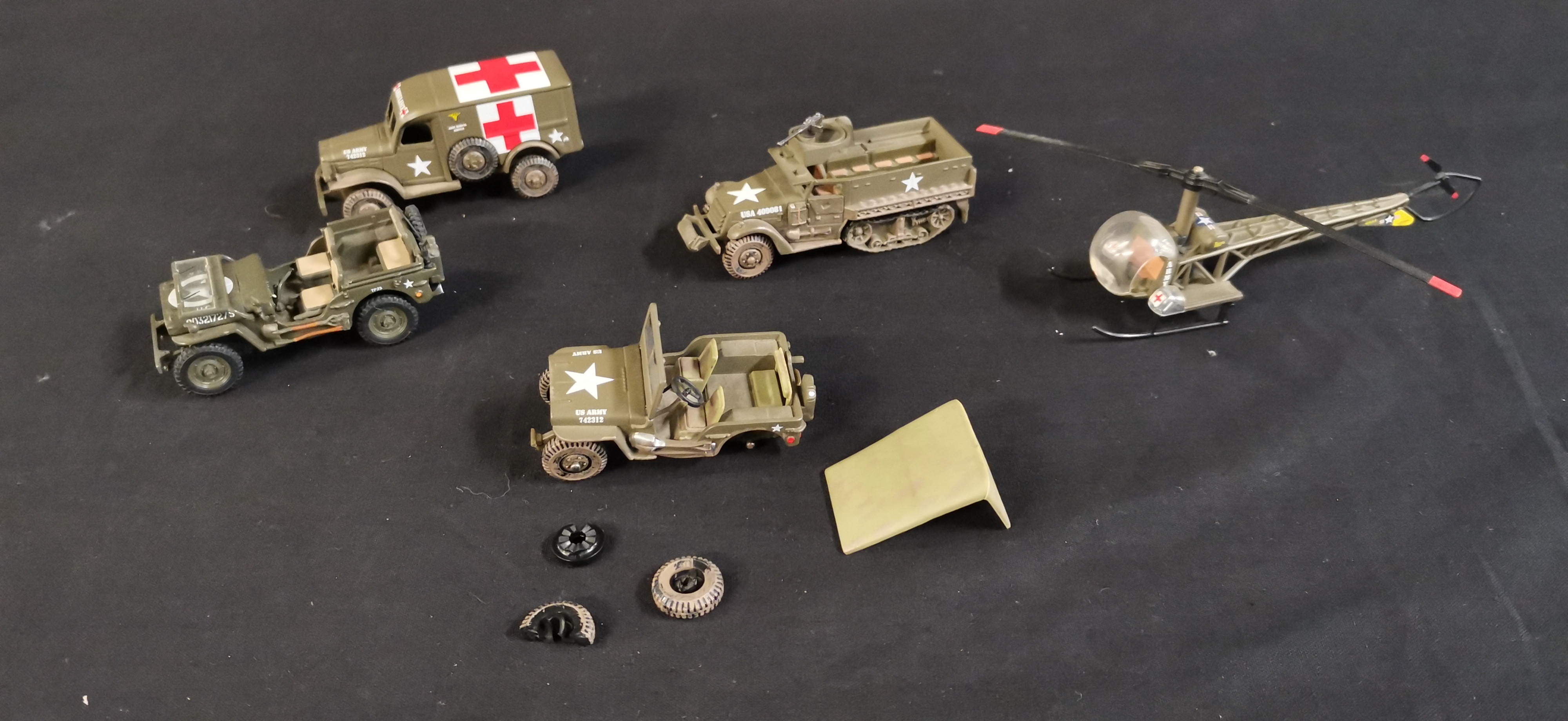 A collection of olive drab military model vehicles and a helicopter featuring U.S. Army markings, including an ambulance, two jeeps, and a half-track, accompanied by several loose parts.