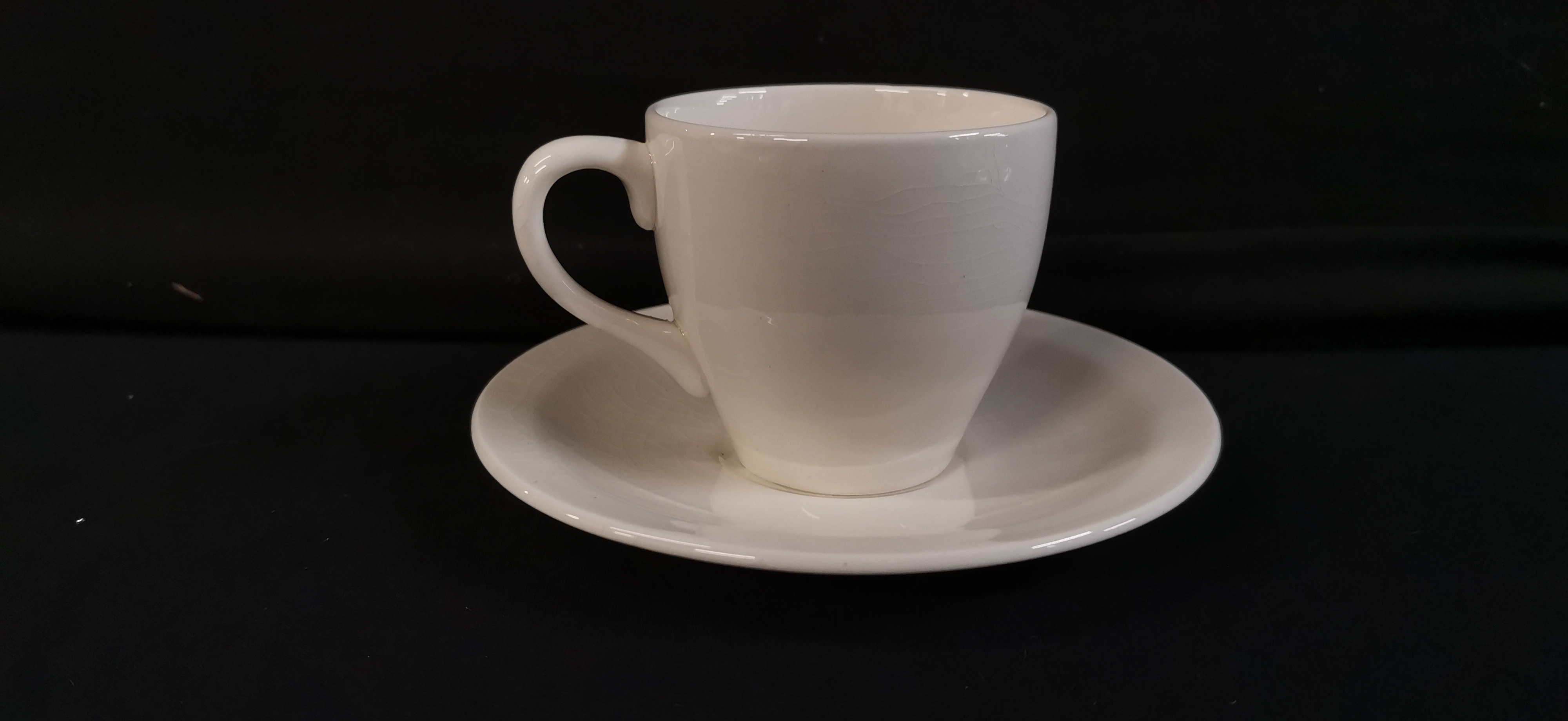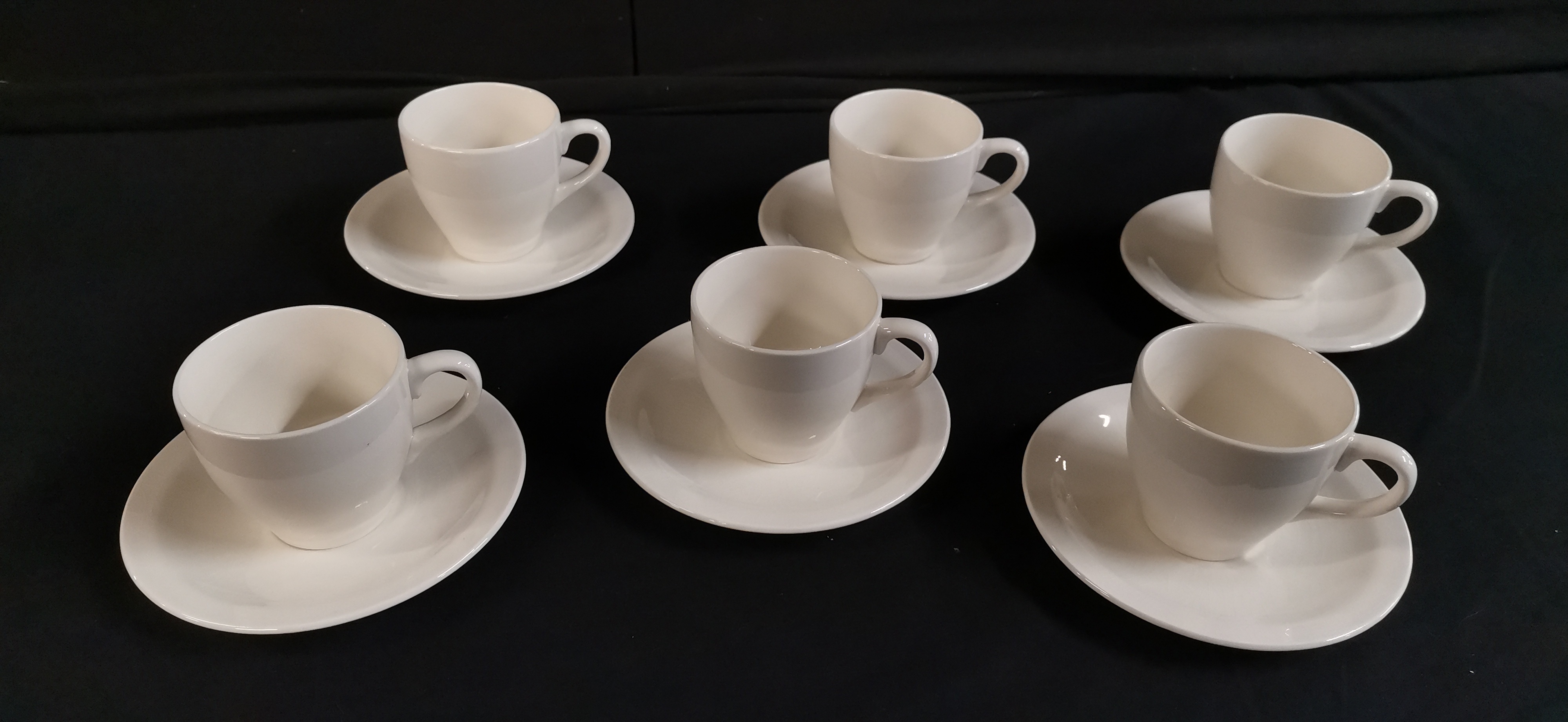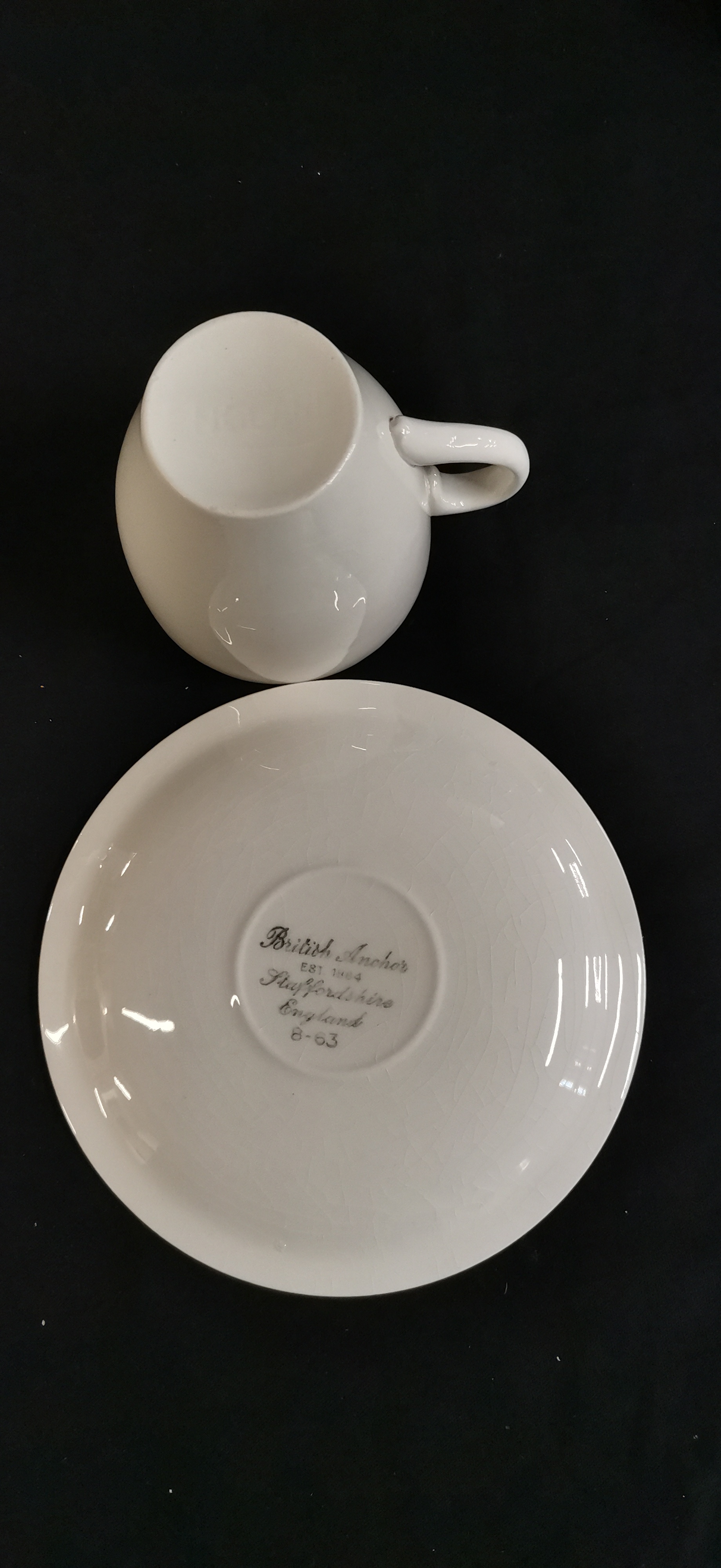 A collection of white ceramic espresso cups and matching saucers featuring the British Anchor Staffordshire maker’s mark to the underside.