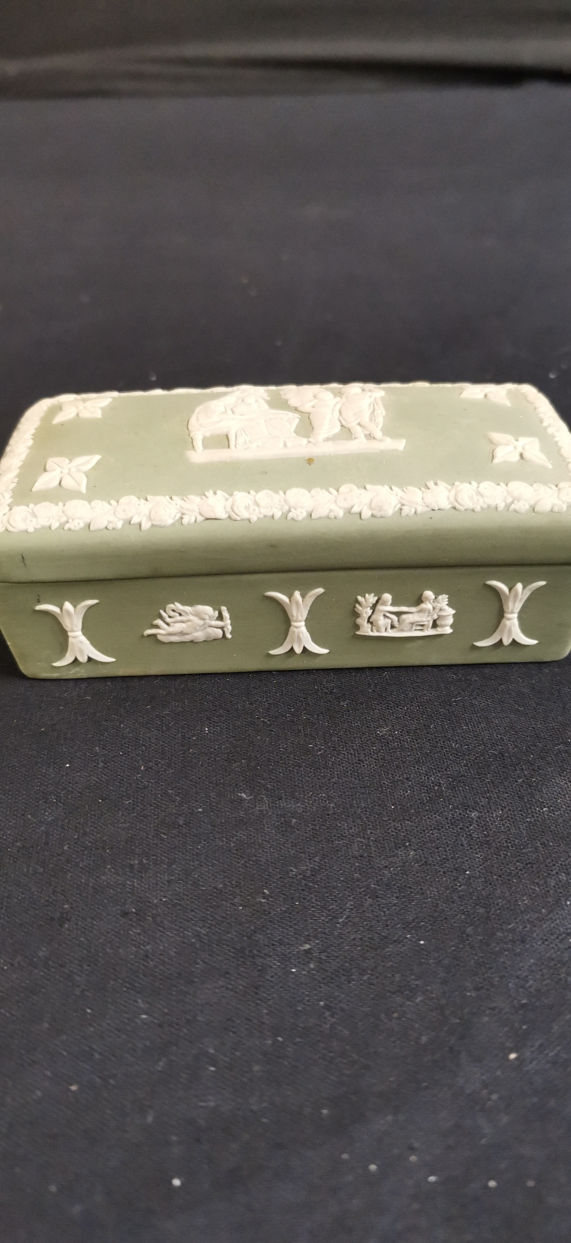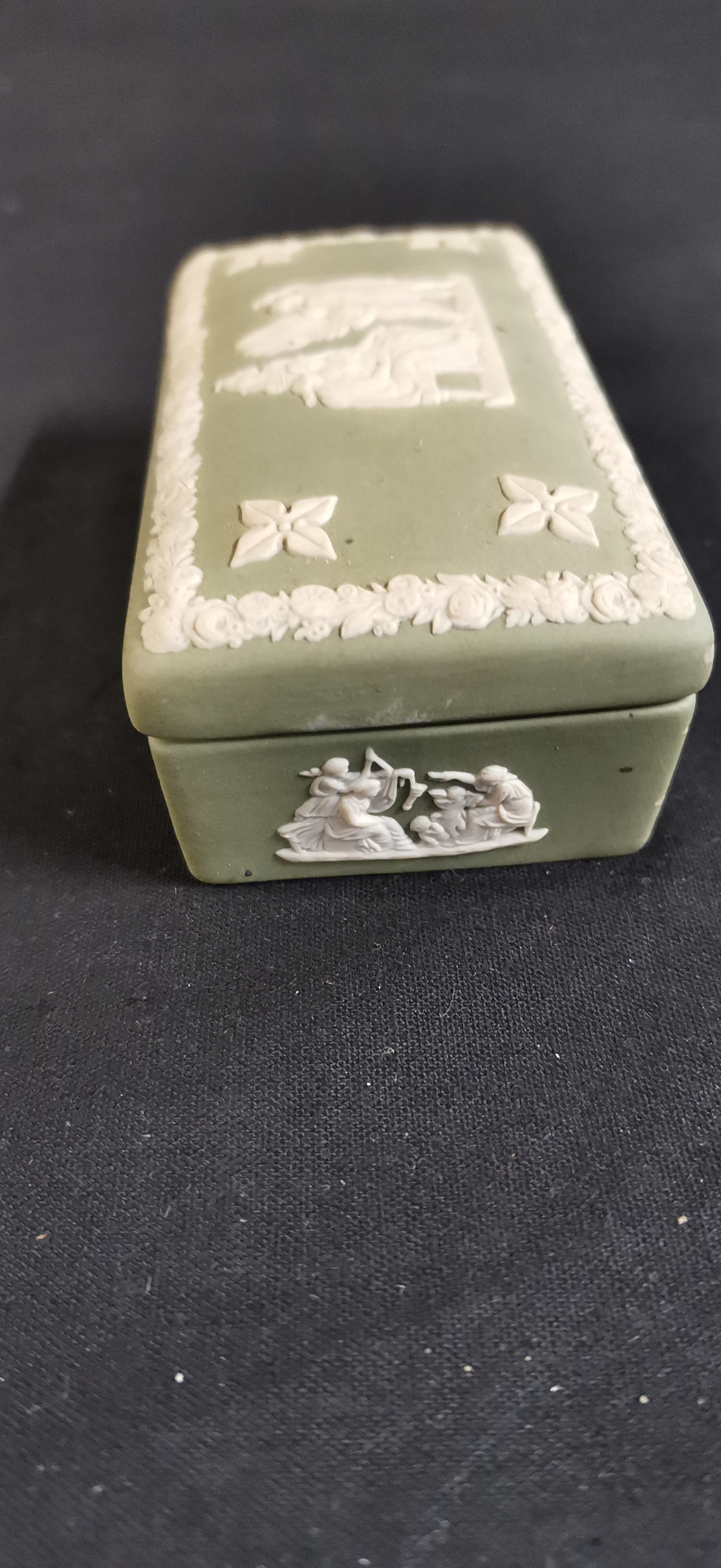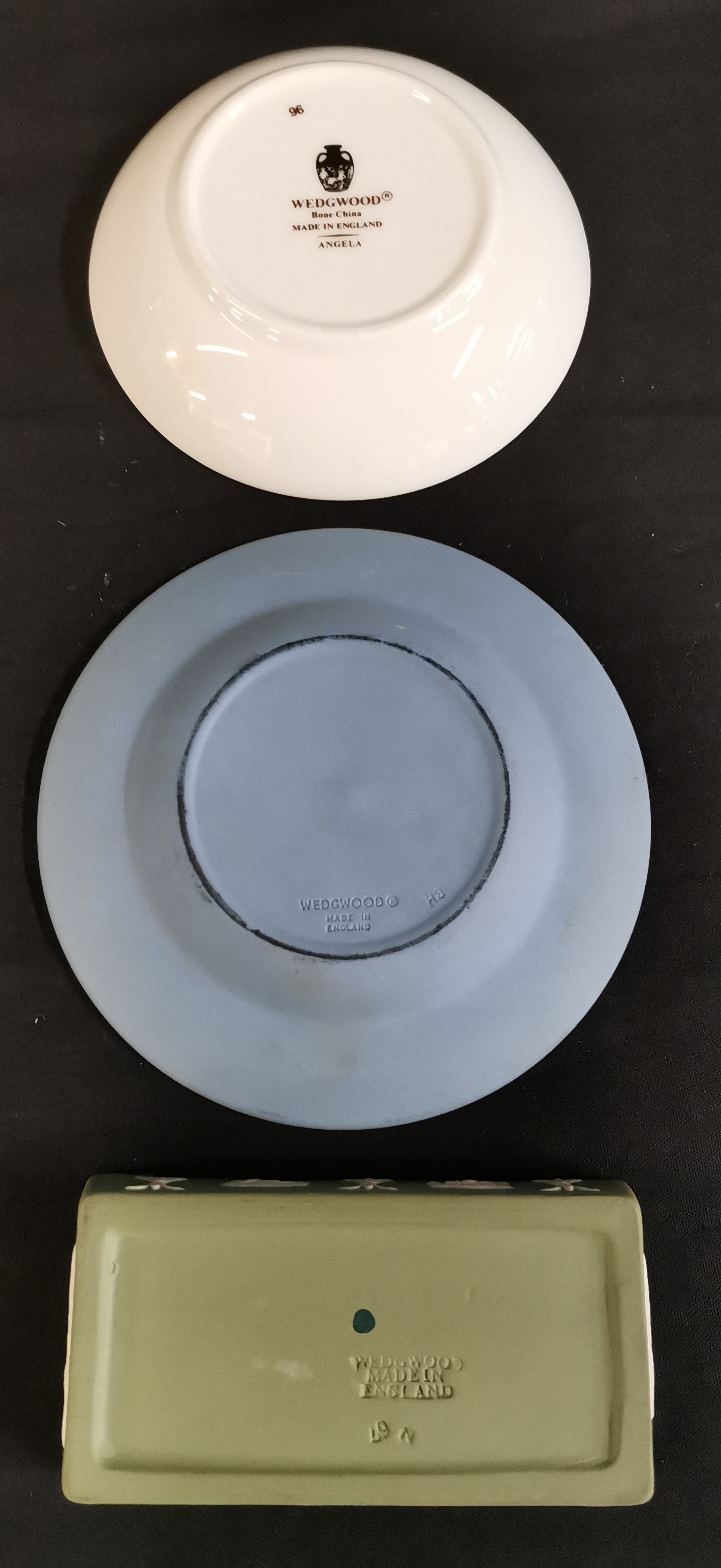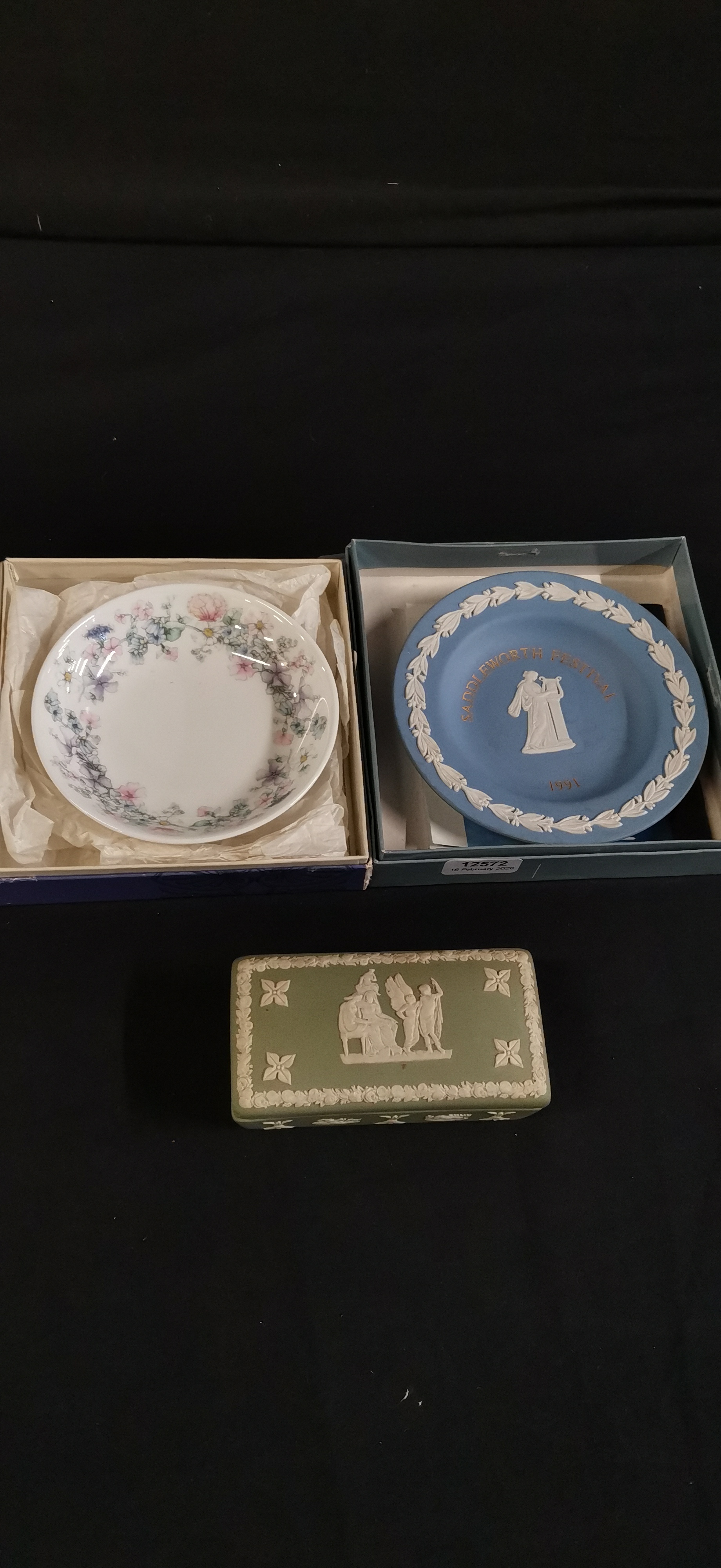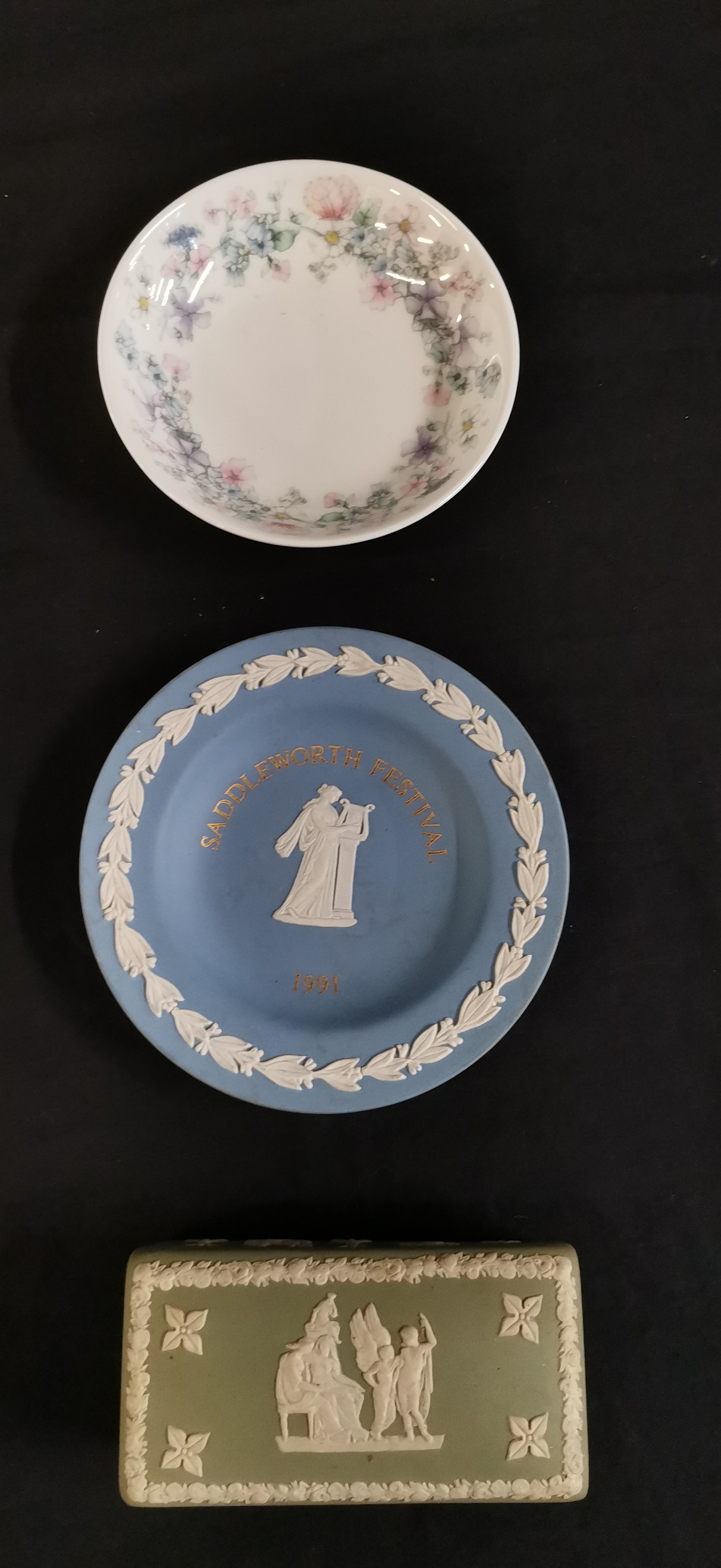 A trio of Wedgwood ceramics comprising an Angela pattern floral bone china bowl, a blue jasperware Saddleworth Festival 1991 commemorative plate, and a green jasperware lidded box with classical reliefs.