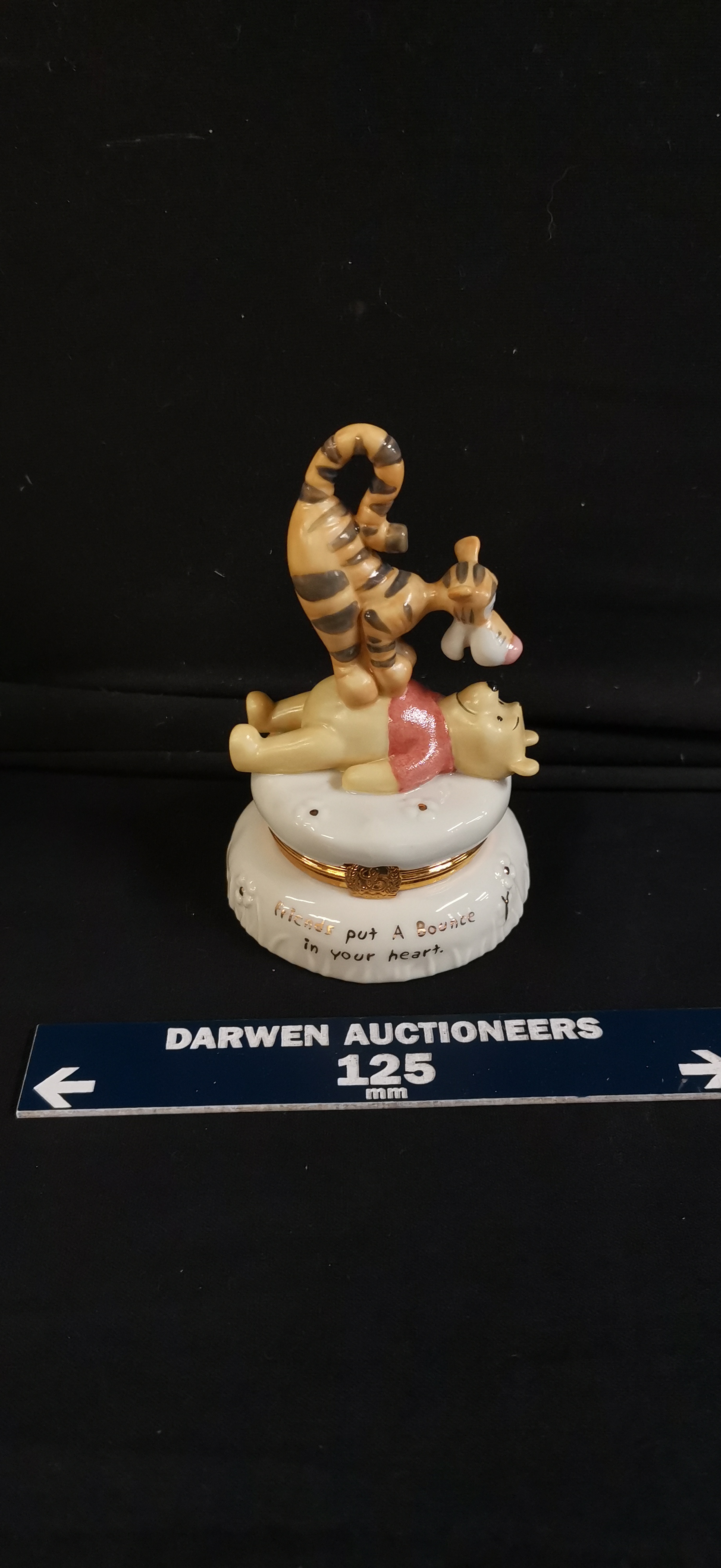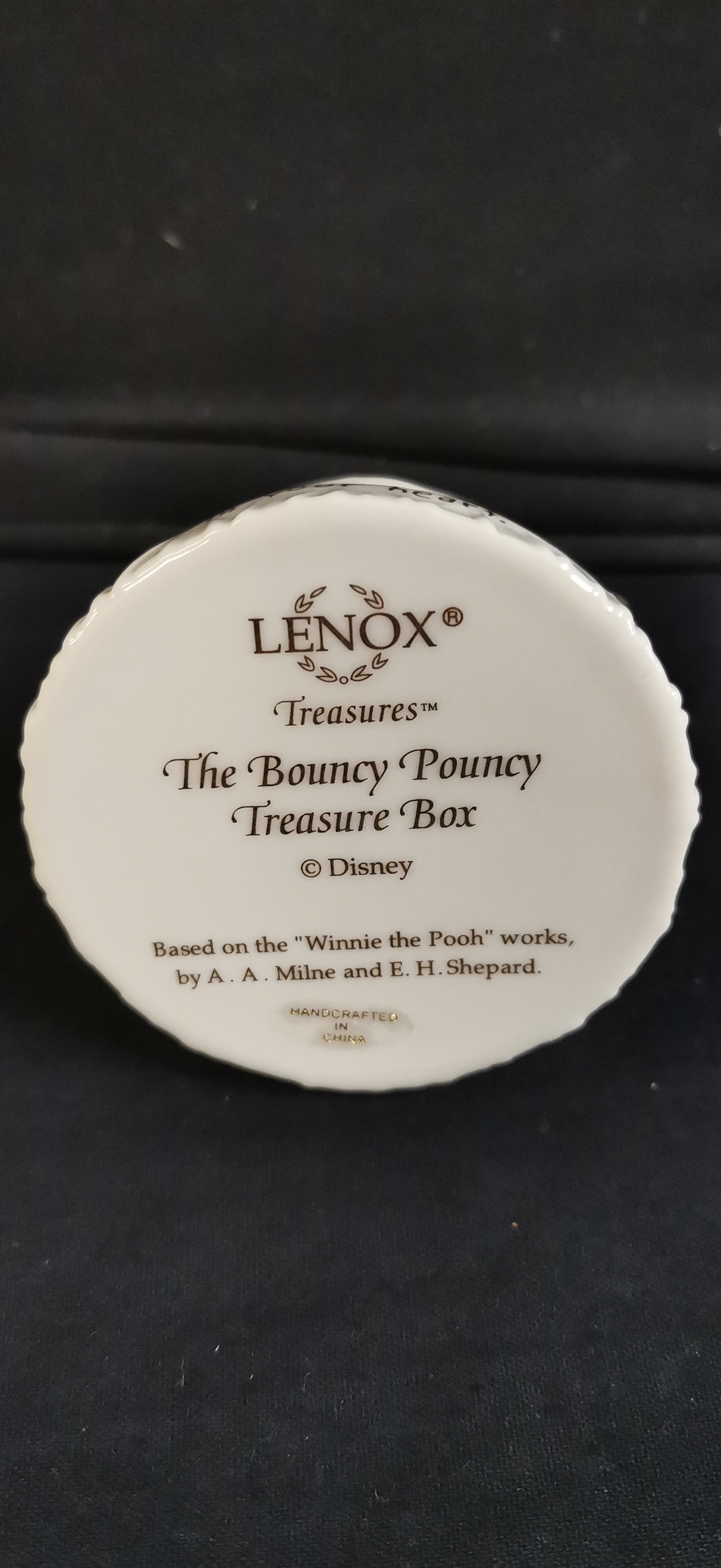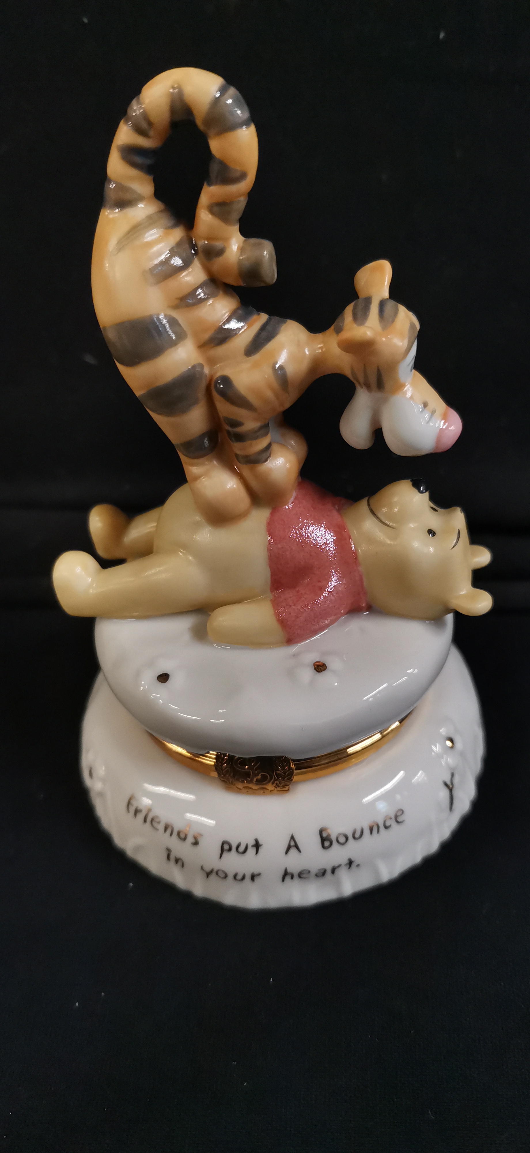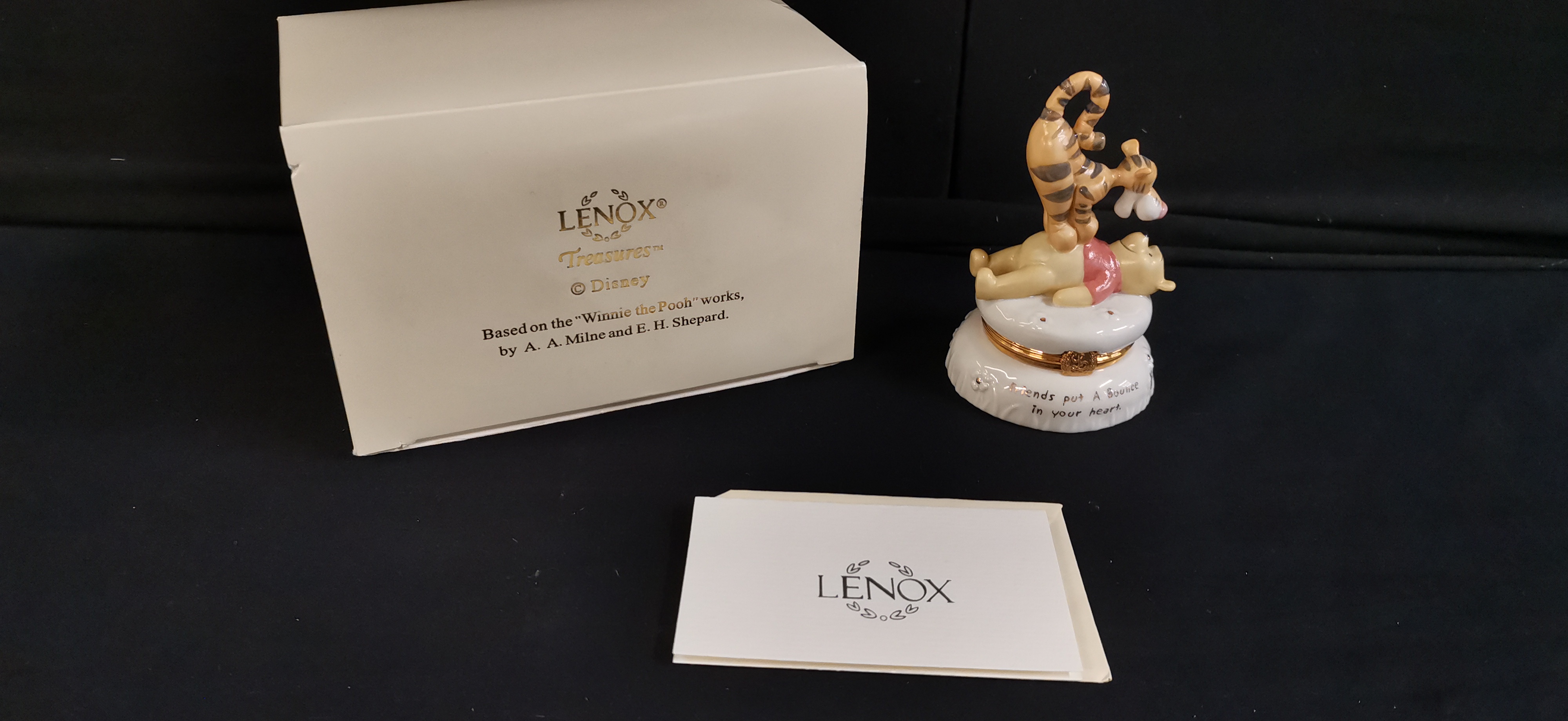 A Lenox Treasures Disney Showcase hand-painted glazed porcelain trinket box titled “The Bouncy Pouncy Treasure Box”. The figurine depicts Tigger bouncing on Winnie the Pooh’s back atop a white quilted pillow base. The base is decorated with gold-accented floral details and inscribed with the phrase “Friends put A Bounce In your heart” in black script. The piece features gold-toned metal hardware with a decorative “L” thumbpiece. The underside bears the Lenox wreath logo, “Treasures™”, the title, “© Disney”, and literary attribution to A. A. Milne and E. H. Shepard. Handcrafted in China. Accompanied by the original white cardboard box, brand pamphlet, and a small white porcelain butterfly charm stored inside. Height approximately 95mm.