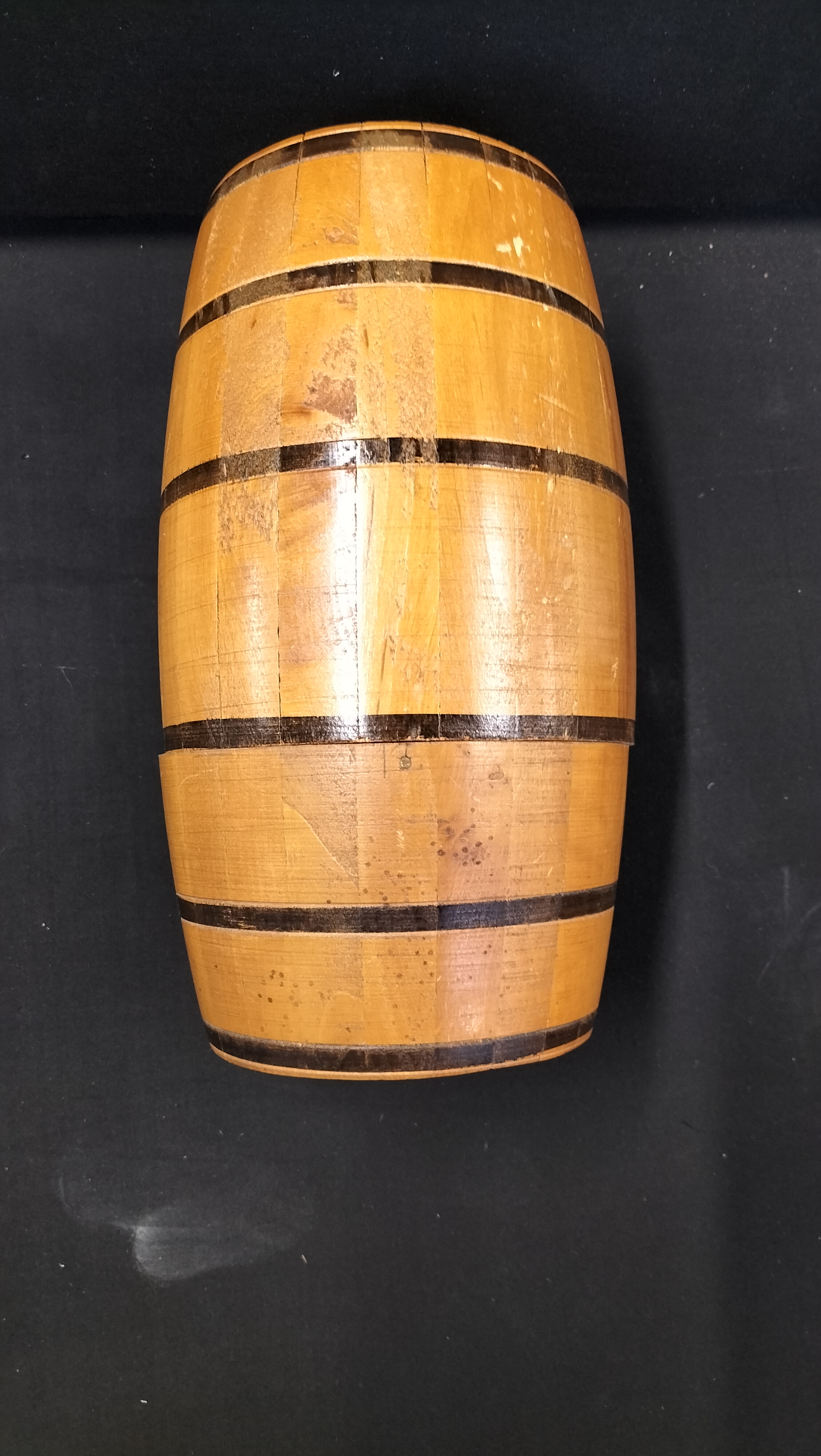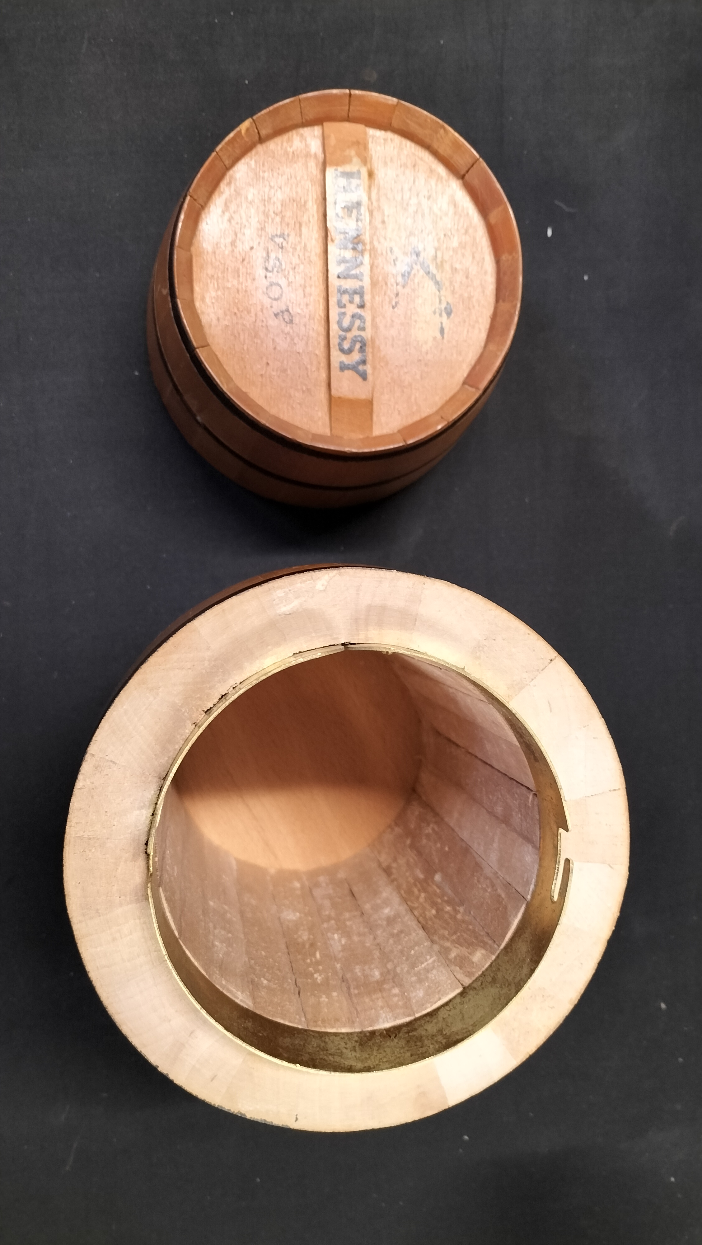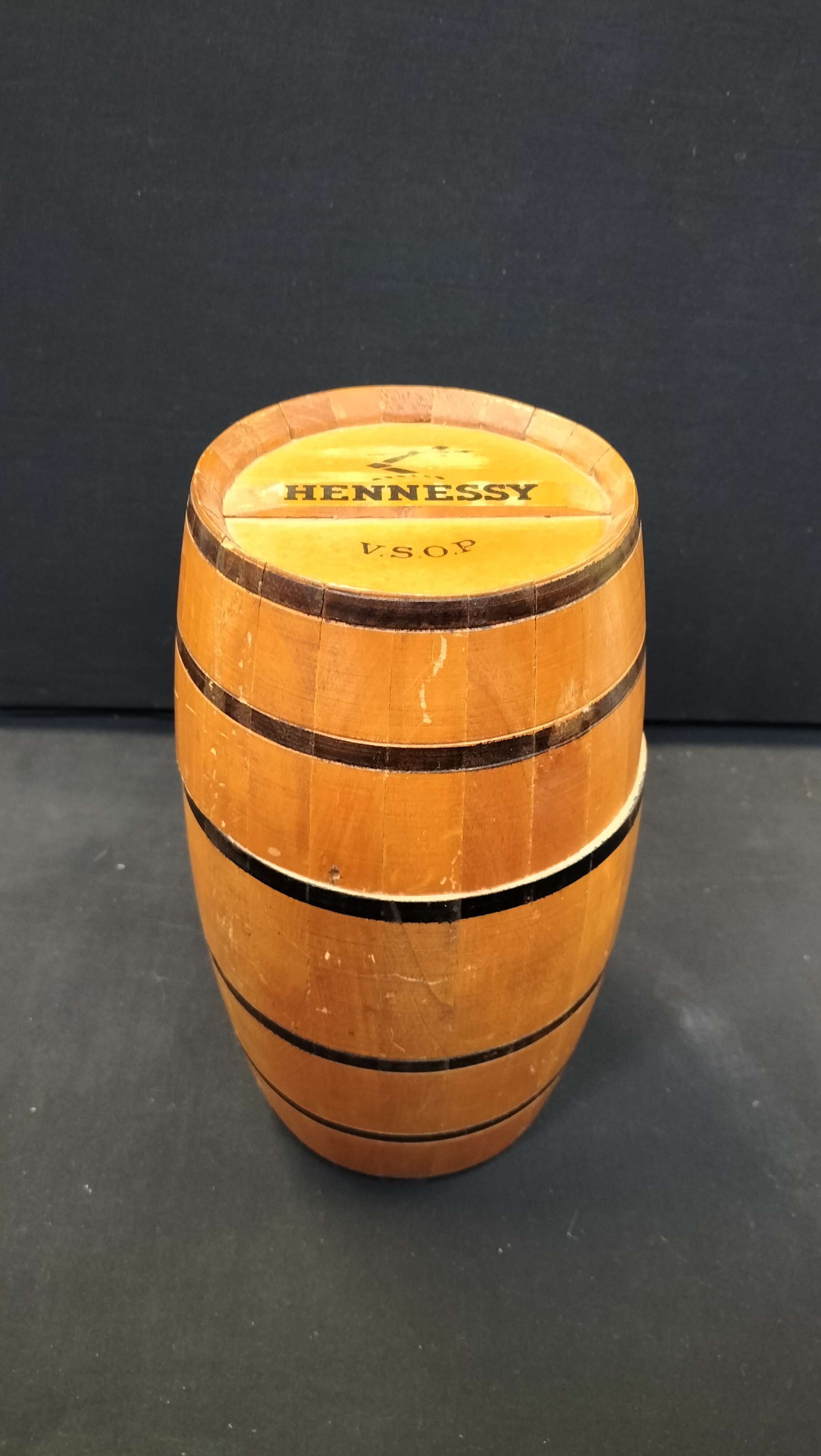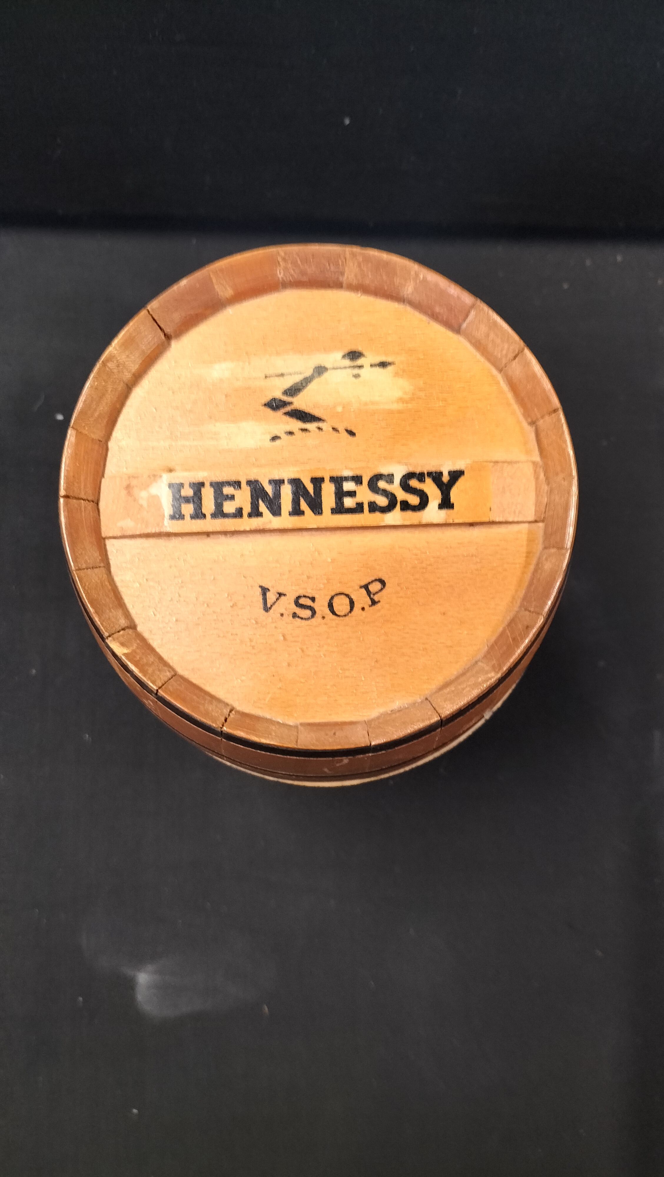 A single wooden barrel-shaped presentation case featuring the Hennessy logo and V.S.O.P. inscription with black horizontal bands.