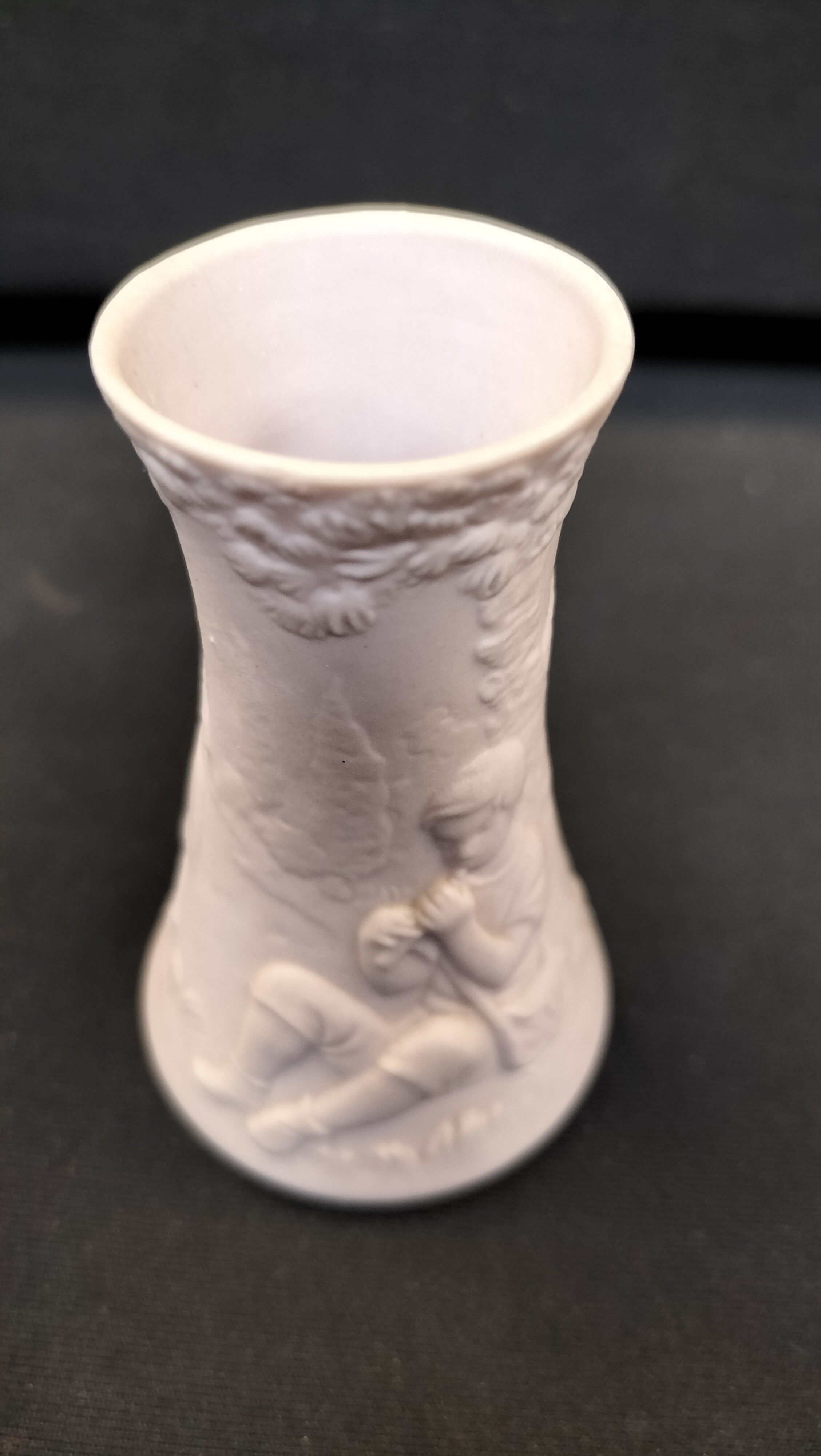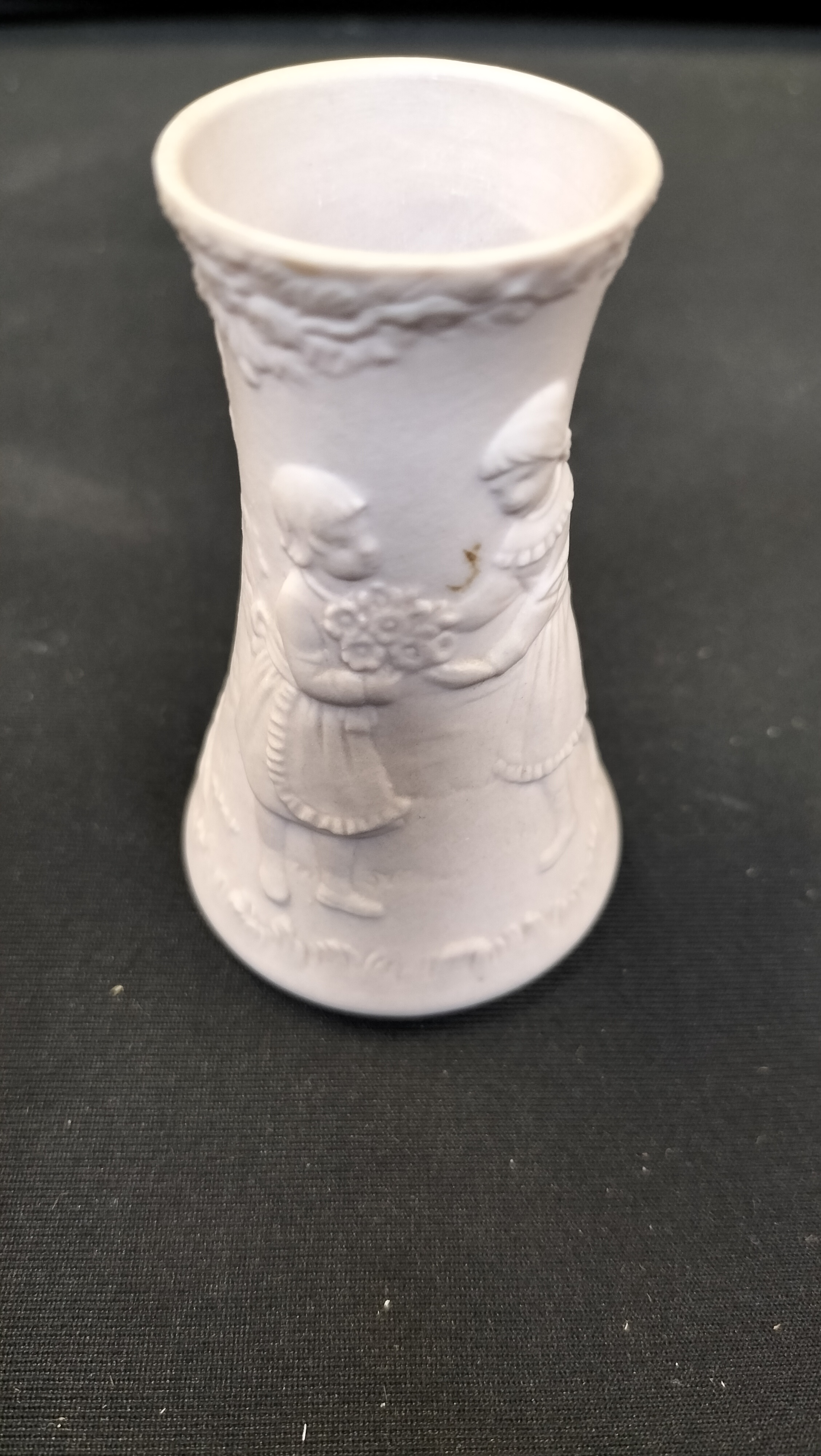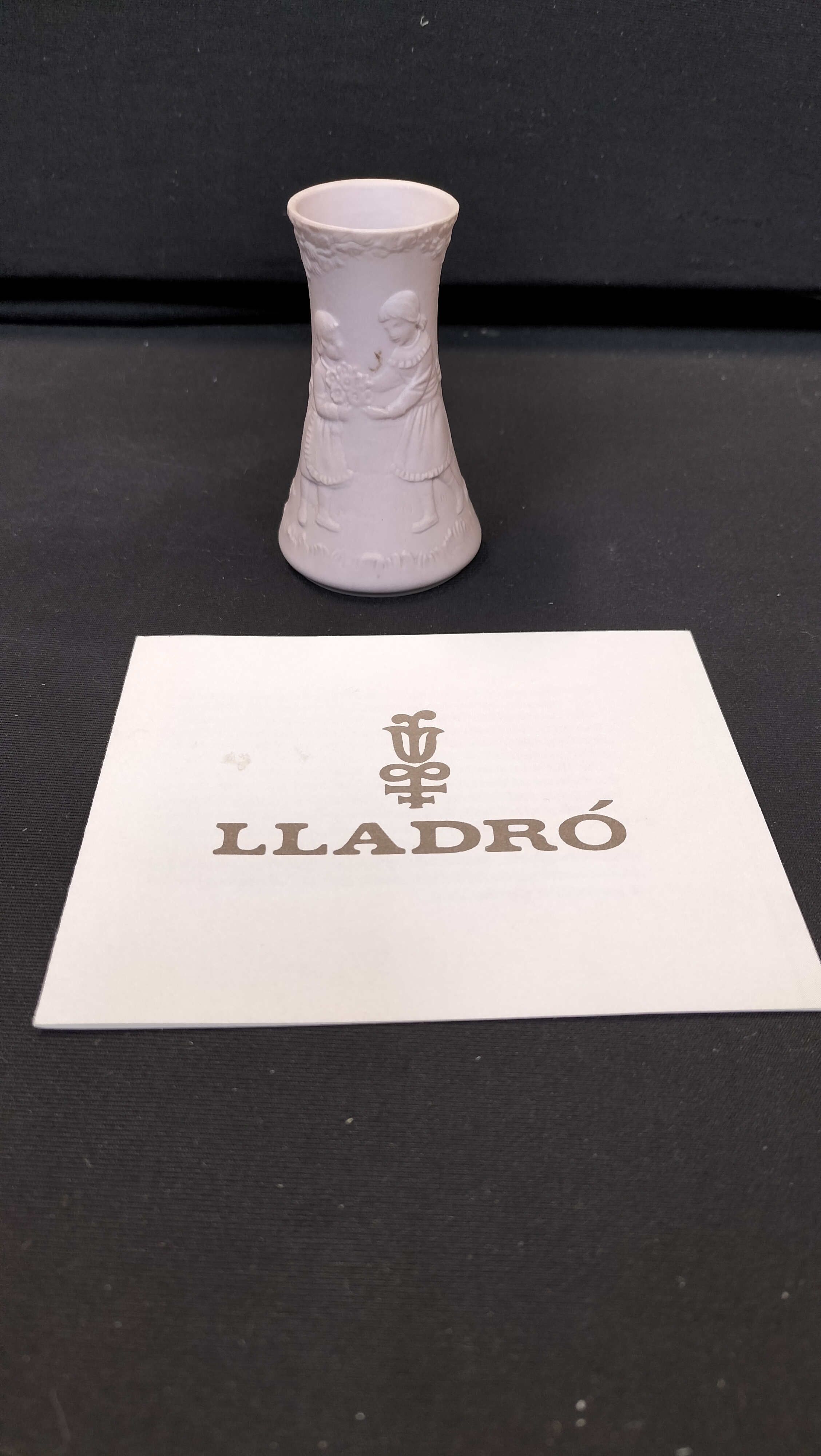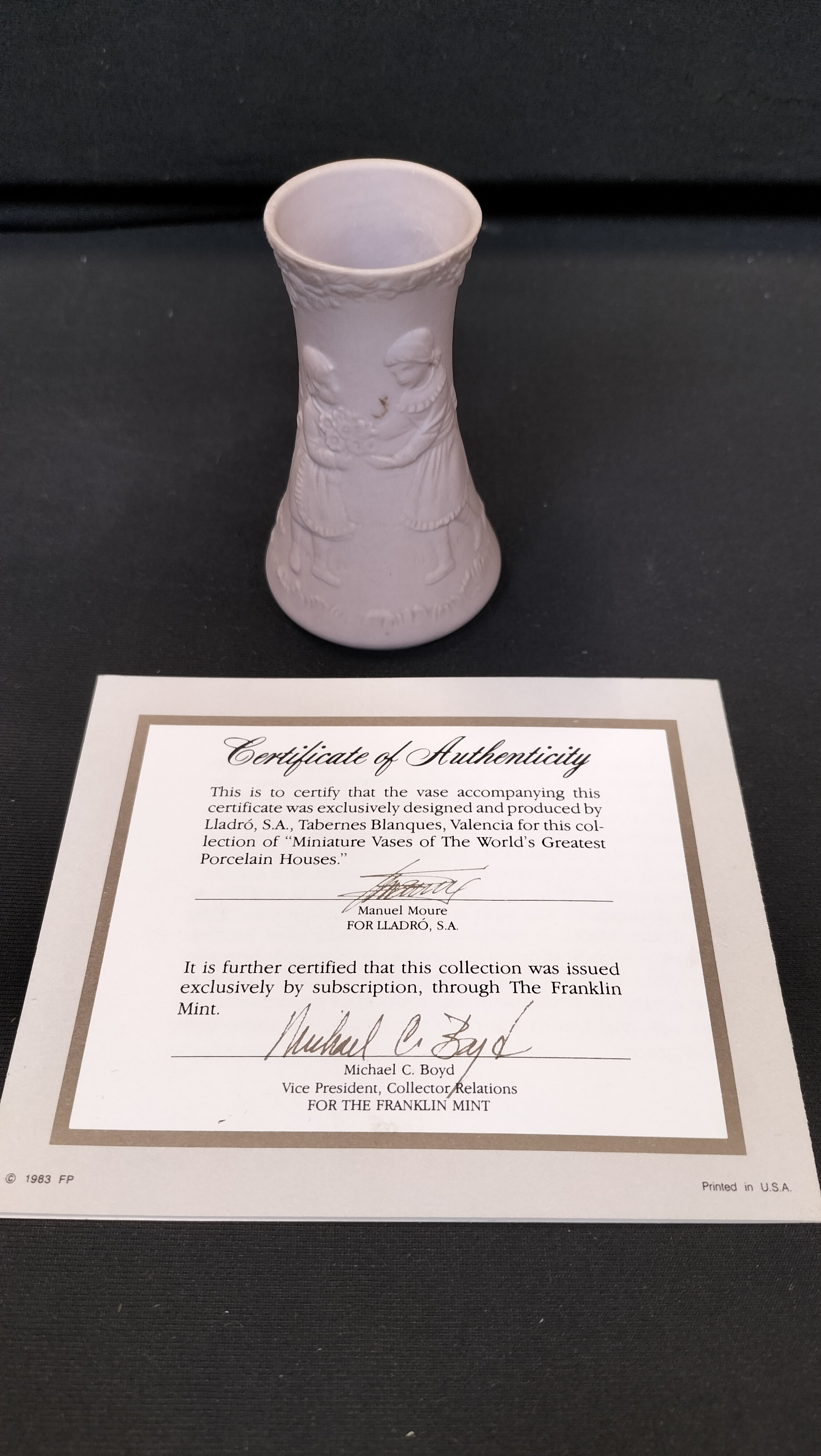 A white matte porcelain miniature vase featuring relief-carved scenes of children, accompanied by a Franklin Mint Certificate of Authenticity.