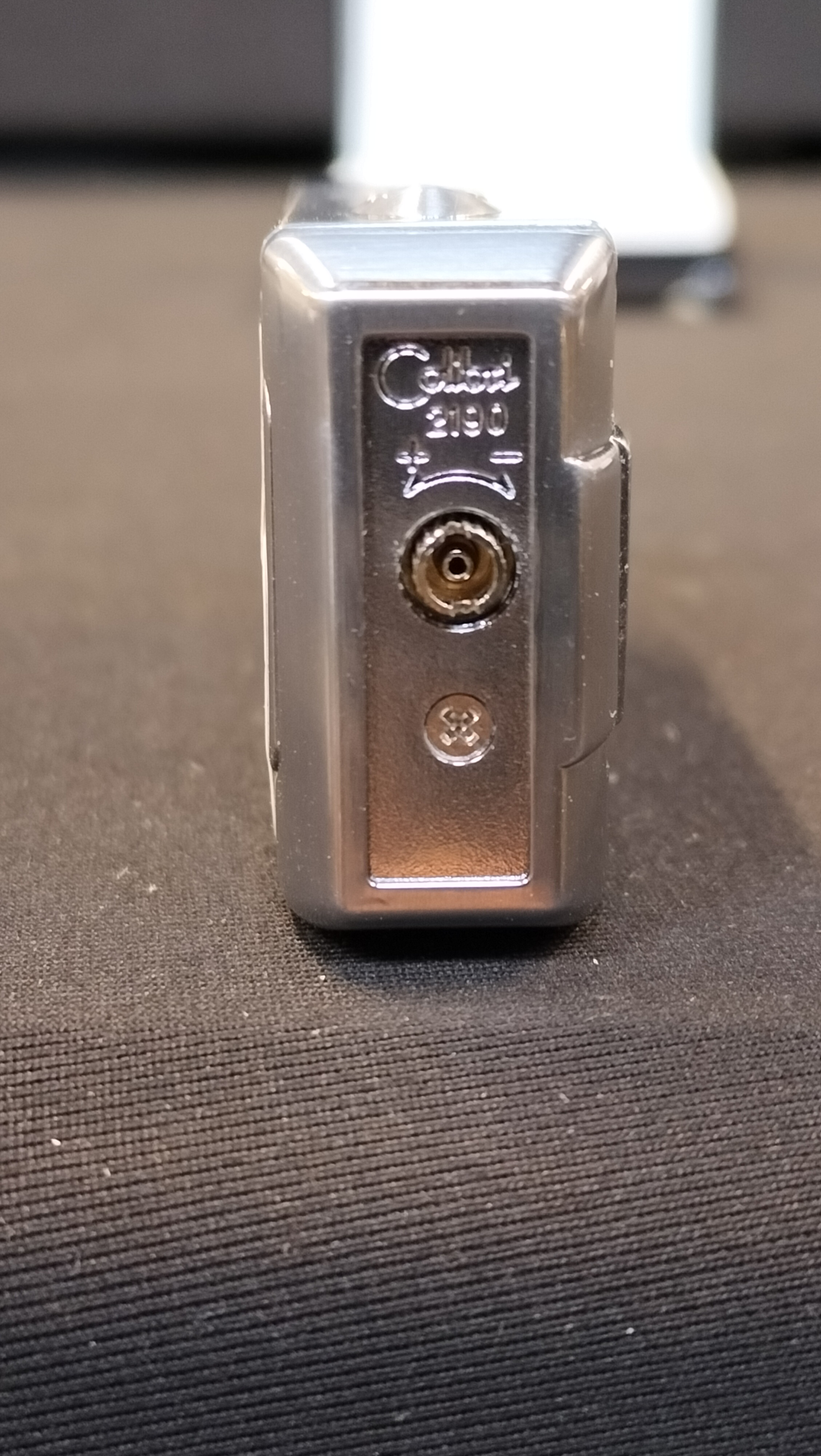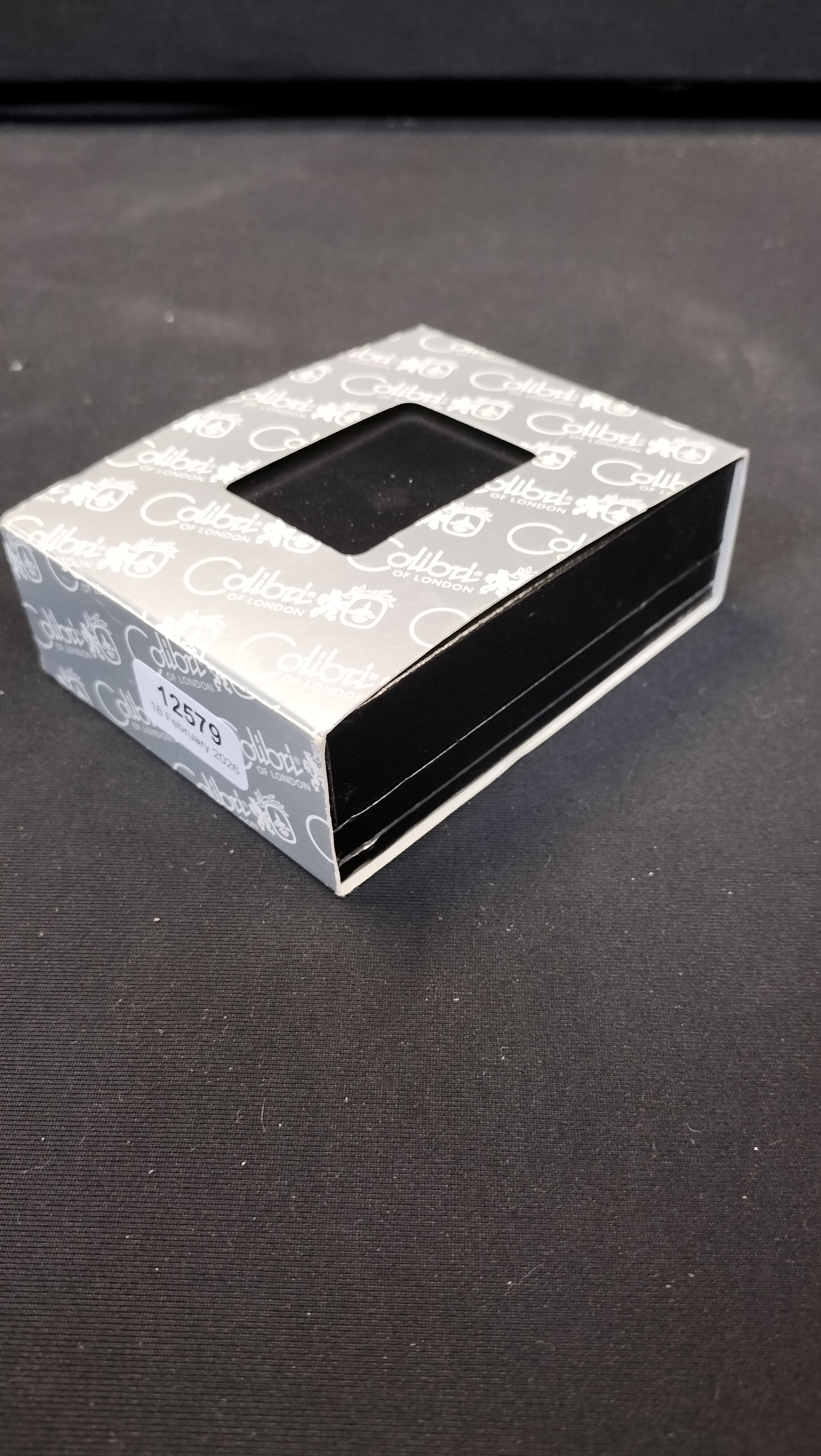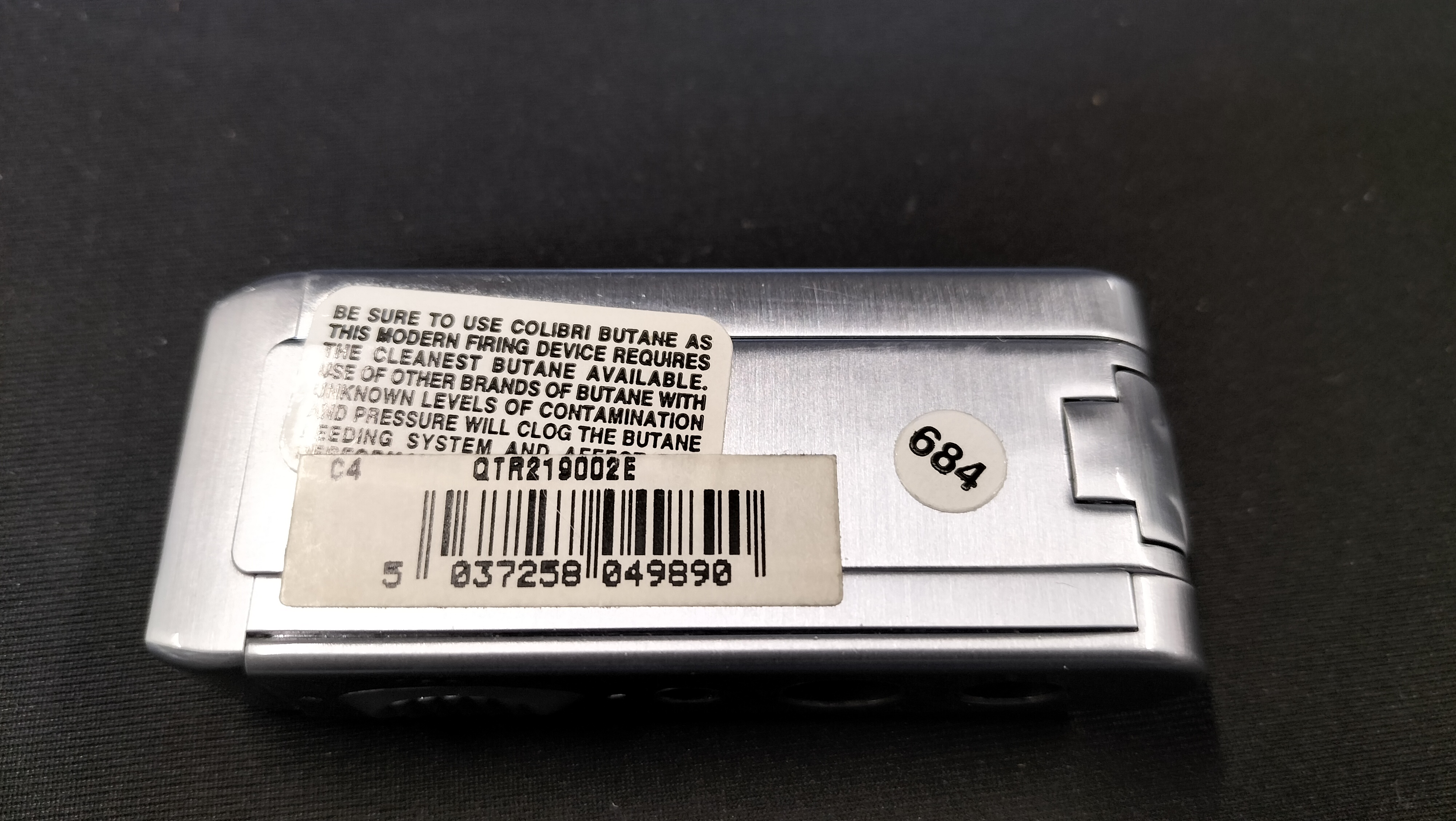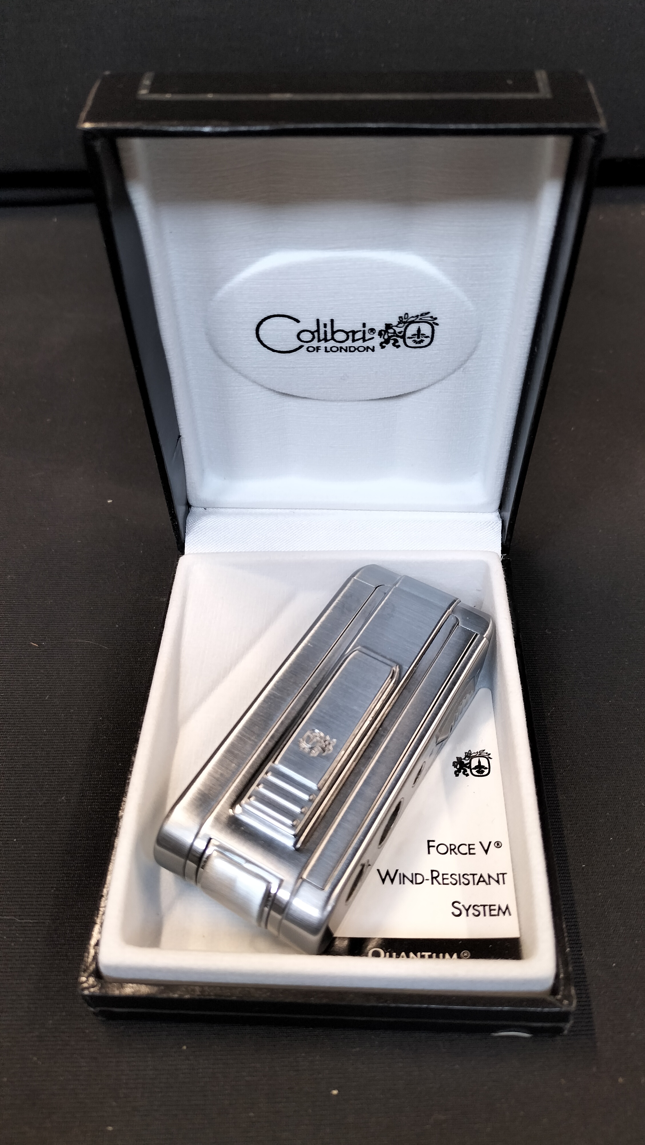A silver-coloured Colibri Force V wind-resistant butane lighter, model 2190, complete with original box and Quantum instruction manual.