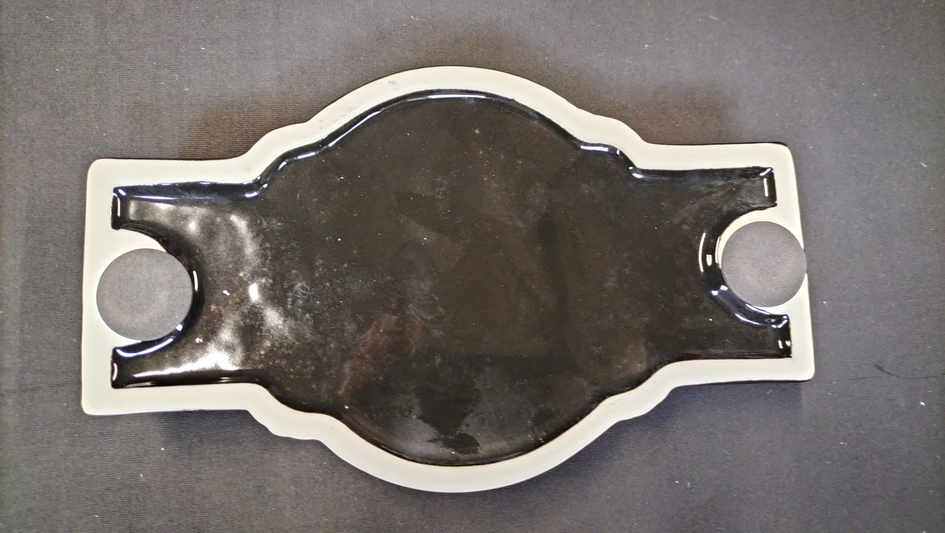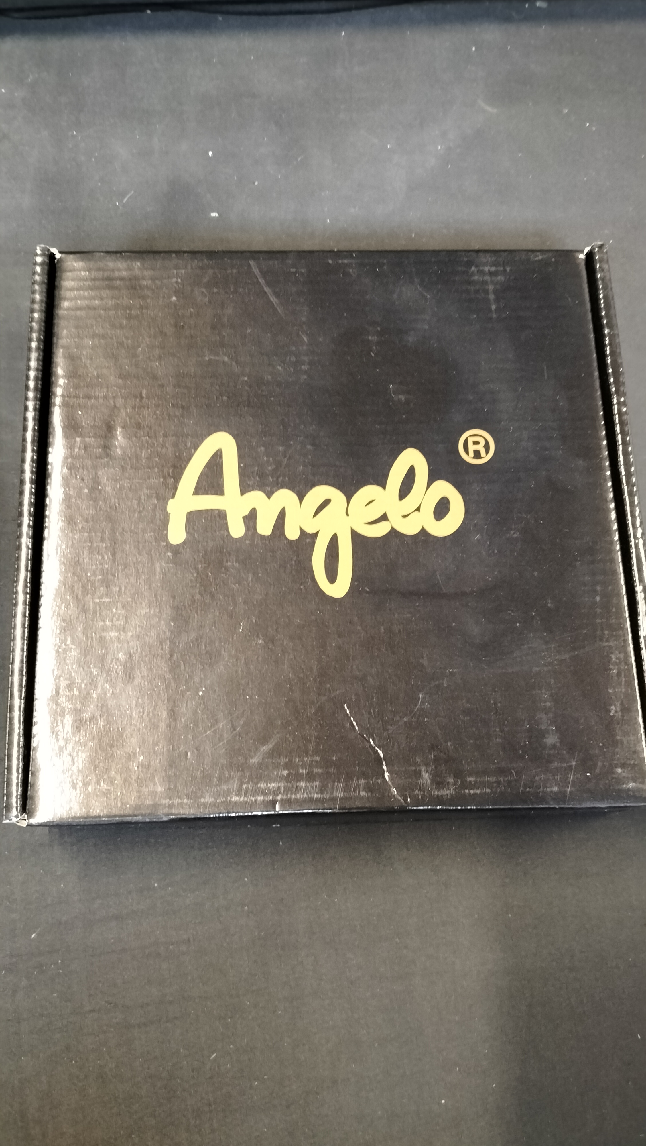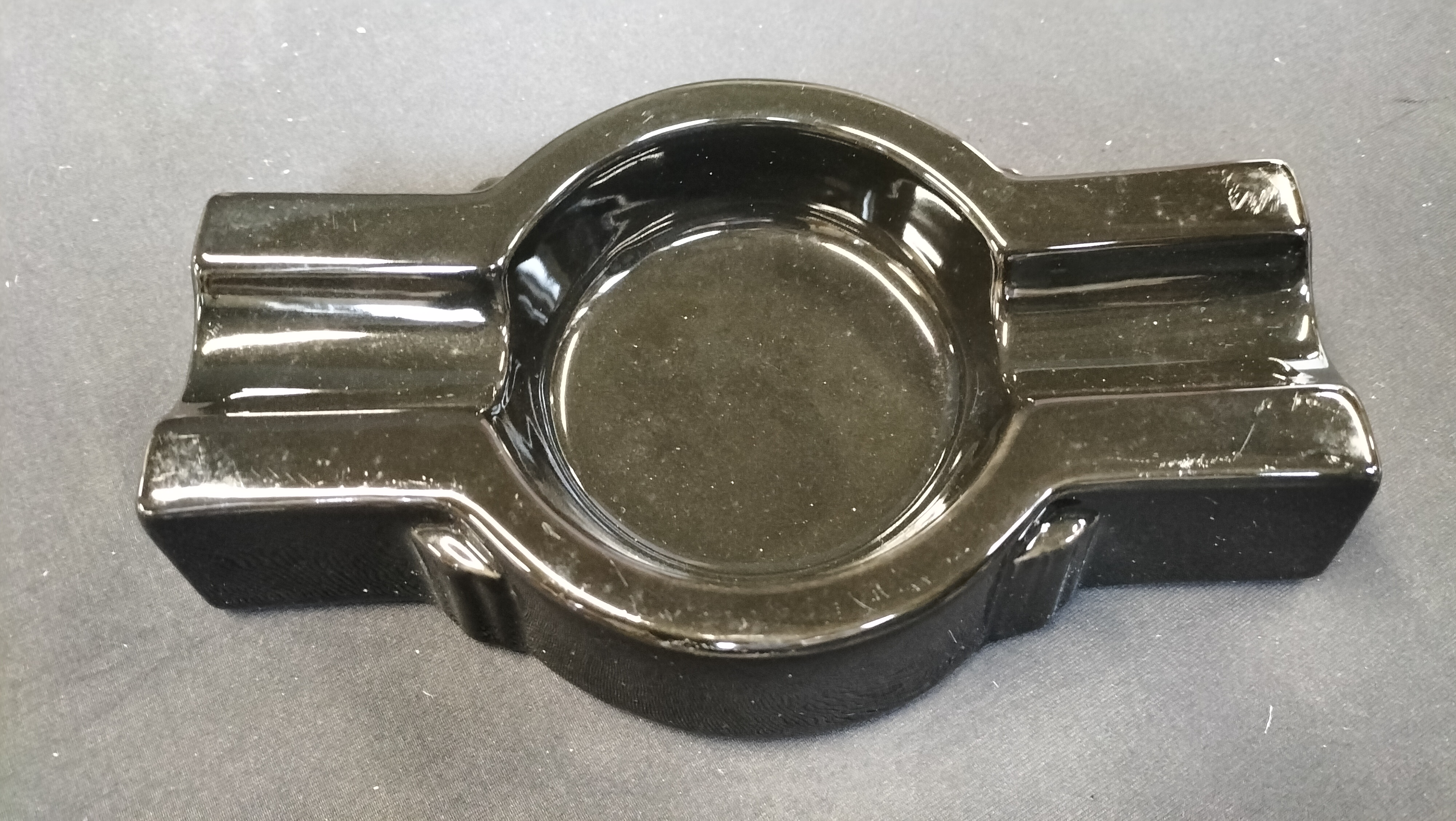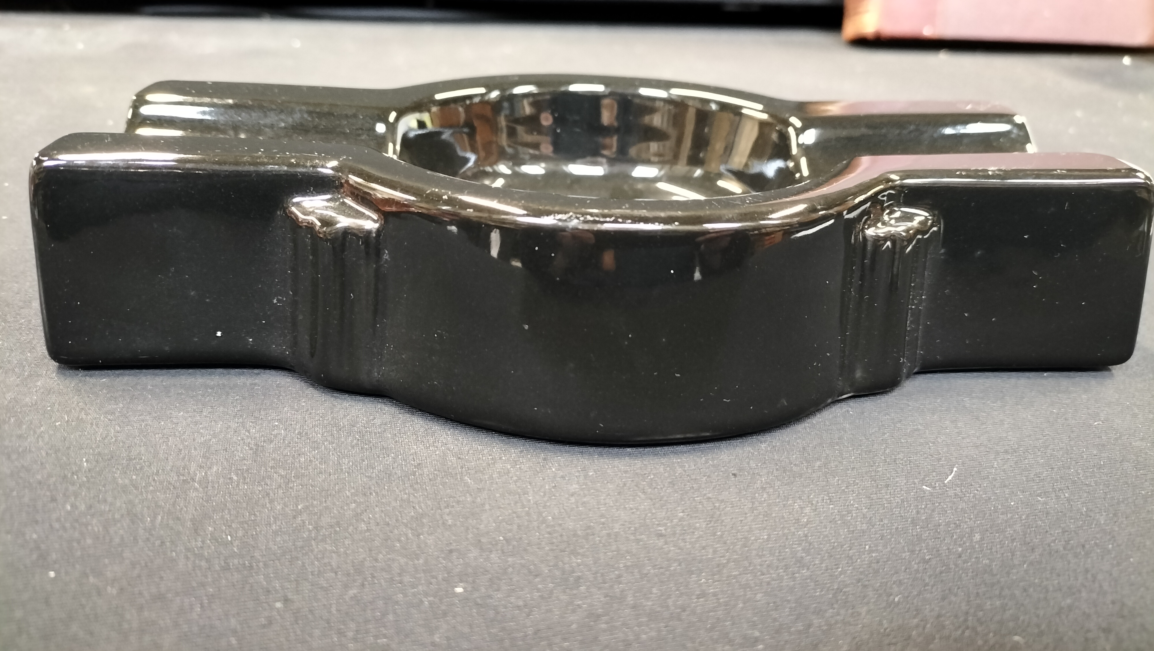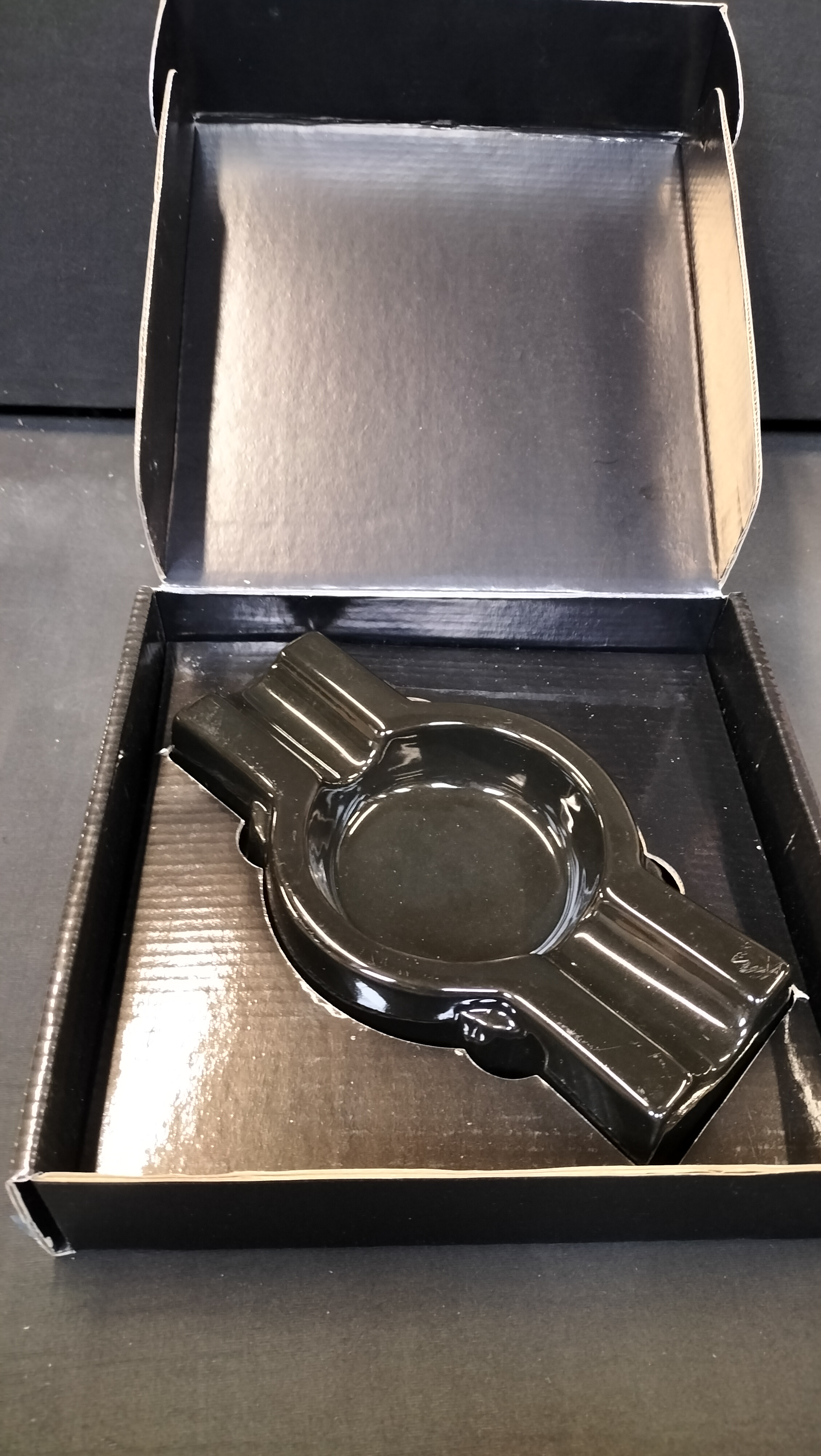 A black ceramic cigar ashtray featuring two rests, housed in its original Angelo branded presentation box.
