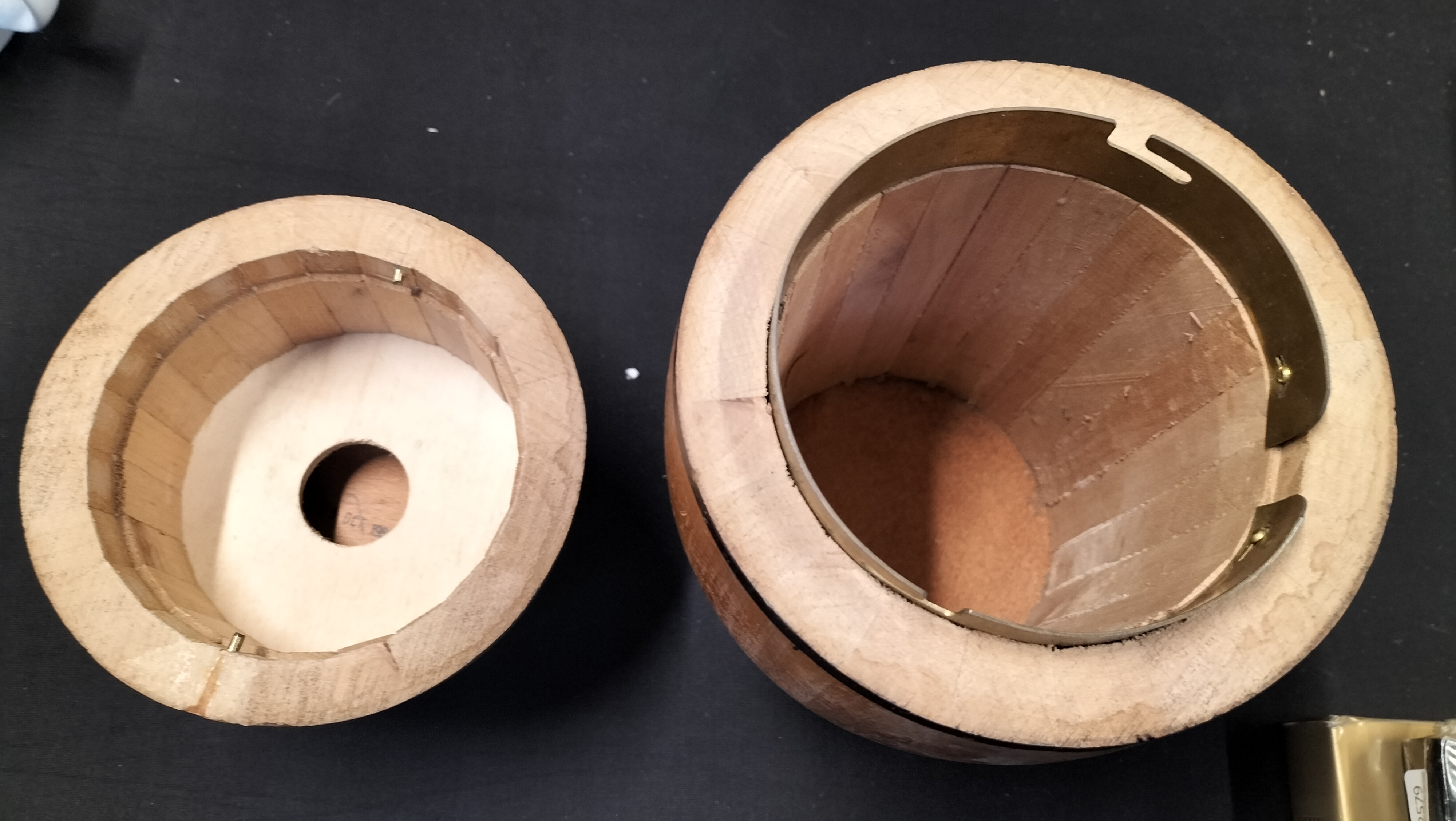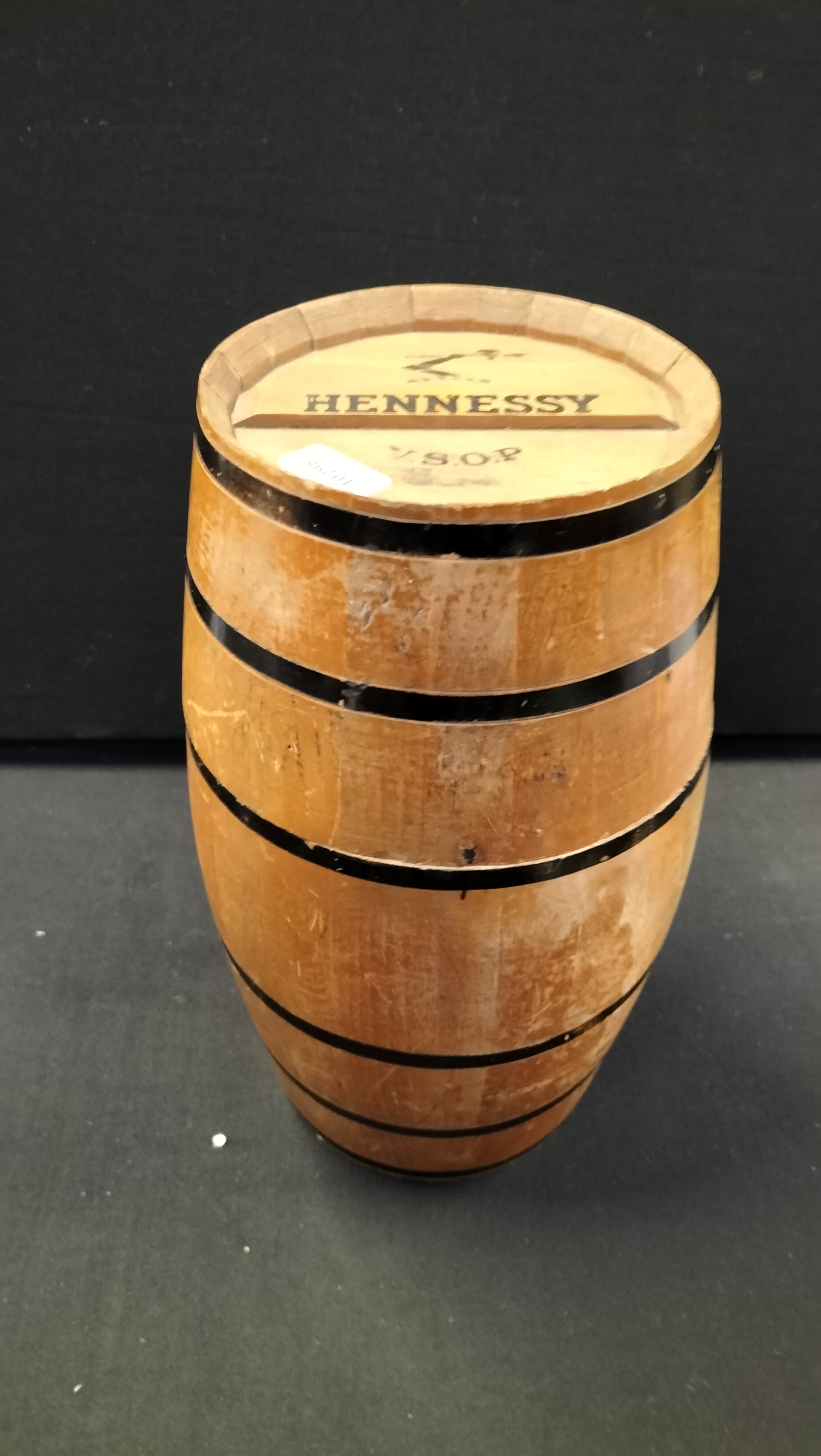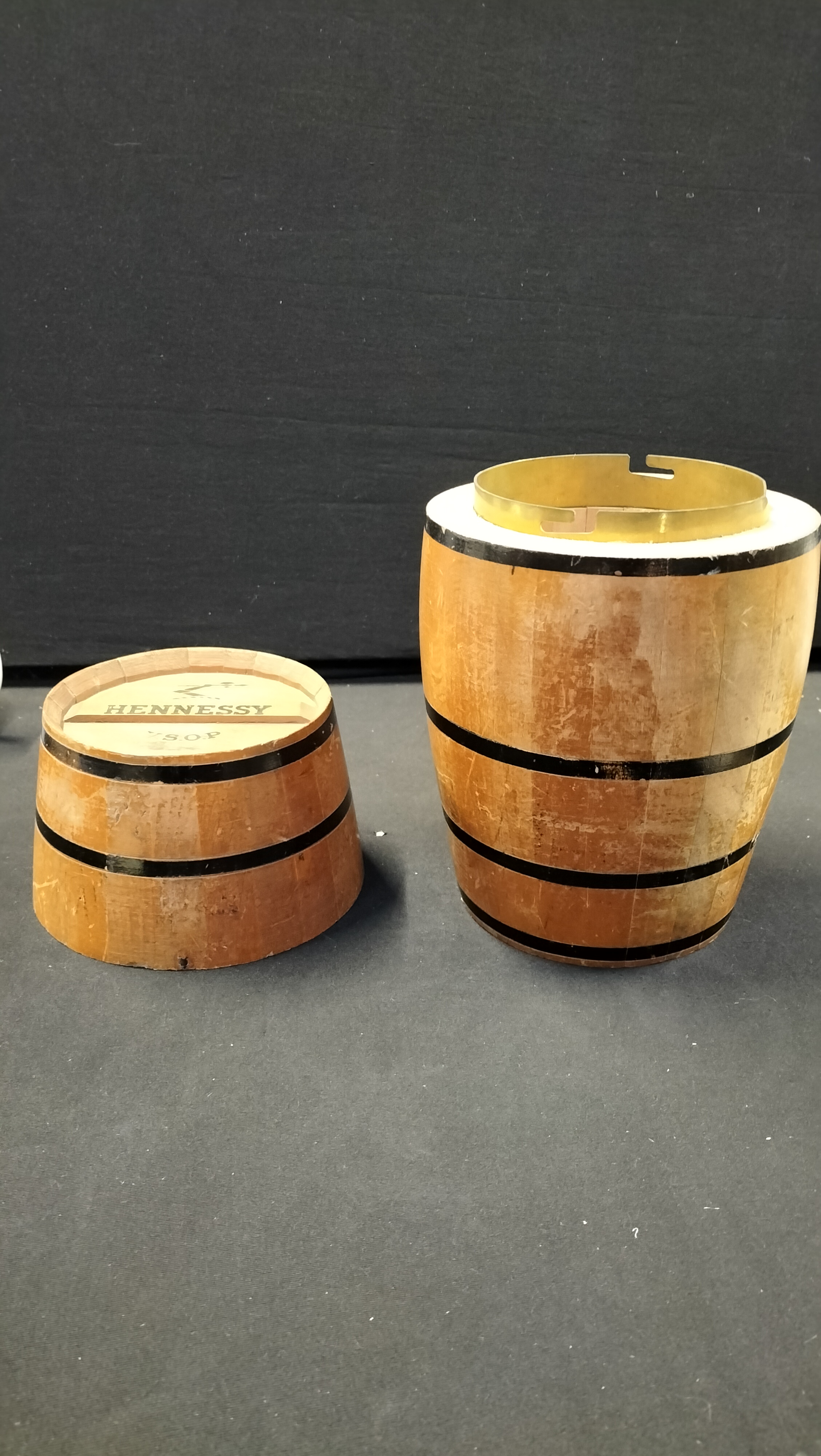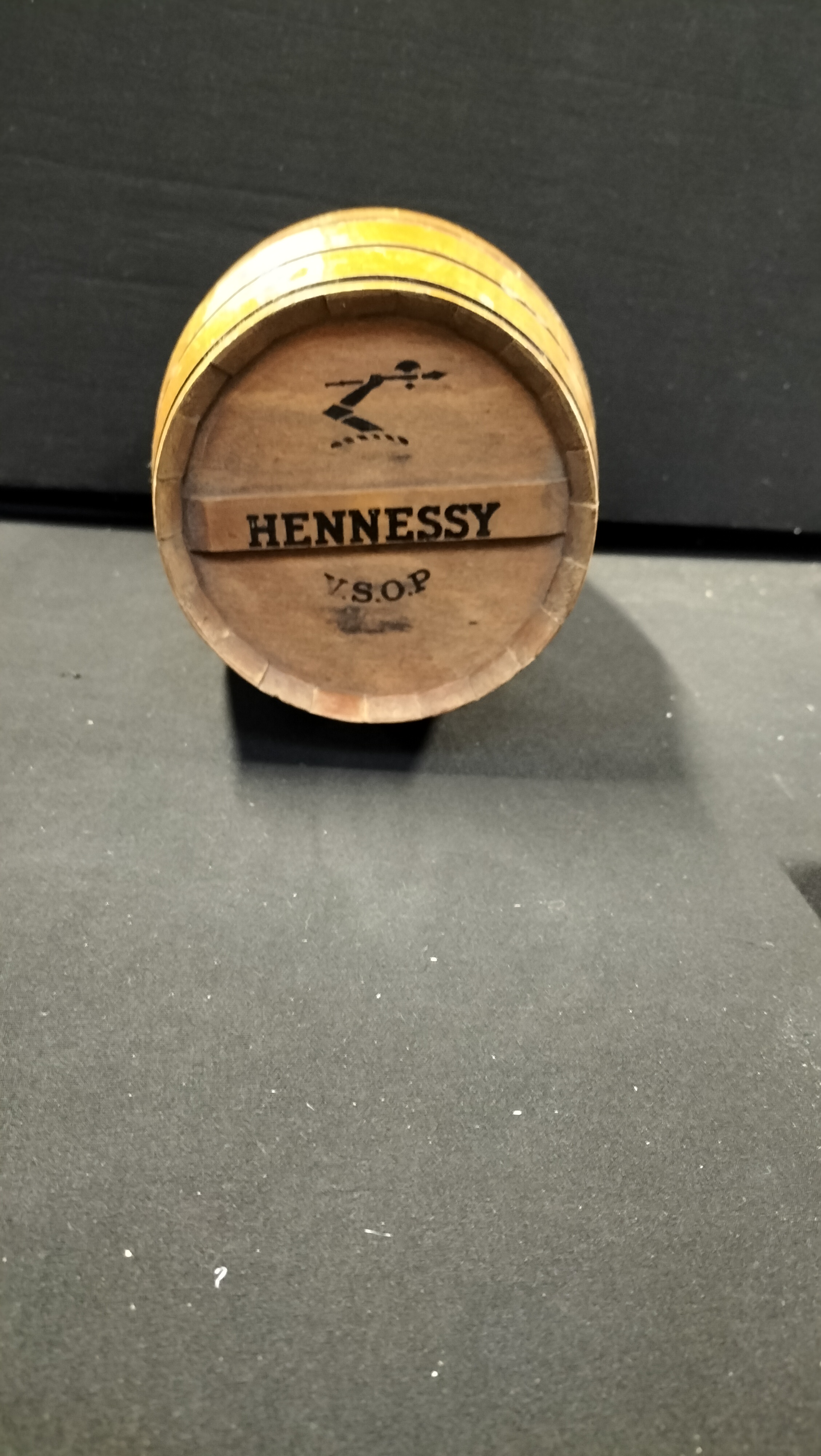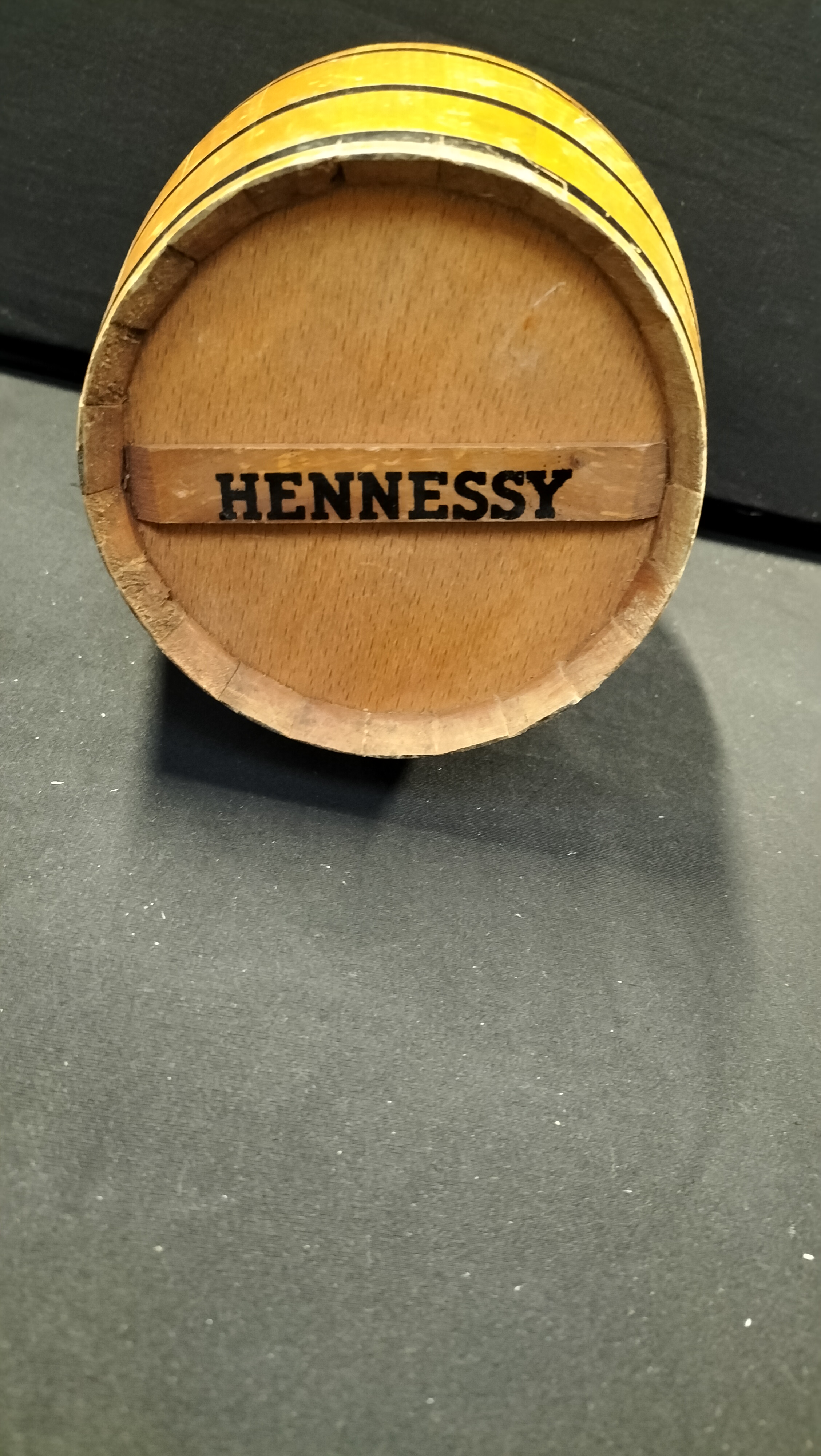A wood barrel-shaped promotional container with black horizontal bands, featuring Hennessy V.S.O.P branding and a halberd logo on the lid.