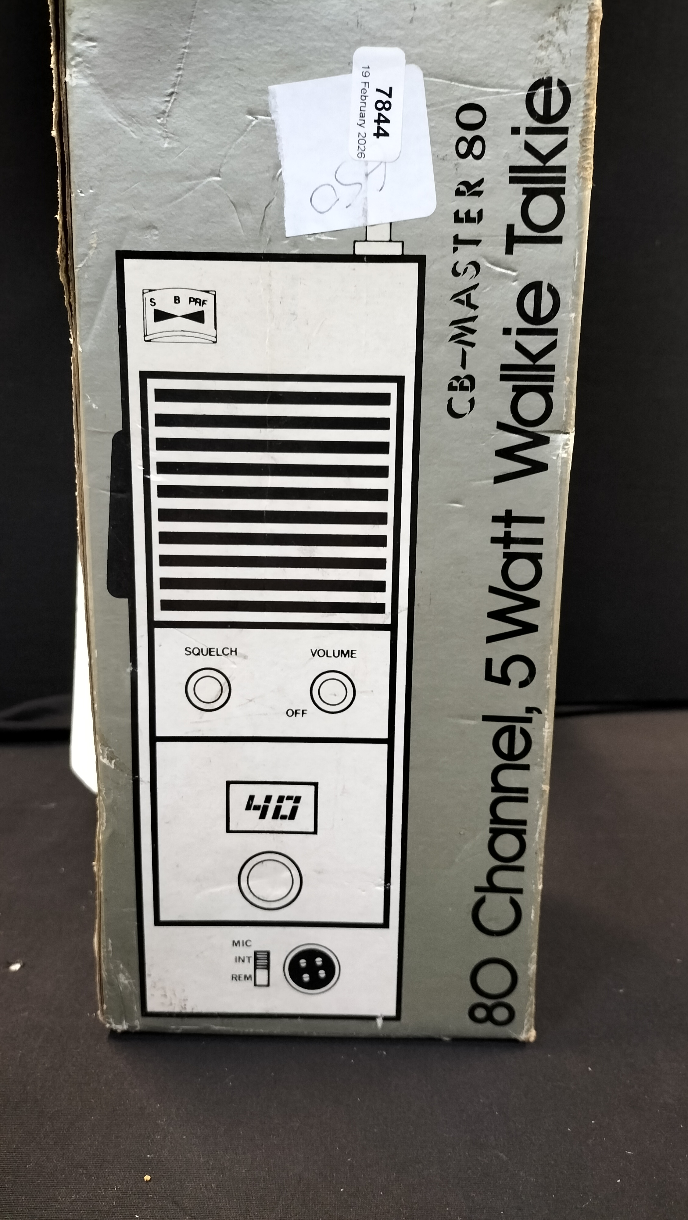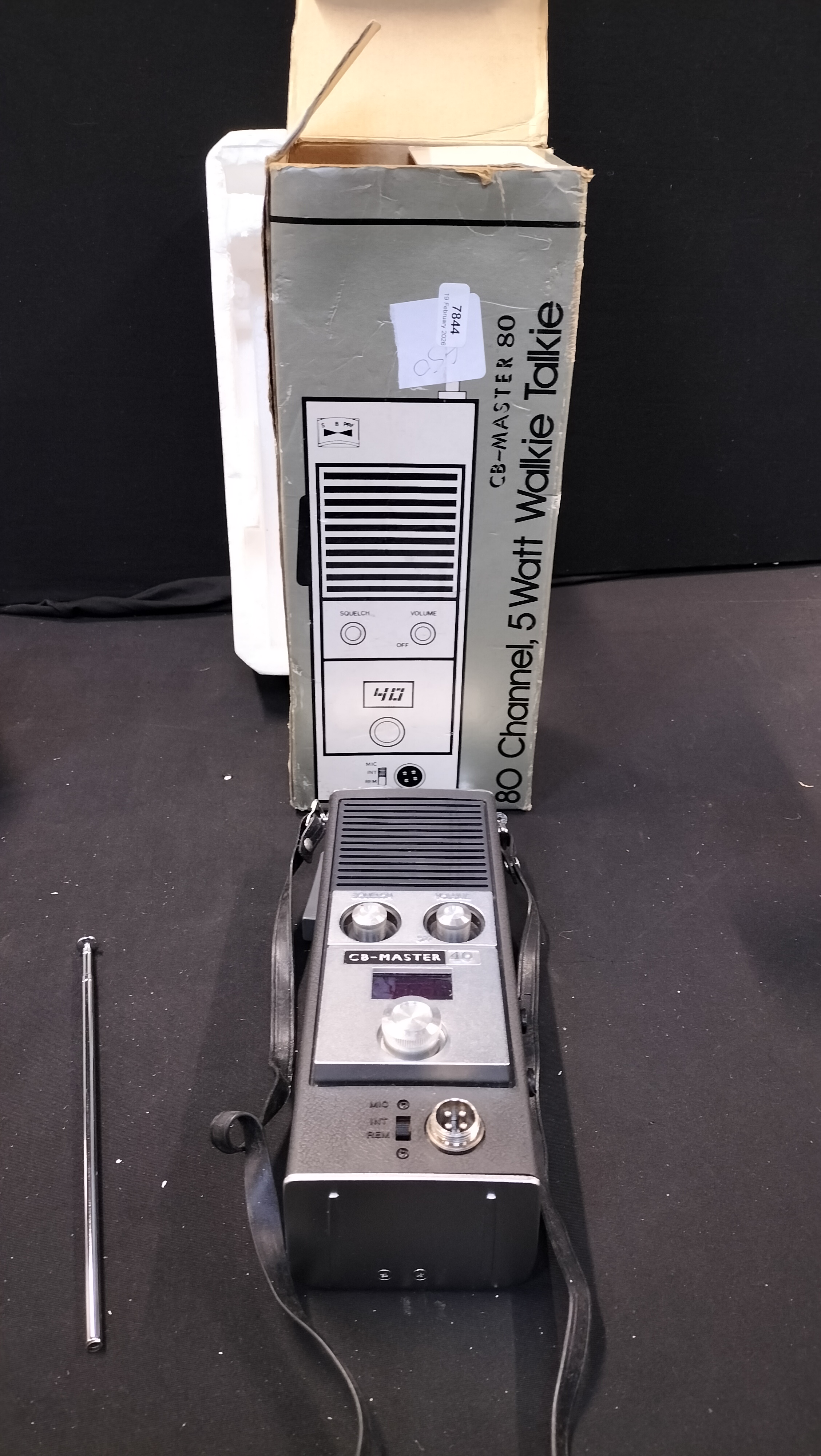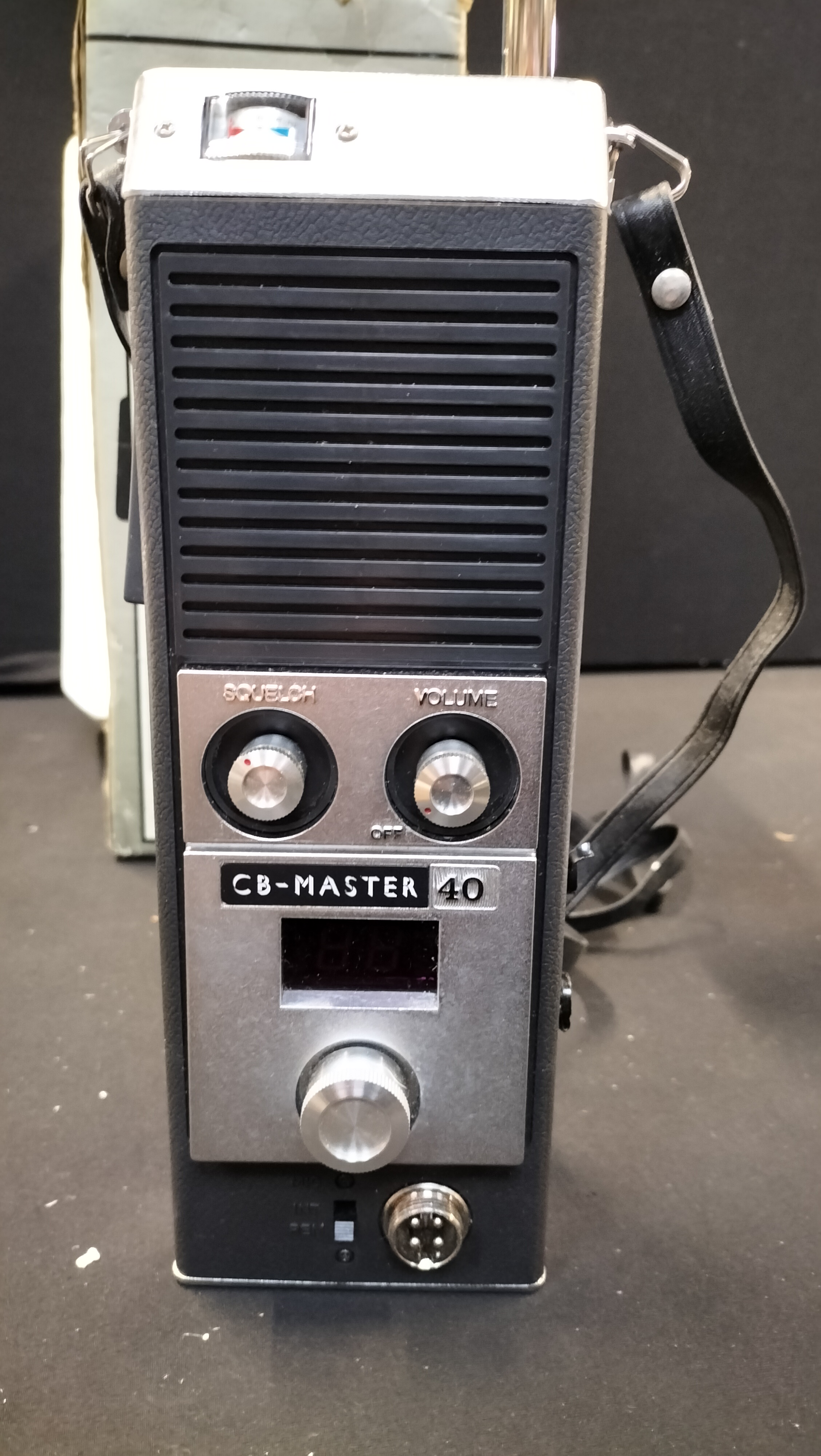 A black and silver handheld CB-Master walkie-talkie featuring squelch and volume controls, complete with a telescopic antenna and original box.